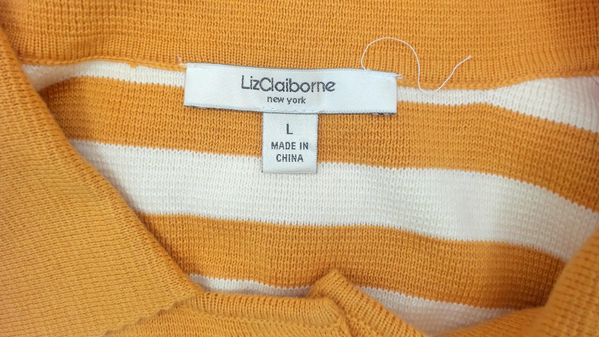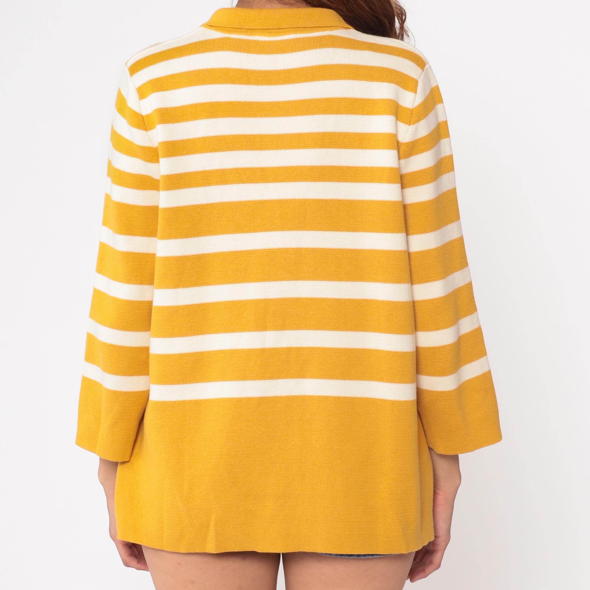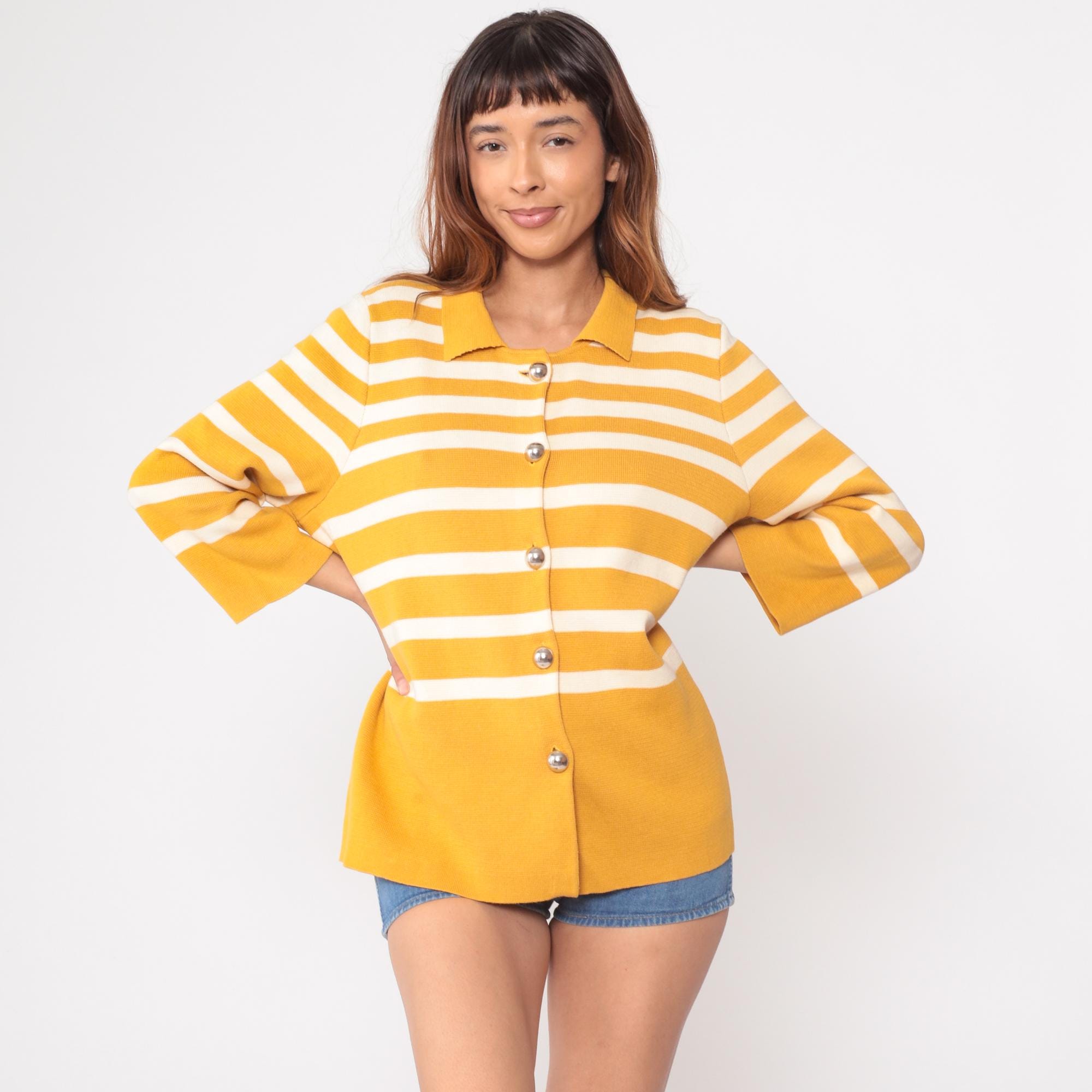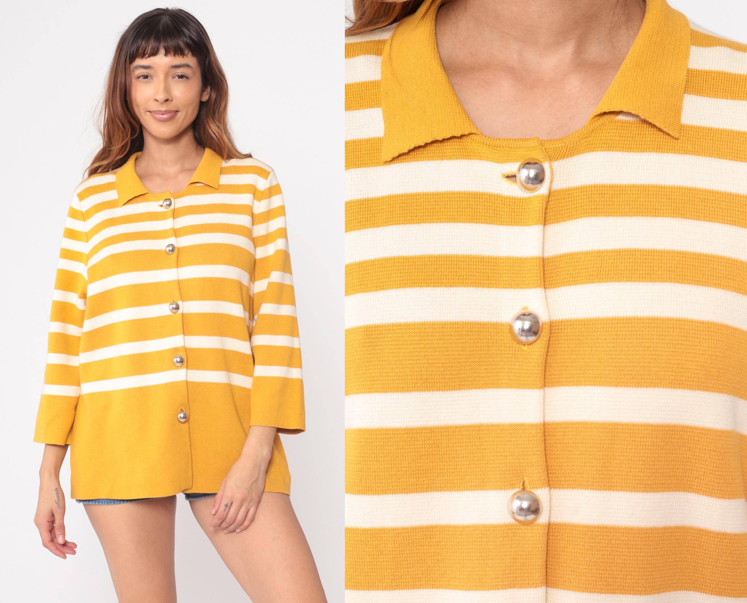 Y2K Liz Claiborne cardigan featuring bold mustard yellow and white horizontal stripes. Designed with a pointed collar, silver-tone button front, and boxy relaxed fit.