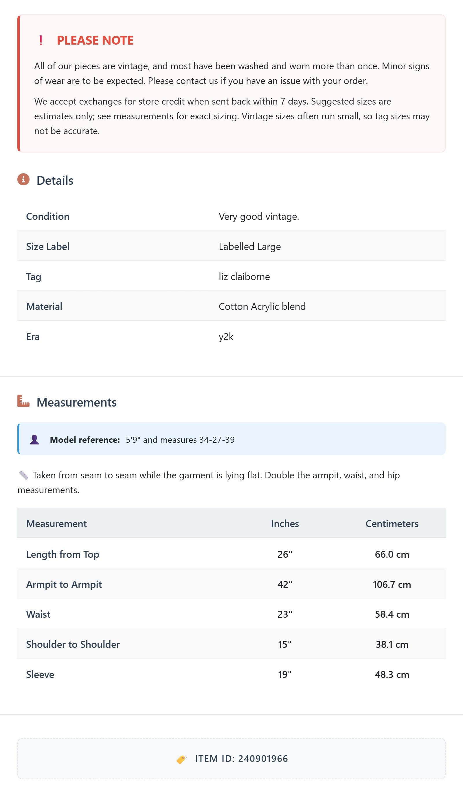 Suggested sizes are estimates only; see measurements for exact sizing. Vintage sizes often run small, so tag sizes may not be accurate.