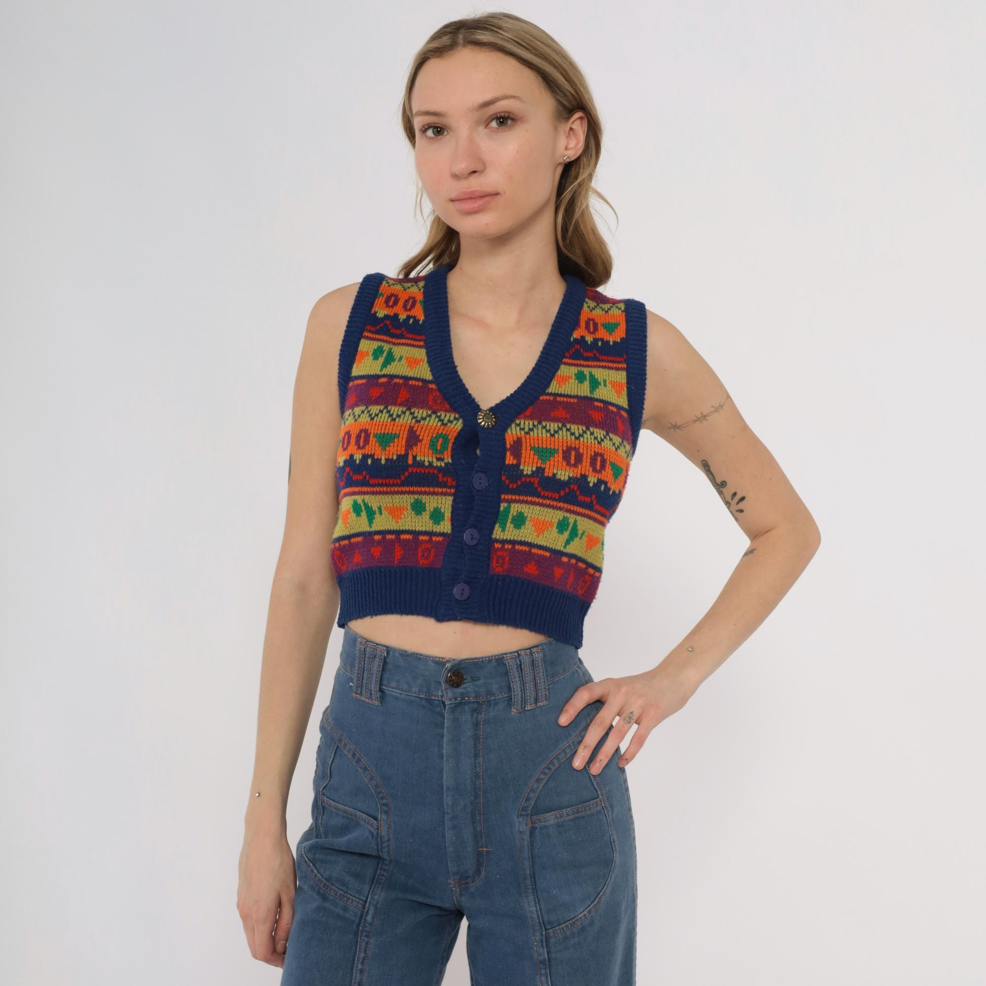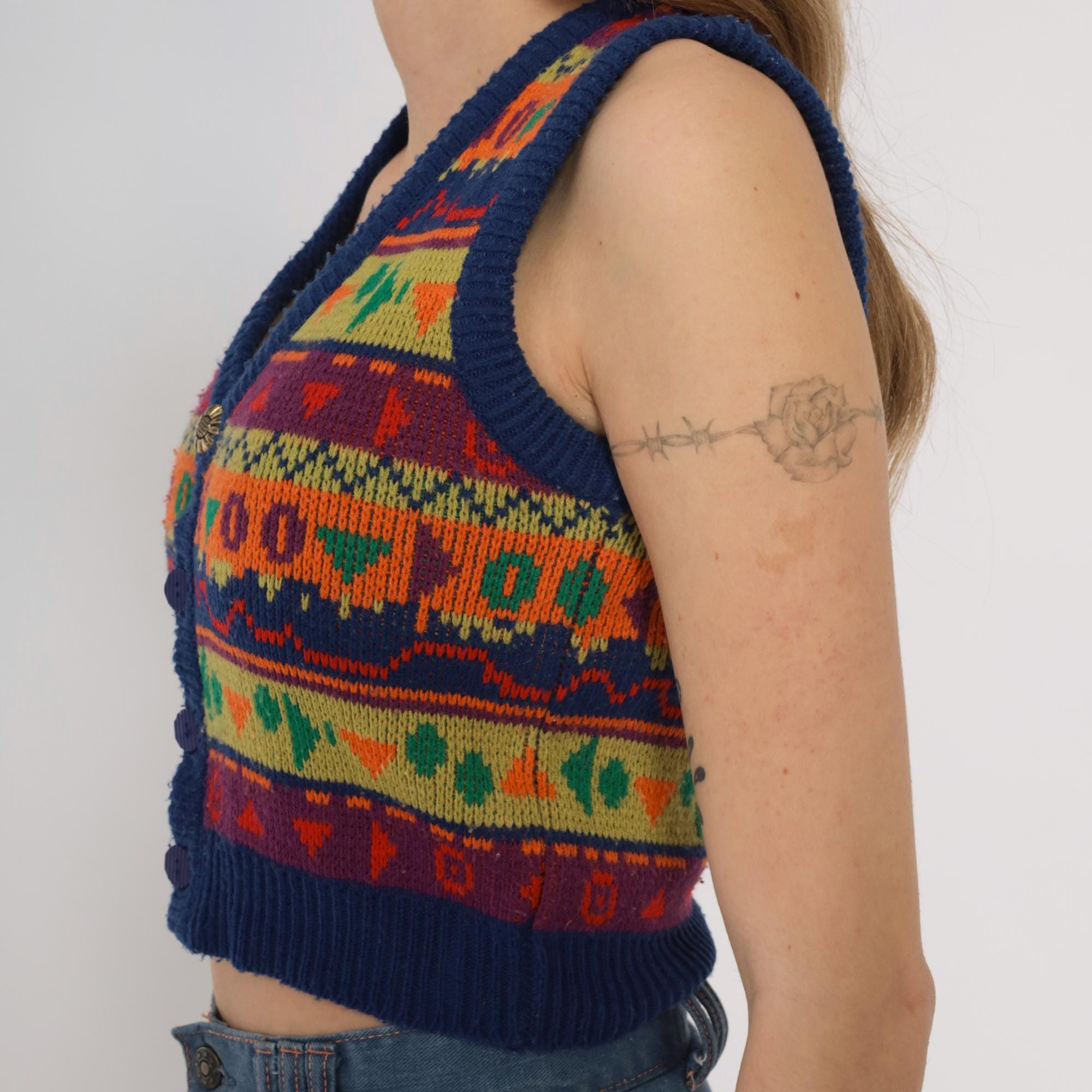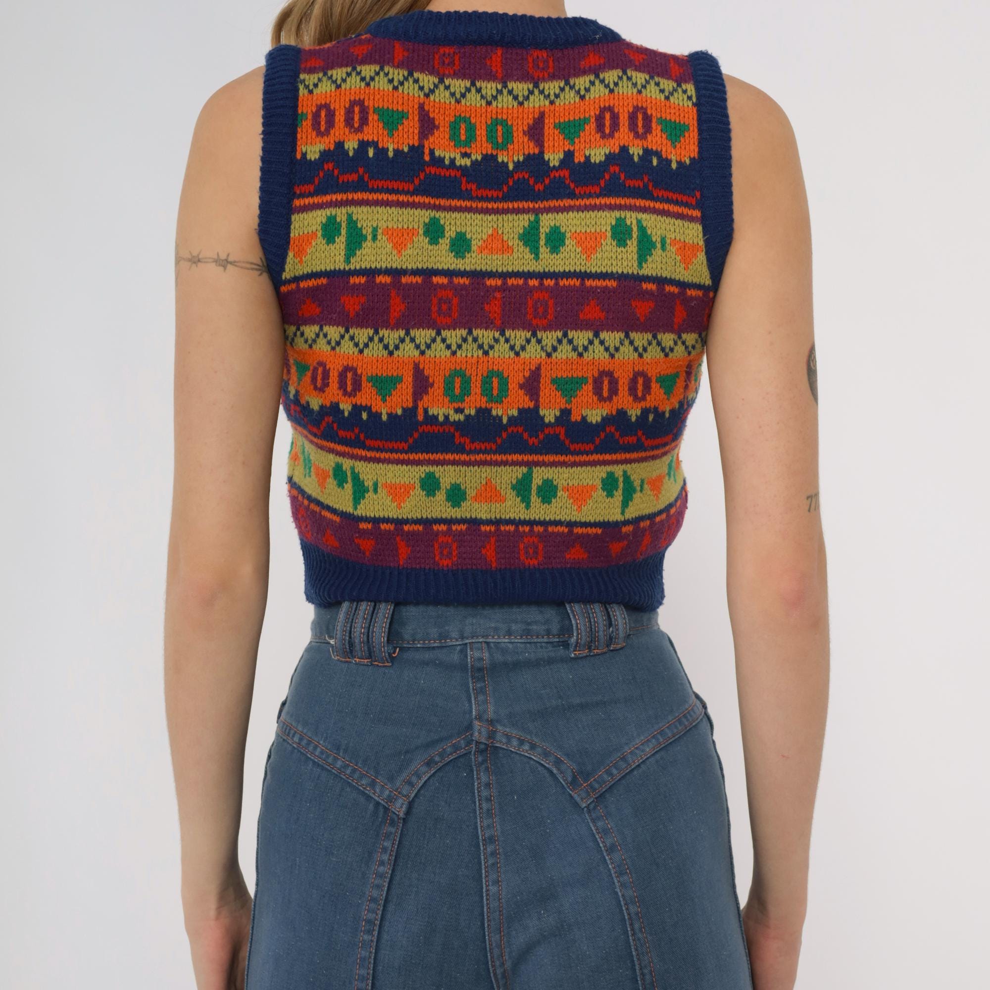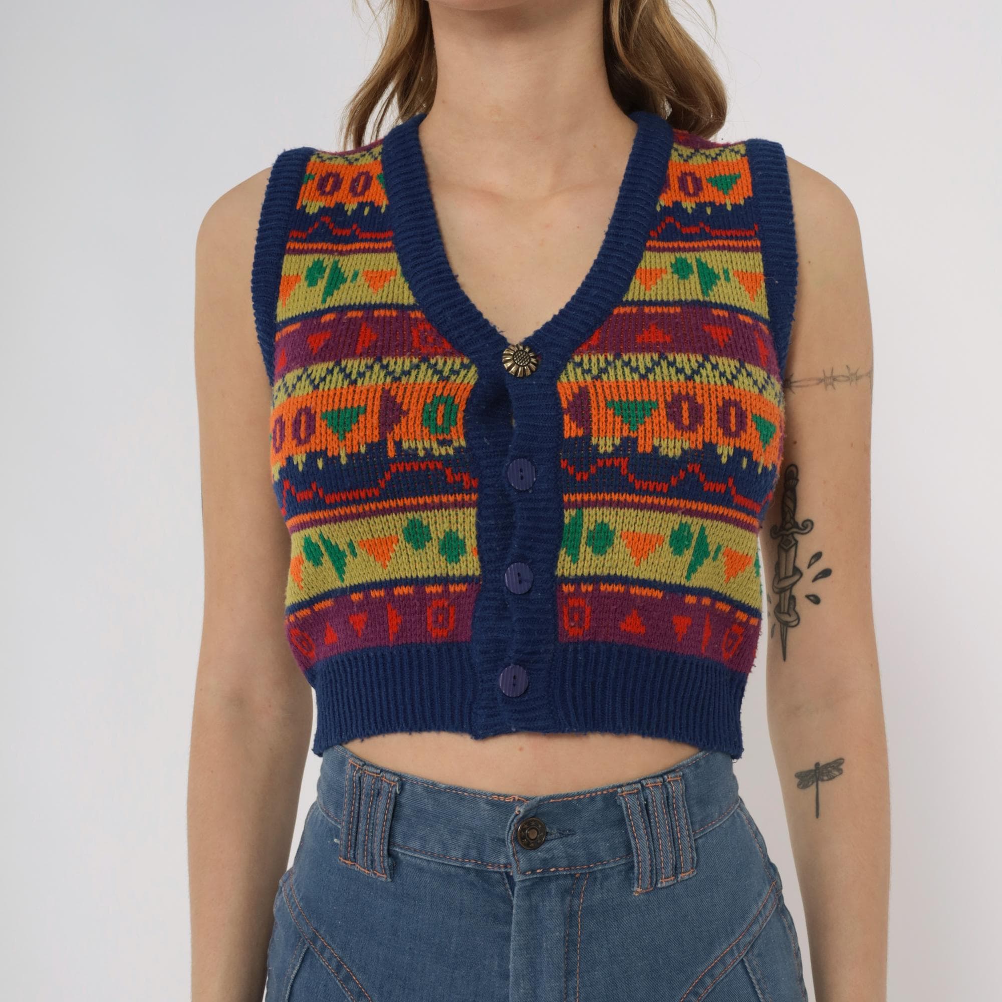1980s cropped sweater vest with vibrant Aztec-inspired pattern in orange, yellow, green, purple, and navy blue. Features button front closure with decorative sunburst button at top. Navy blue ribbed trim around neckline, armholes and hem.