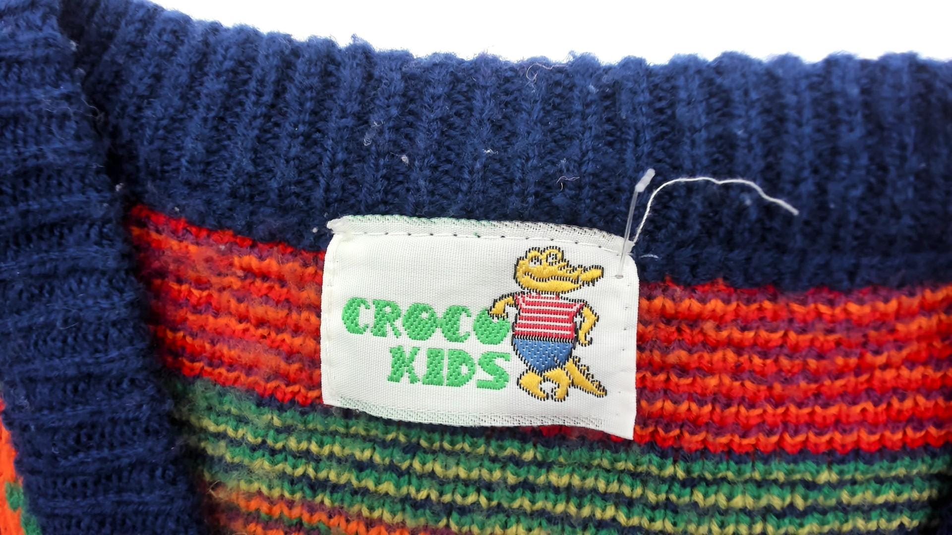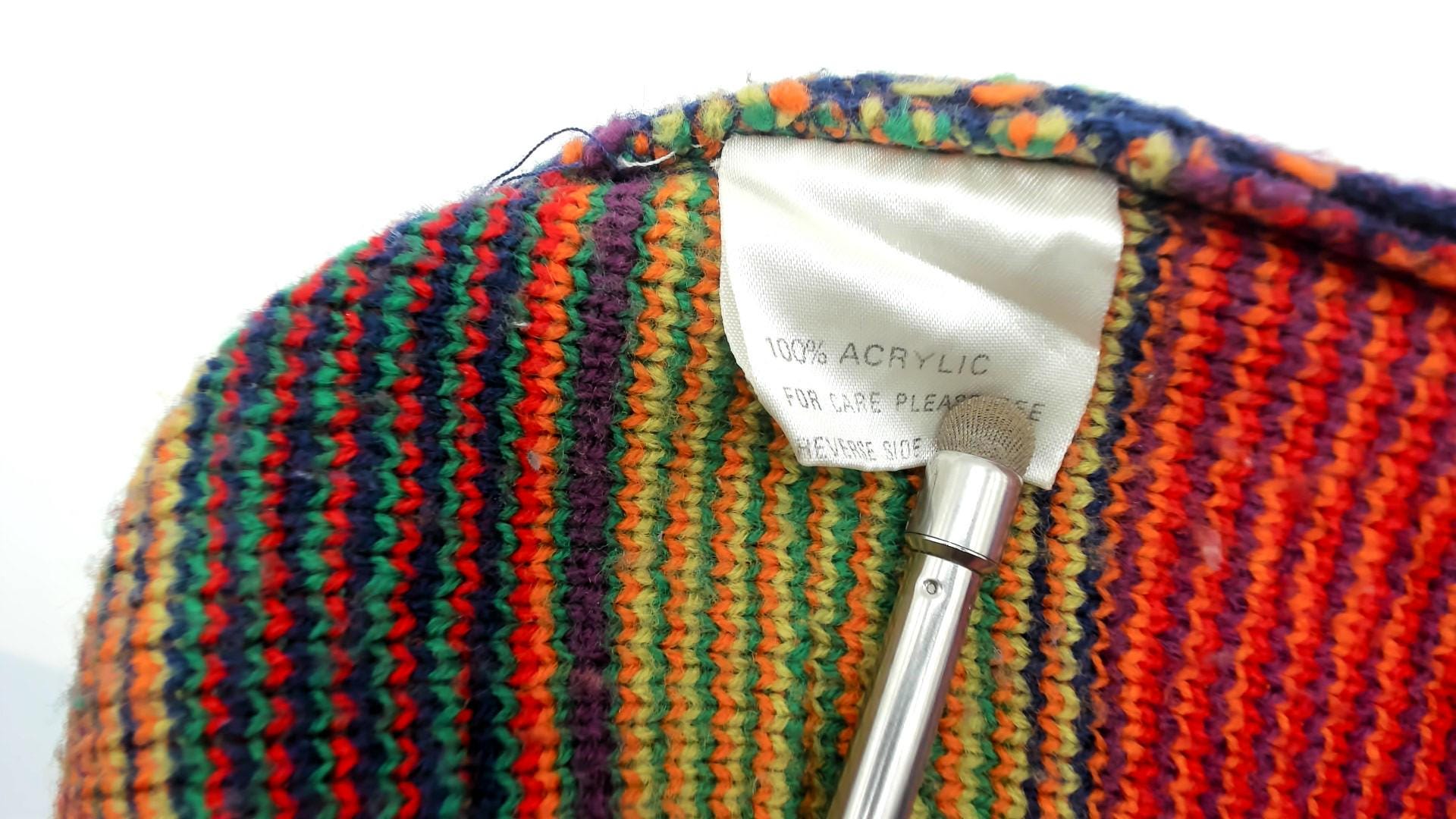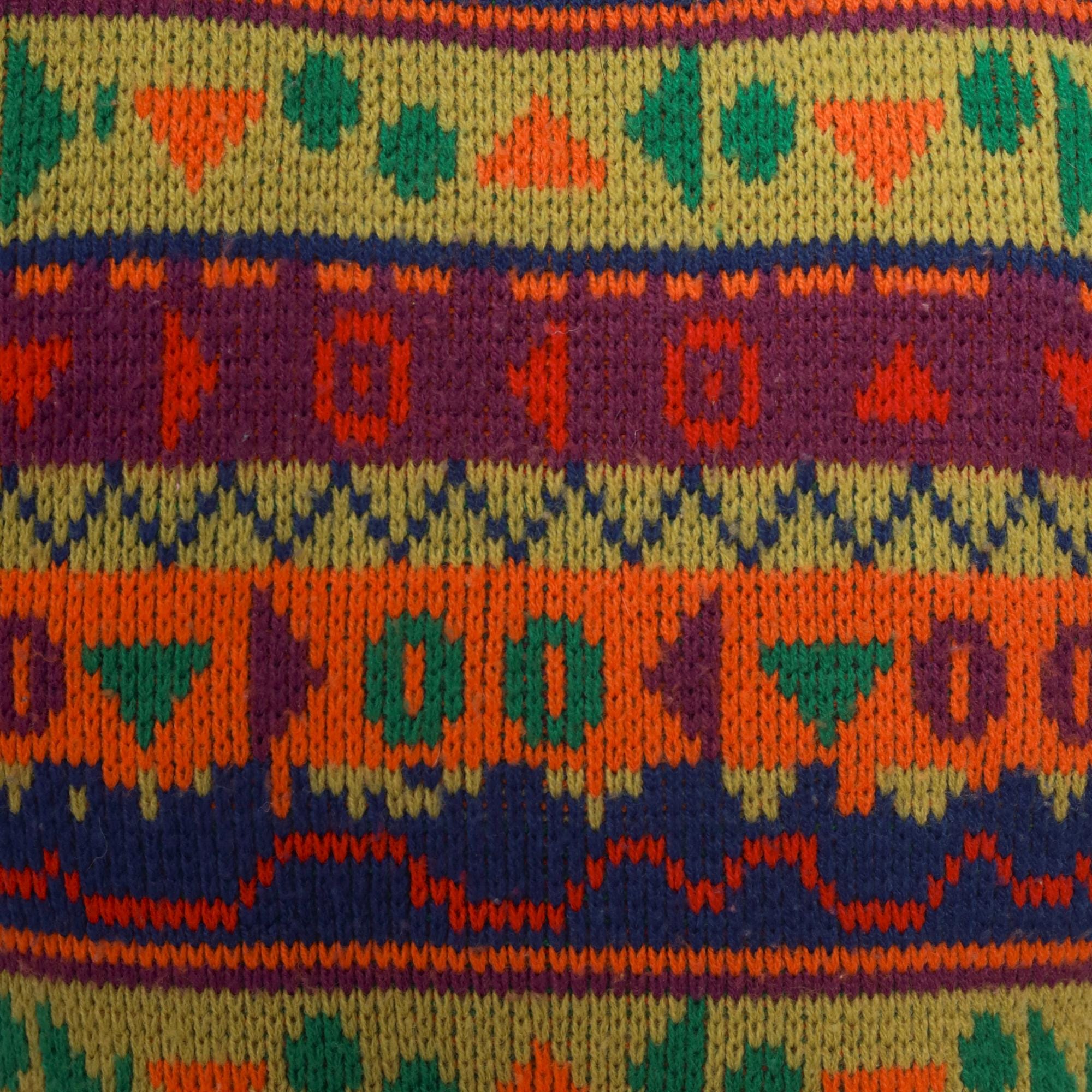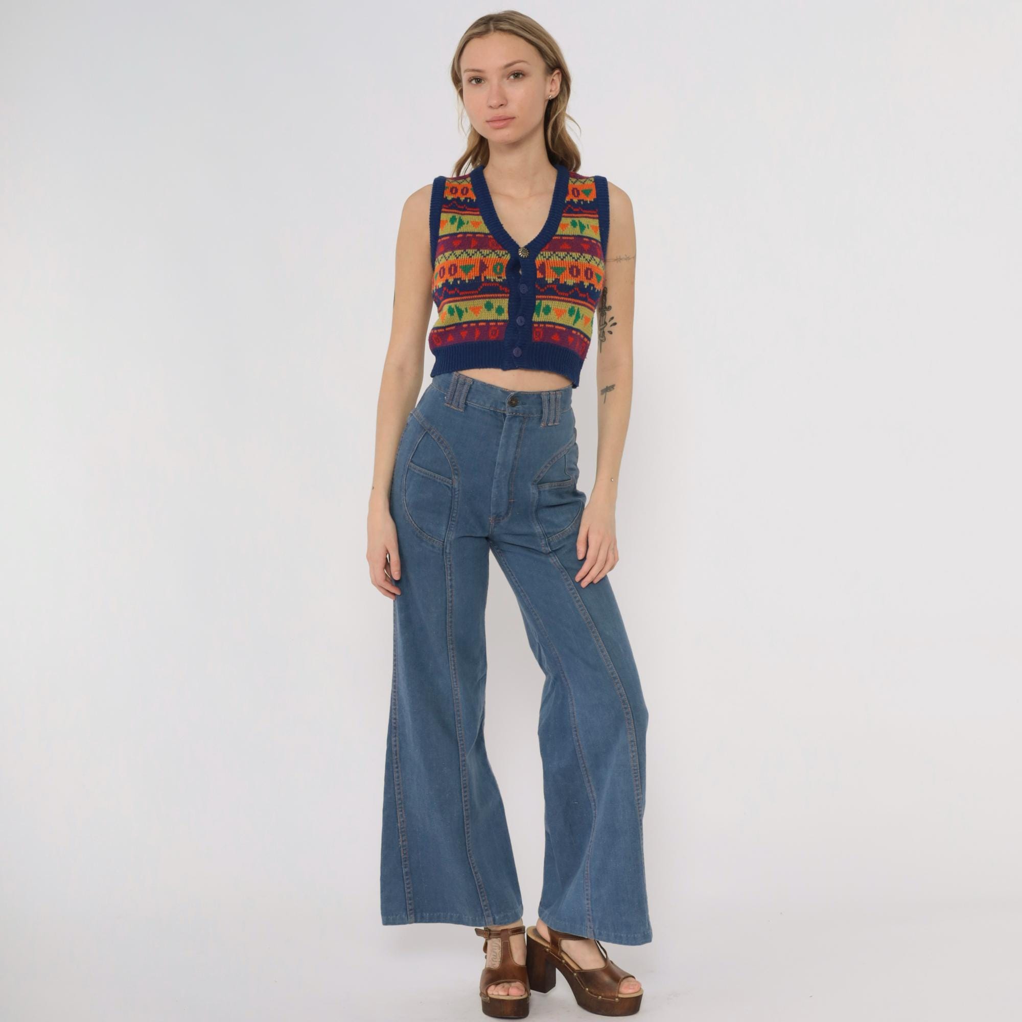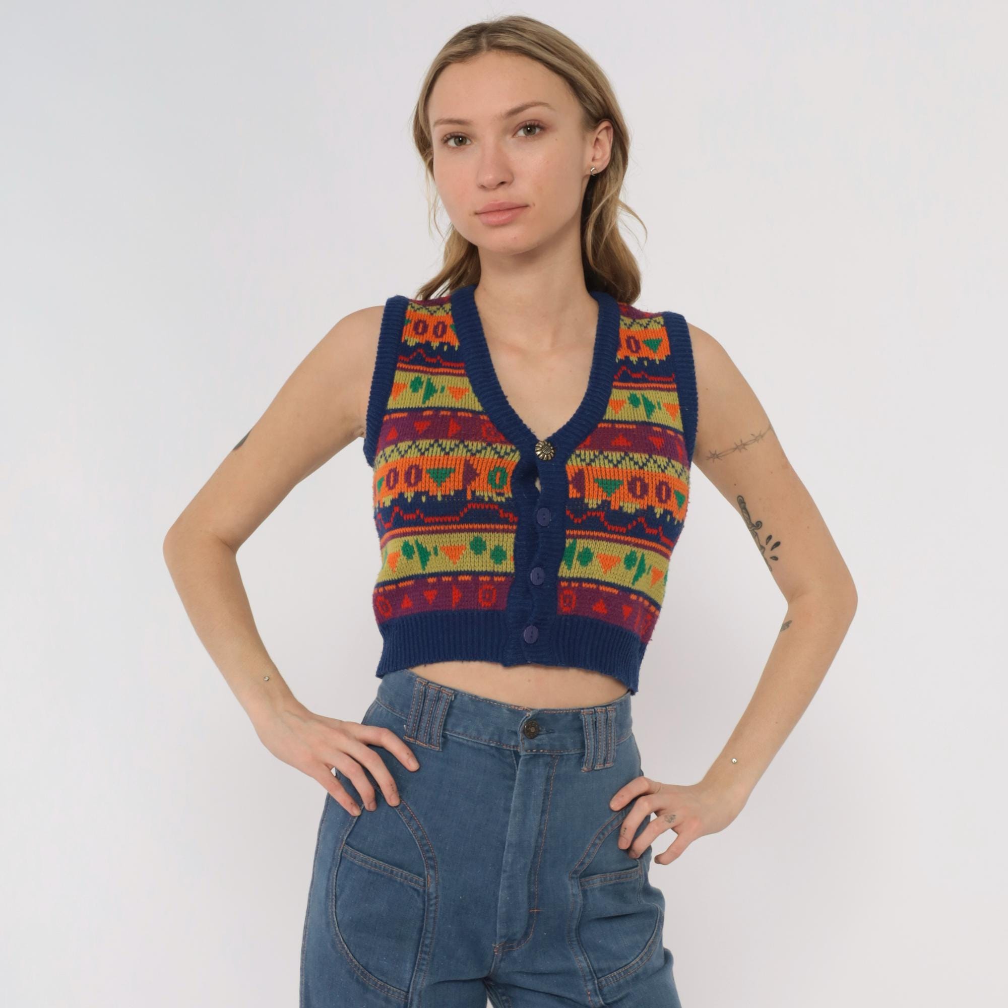 1980s cropped sweater vest with vibrant Aztec-inspired pattern in orange, yellow, green, purple, and navy blue. Features button front closure with decorative sunburst button at top. Navy blue ribbed trim around neckline, armholes and hem.