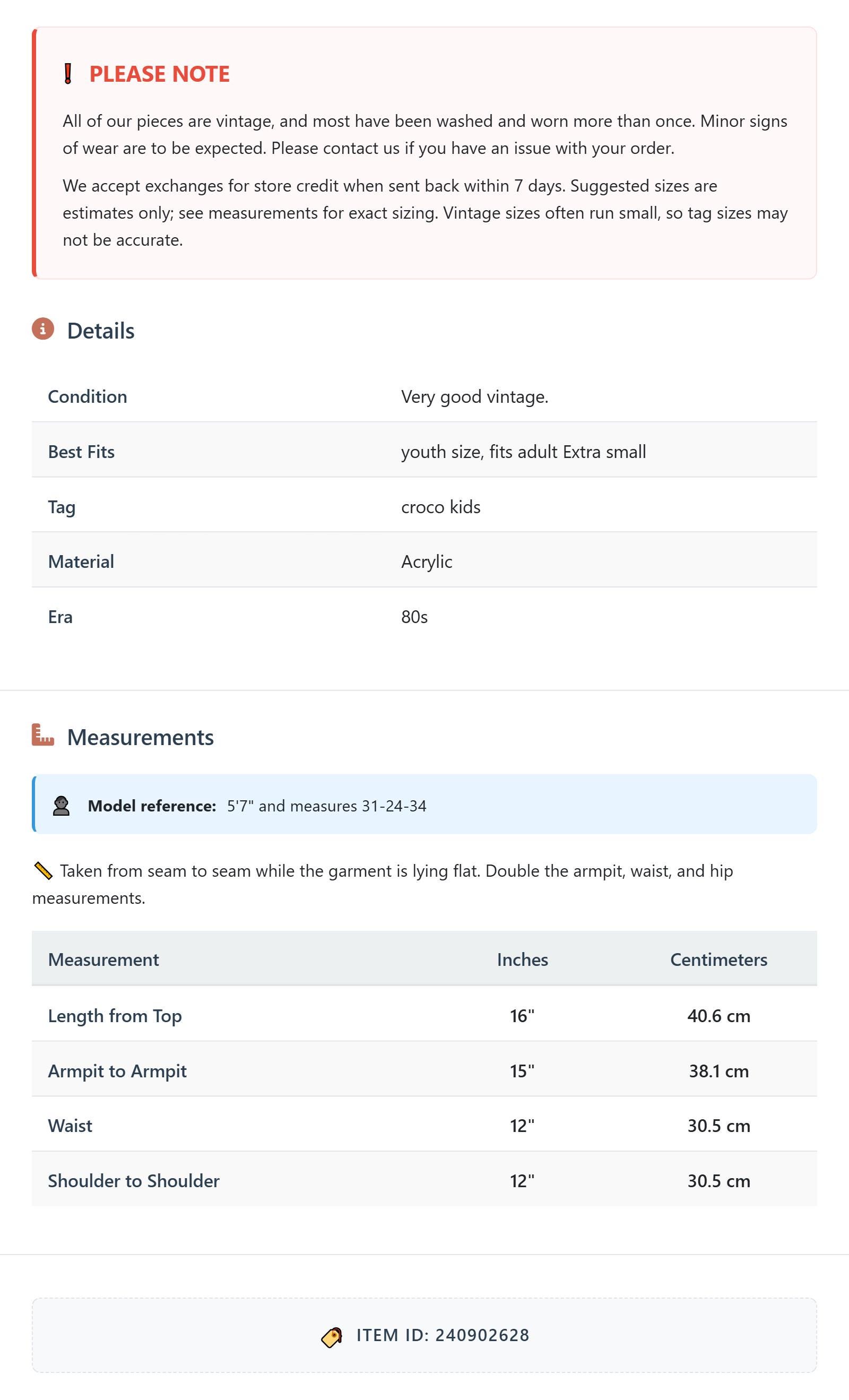 Suggested sizes are estimates only; see measurements for exact sizing. Vintage sizes often run small, so tag sizes may not be accurate.