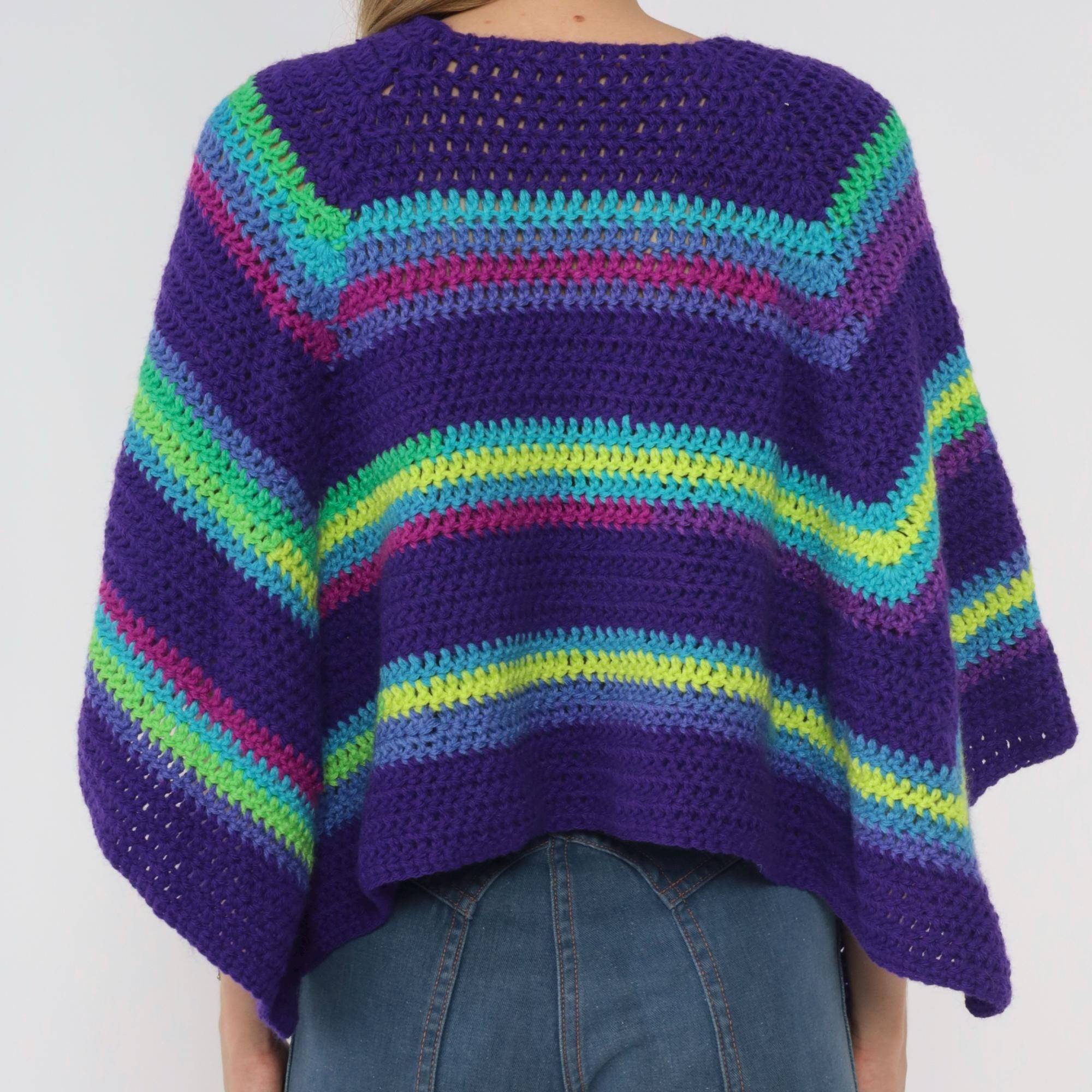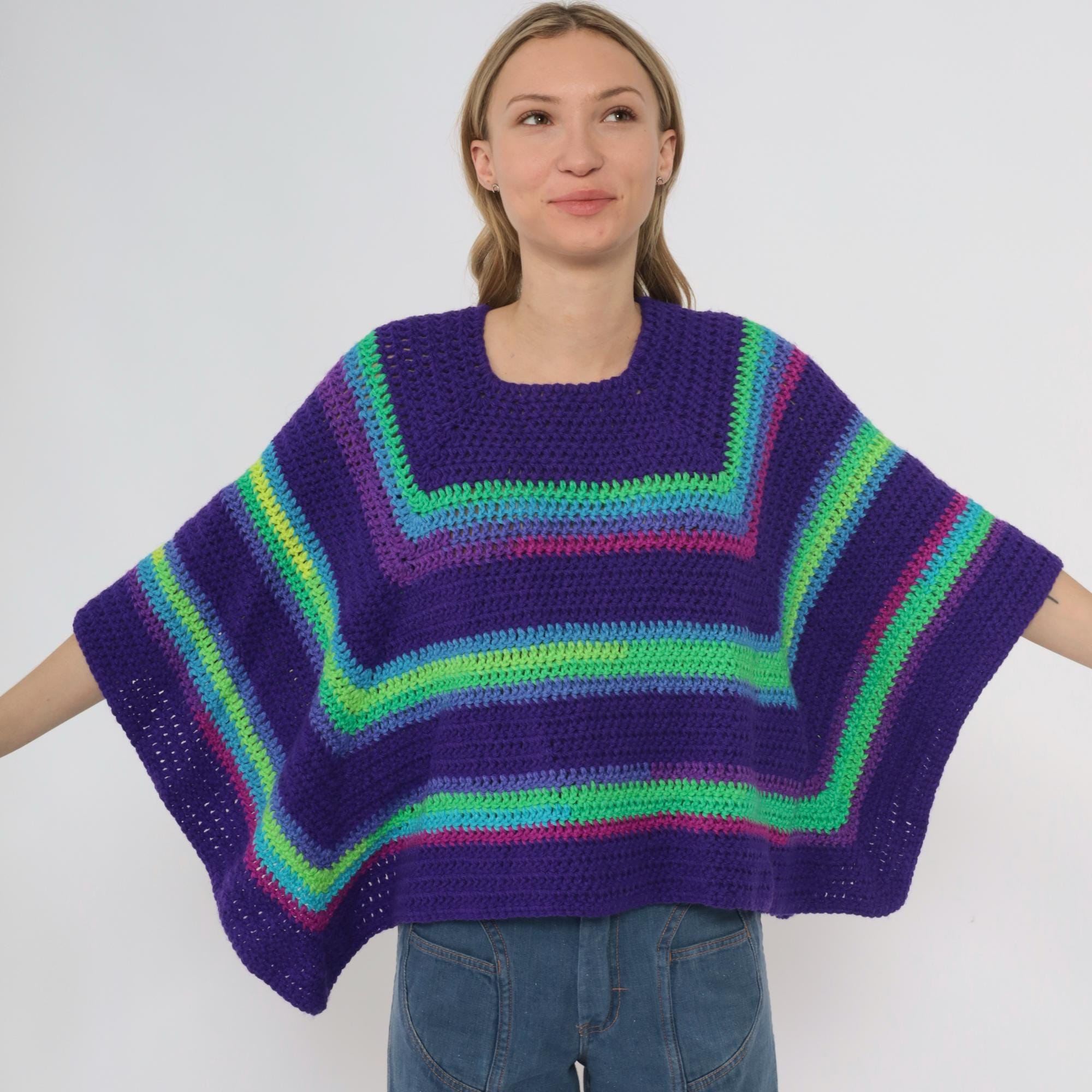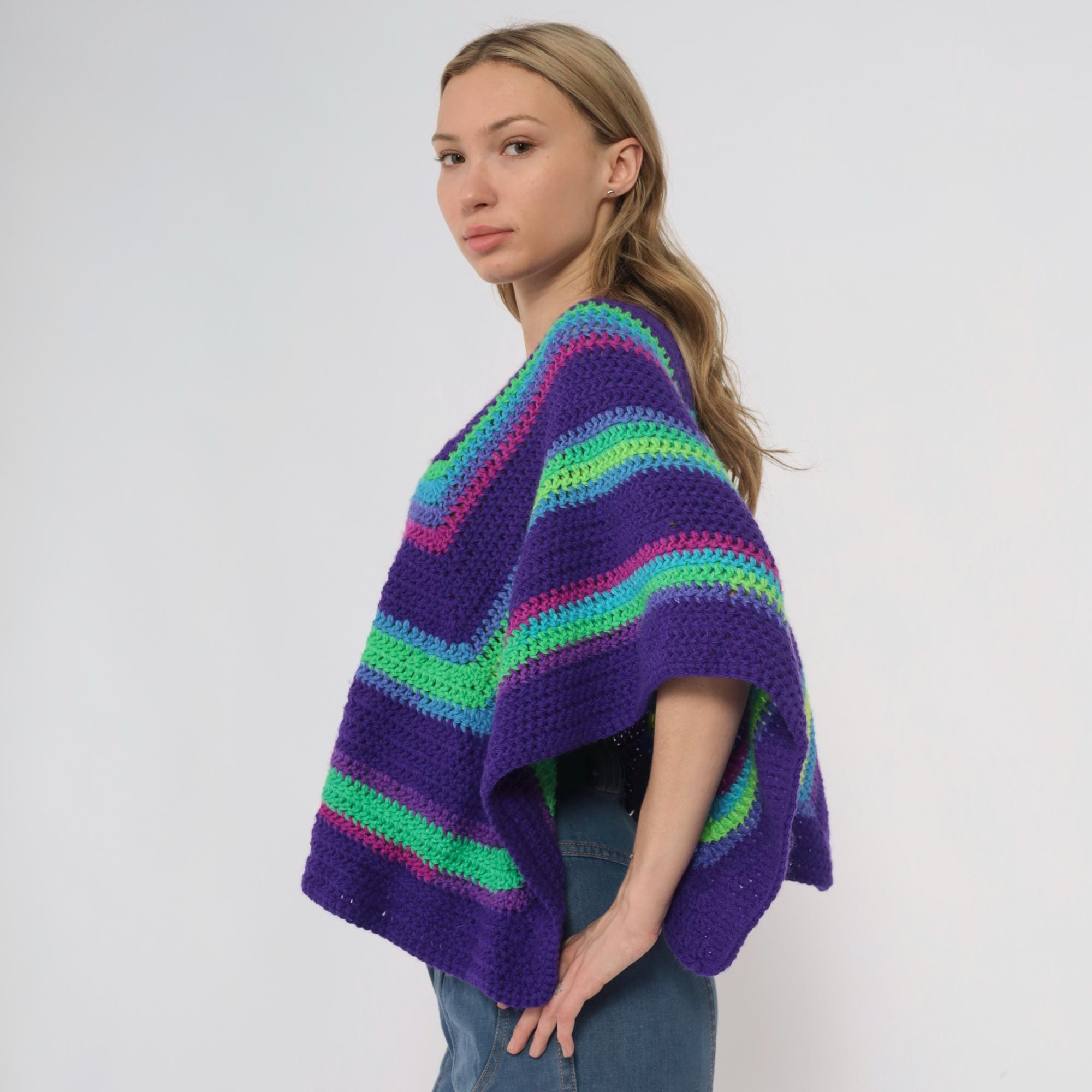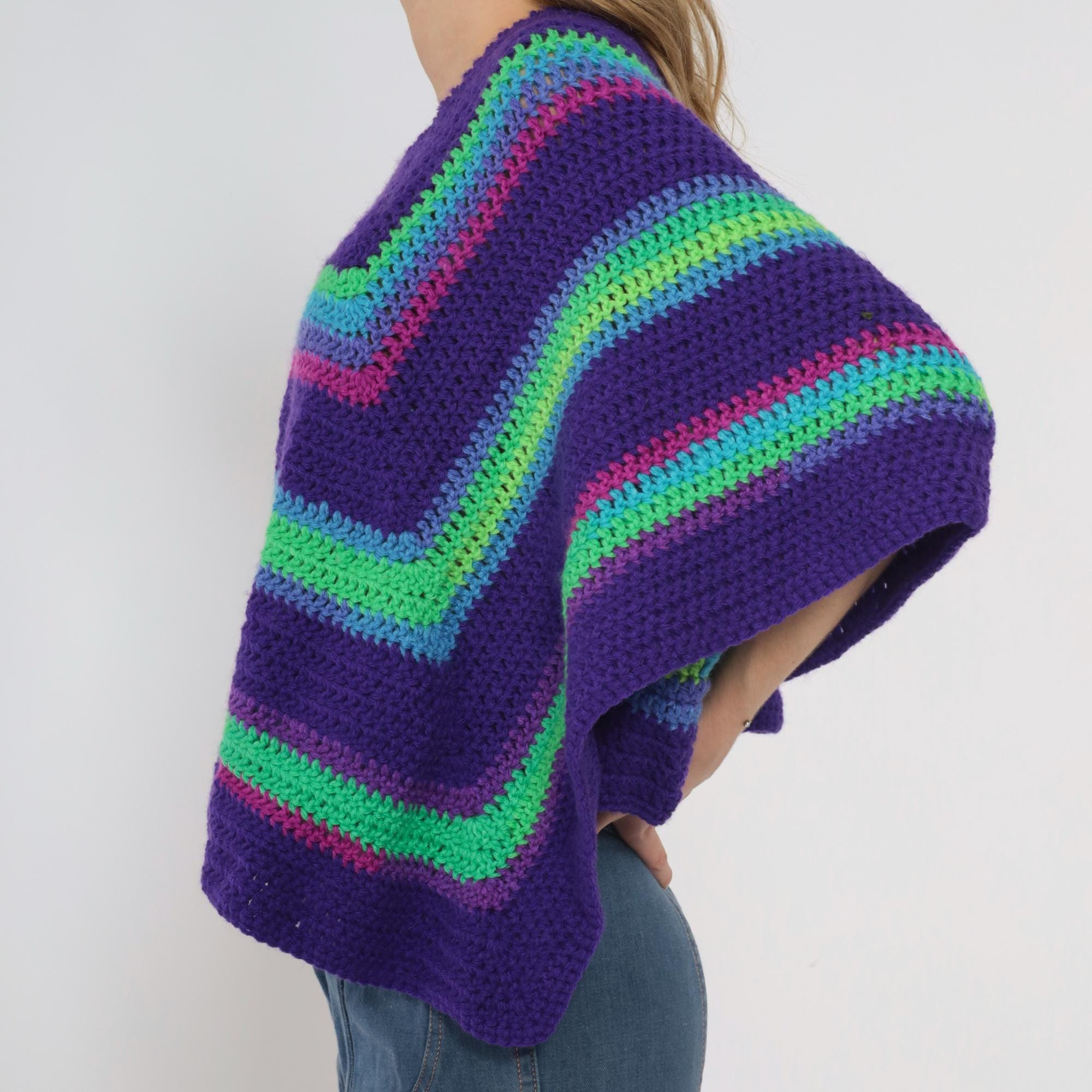 1990s purple crochet poncho featuring vibrant rainbow stripes in neon green, hot pink, and sky blue. Square neckline with a boxy, loose-fitting silhouette.