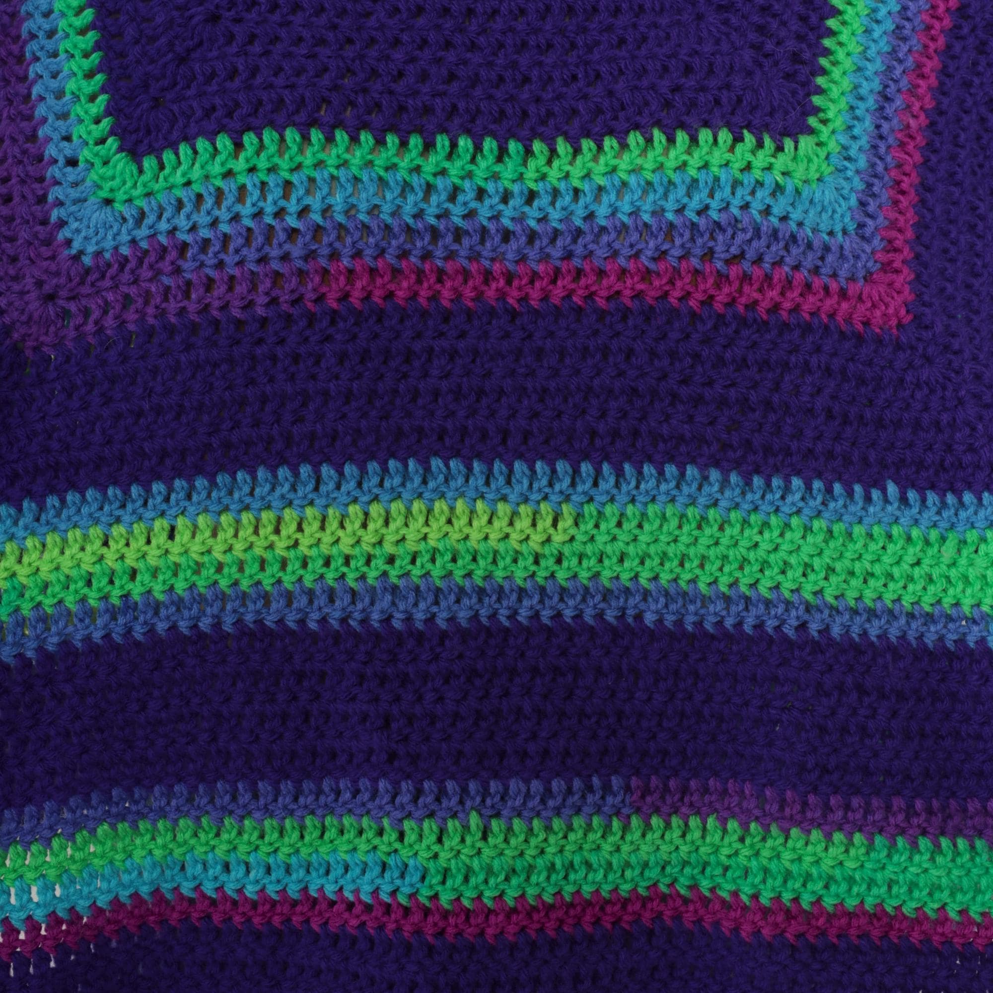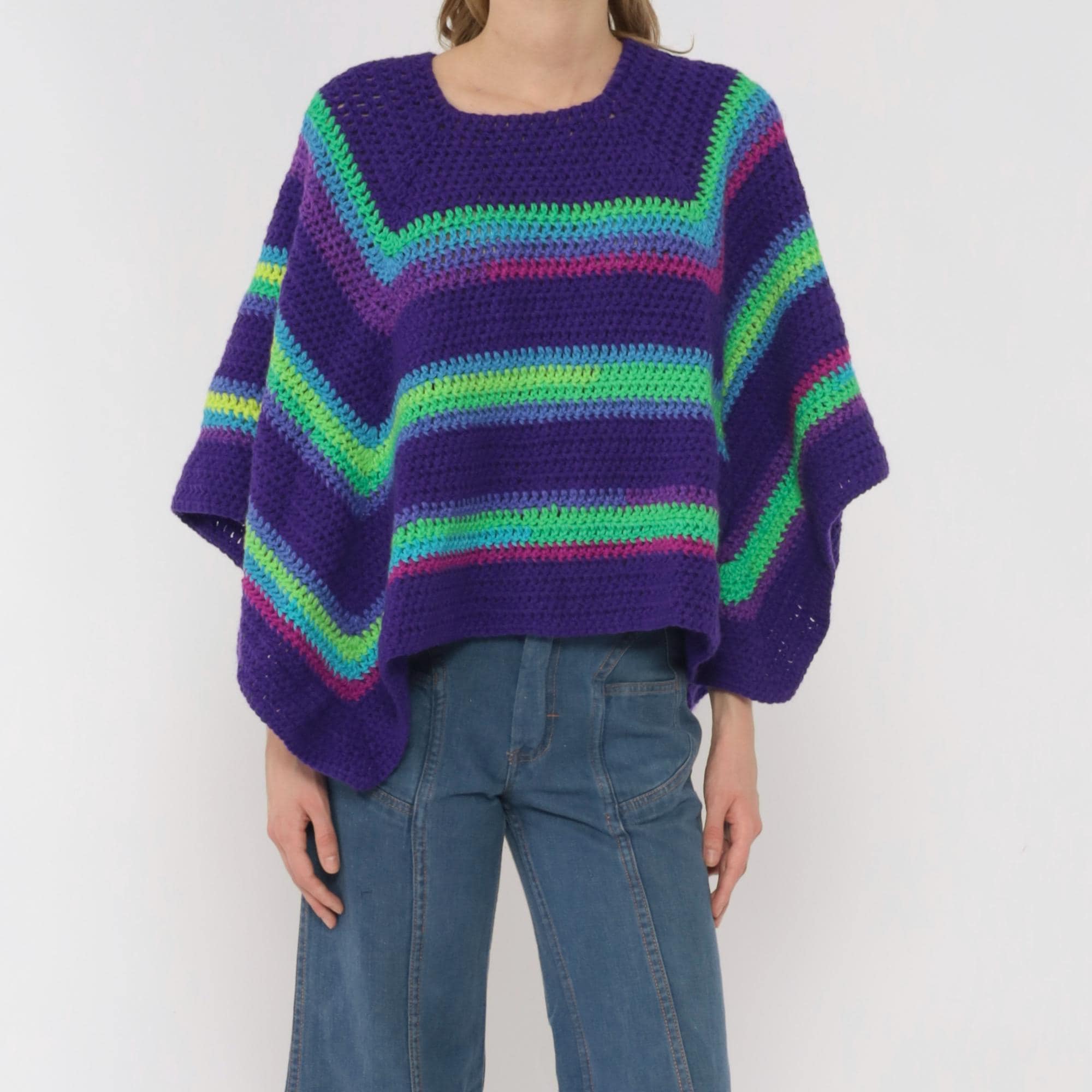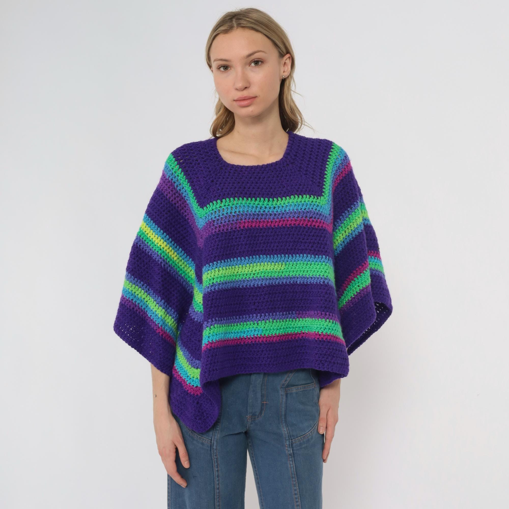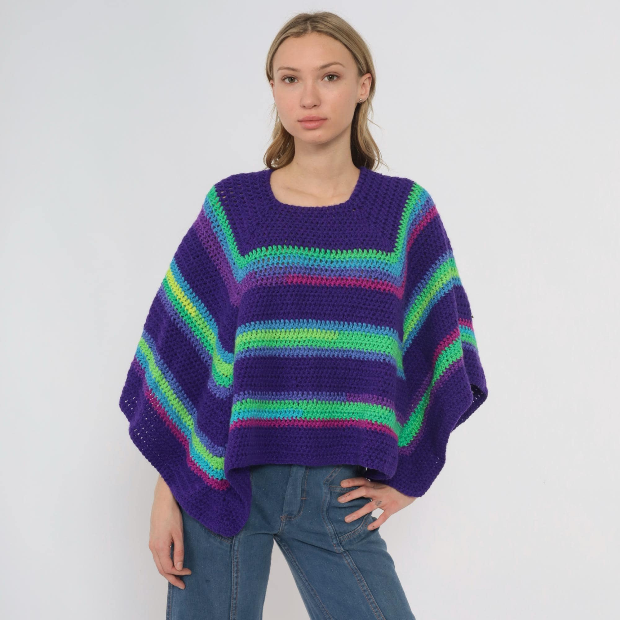 1990s purple crochet poncho featuring vibrant rainbow stripes in neon green, hot pink, and sky blue. Square neckline with a boxy, loose-fitting silhouette.