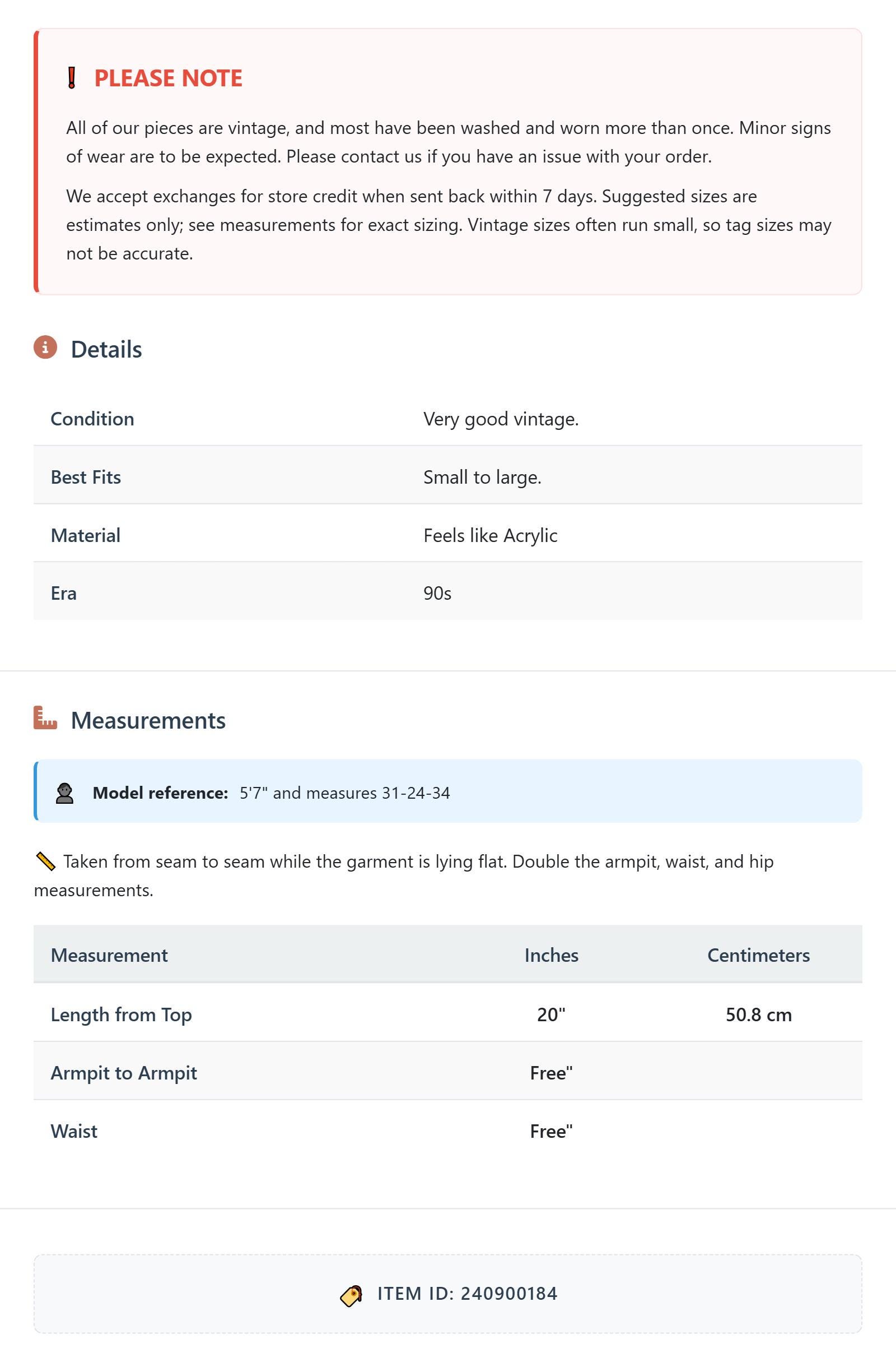 Suggested sizes are estimates only; see measurements for exact sizing. Vintage sizes often run small, so tag sizes may not be accurate.