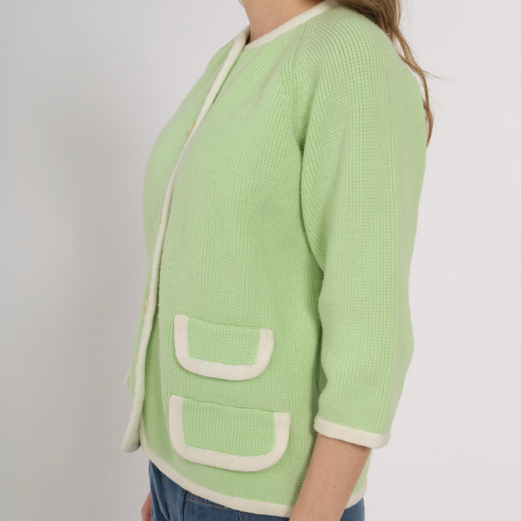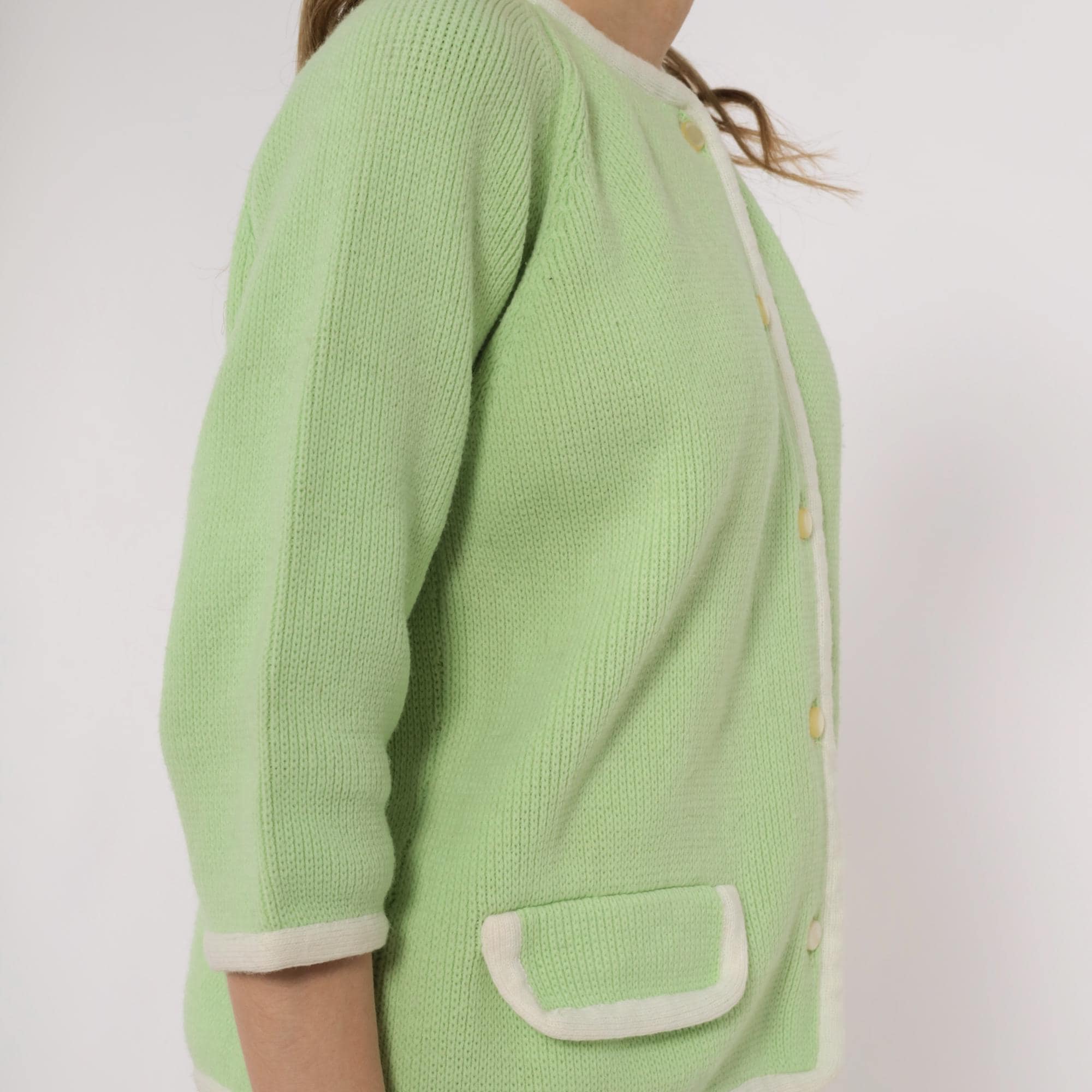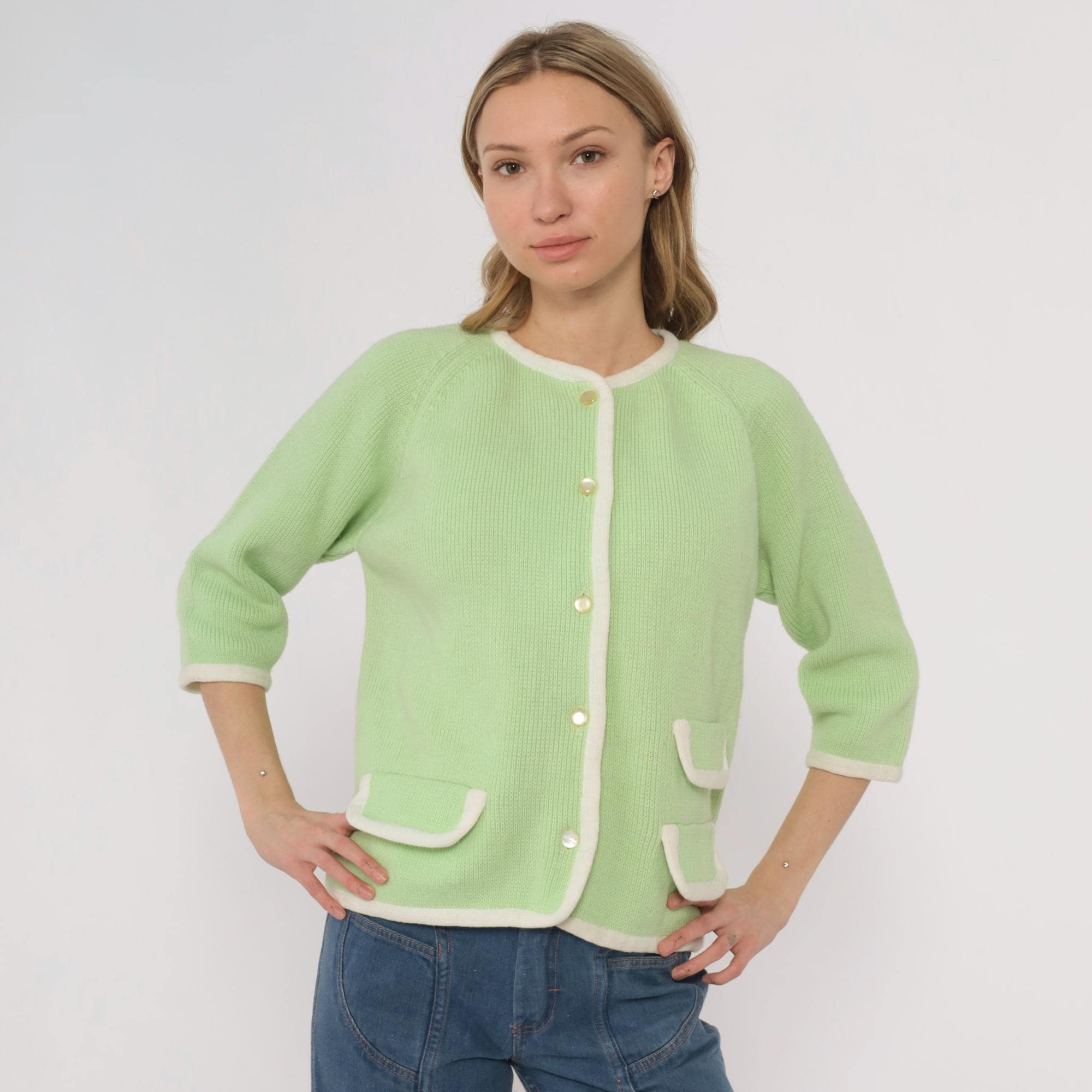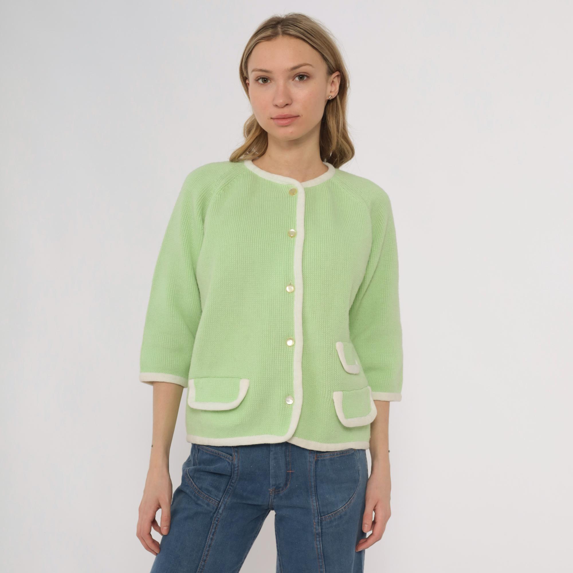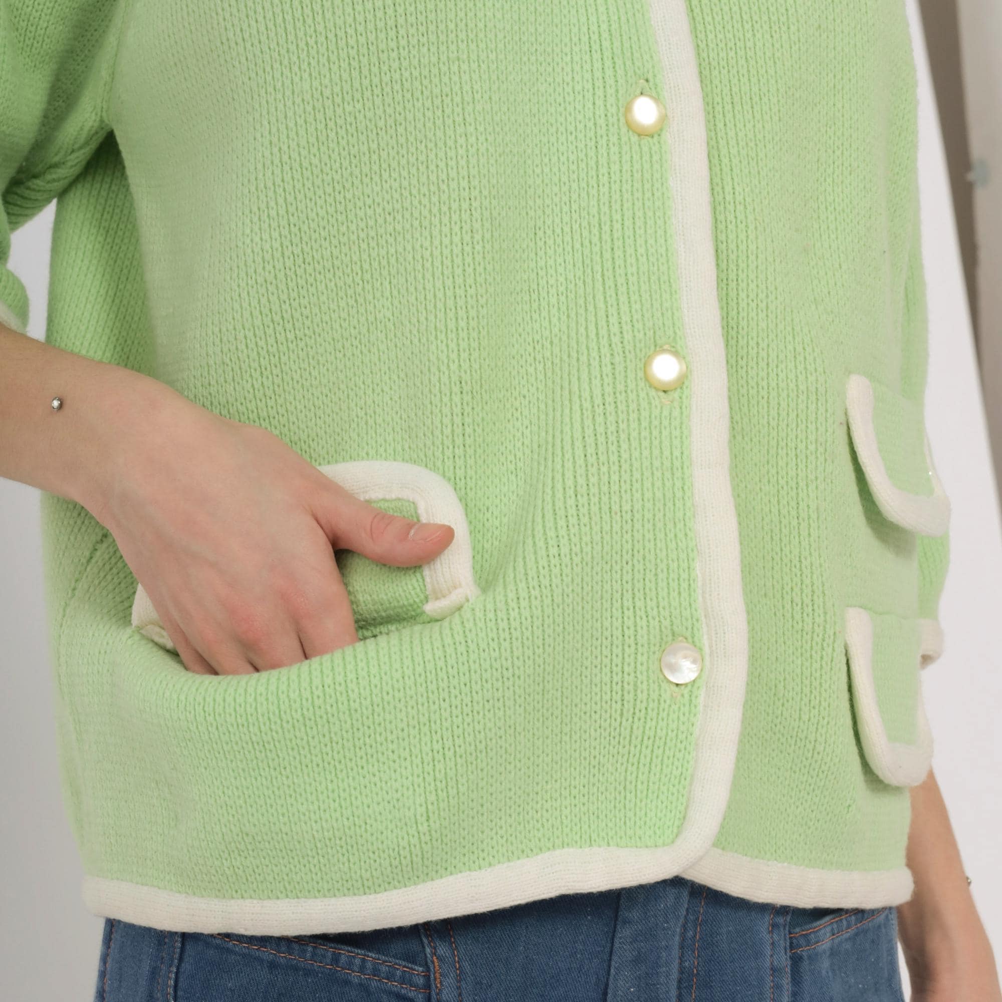 1970s mint green cardigan with white contrast trim and pearlescent buttons. Features 3/4 length sleeves and two front pockets with white trim detail.