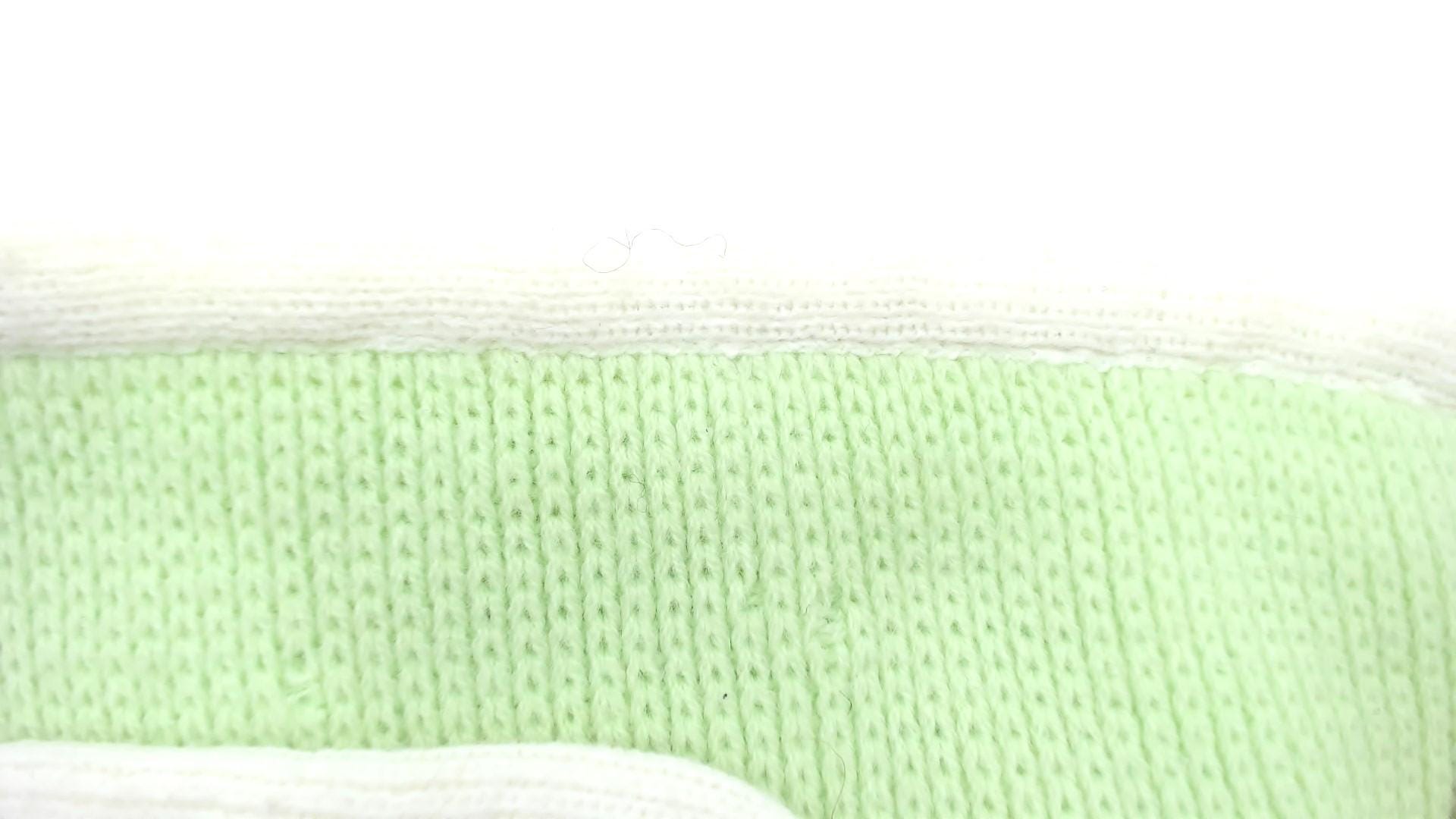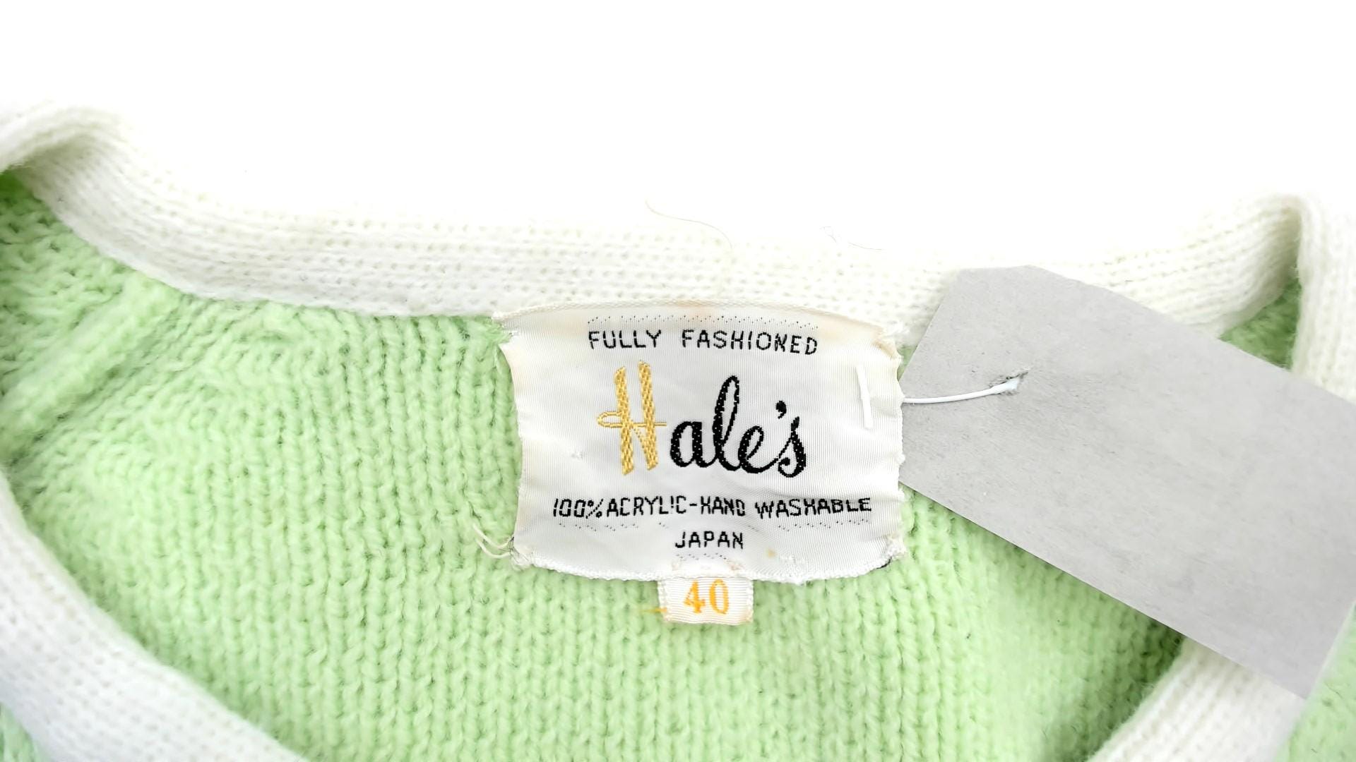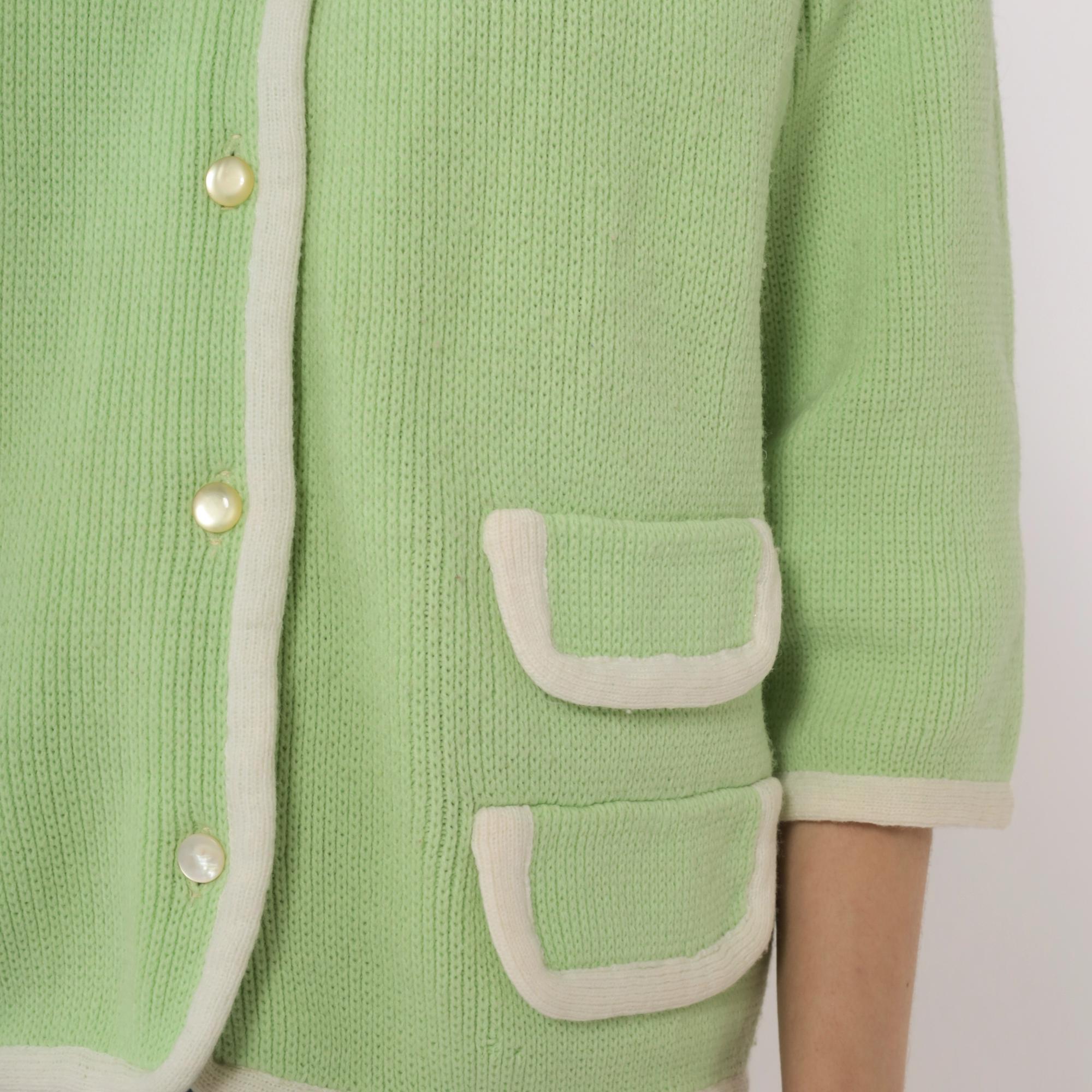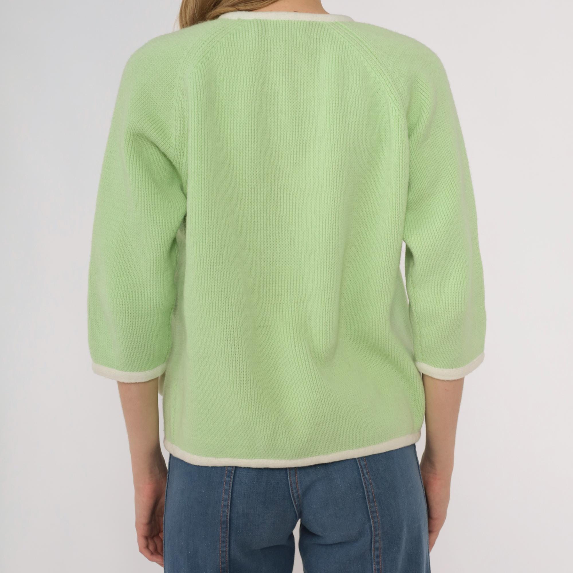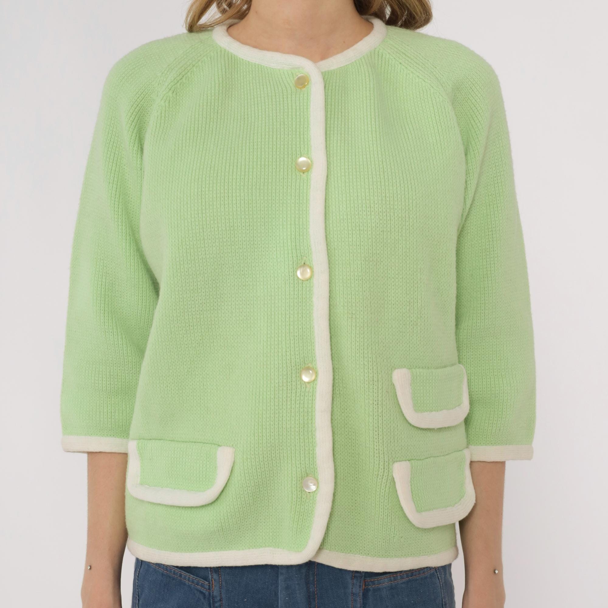 1970s mint green cardigan with white contrast trim and pearlescent buttons. Features 3/4 length sleeves and two front pockets with white trim detail.