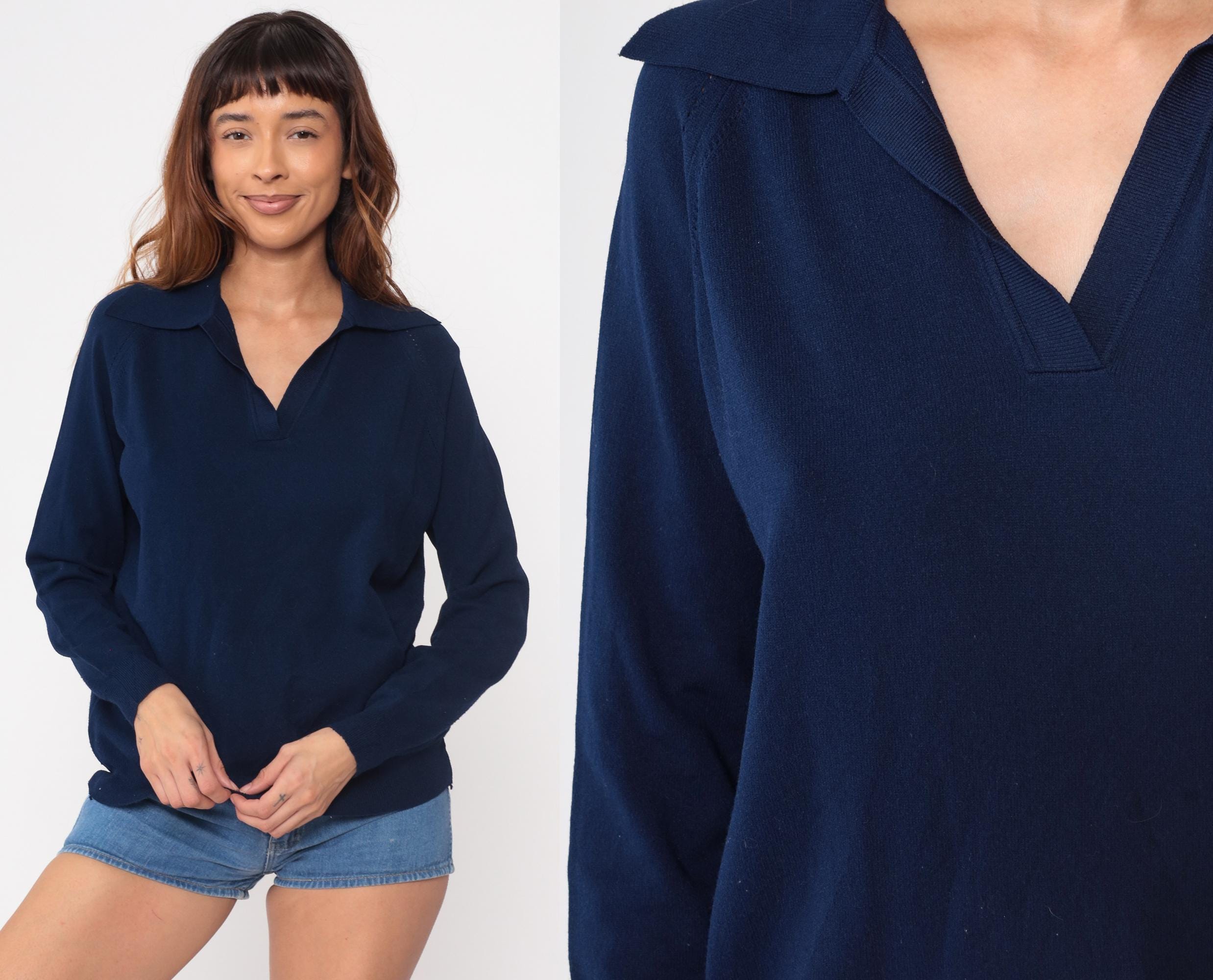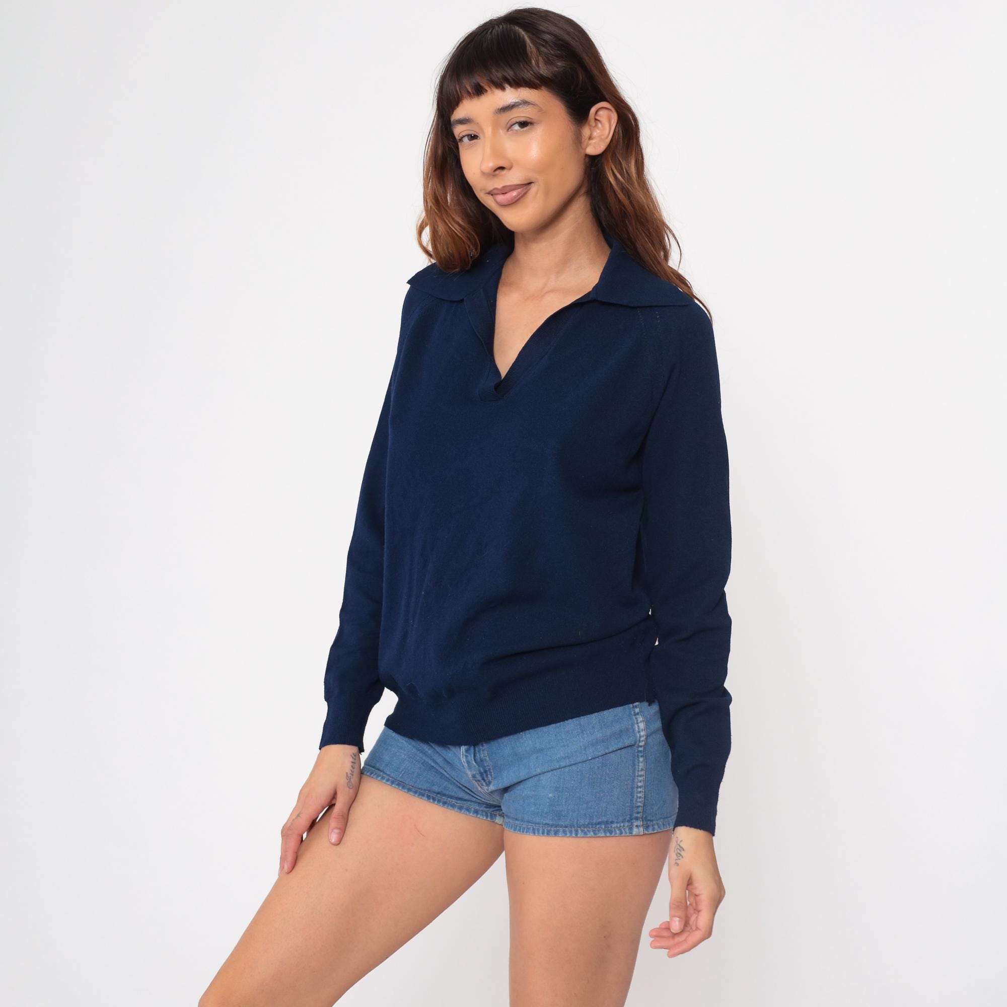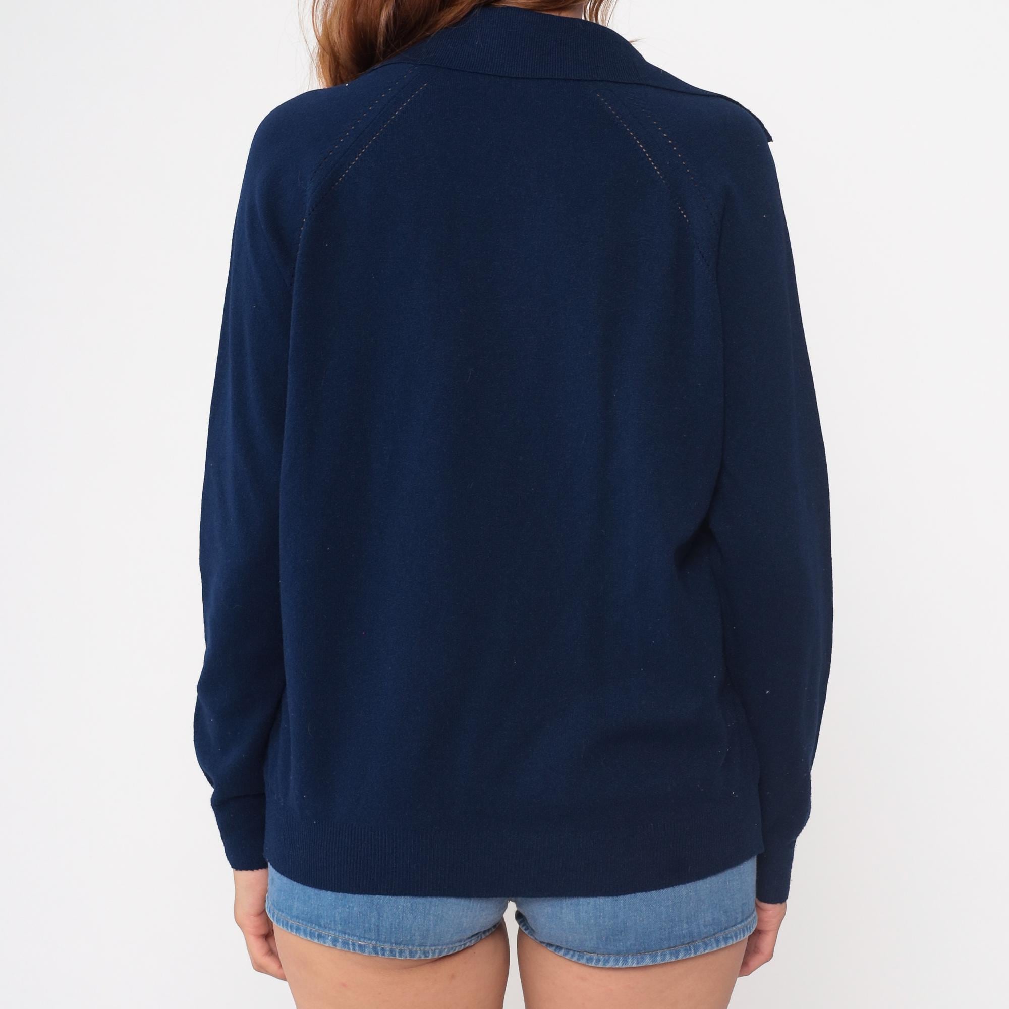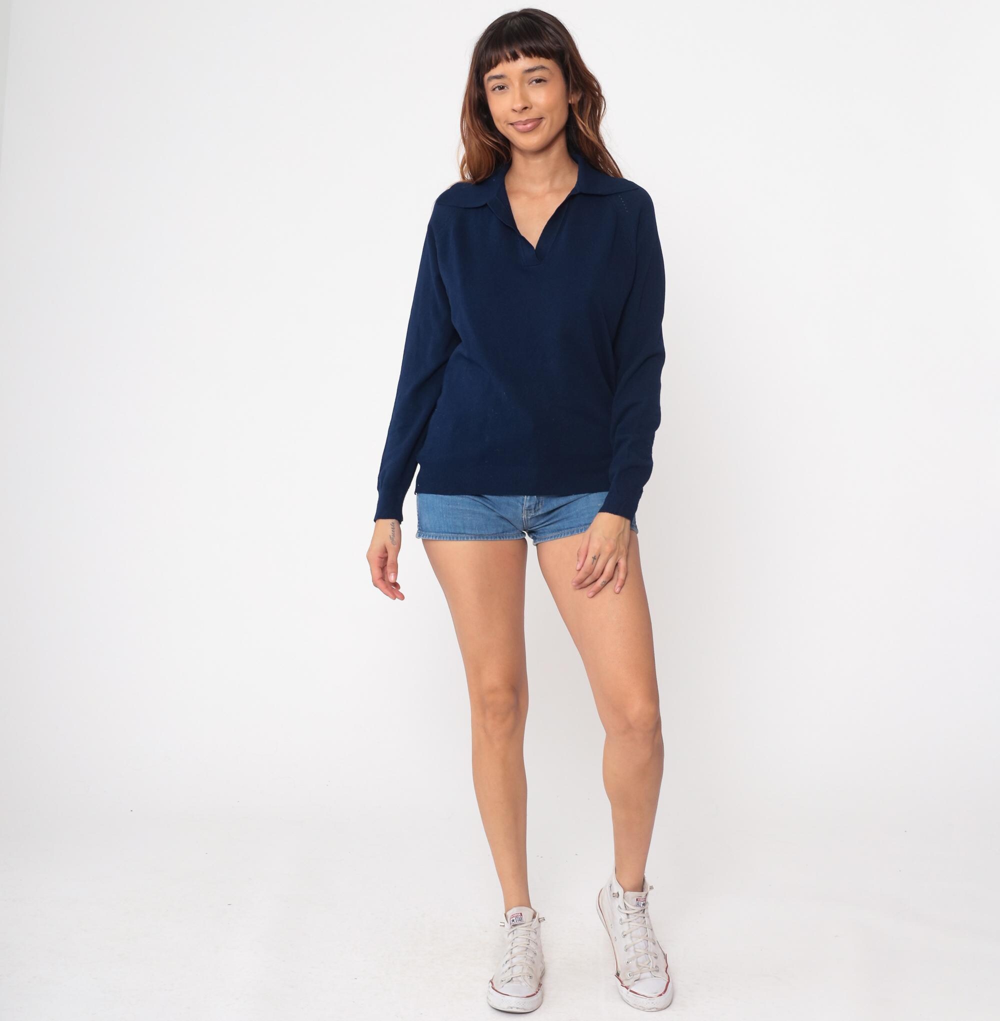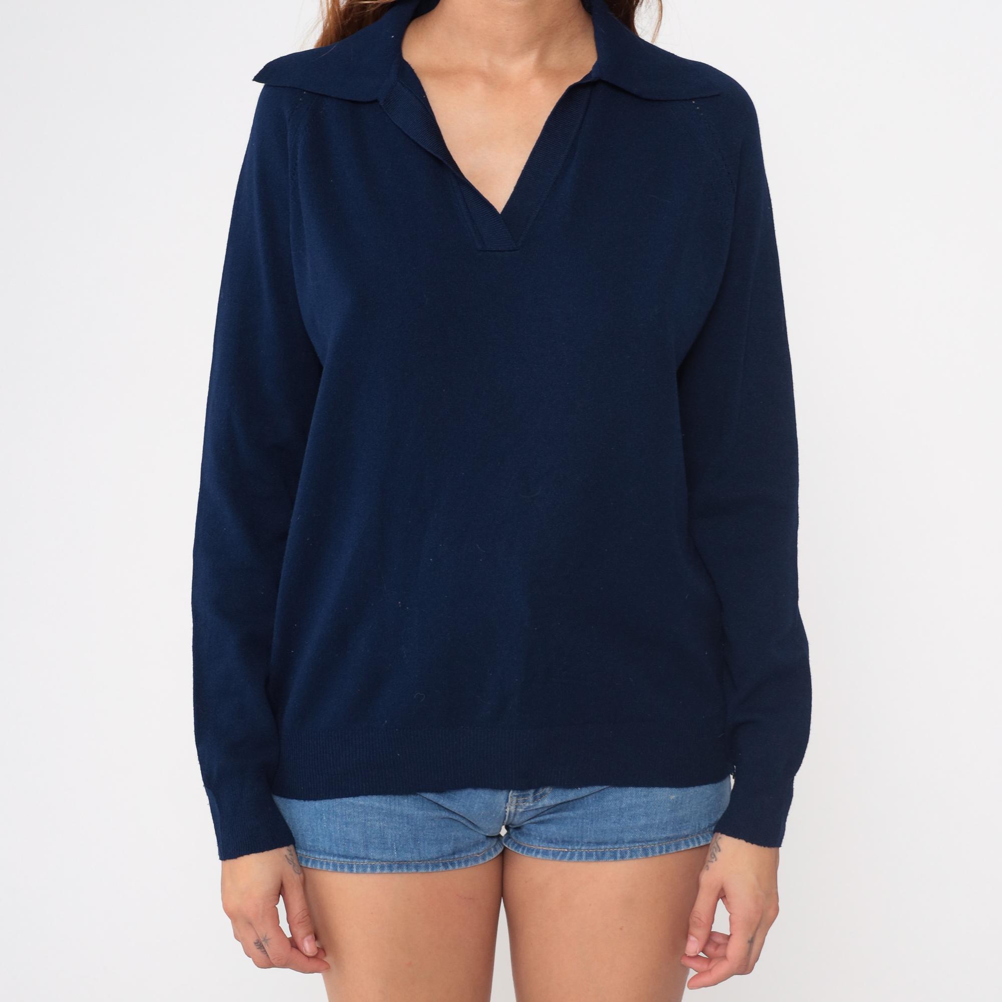 70s navy blue sweater with distinctive polo-style collar and v-neck design. Features ribbed cuffs and waistband, pullover style with no closures. Classic straight fit with relaxed silhouette.