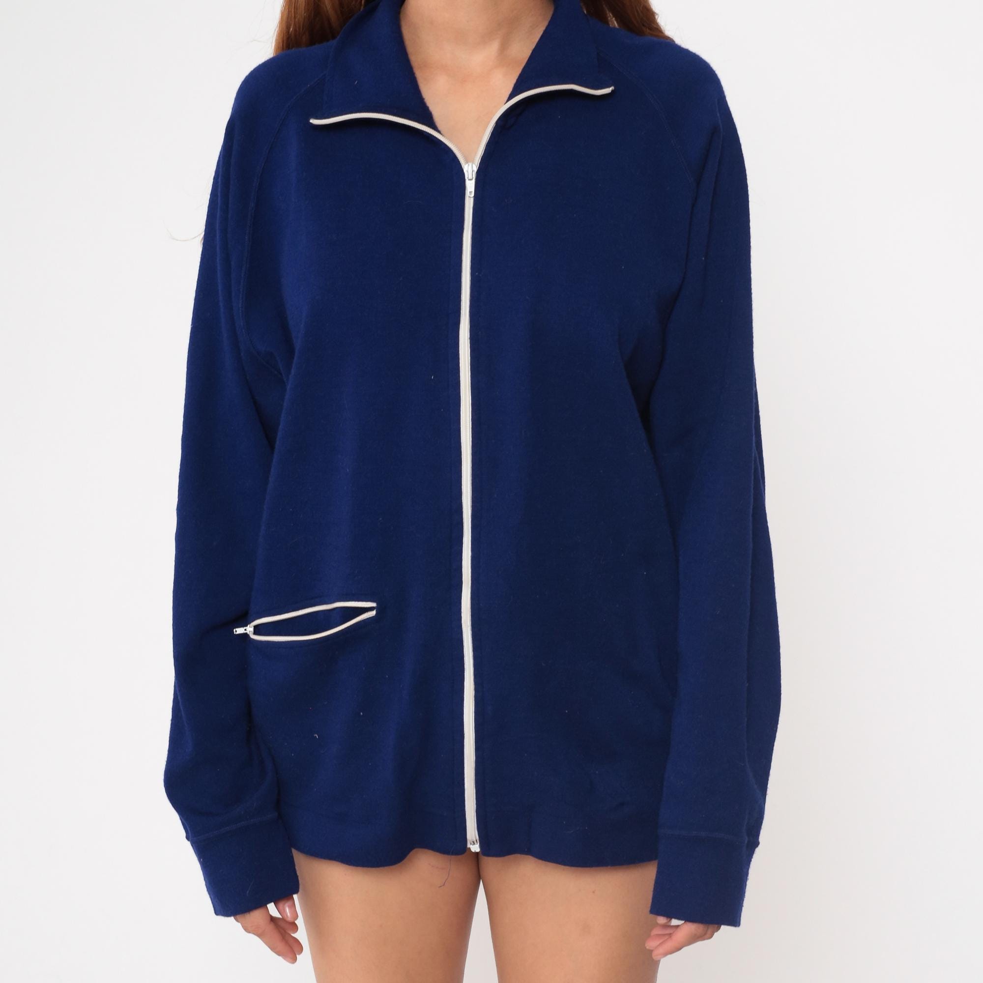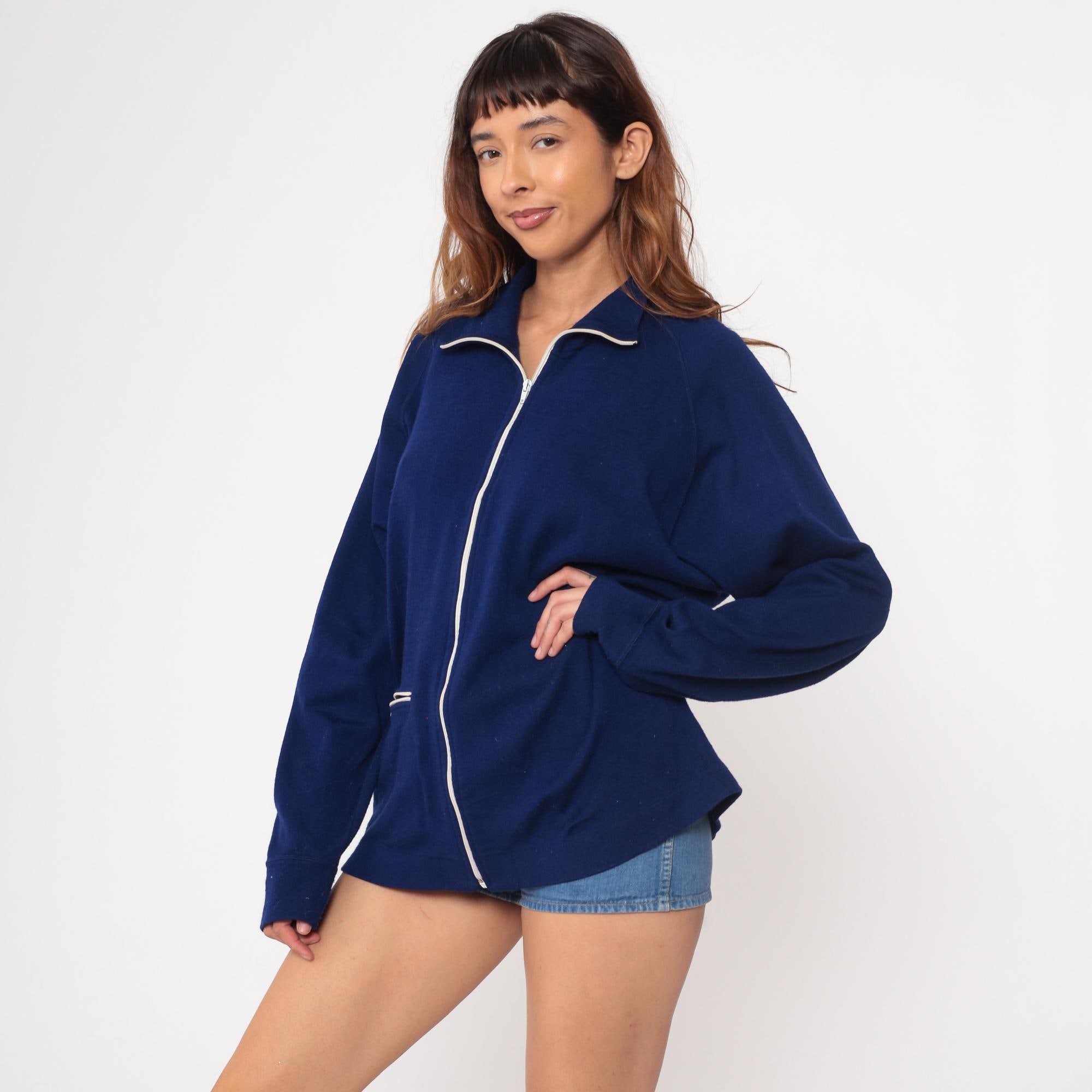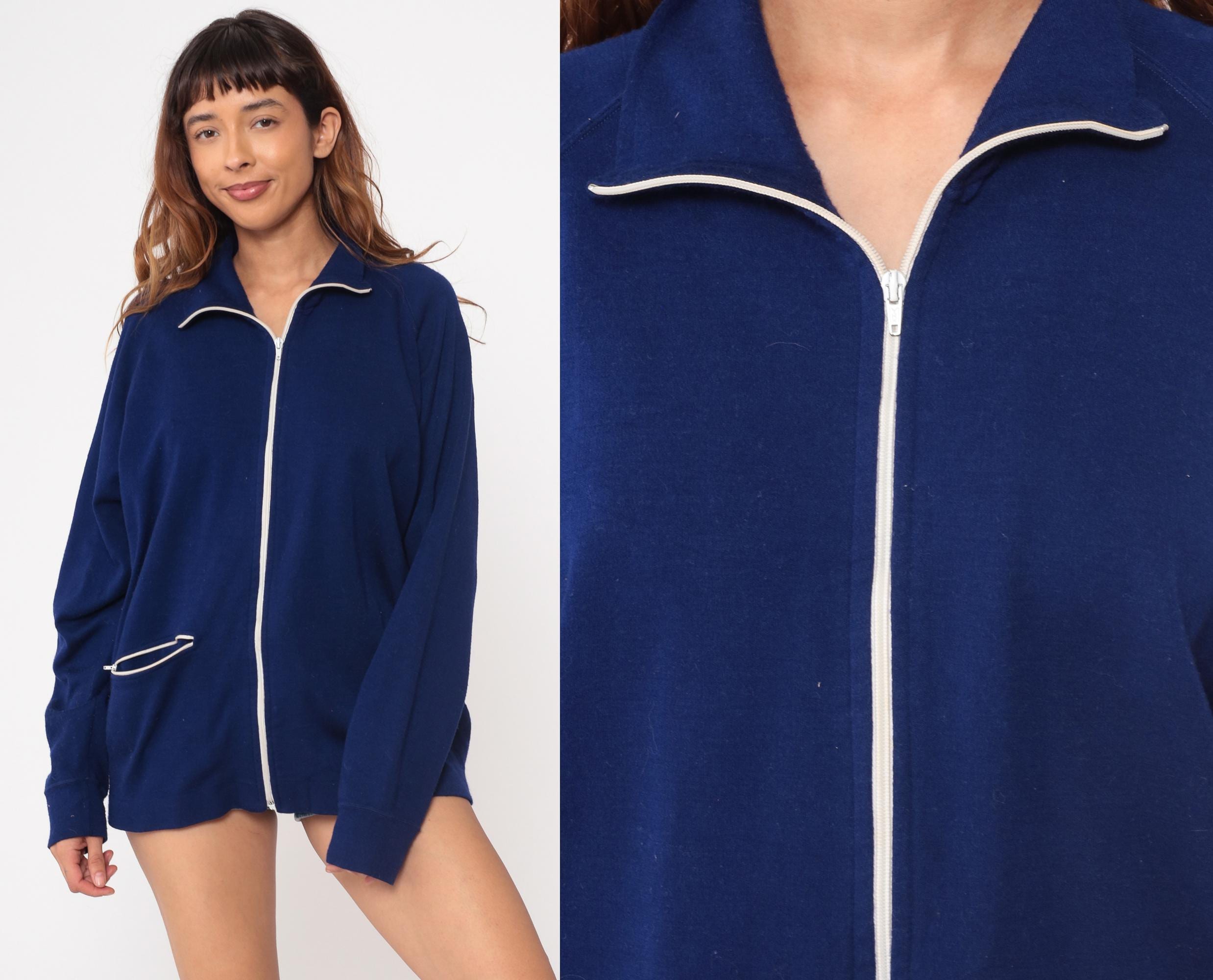 80s navy blue track jacket from The Spartan brand. Features distinctive white piping trim along the zipper, collar and pocket. Full front metal zipper closure with functional side pocket.