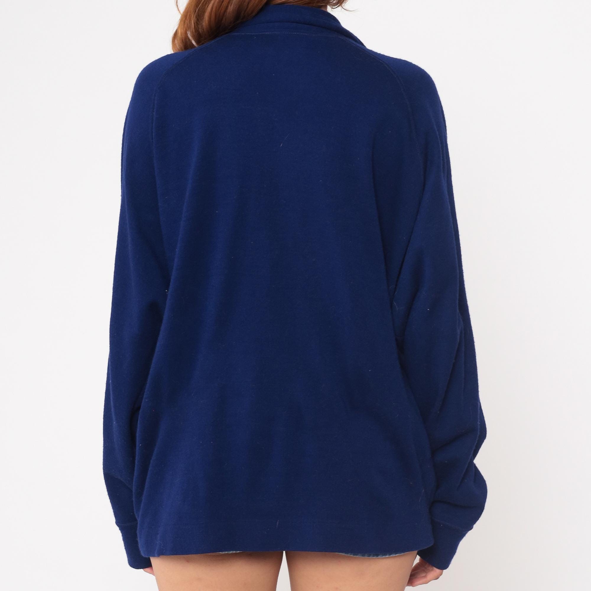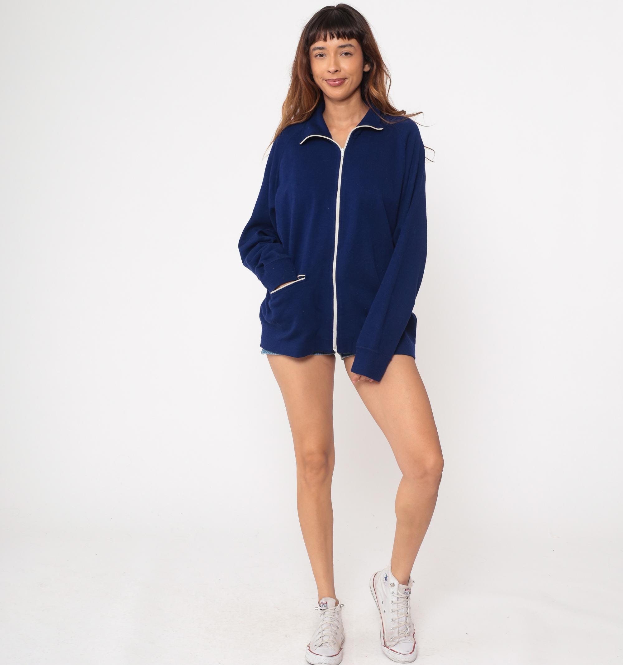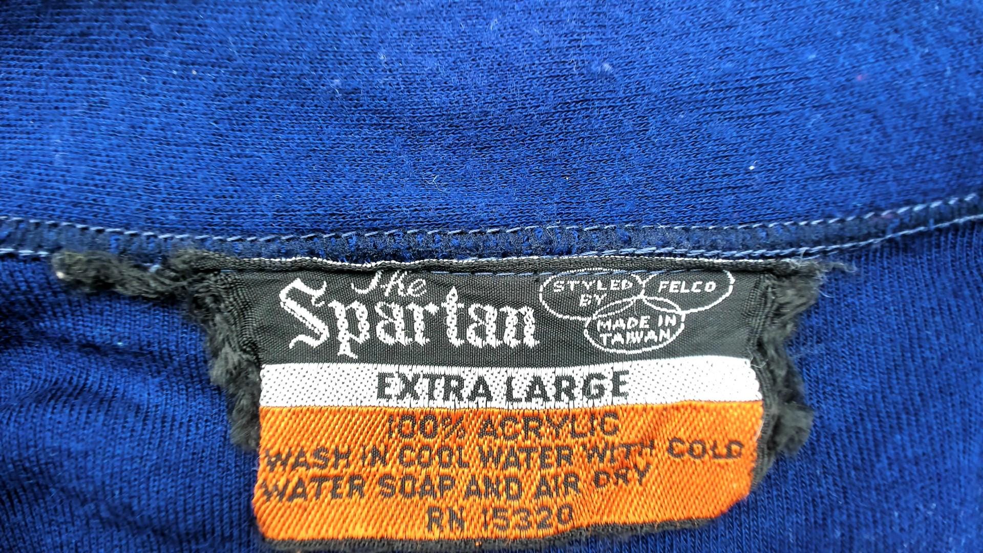 80s navy blue track jacket from The Spartan brand. Features distinctive white piping trim along the zipper, collar and pocket. Full front metal zipper closure with functional side pocket.