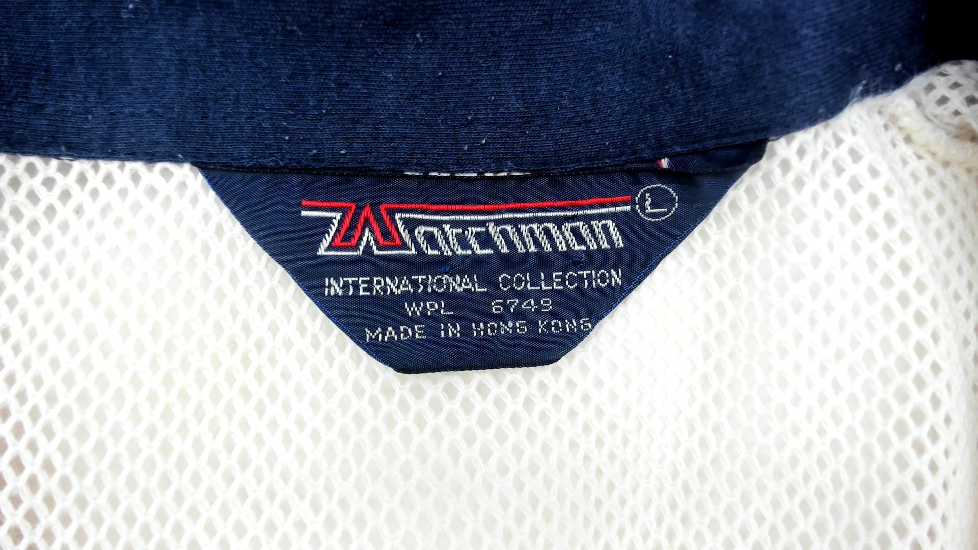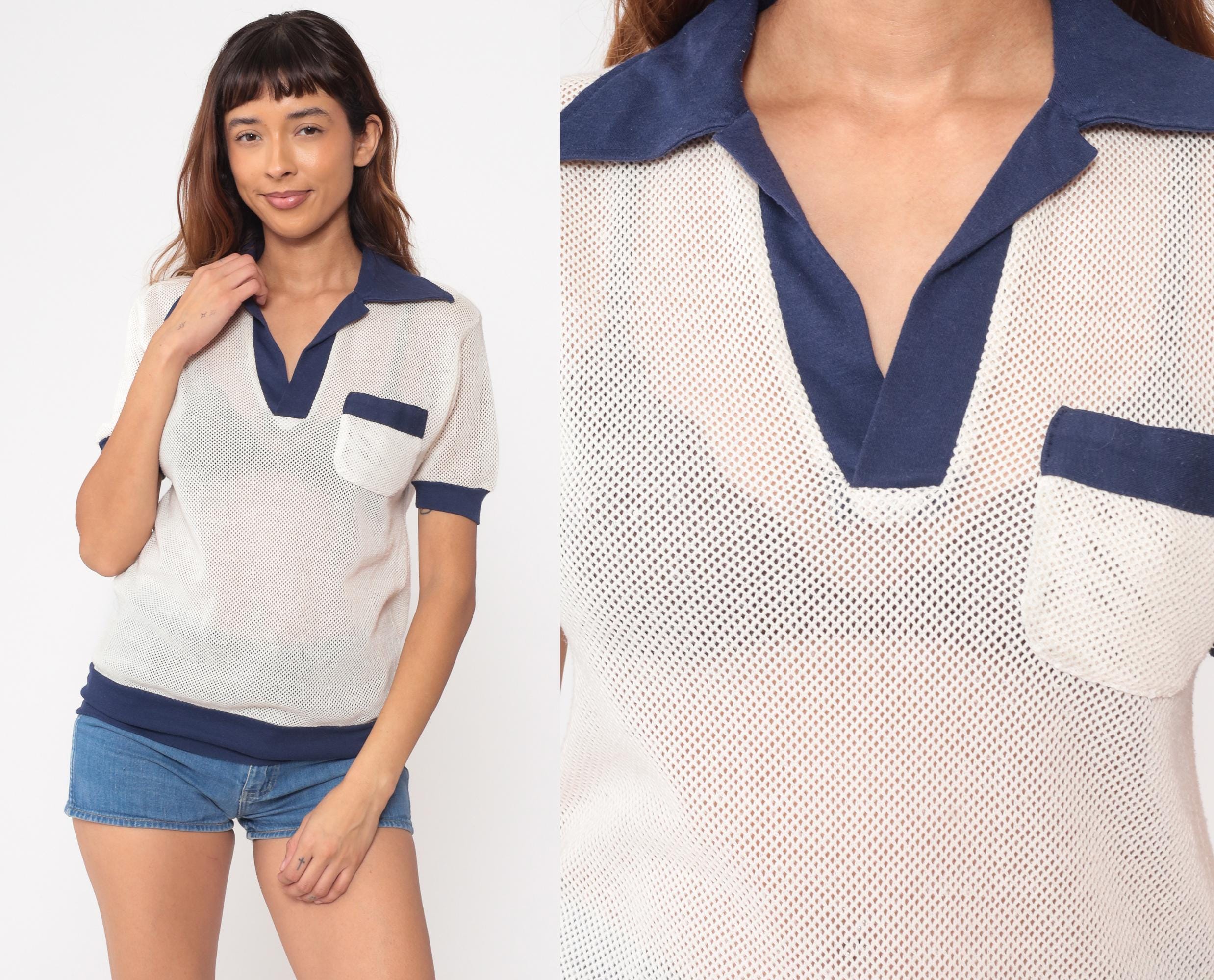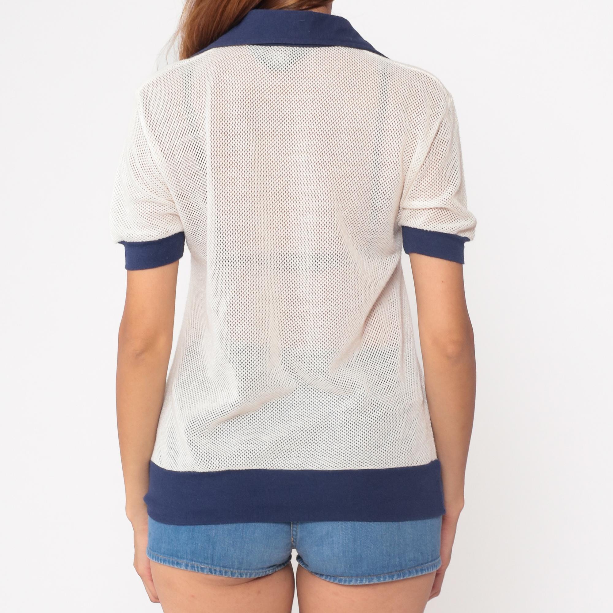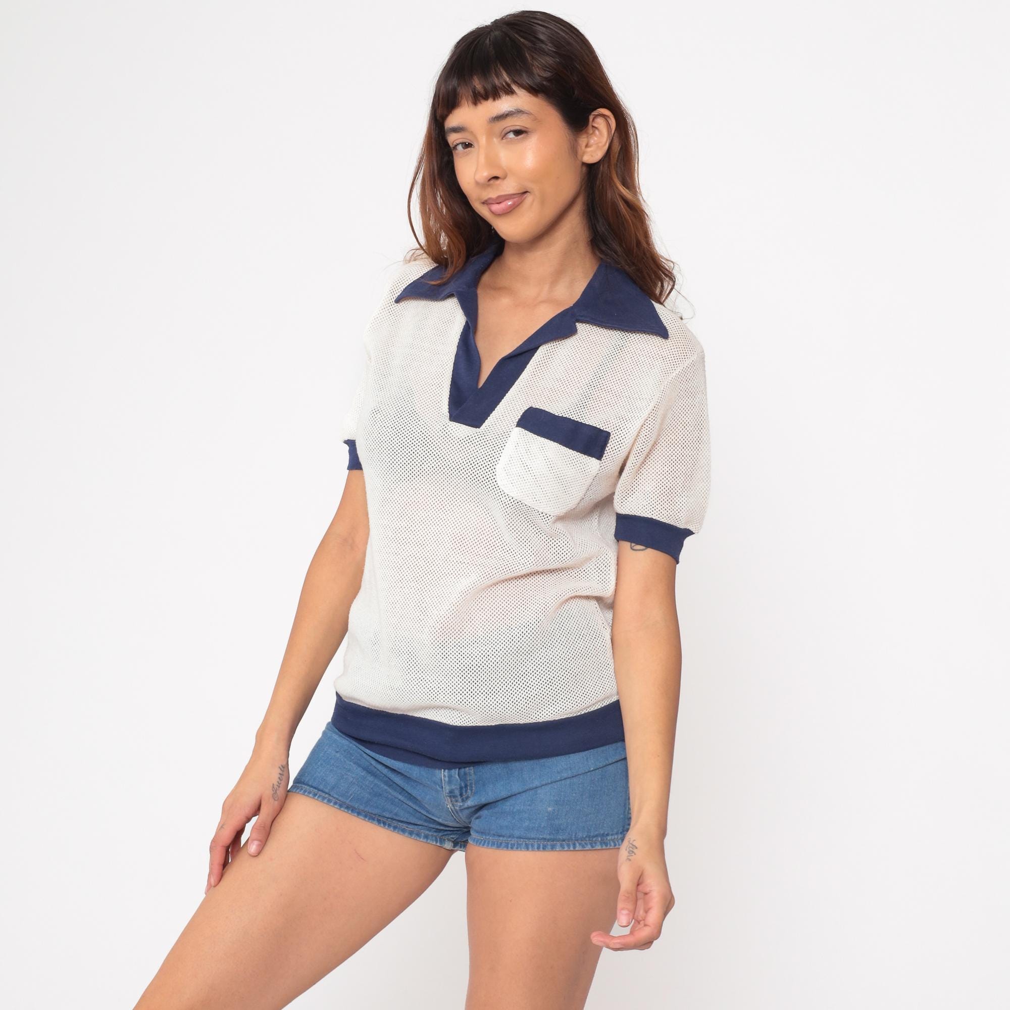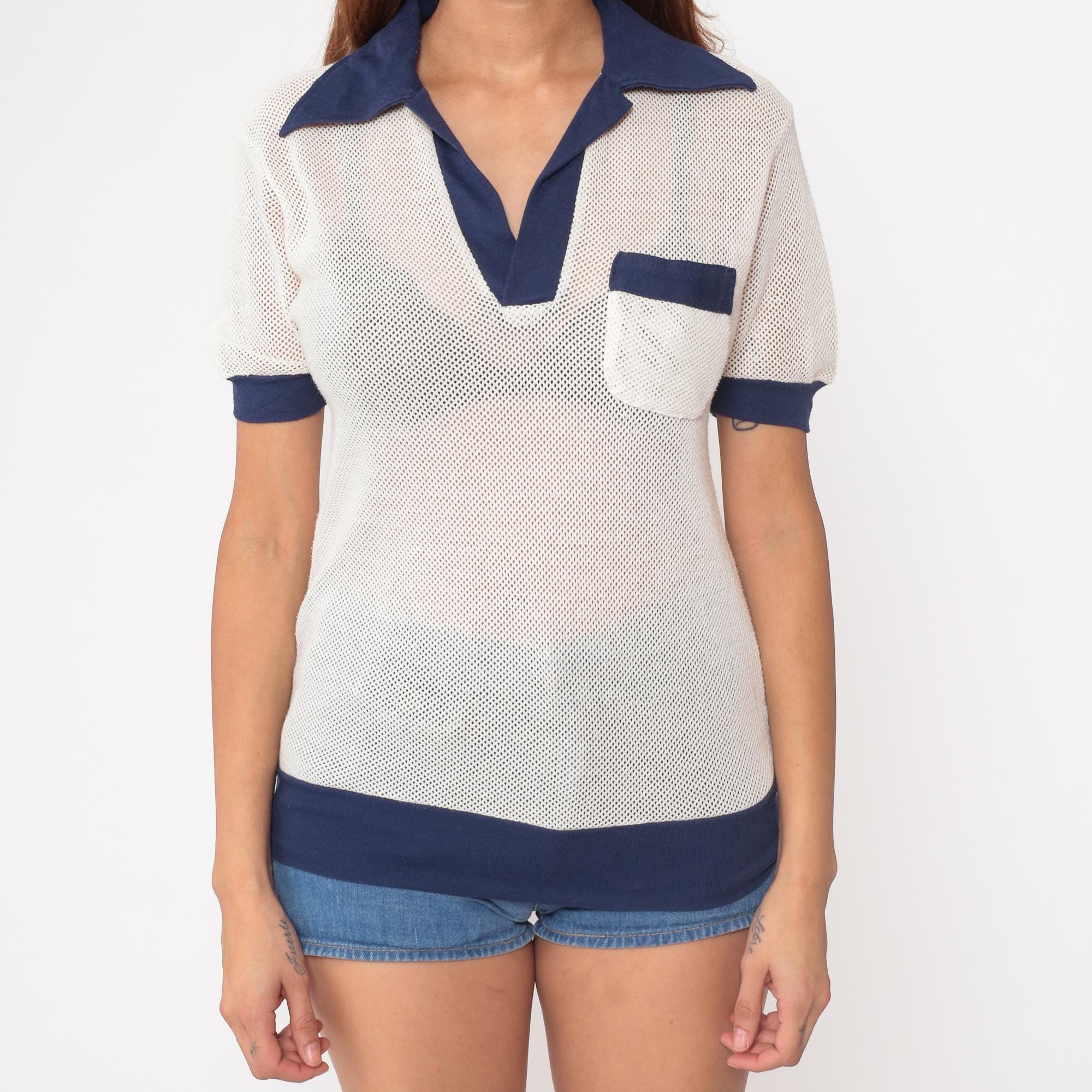70s mesh polo shirt from Watchman International Collection. Features crisp white open mesh/fishnet body with contrasting navy blue trim at collar, v-neckline, pocket, sleeve cuffs and hemline. Classic short sleeve design with chest pocket and pullover style.