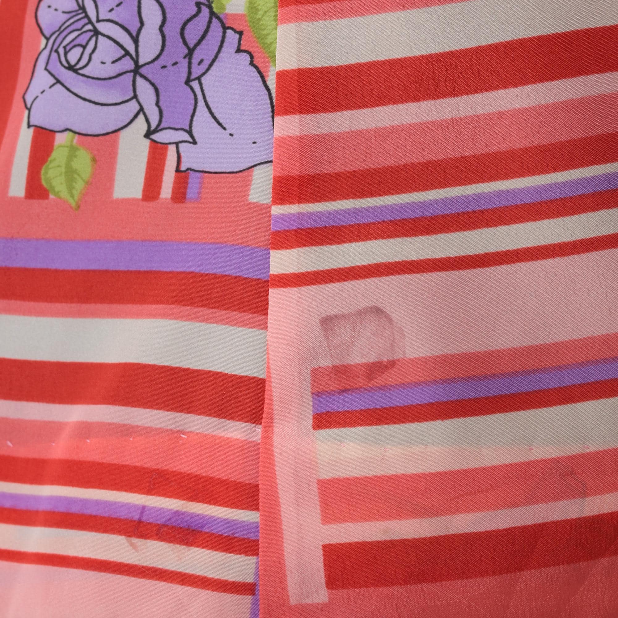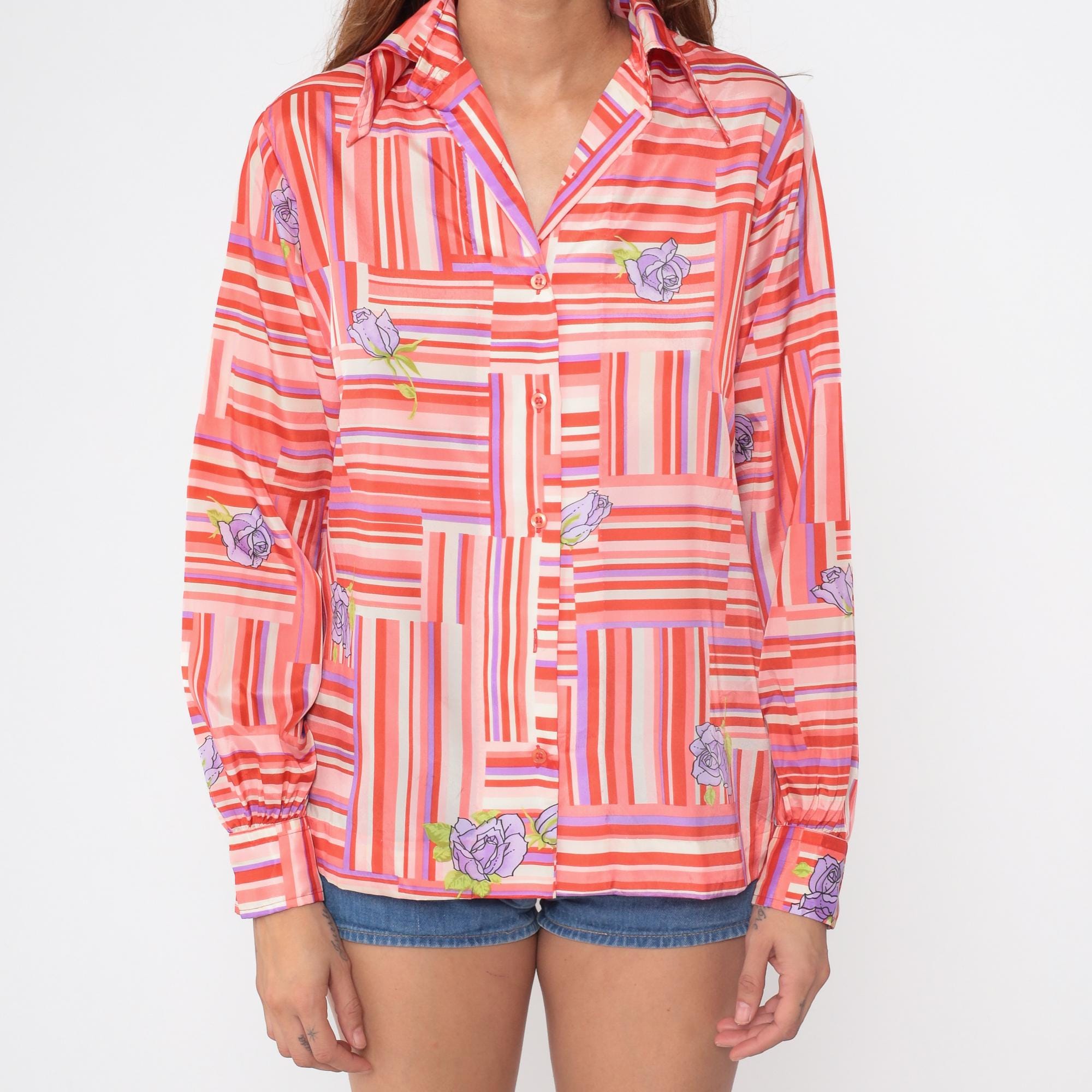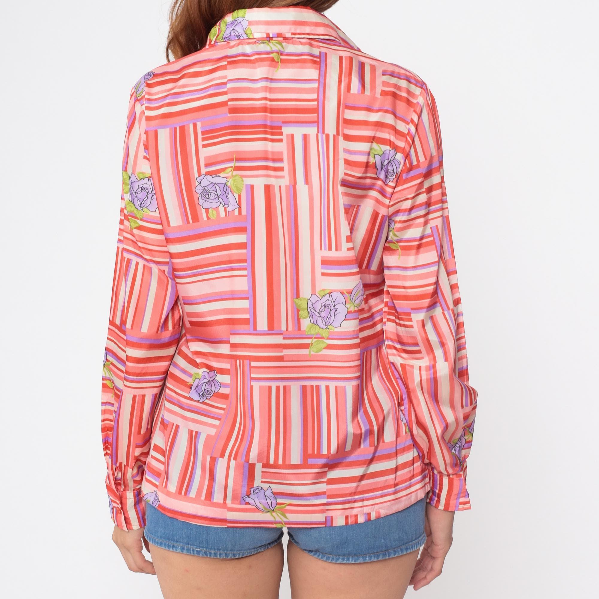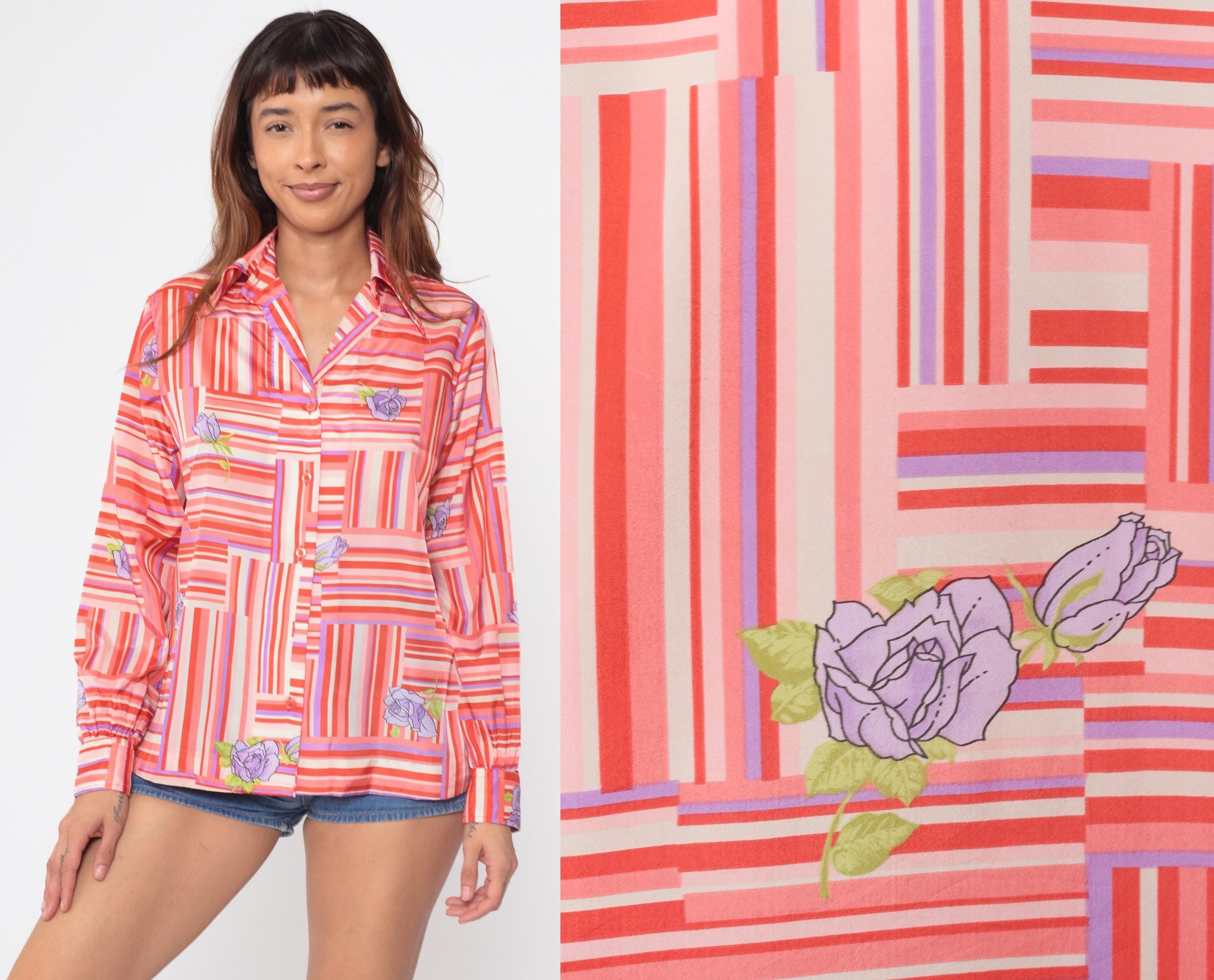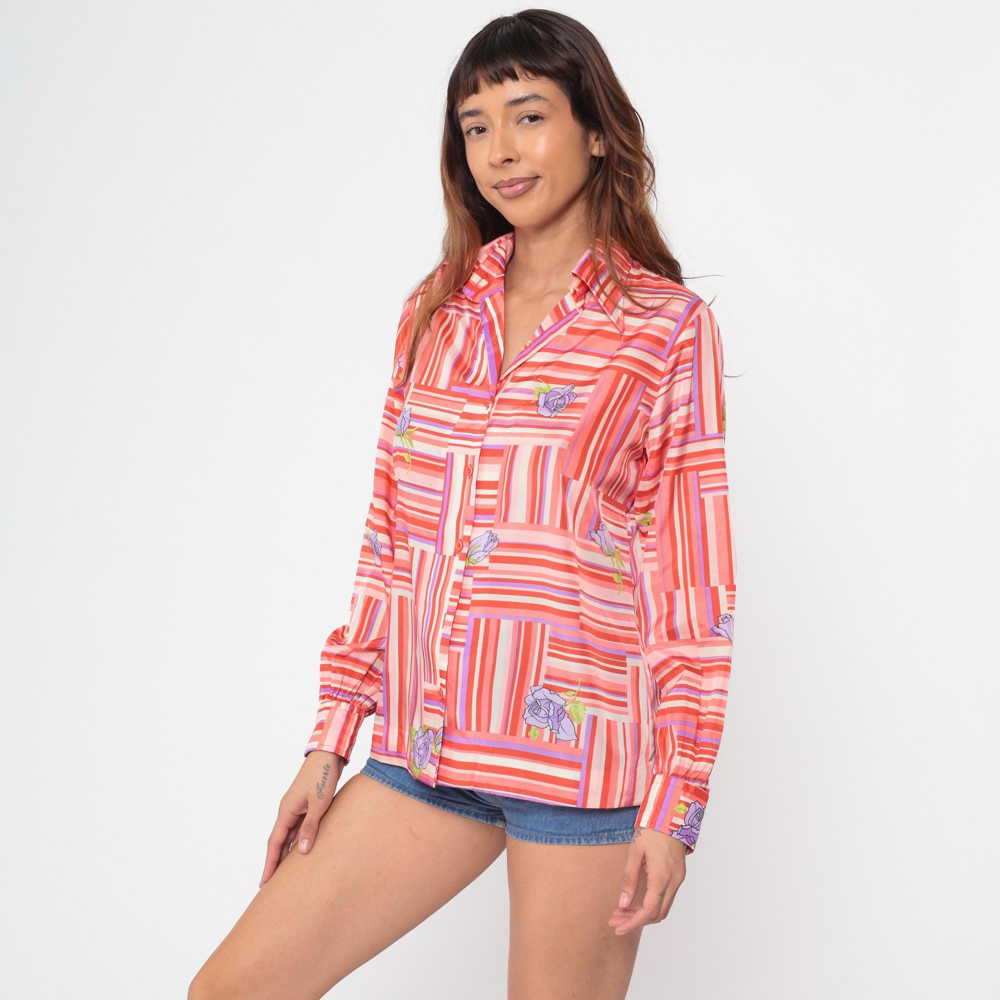 70s coral striped blouse with unique geometric patchwork pattern and purple rose accents. Features a classic button-down design with pointed collar and long sleeves with button cuffs.