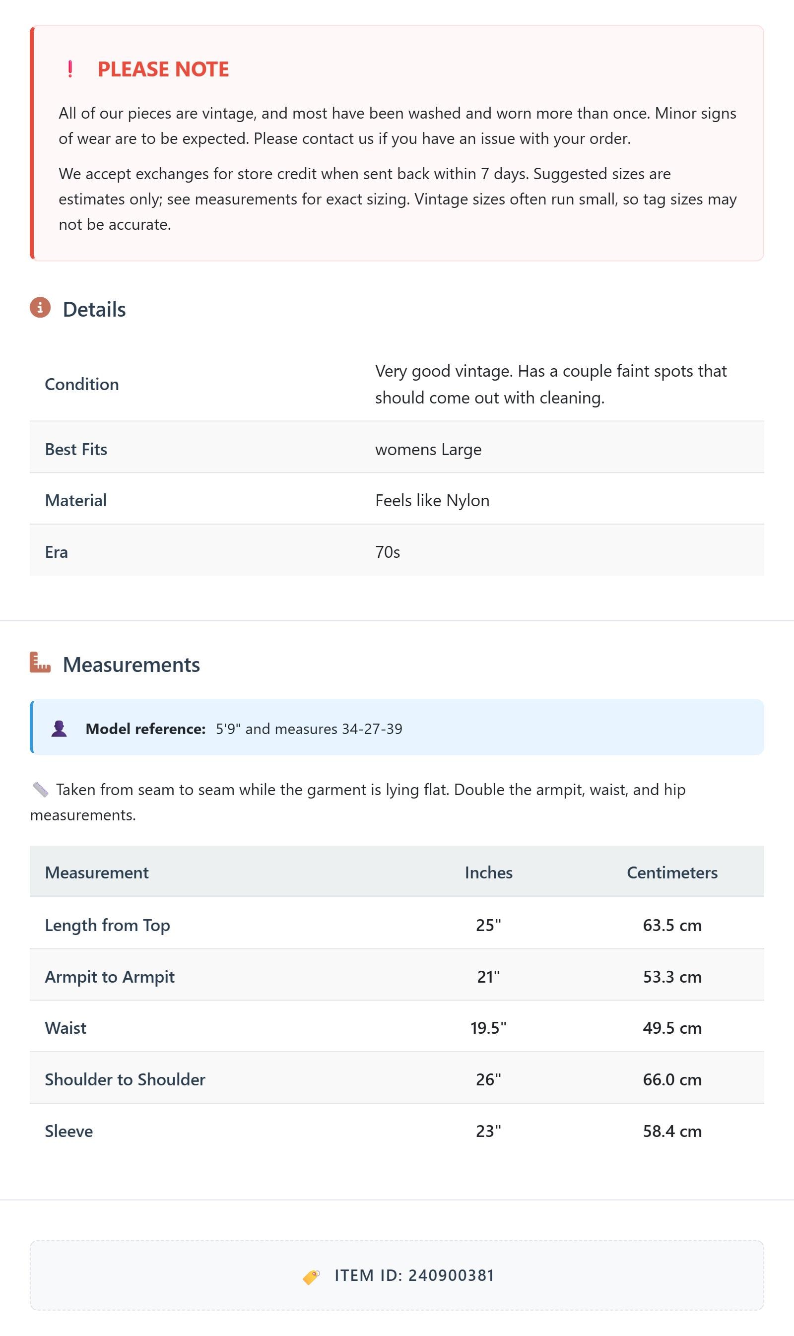 Suggested sizes are estimates only; see measurements for exact sizing. Vintage sizes often run small, so tag sizes may not be accurate.