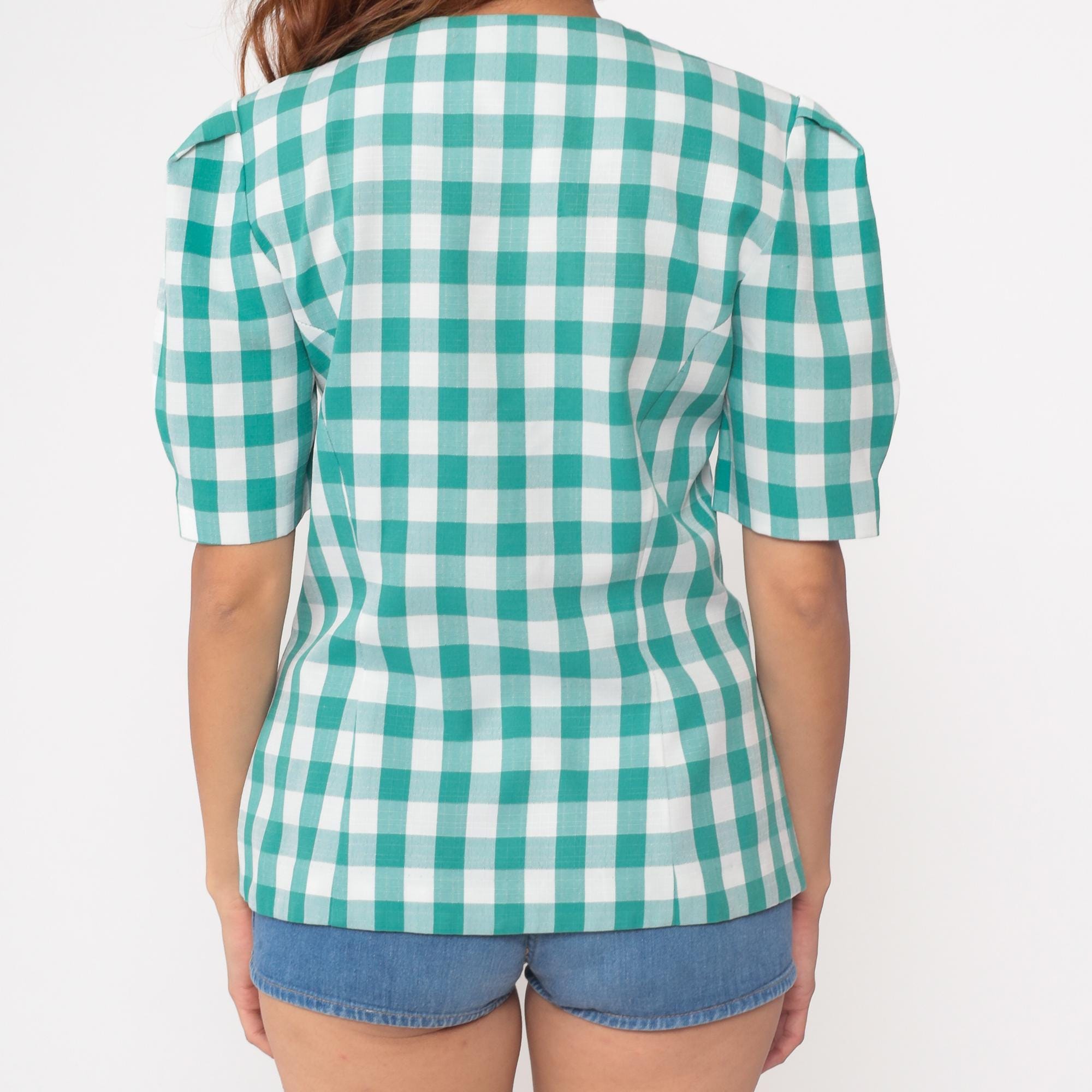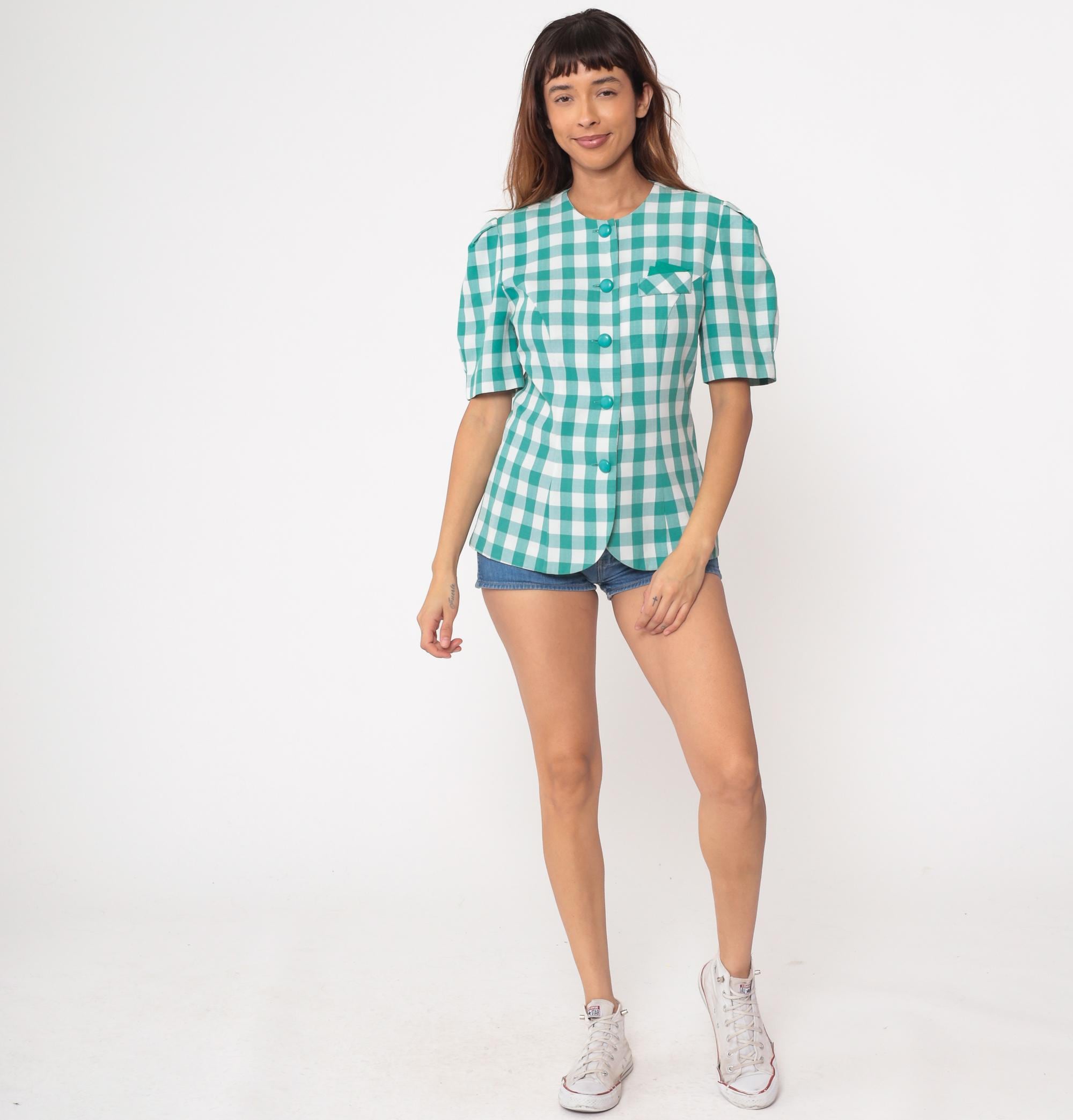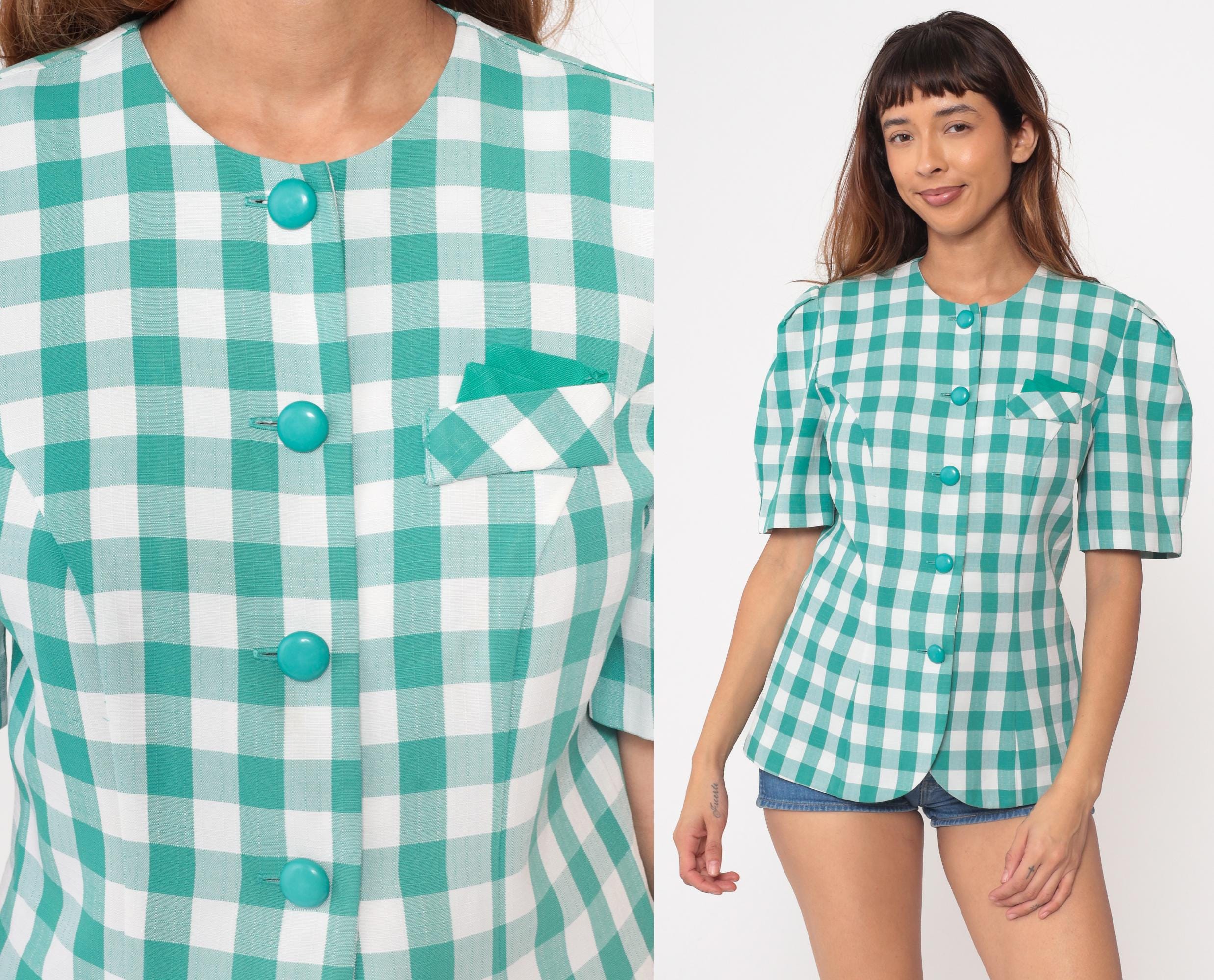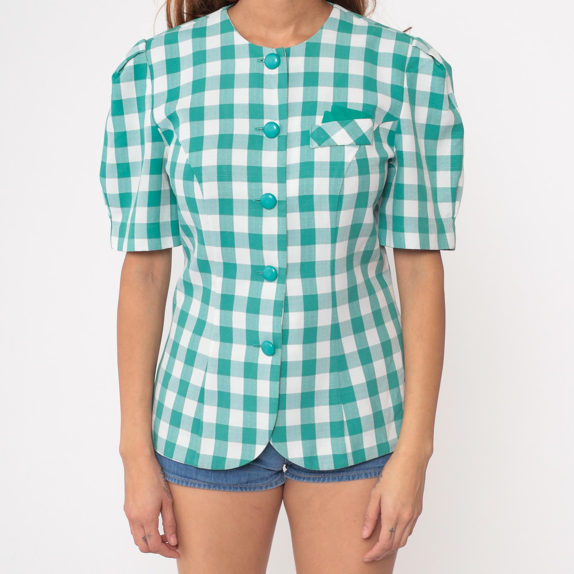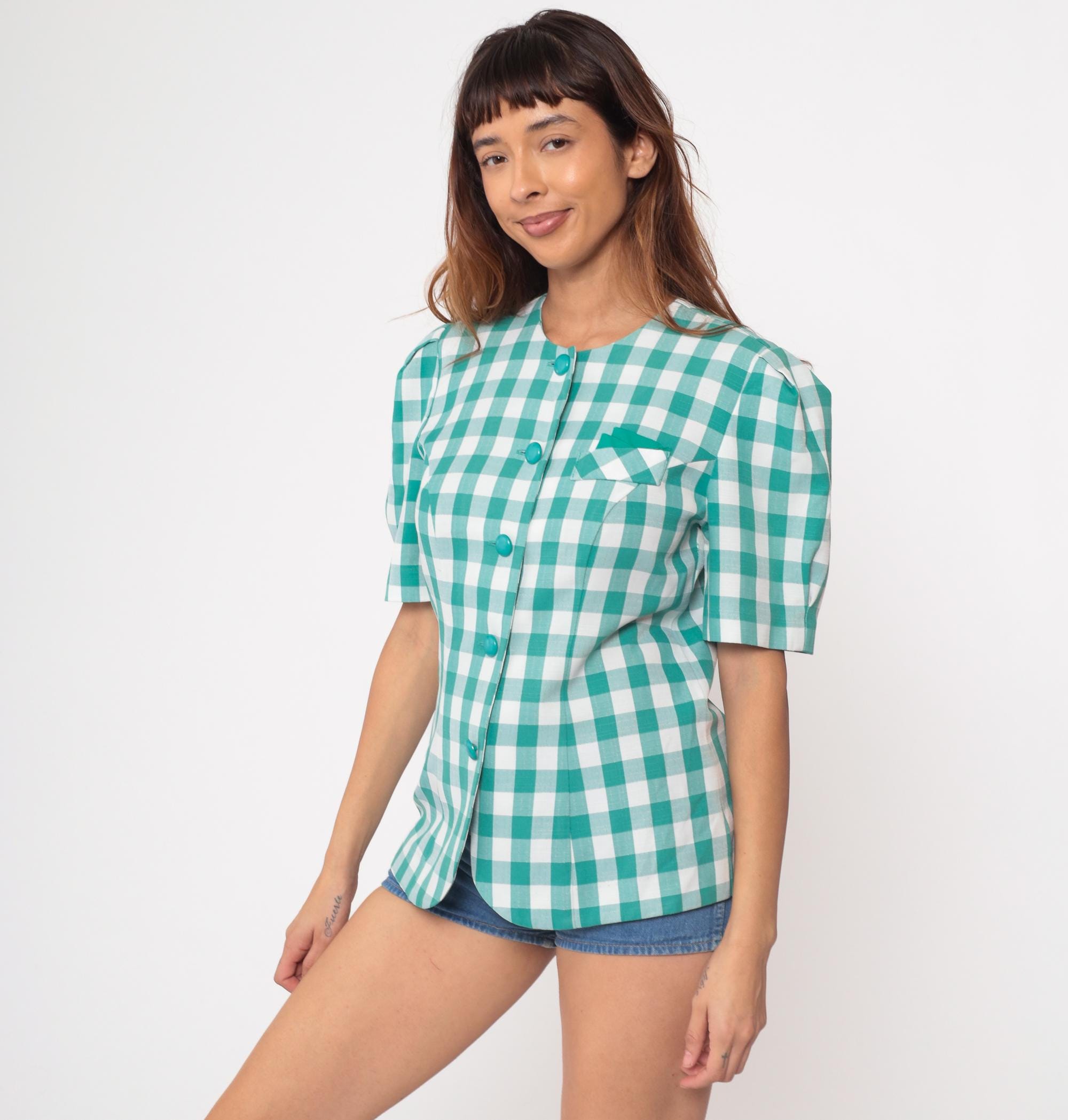 90s teal gingham blouse by Via Sant Andrea. Features a classic check pattern in bright turquoise and white with matching teal buttons down the front. Short puff sleeves and a fitted silhouette create a flattering shape. Includes a small chest pocket with diagonal gingham detail.