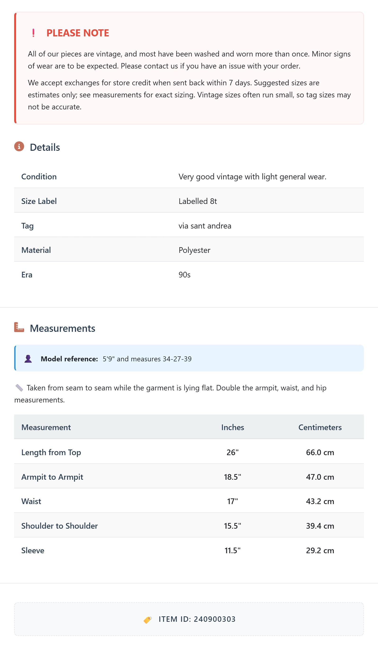 All of our pieces are vintage, and most have been washed and worn more than once. Minor signs of wear are to be expected. Please contact us if you have an issue with your order. We accept exchanges for store credit when sent back within 7 days.