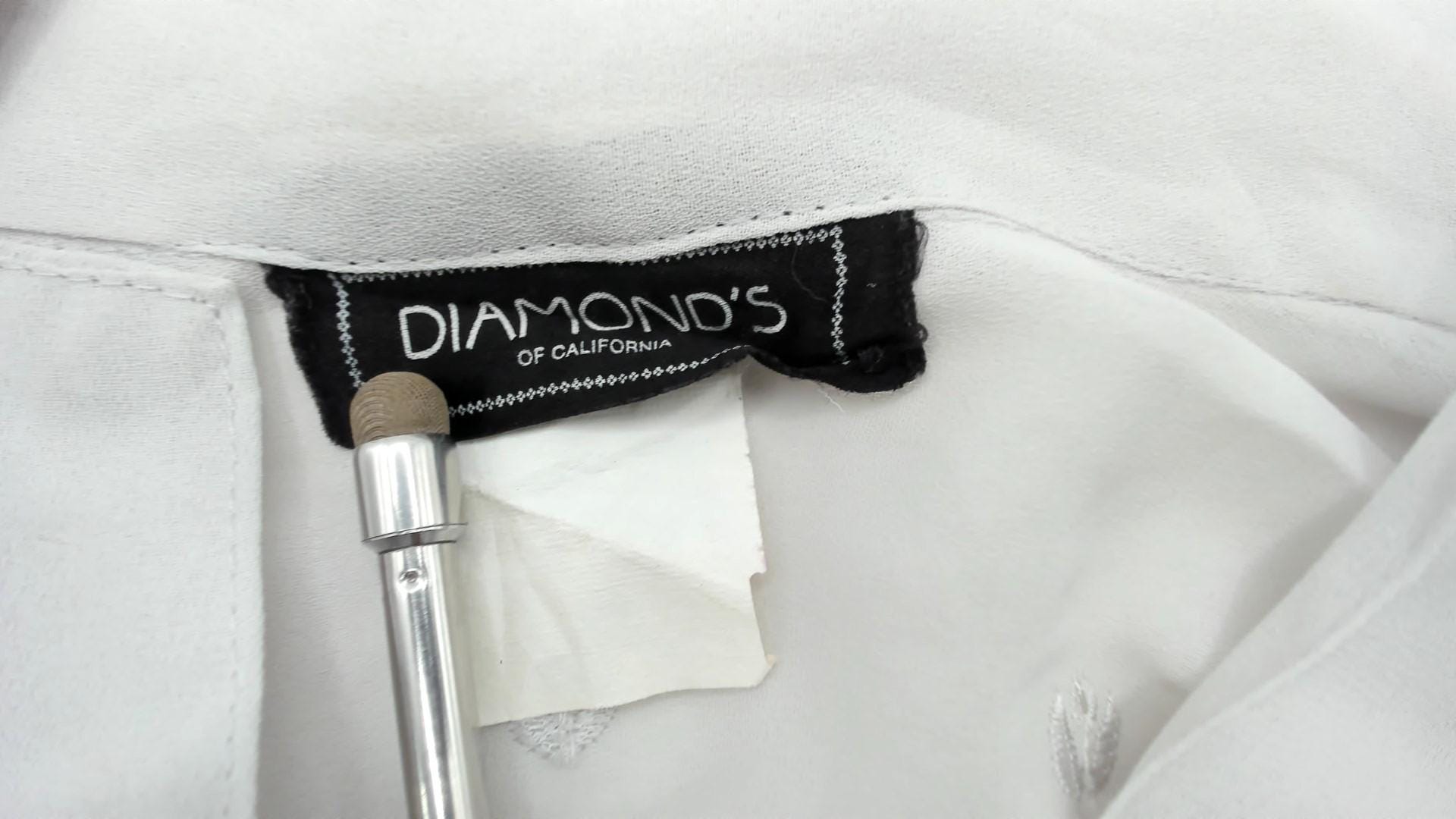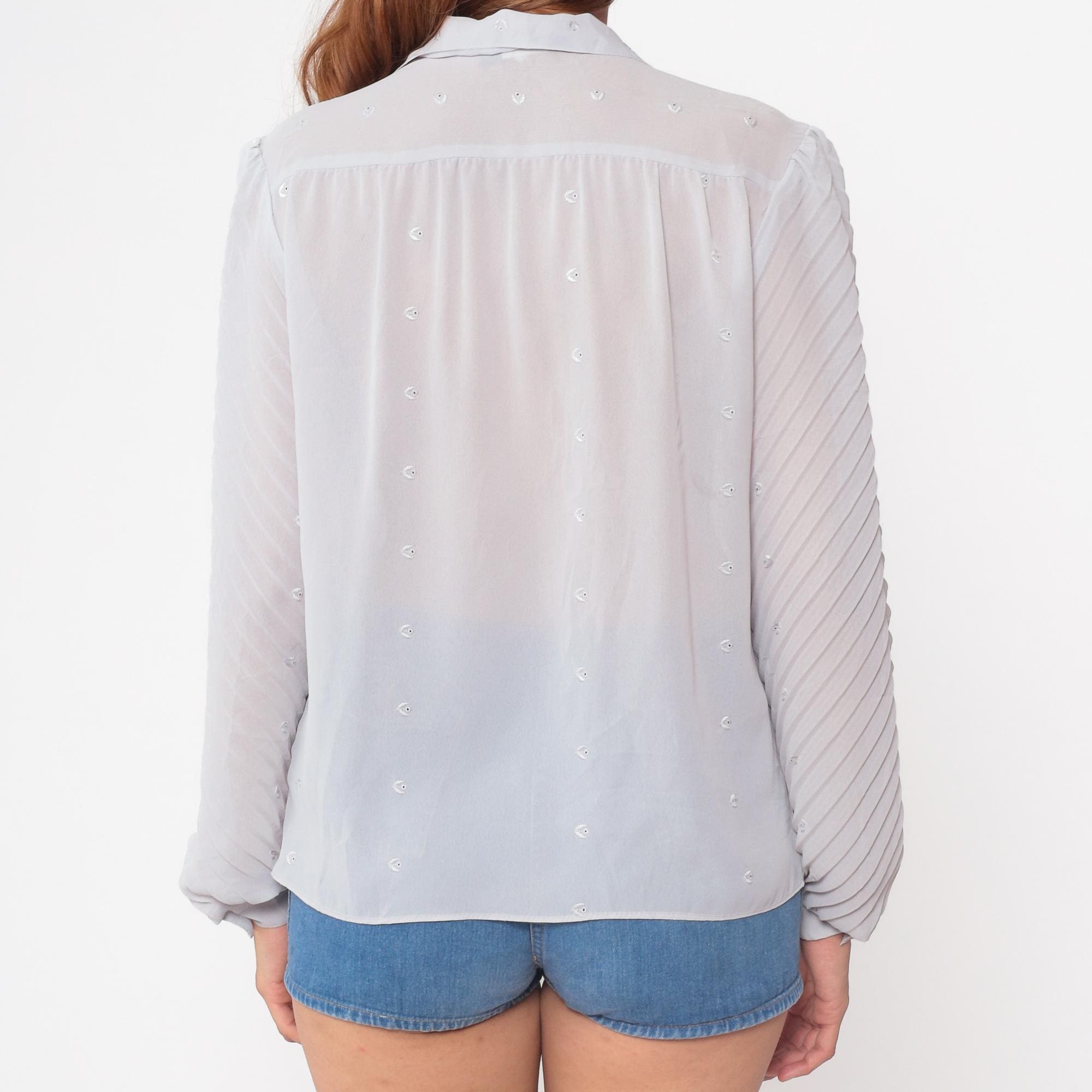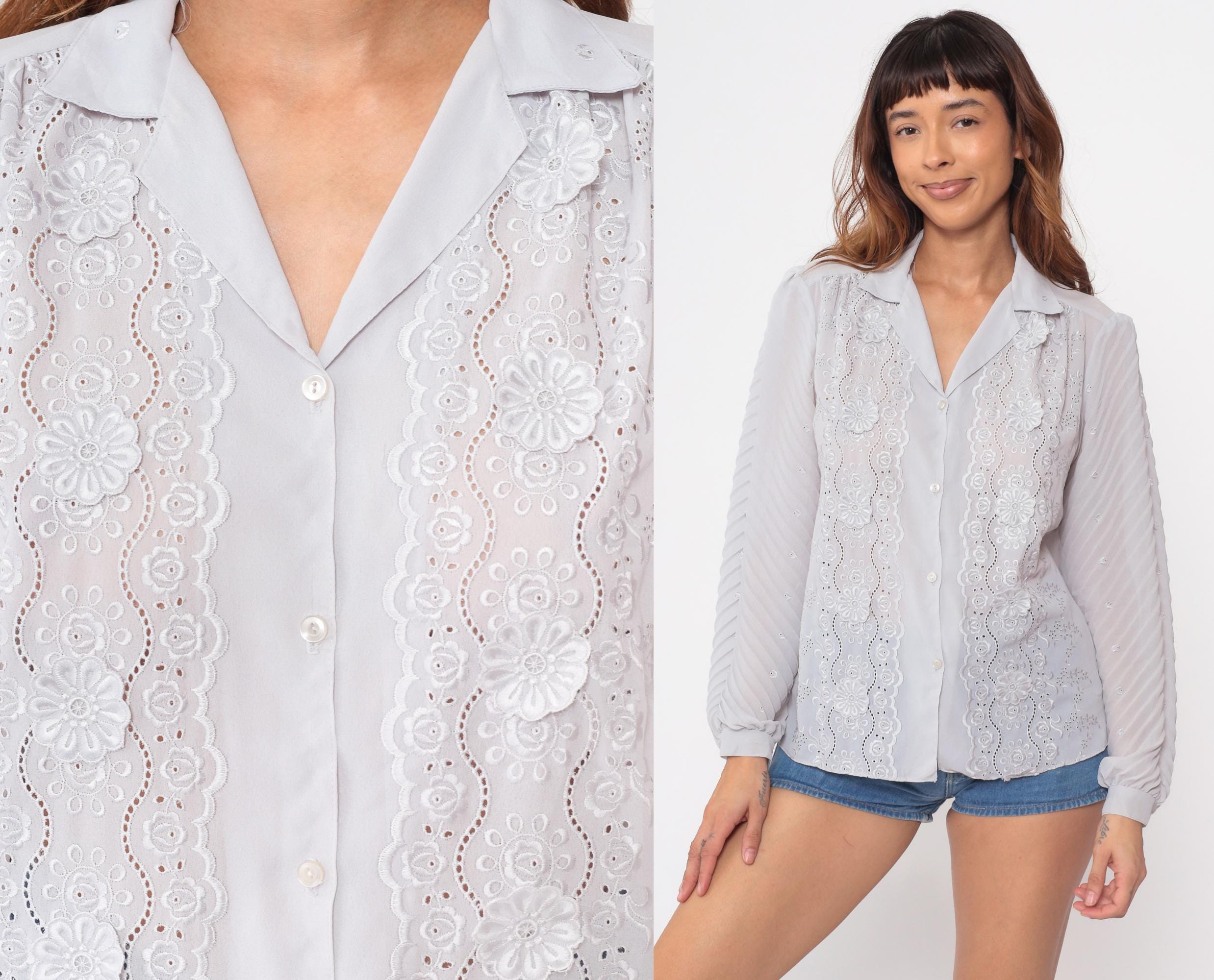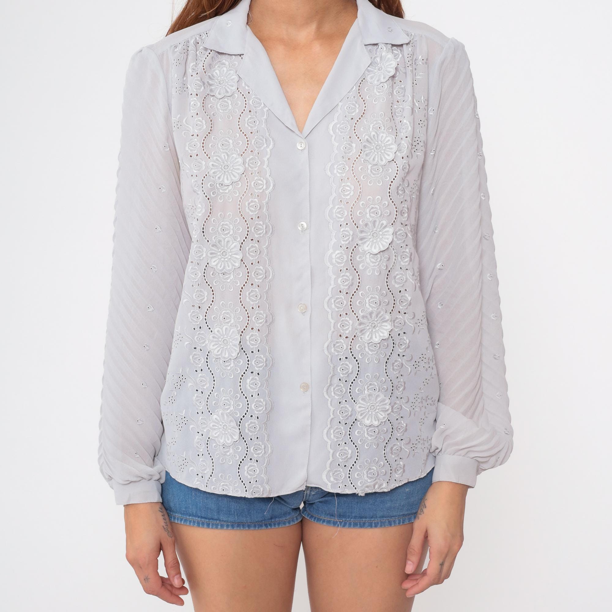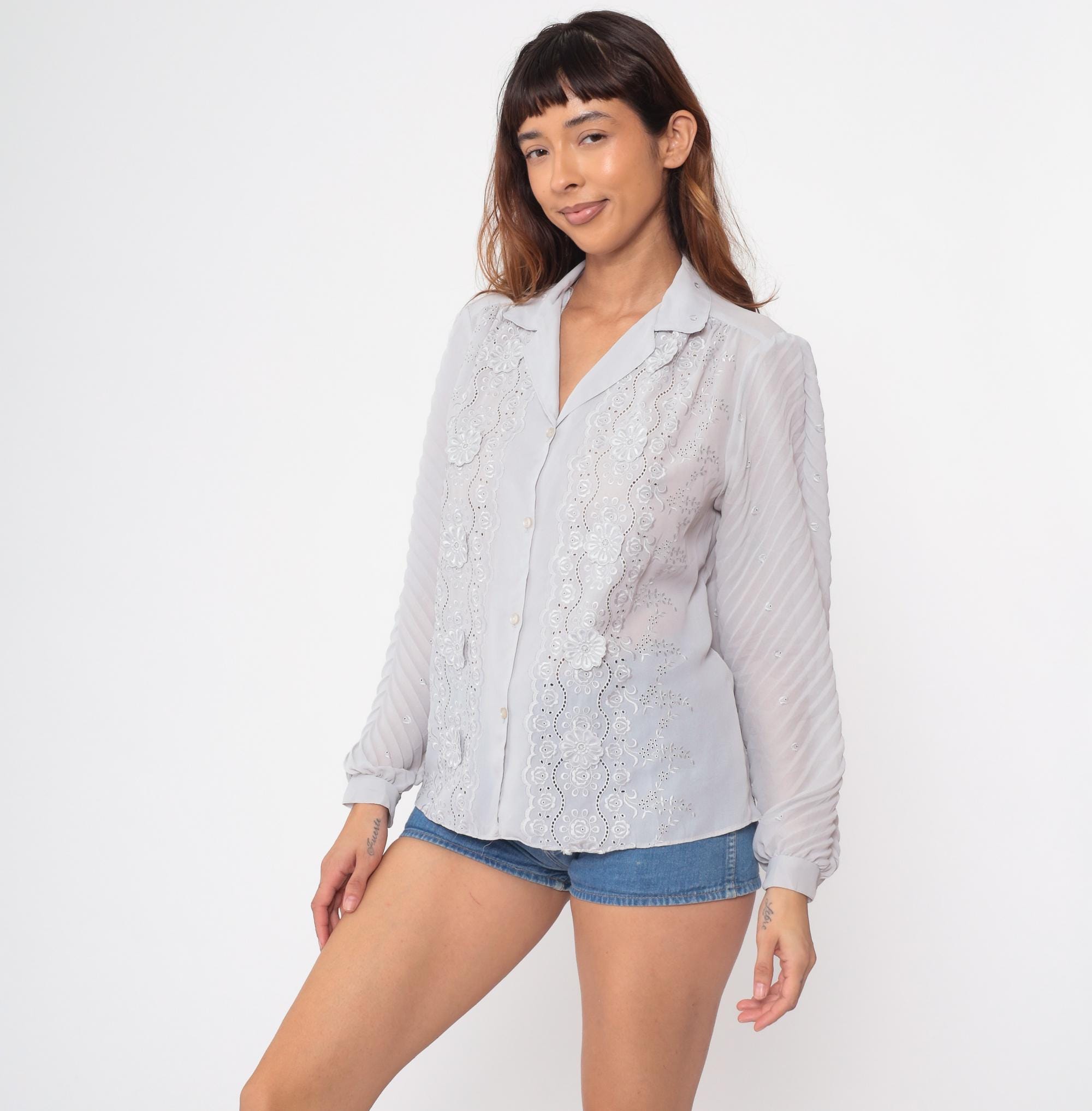 70s gray eyelet blouse by Diamonds of California. Features beautiful floral embroidered cutout panels down the front, creating an elegant semi-sheer effect. Long sleeves with unique textured stripe pattern and fitted cuffs.
