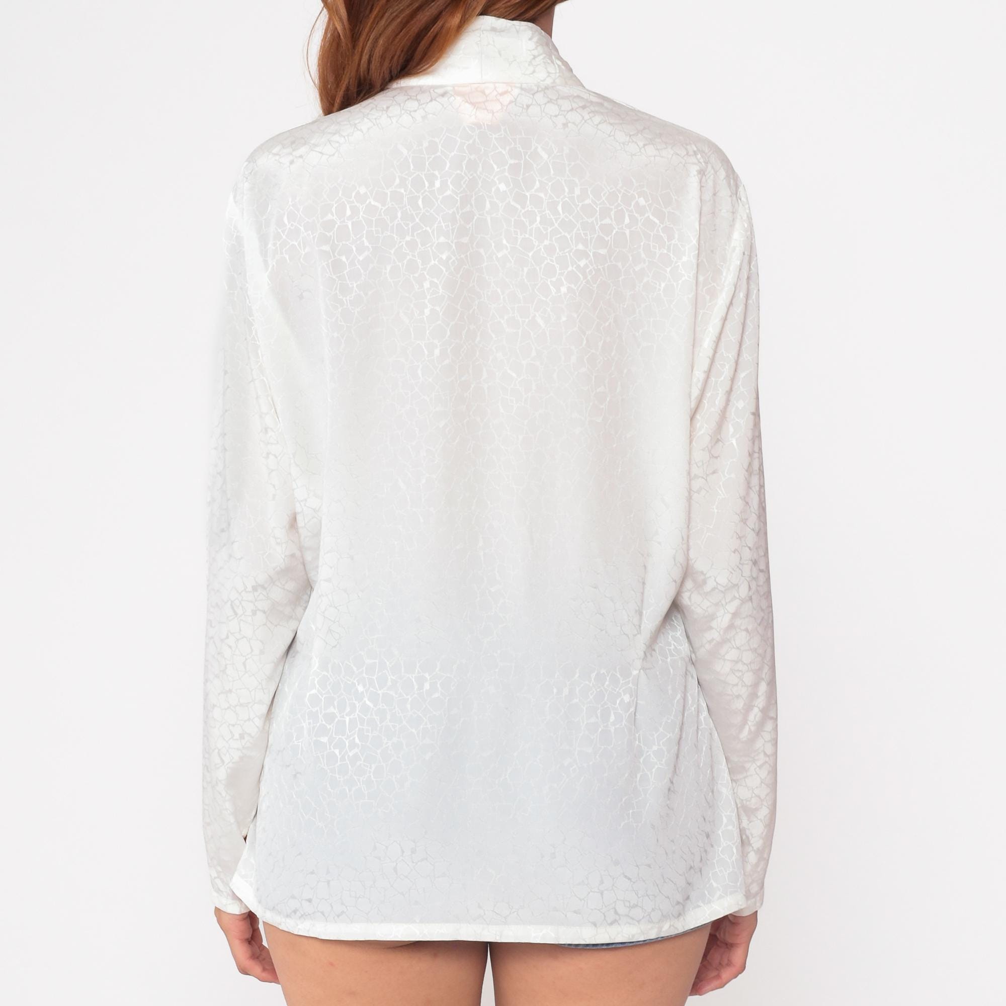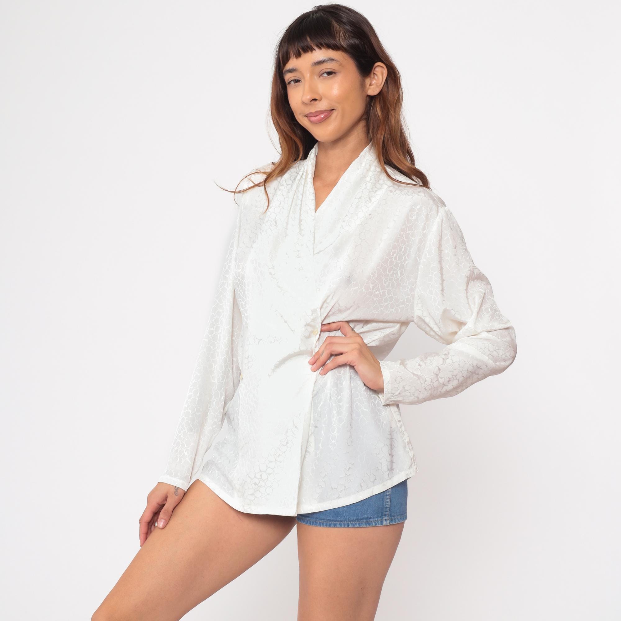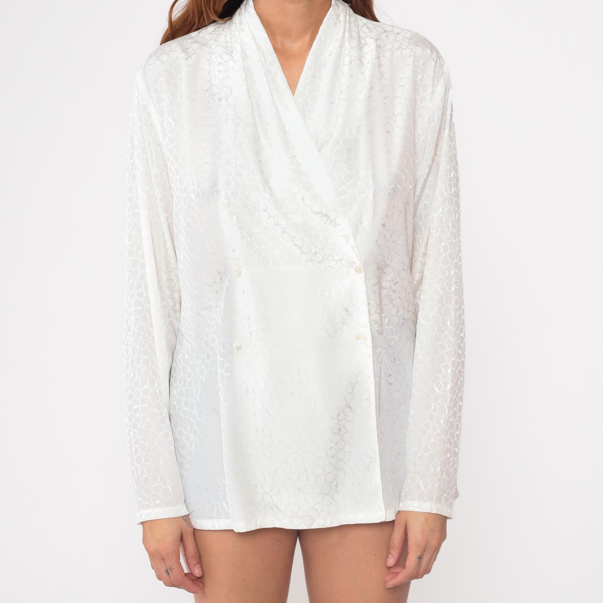 80s white jacquard blouse by Country Sophisticates by Pendleton. Features an elegant wrap design with crossover v-neckline and hidden button closures.