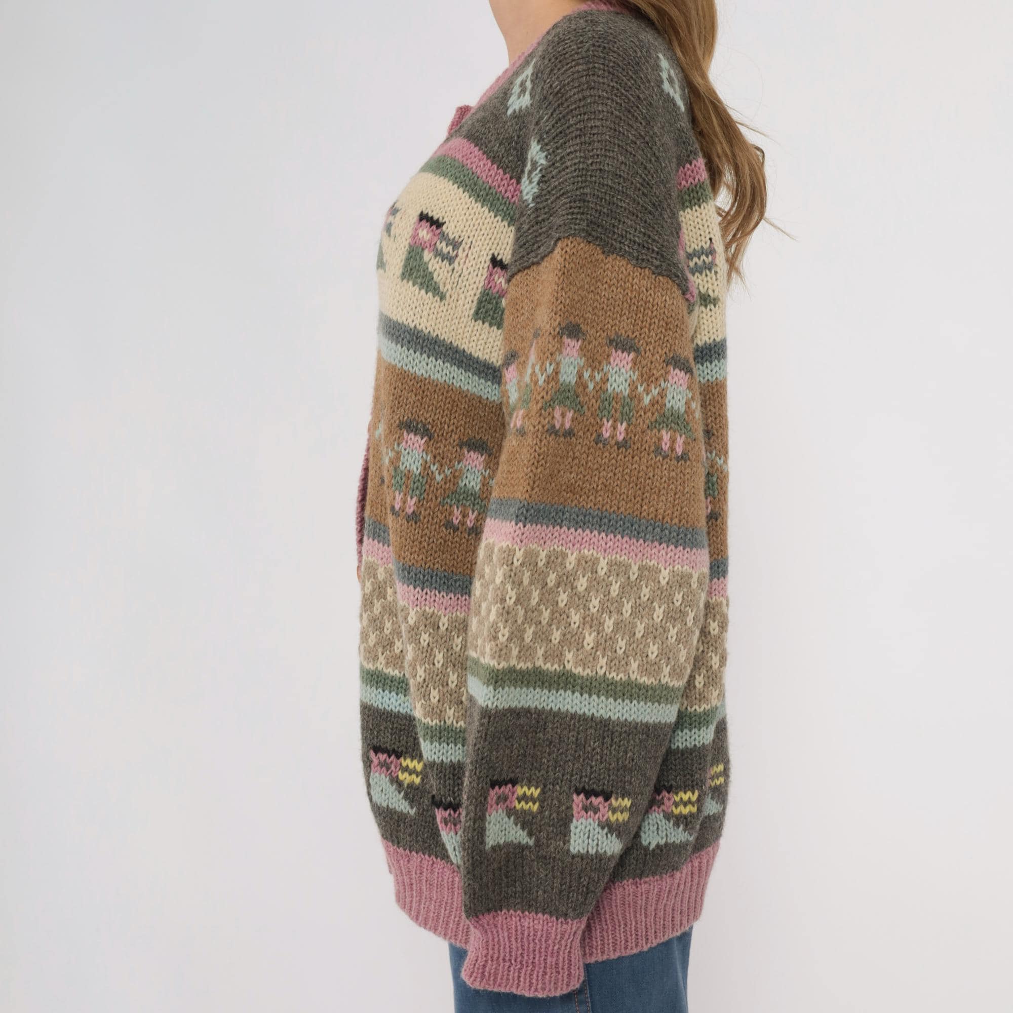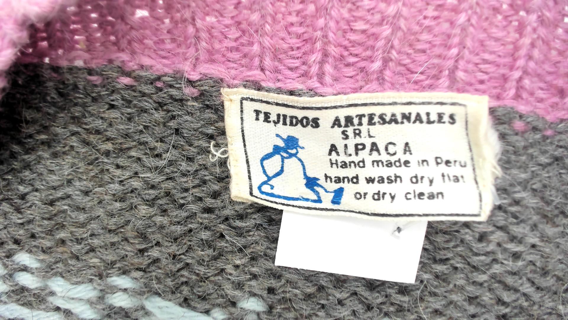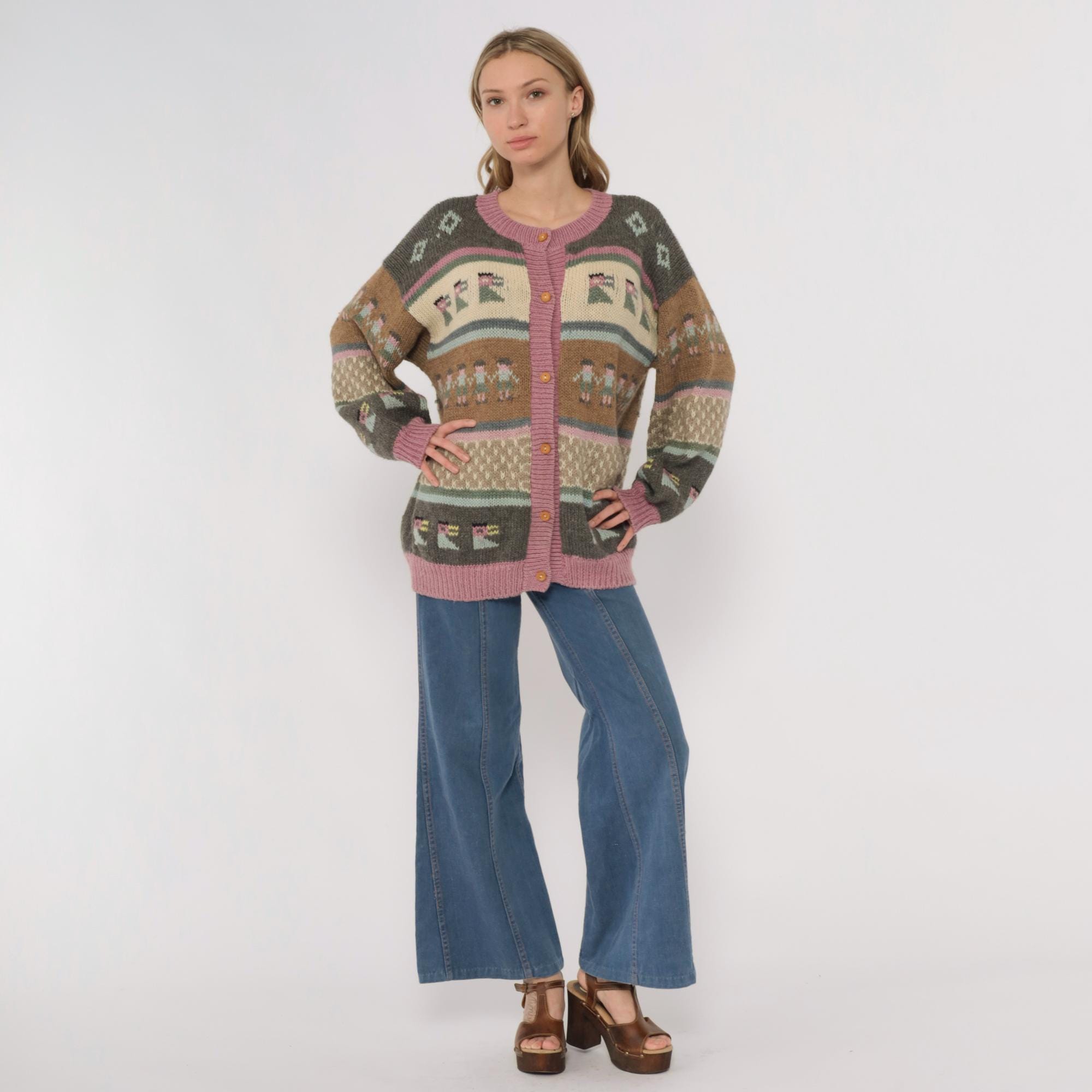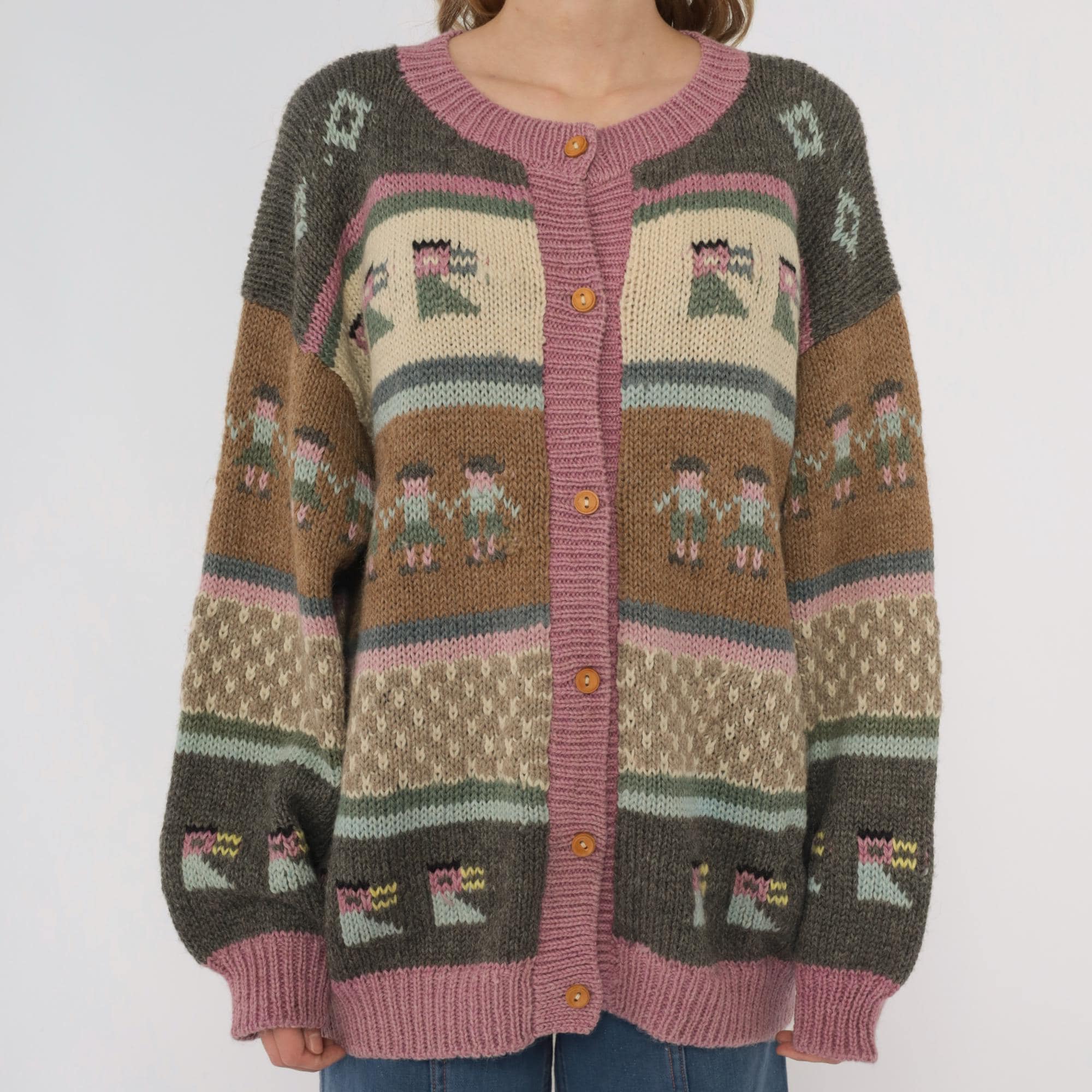 Vintage 90s Peruvian knit alpaca wool cardigan sweater with a Geometric Peruvian alpaca design and buttons up the front.