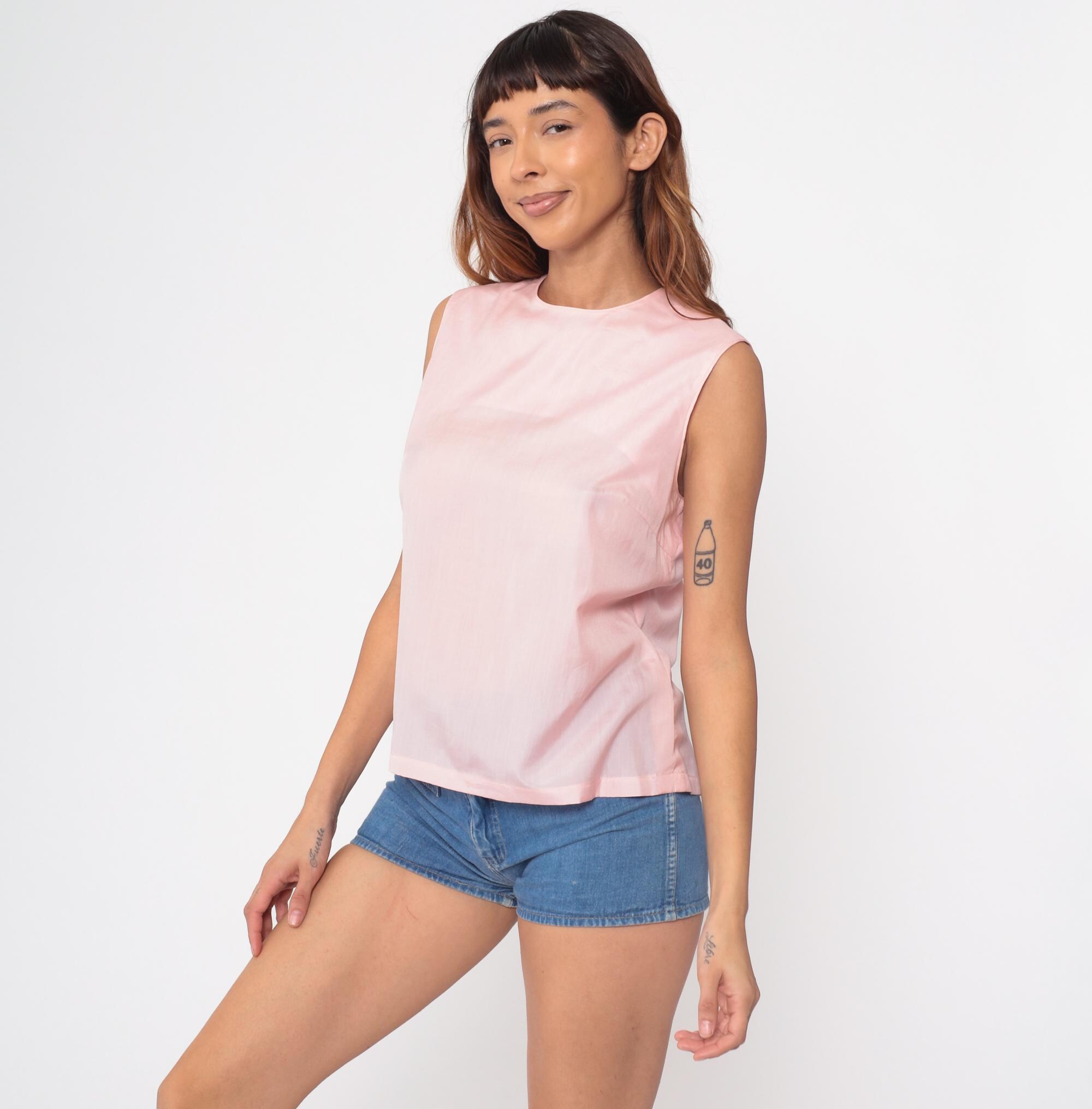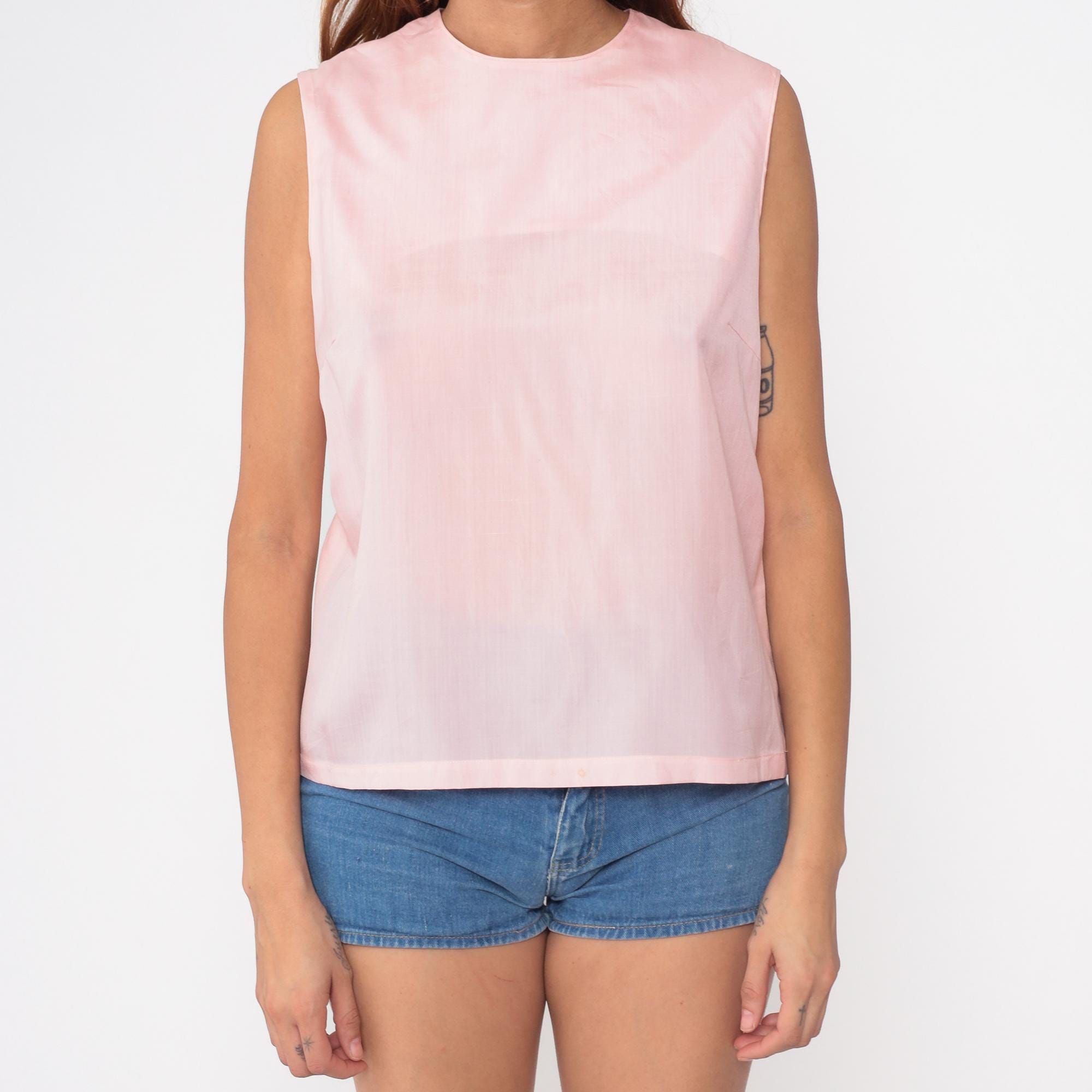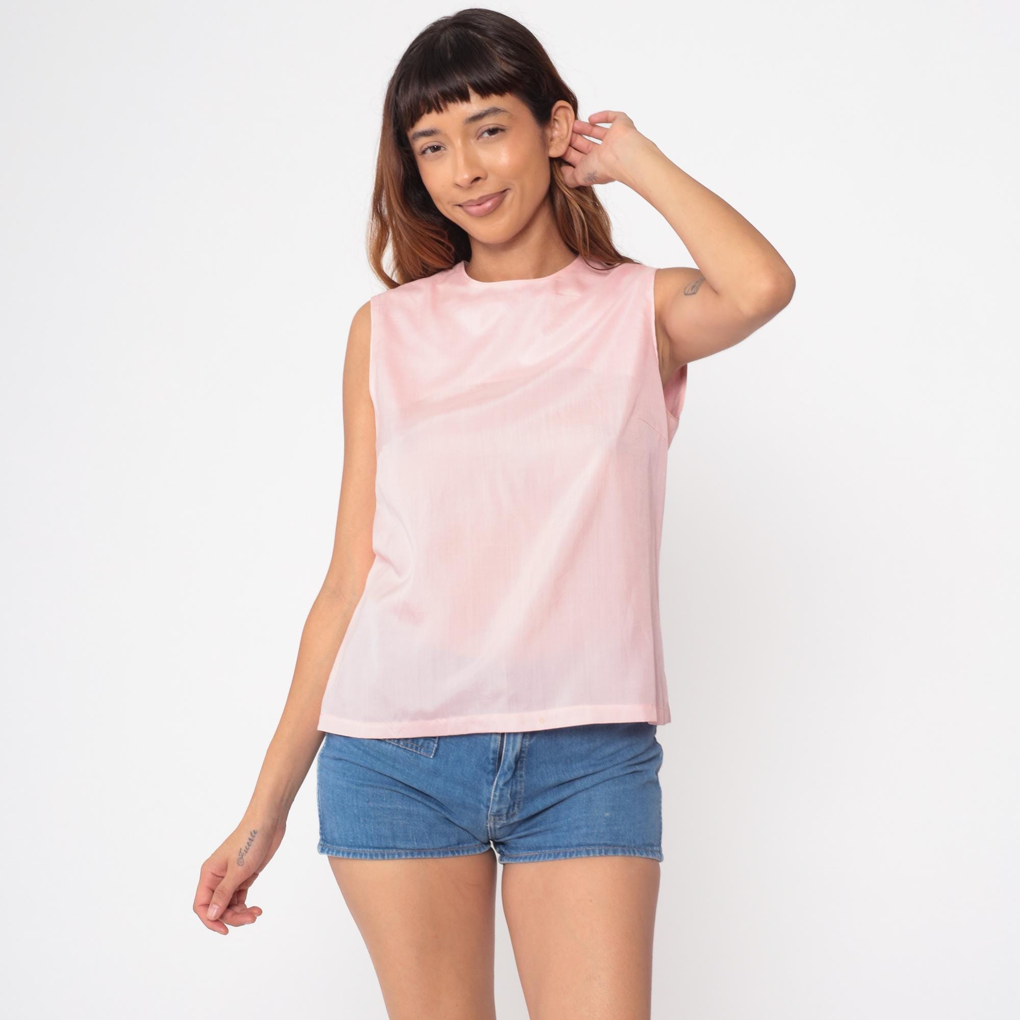 60s pale pink sleeveless shell top in a classic vintage silhouette. Features a clean, minimalist design with a simple round neckline and straight cut. Interesting split back detail adds subtle visual interest.