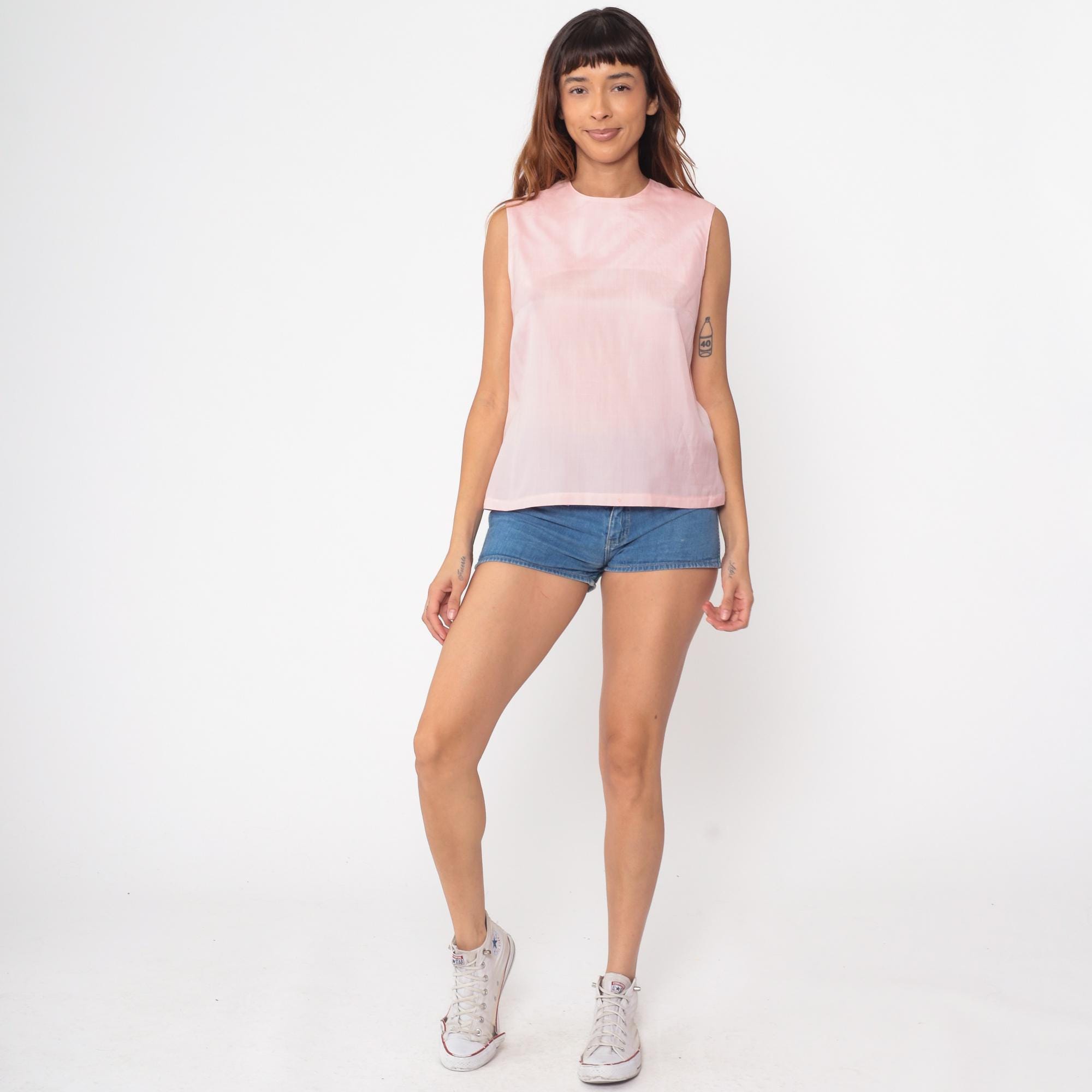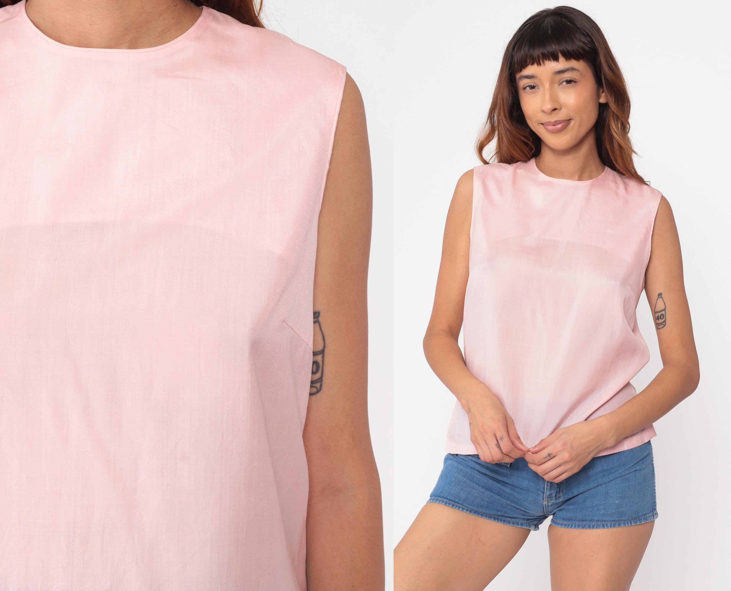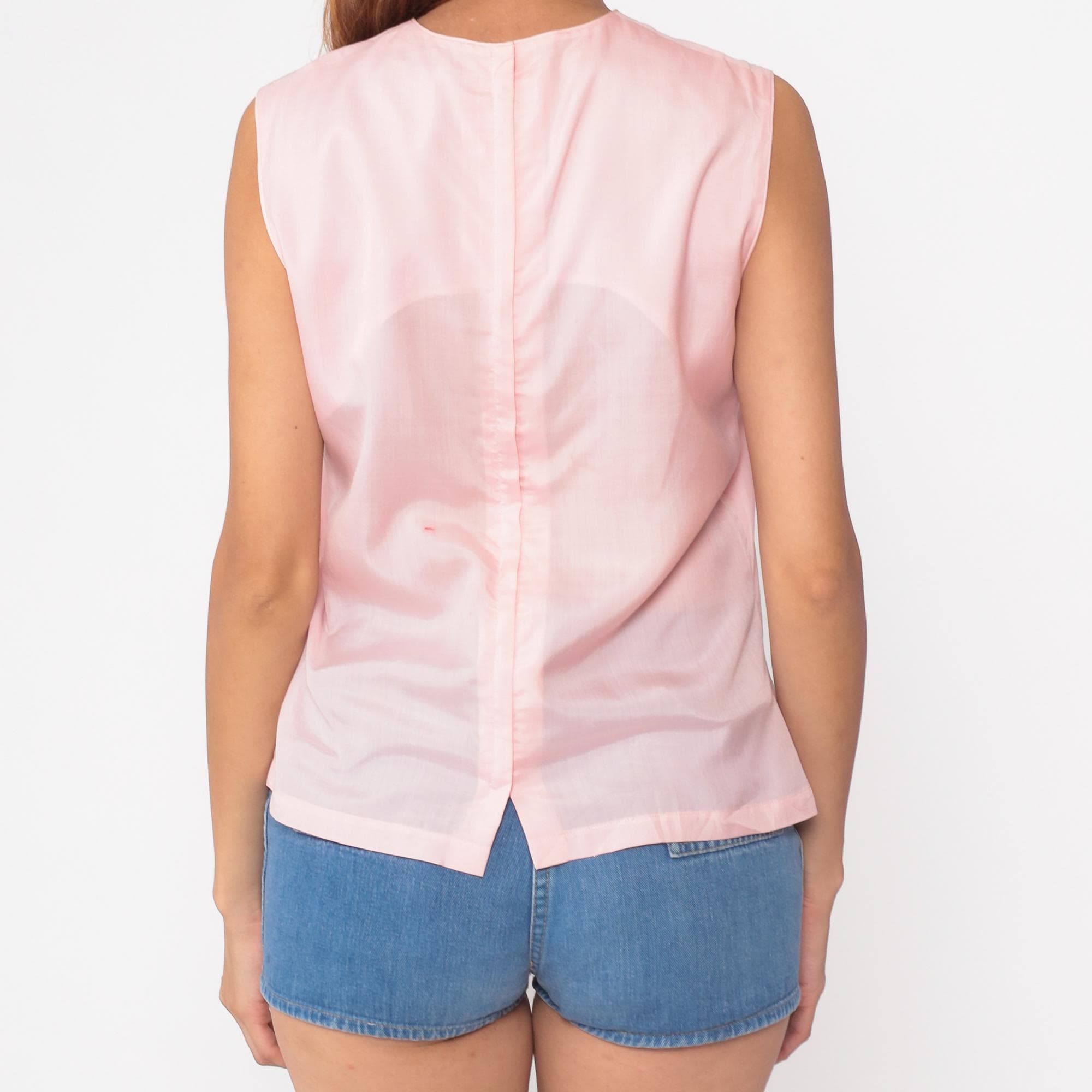 60s pale pink sleeveless shell top in a classic vintage silhouette. Features a clean, minimalist design with a simple round neckline and straight cut. Interesting split back detail adds subtle visual interest.