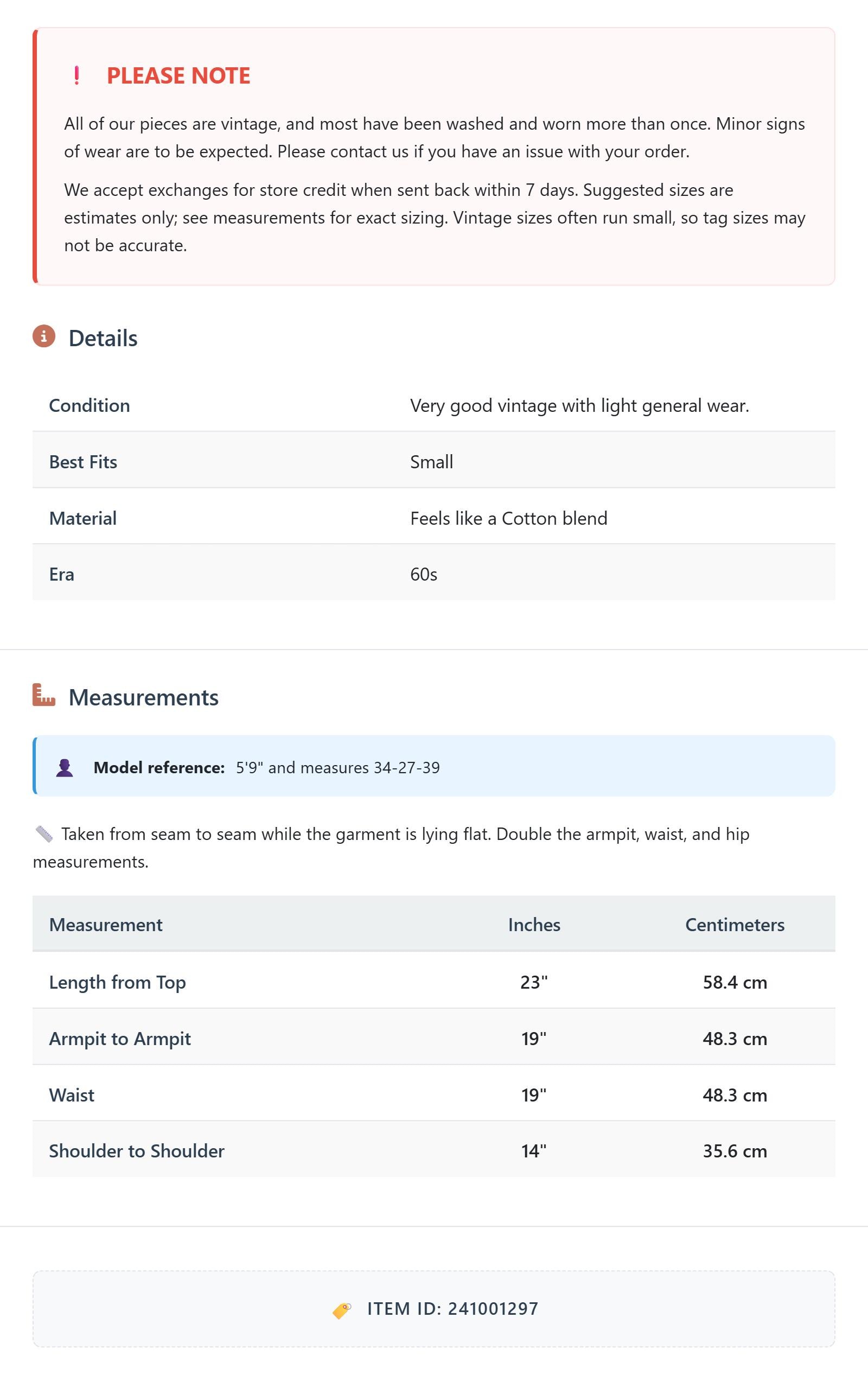 All of our pieces are vintage, and most have been washed and worn more than once. Minor signs of wear are to be expected. Please contact us if you have an issue with your order. We accept exchanges for store credit when sent back within 7 days.