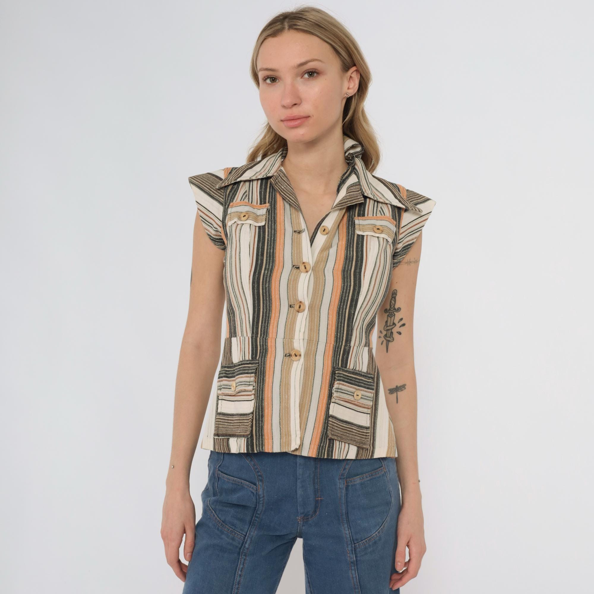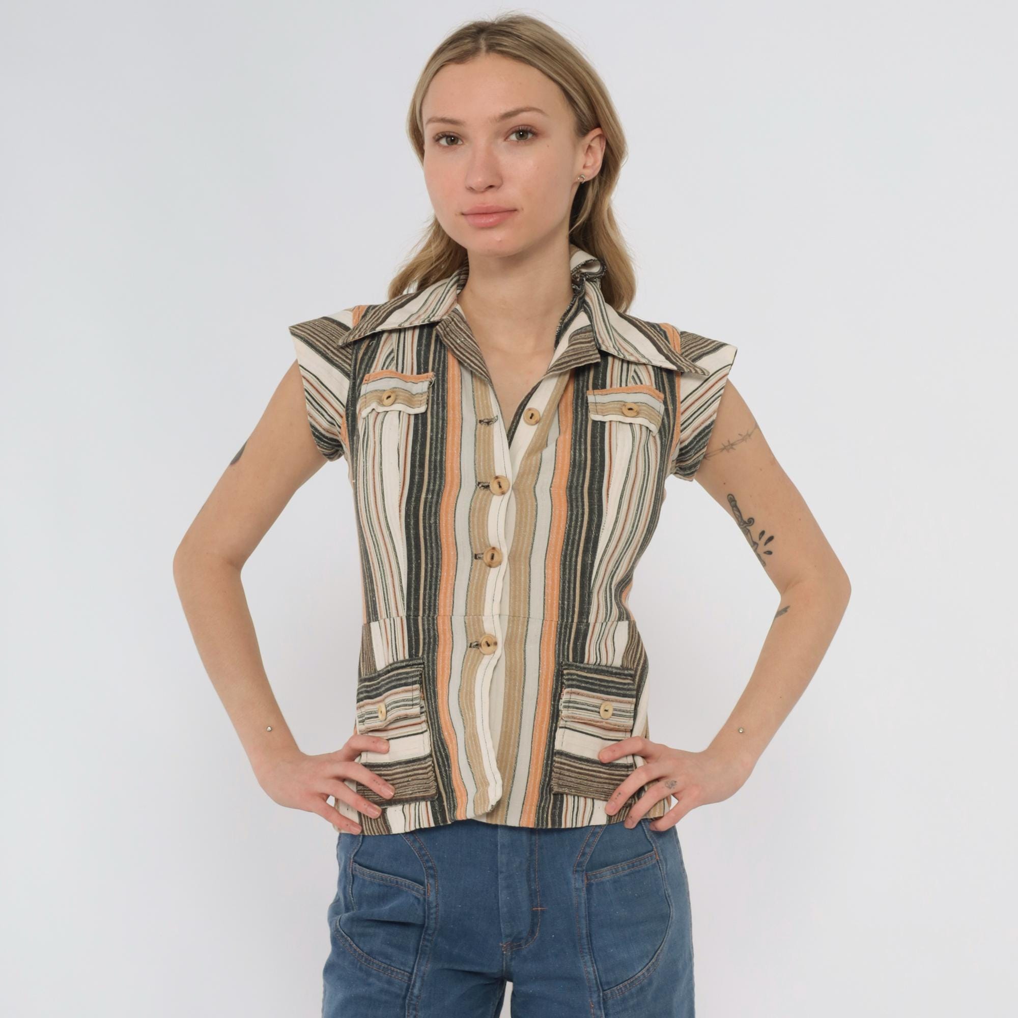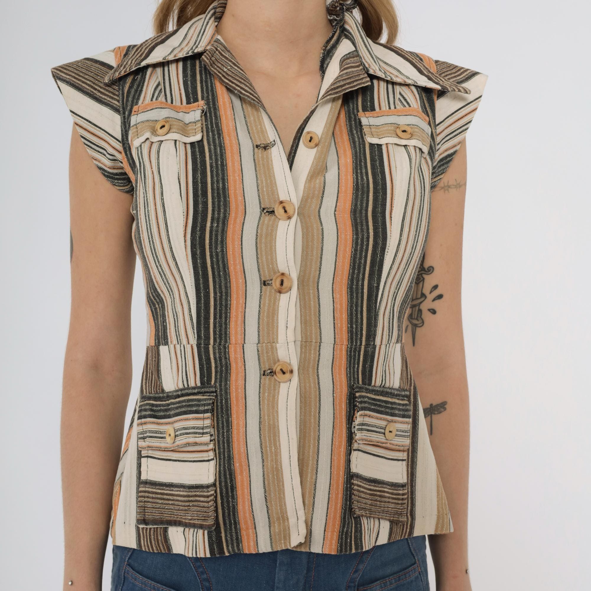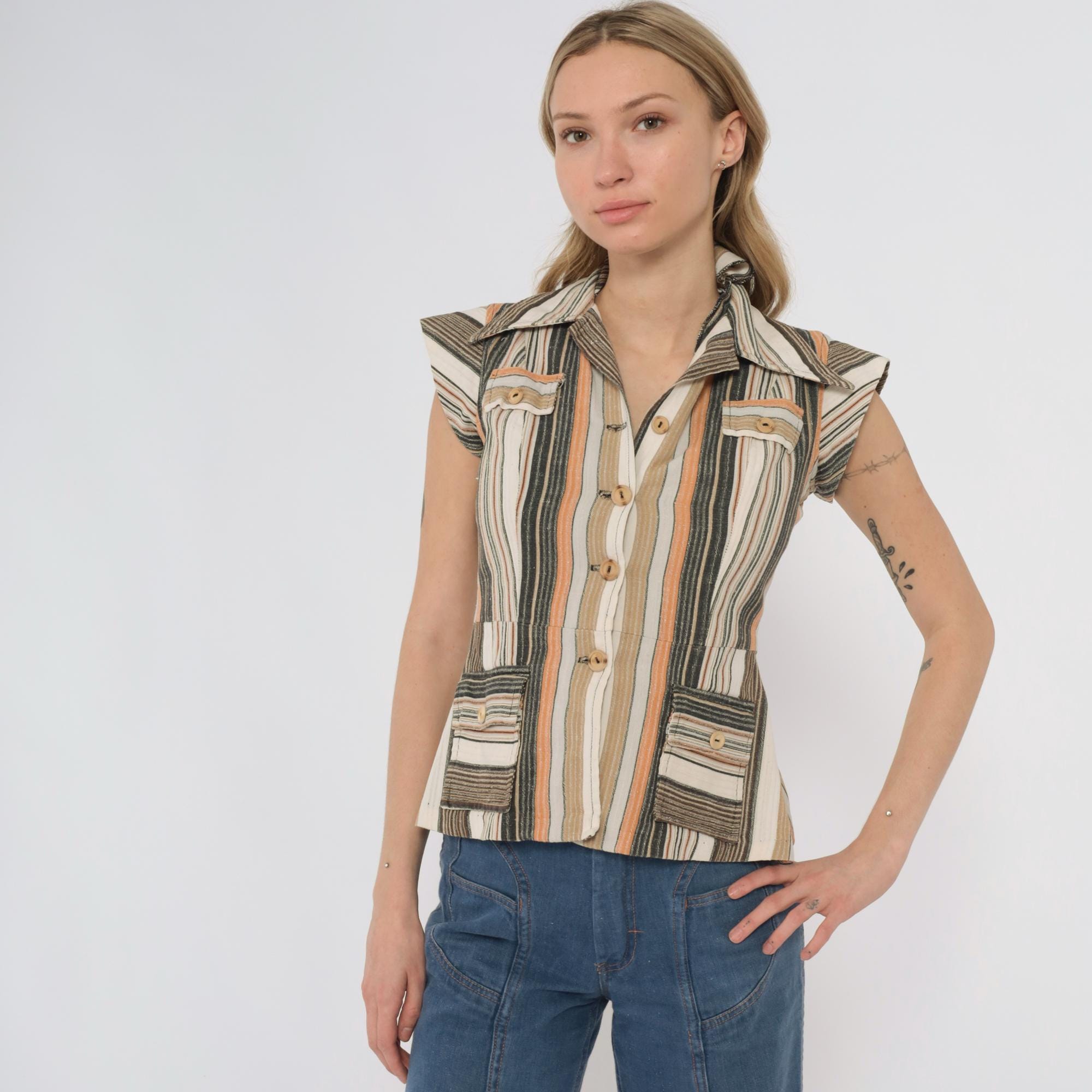 1970s earth tone striped button-front shirt with unique cap sleeves and pointed collar. Features vertical stripes in brown, black, tan, cream, and subtle orange. Four functional pockets with button closures. Made from a soft cotton blend with a fitted silhouette.