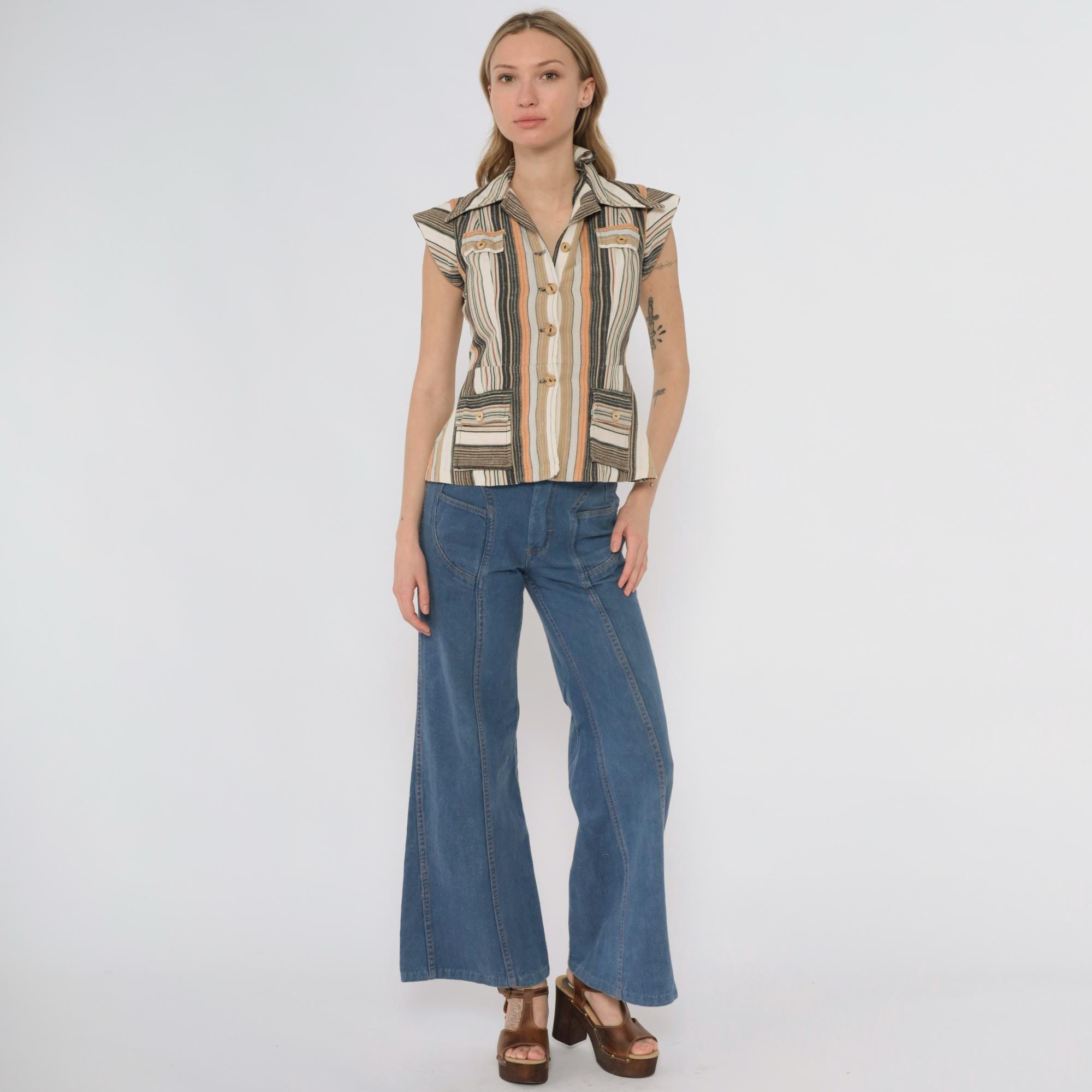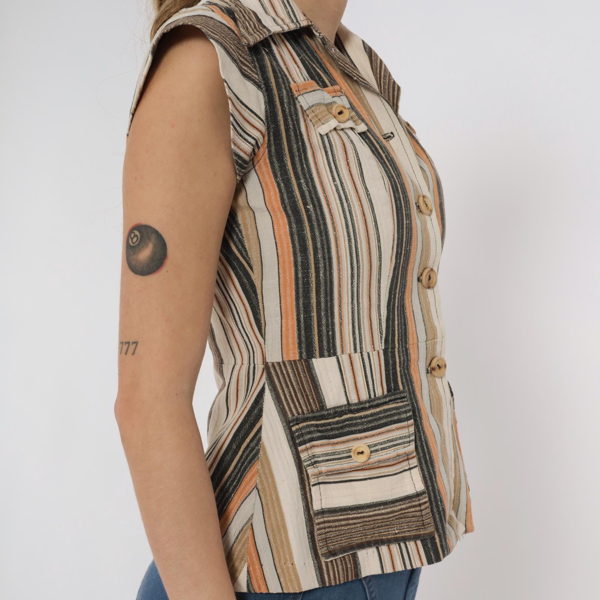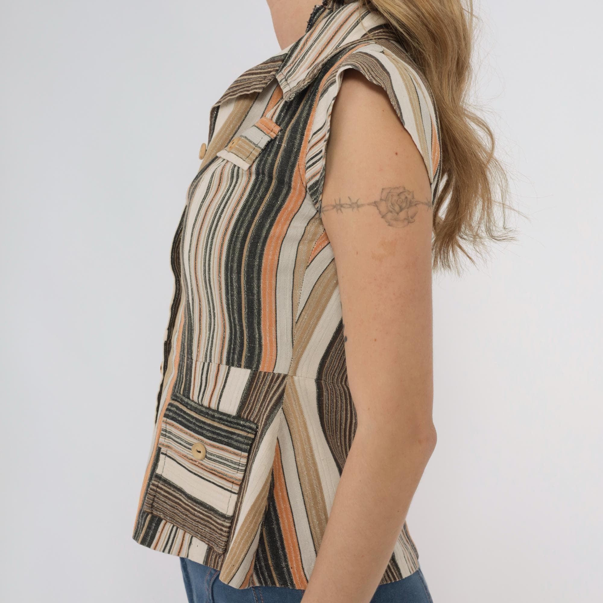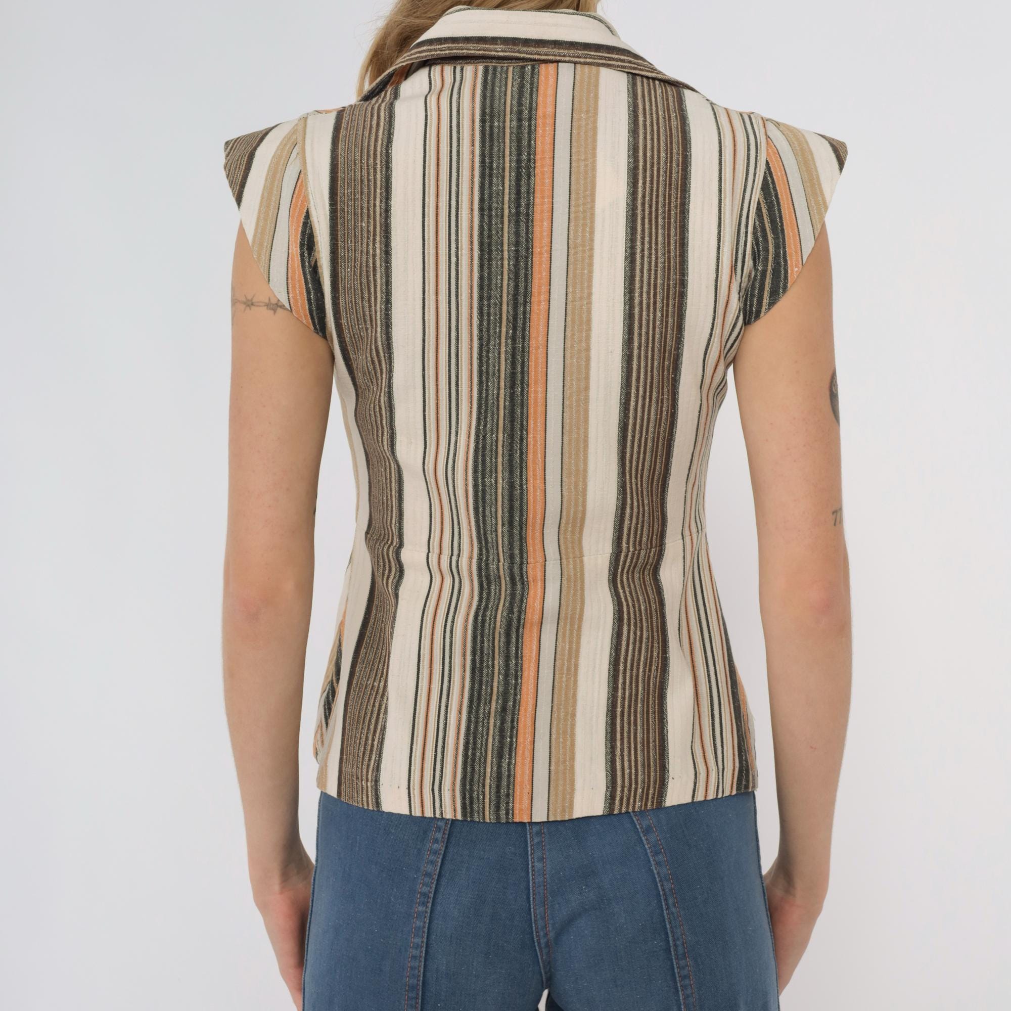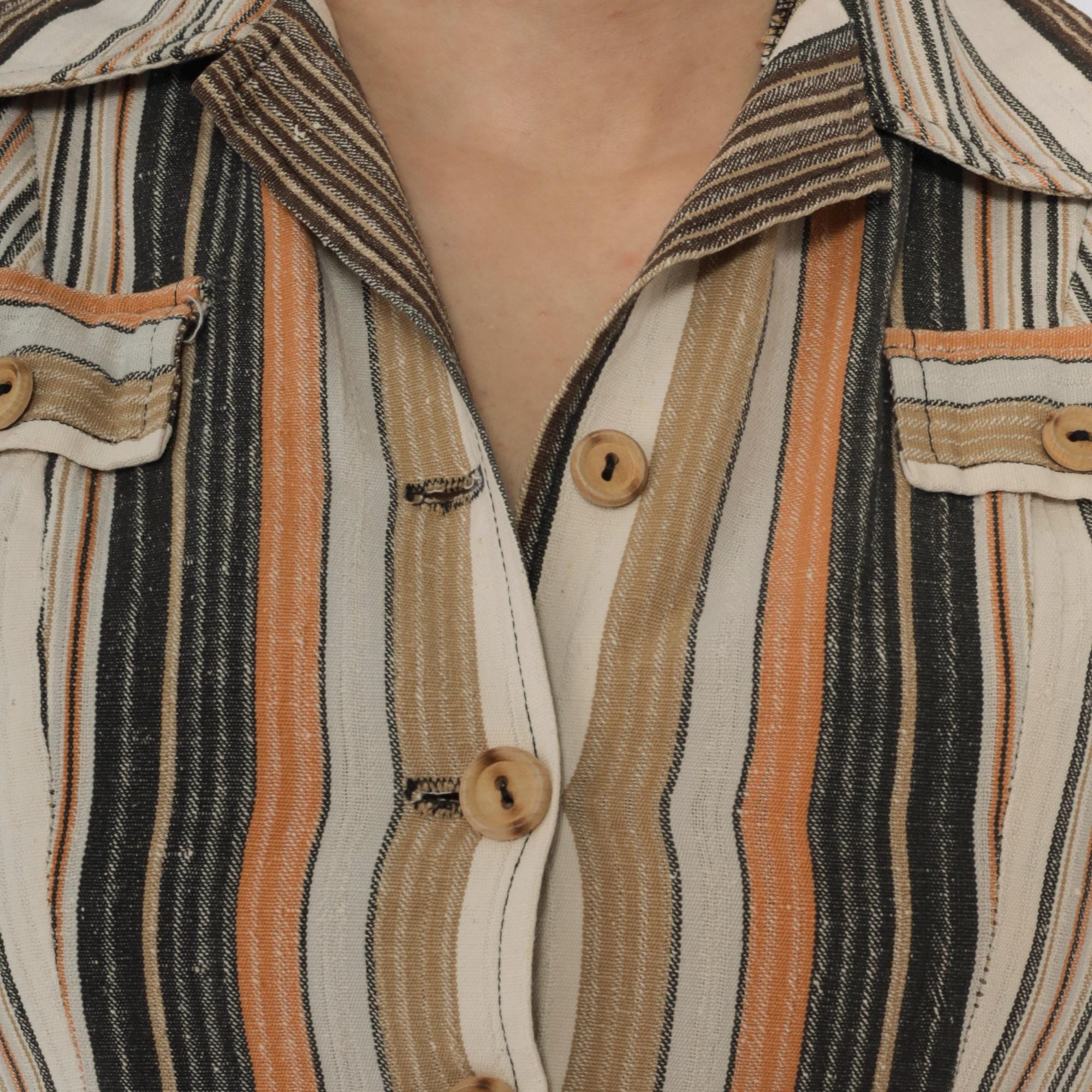 1970s earth tone striped button-front shirt with unique cap sleeves and pointed collar. Features vertical stripes in brown, black, tan, cream, and subtle orange. Four functional pockets with button closures. Made from a soft cotton blend with a fitted silhouette.