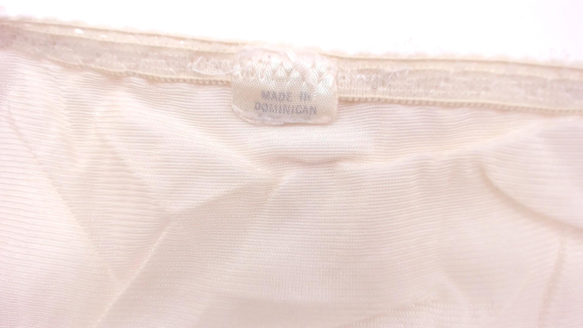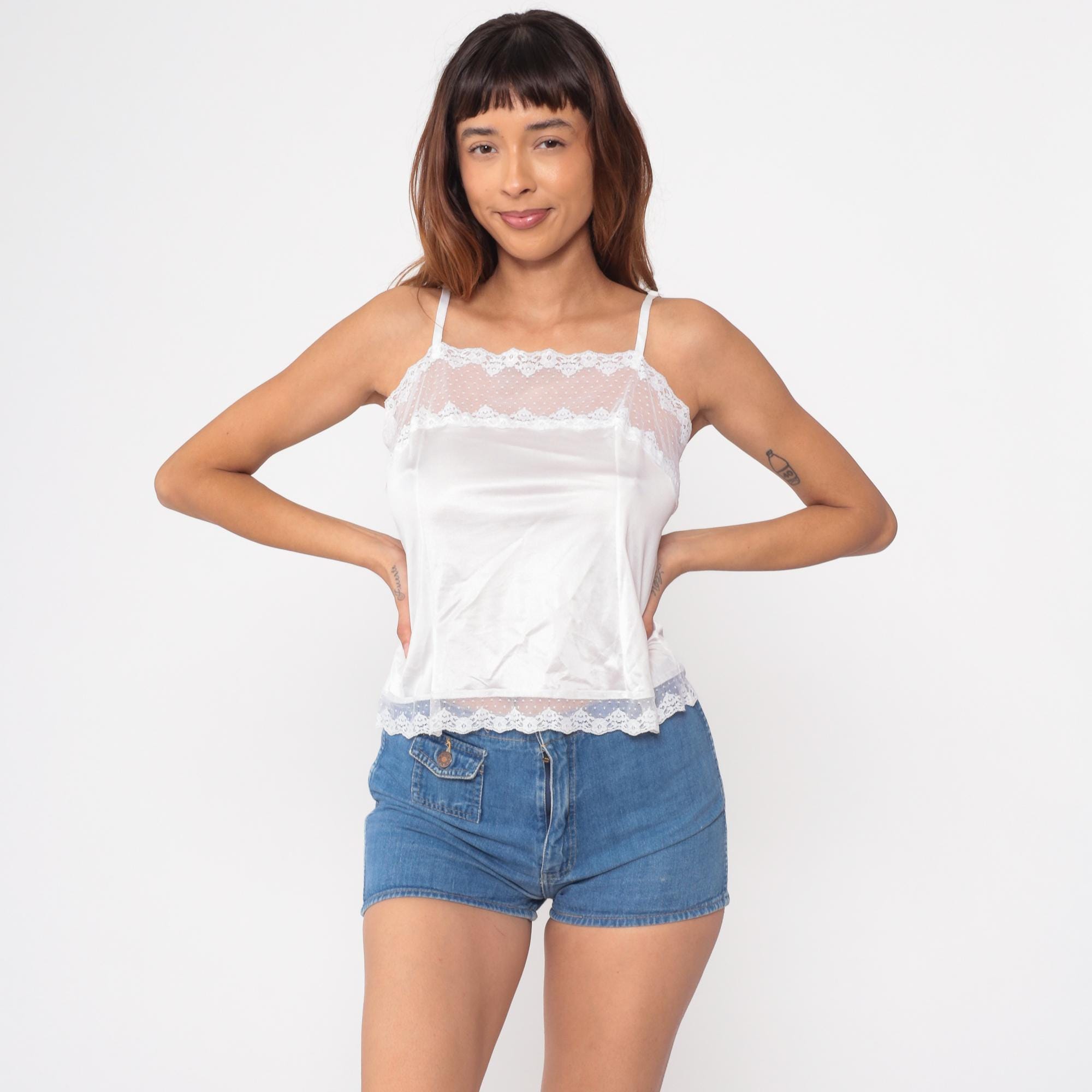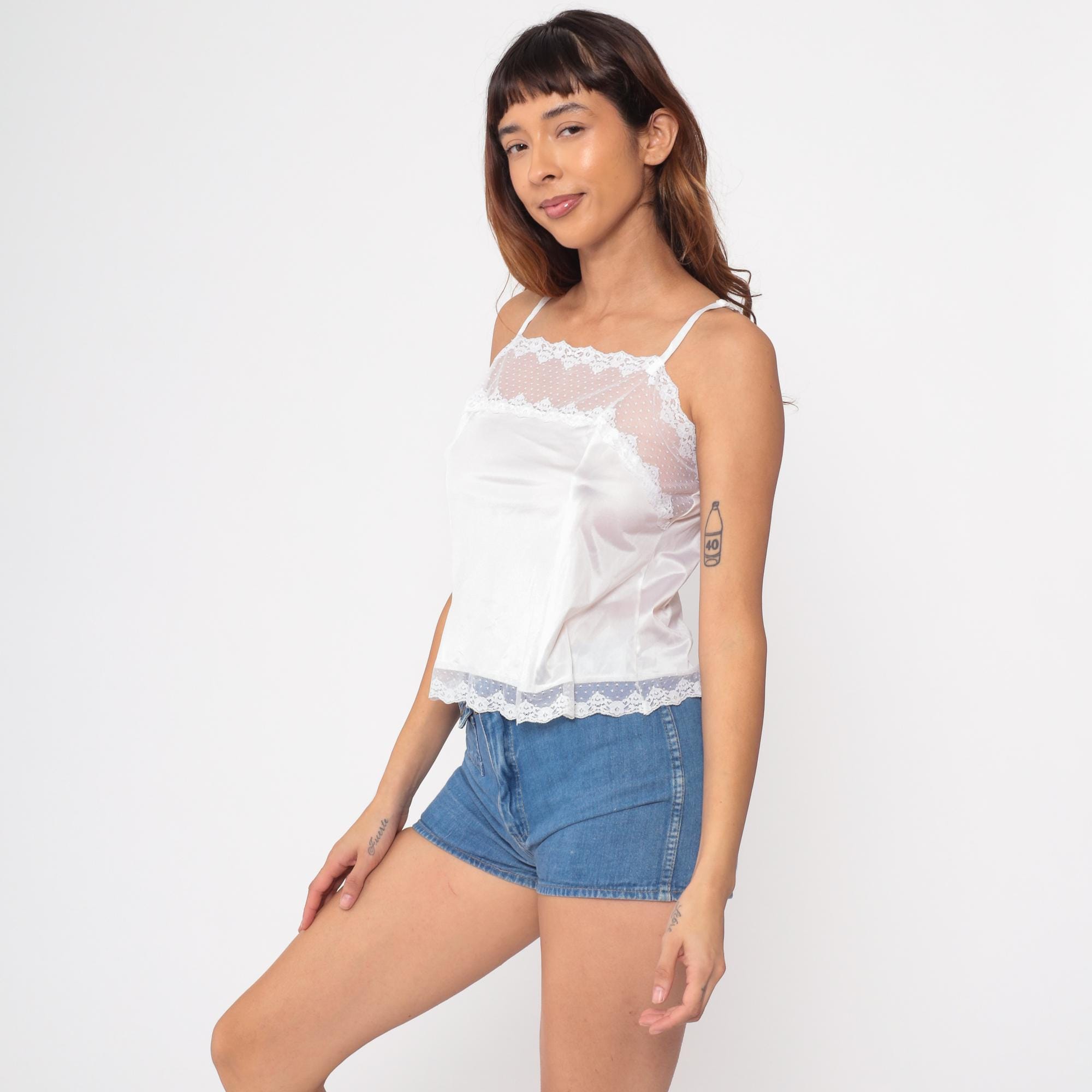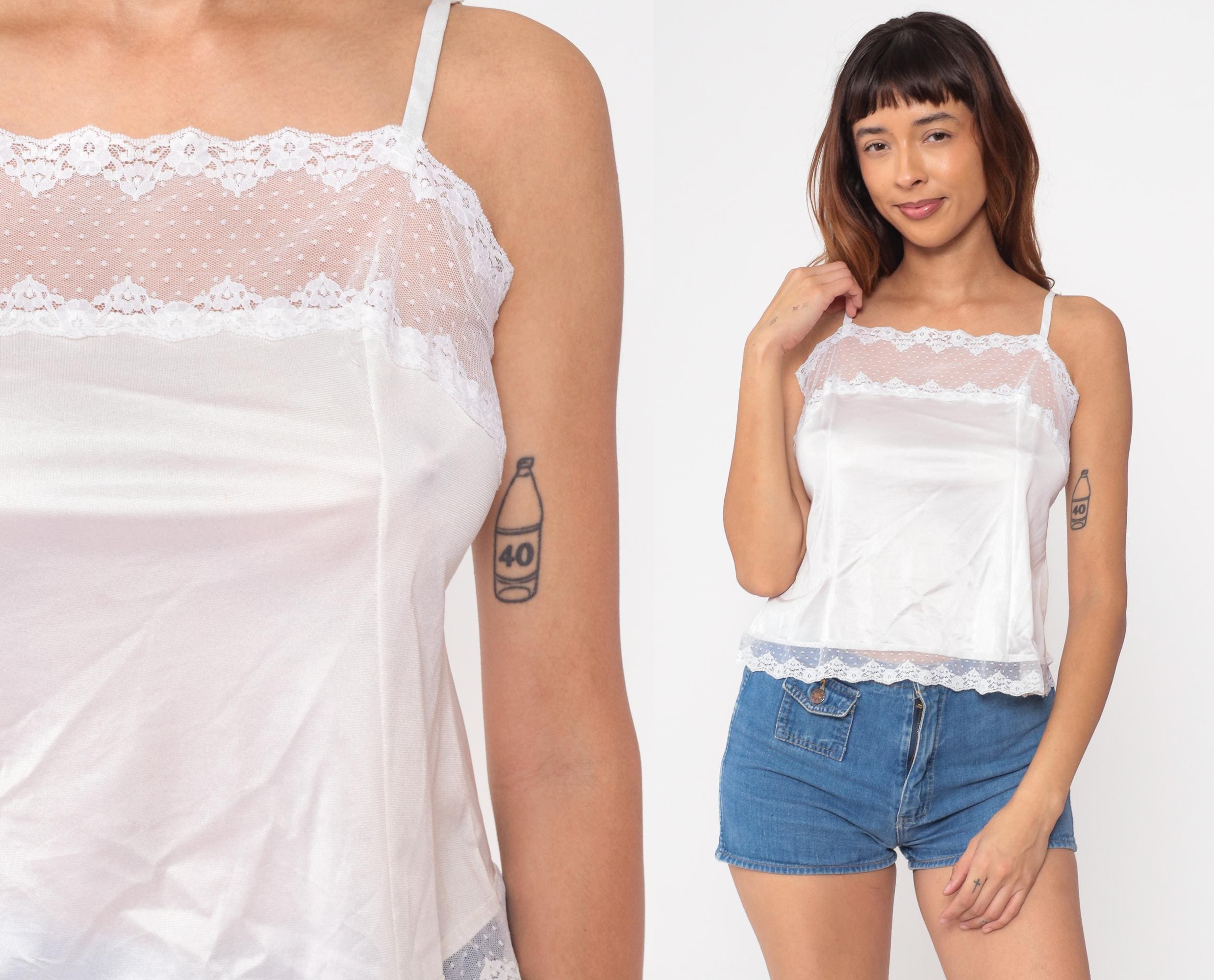 80s white nylon camisole featuring a sheer mesh upper panel with floral lace trim. The top has narrow adjustable straps, a straight neckline, and lace edging along the hem.