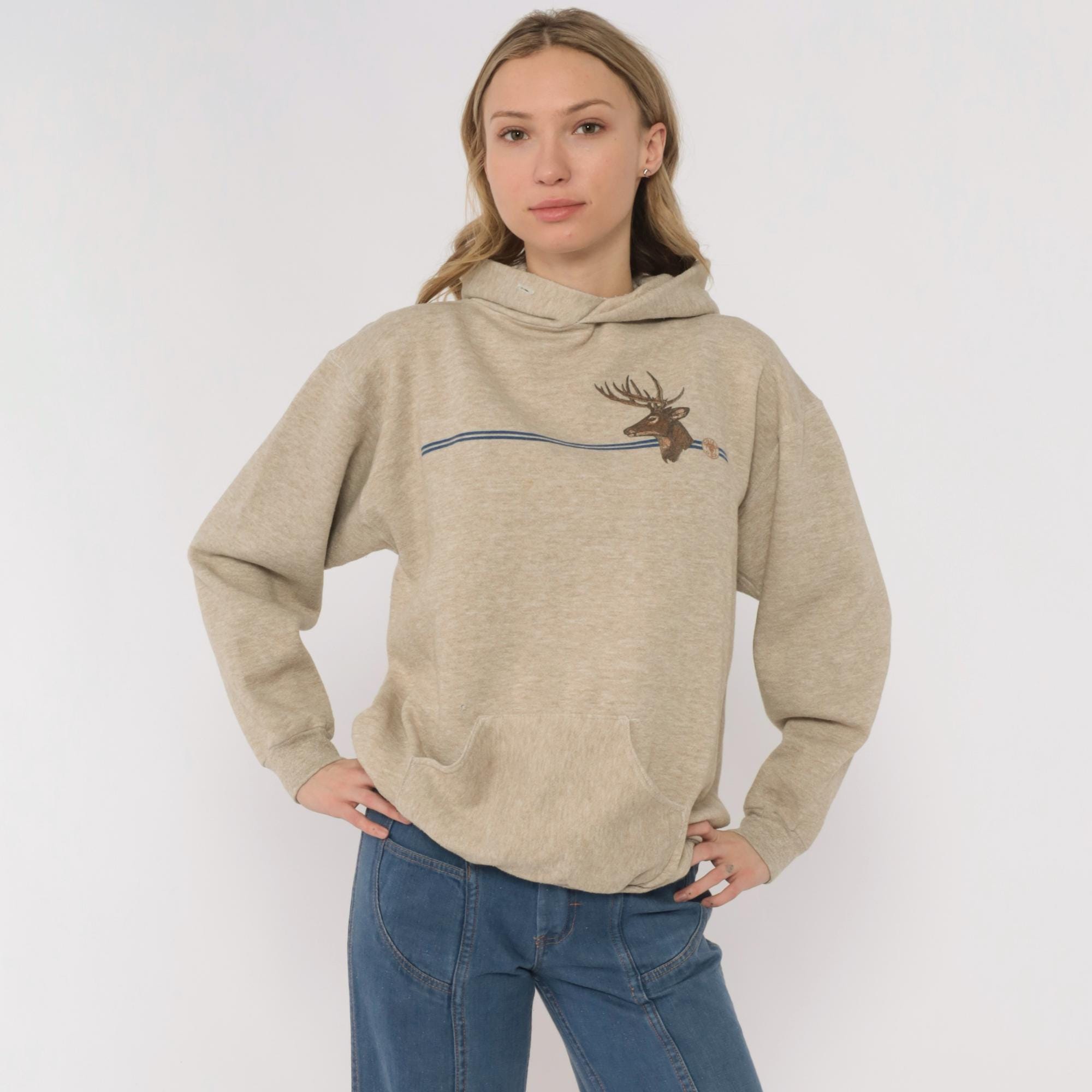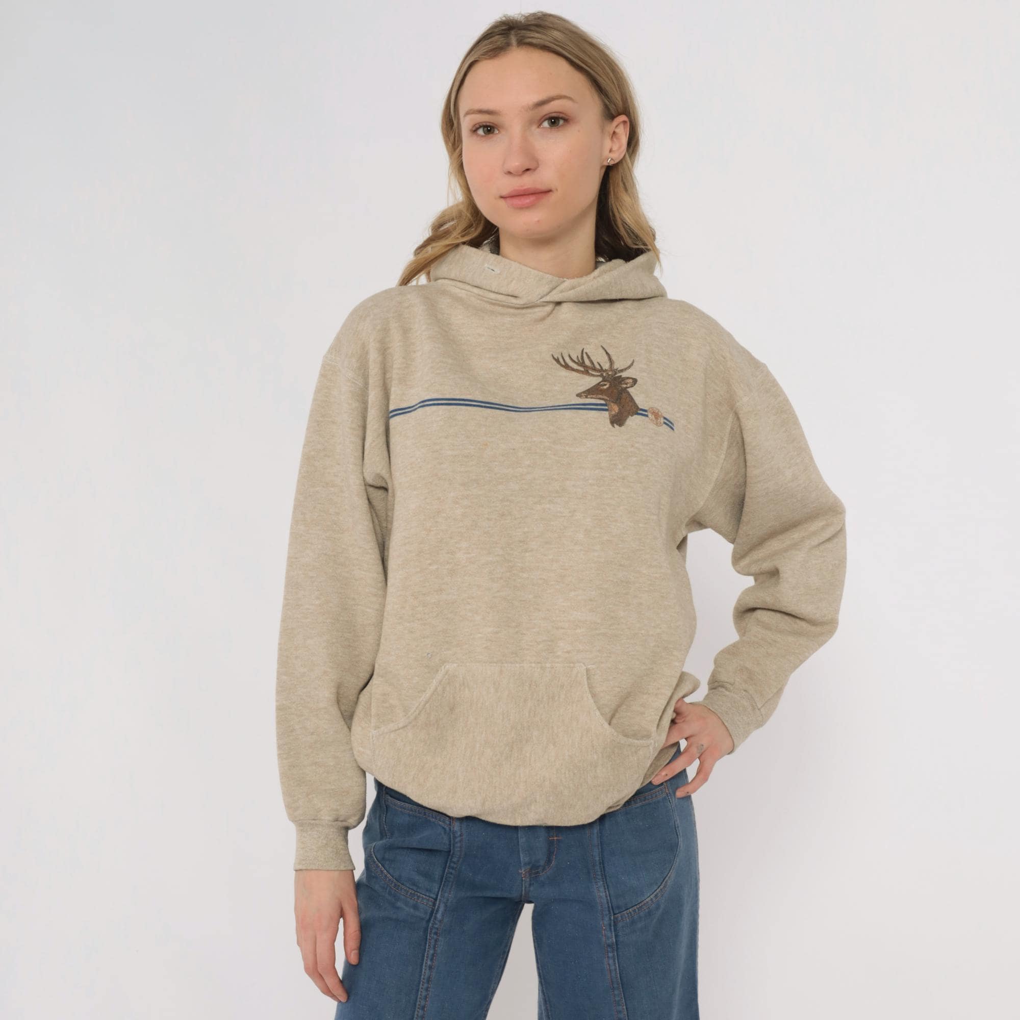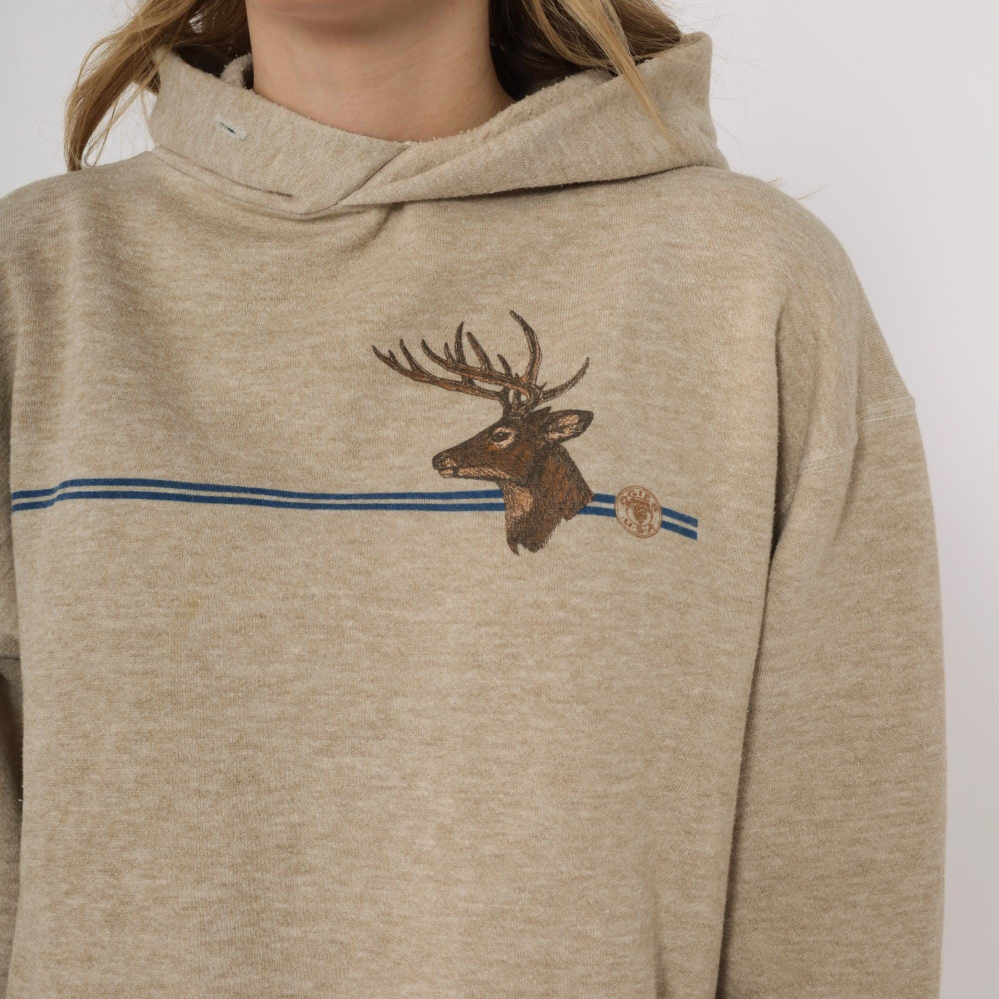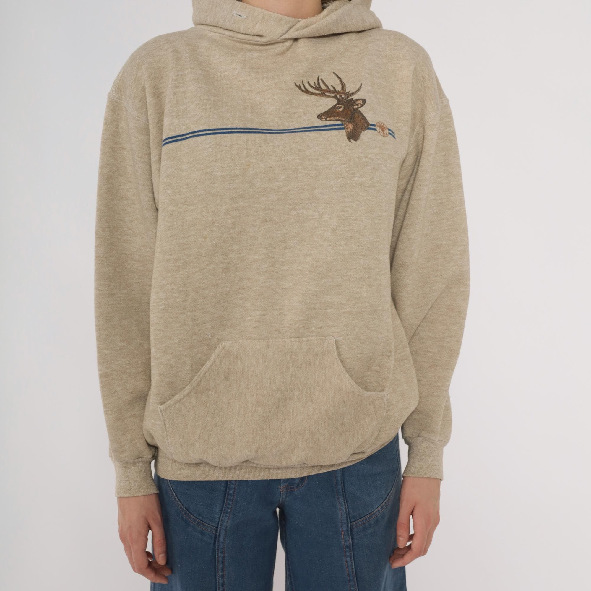 1980s tan hoodie featuring screen printed deer graphic with blue accent stripes. Cotton blend with kangaroo pocket. Perfect for nature enthusiasts.