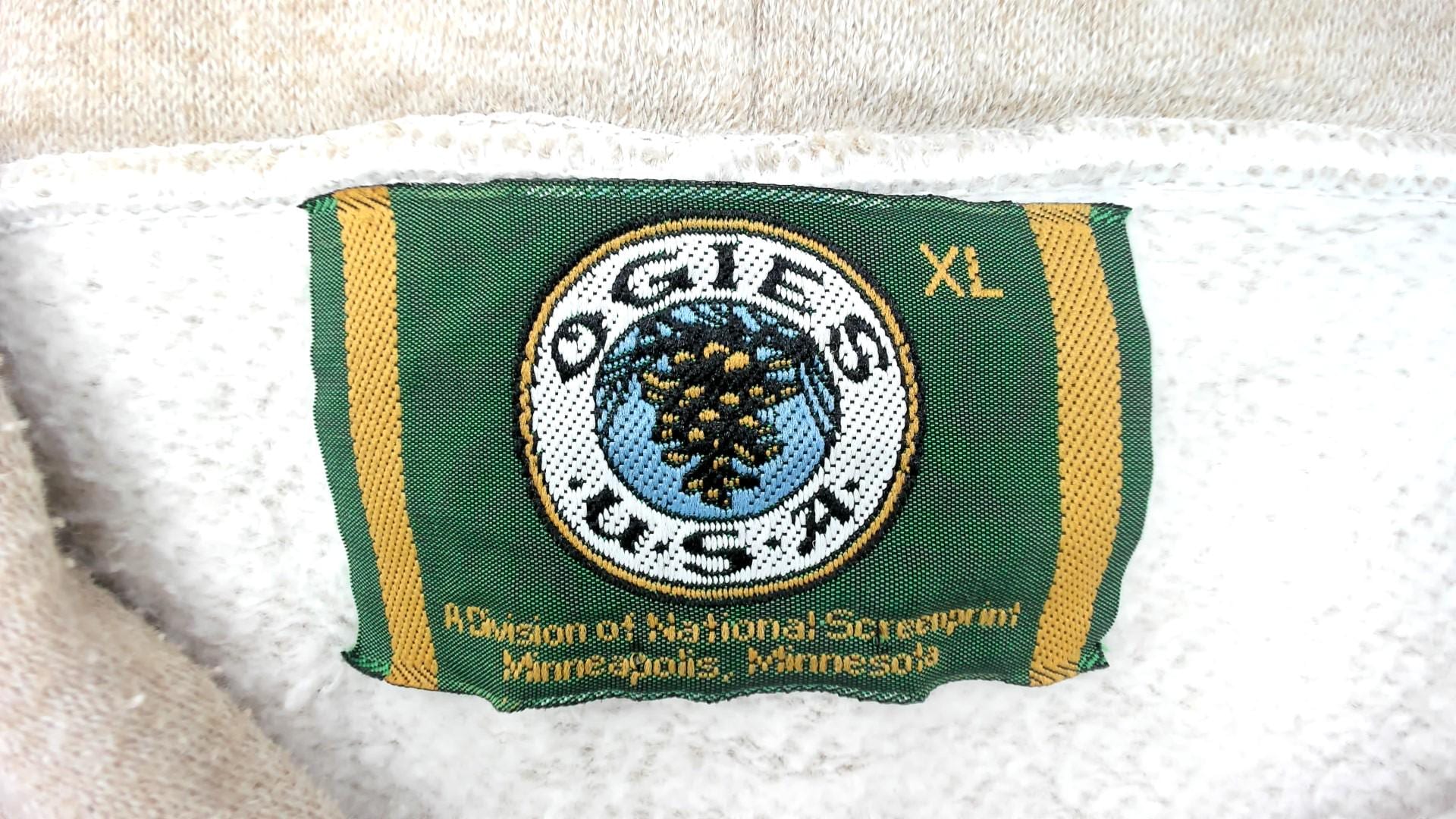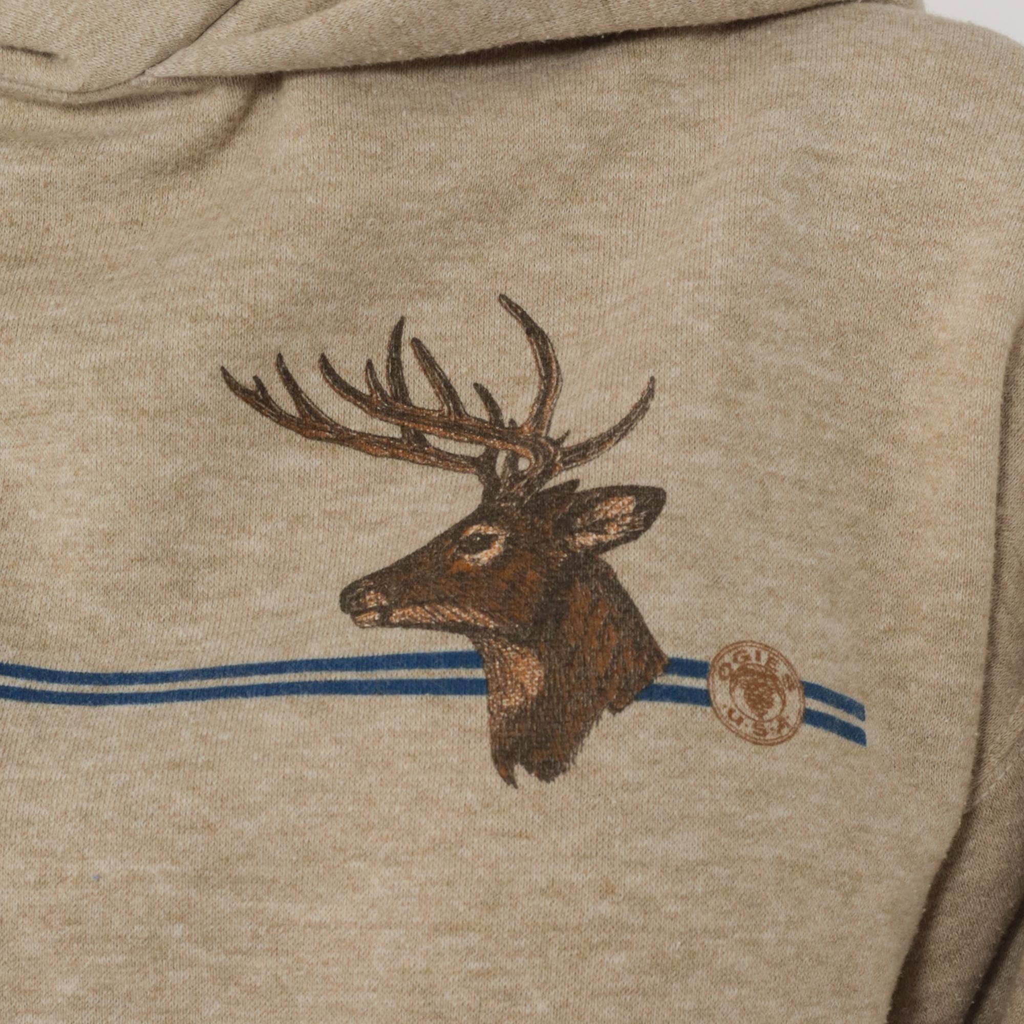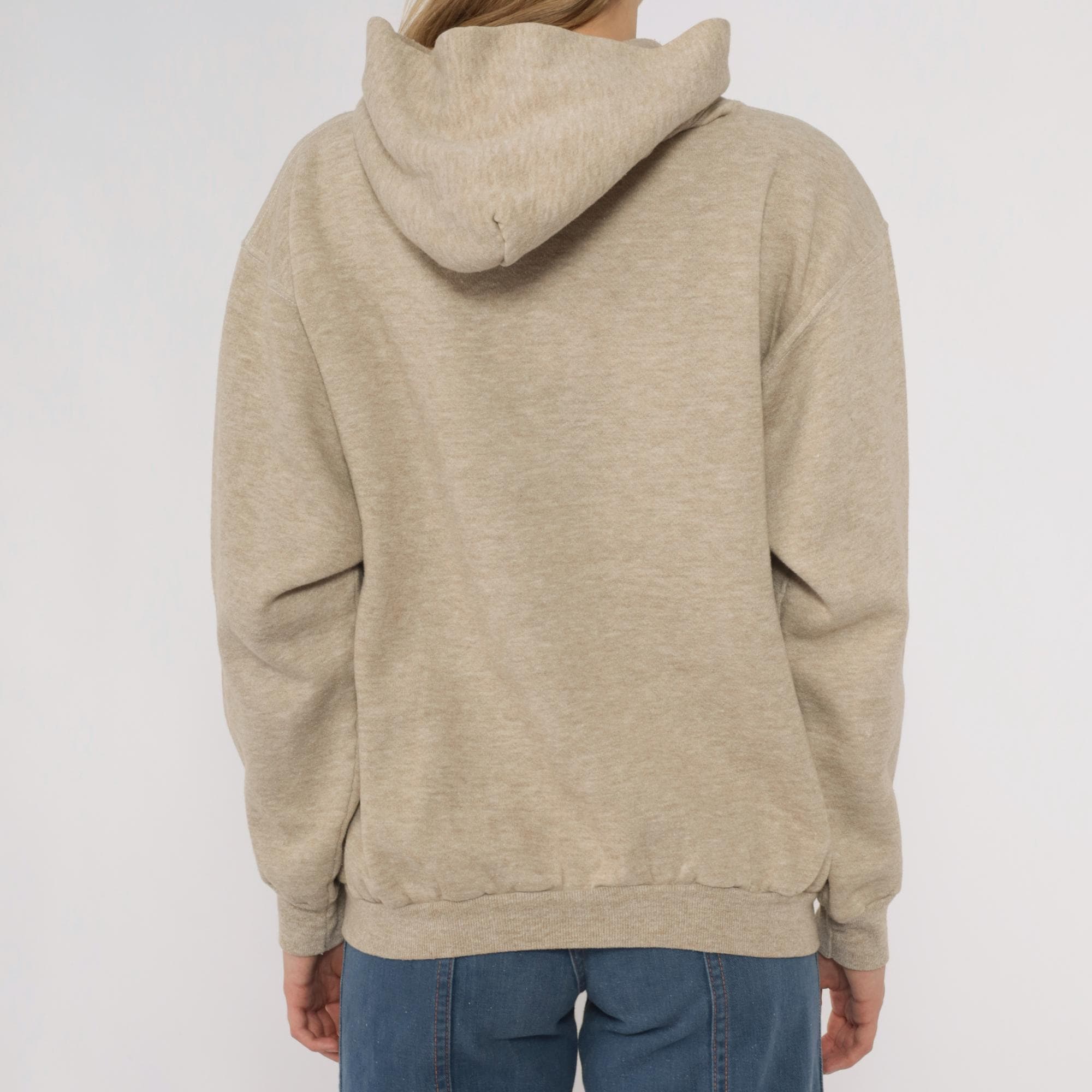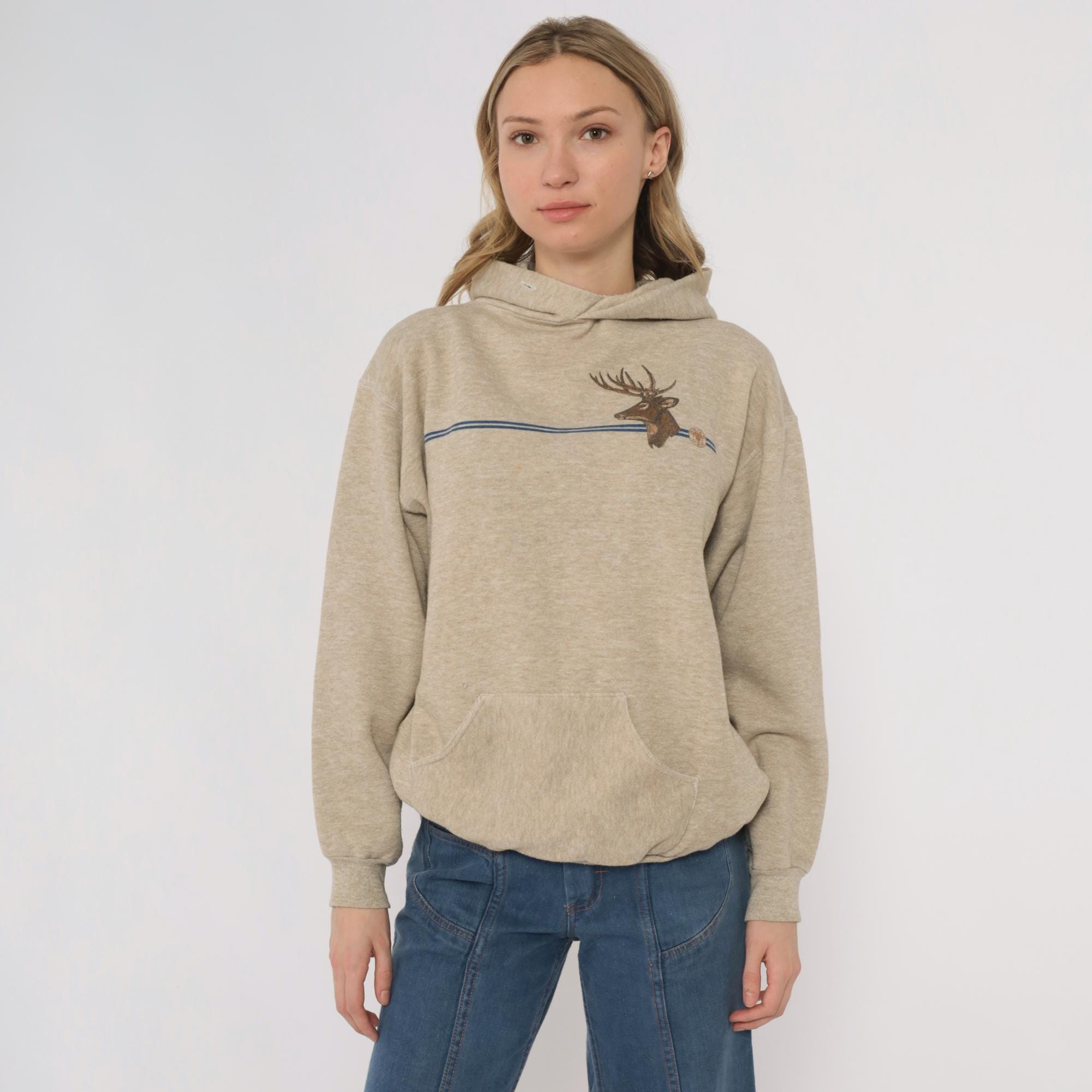 1980s tan hoodie featuring screen printed deer graphic with blue accent stripes. Cotton blend with kangaroo pocket. Perfect for nature enthusiasts.