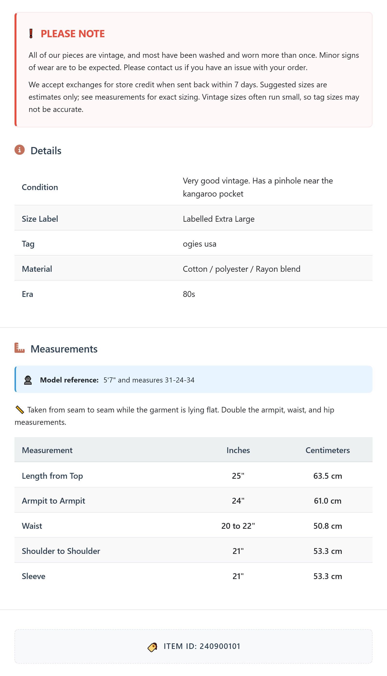 Condition: Very good vintage. Has a pinhole near the kangaroo pocket