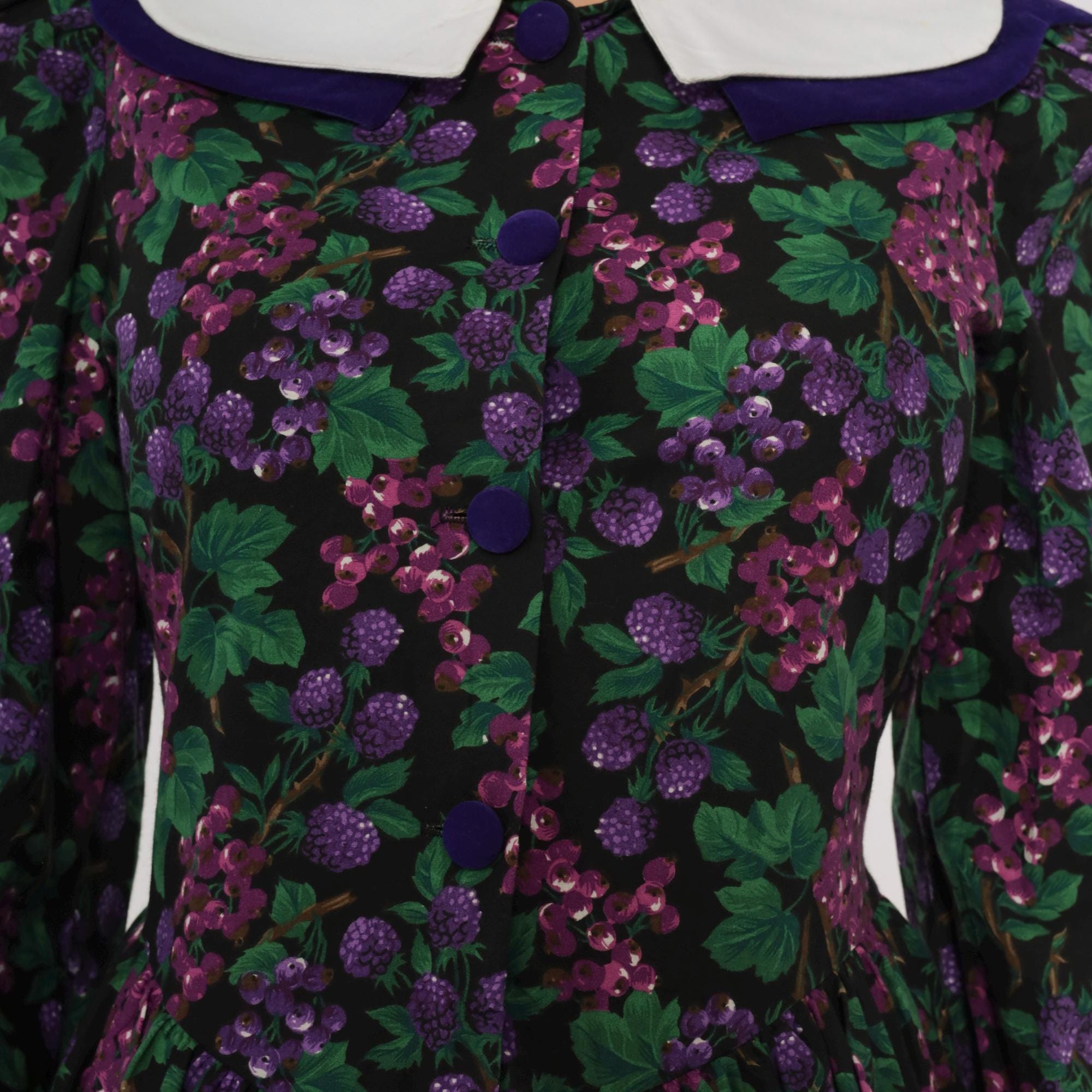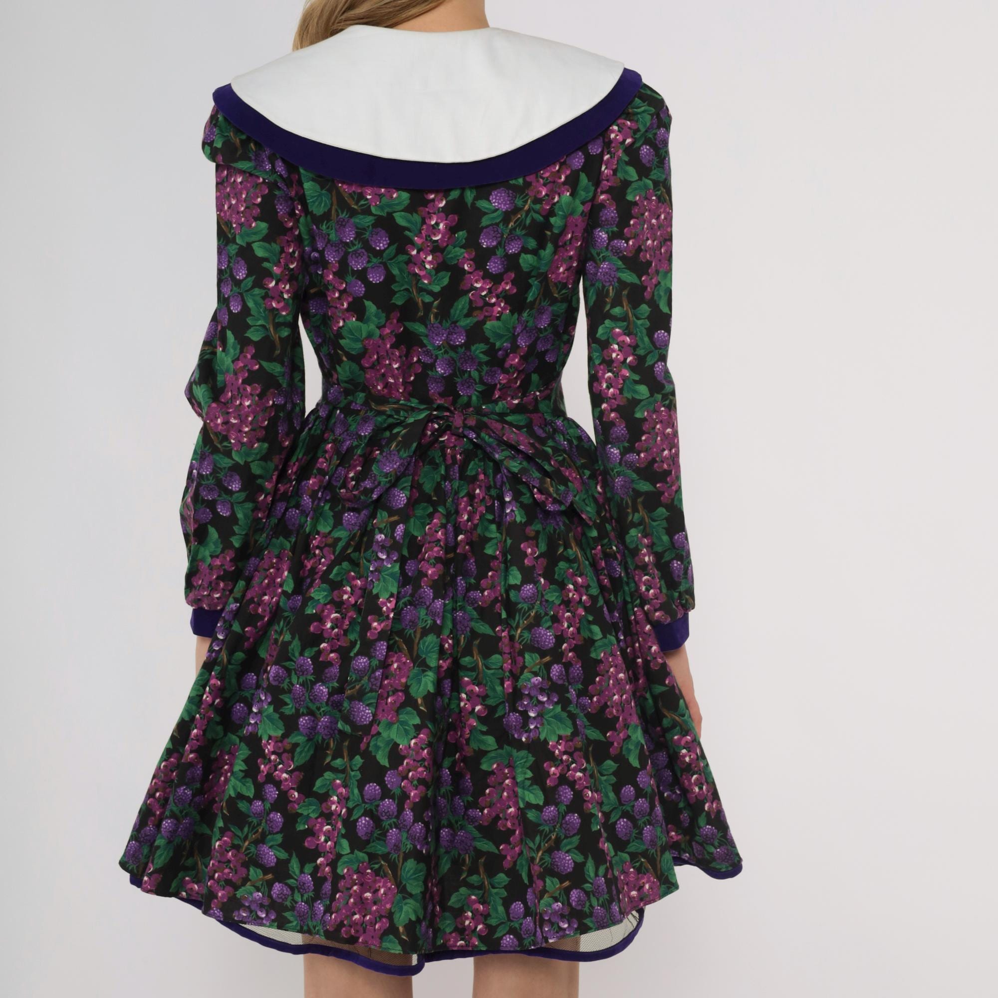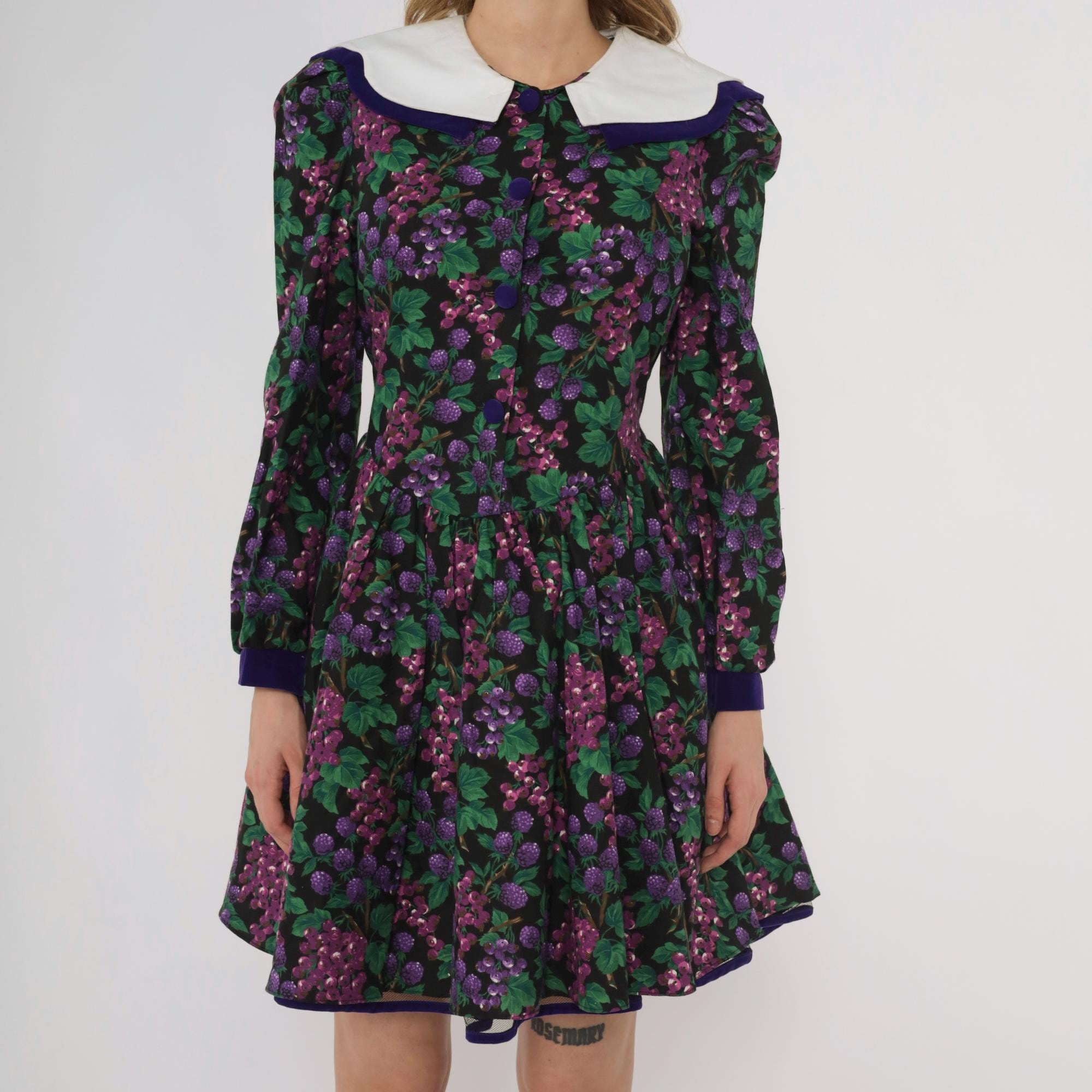 80s purple grape print dress by Bonnie Jean. Features clusters of purple grapes and green leaves on black background. White Peter Pan collar with purple trim. Button front with purple covered buttons. Long sleeves with purple cuffs. Fitted waist with full skirt and tie back.