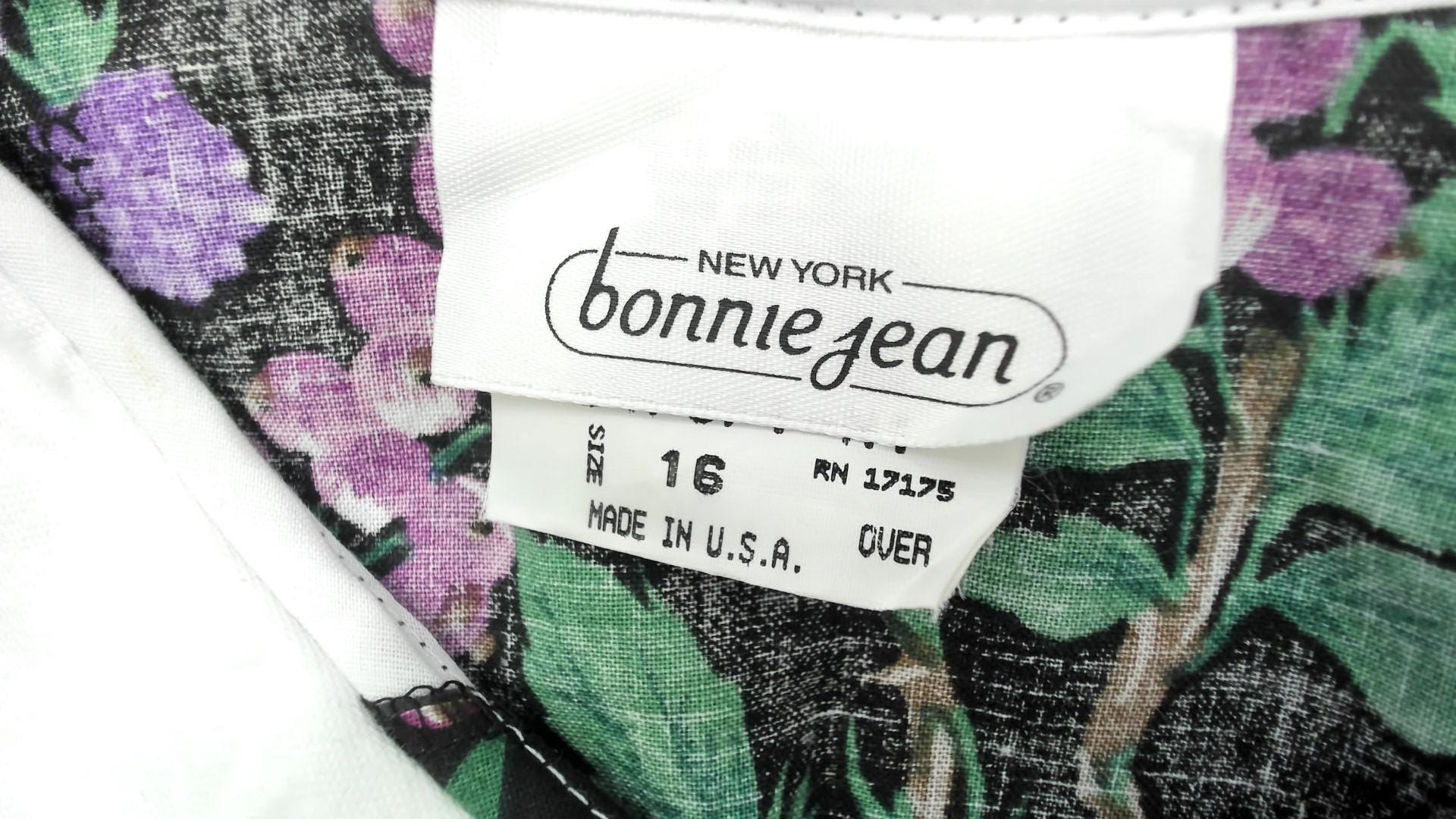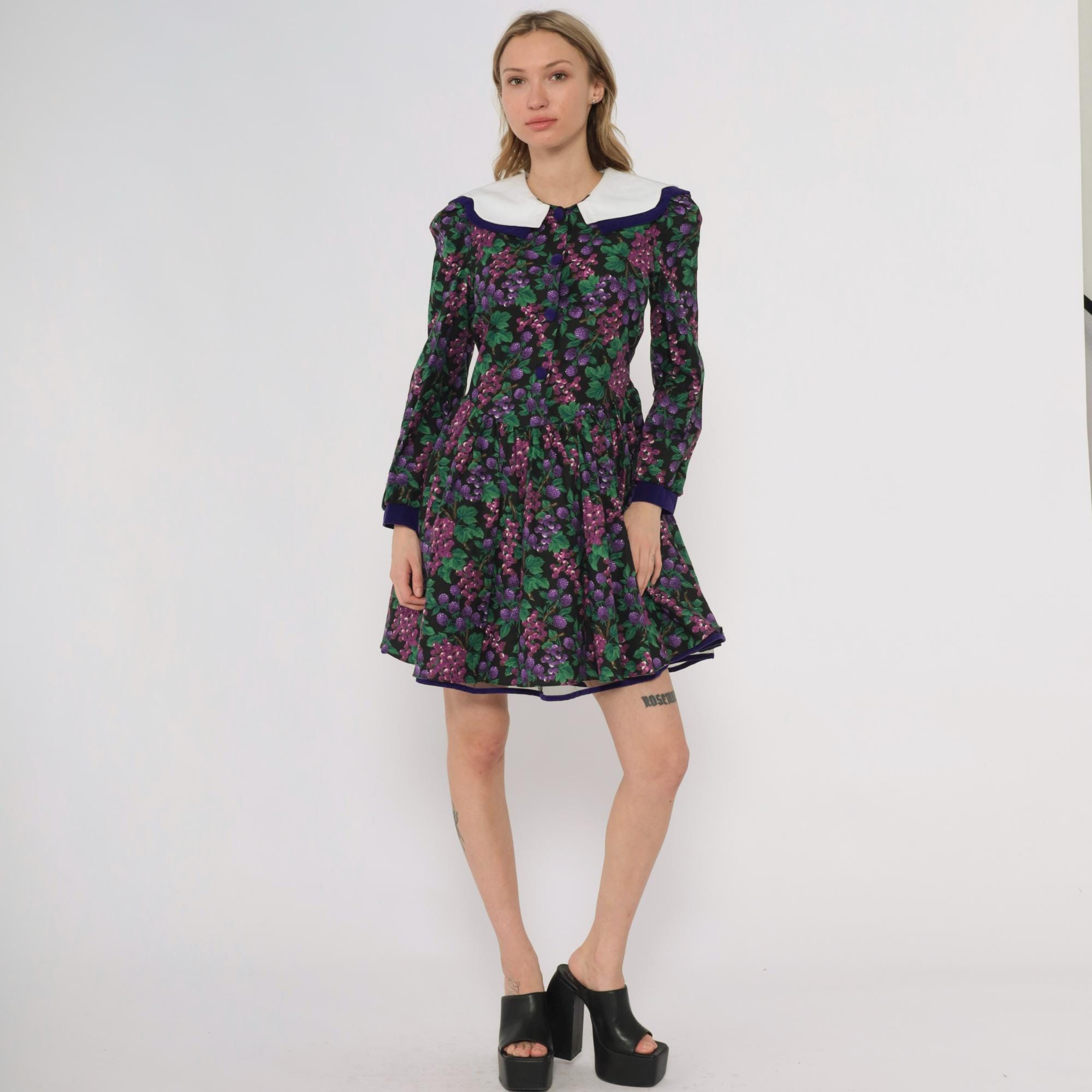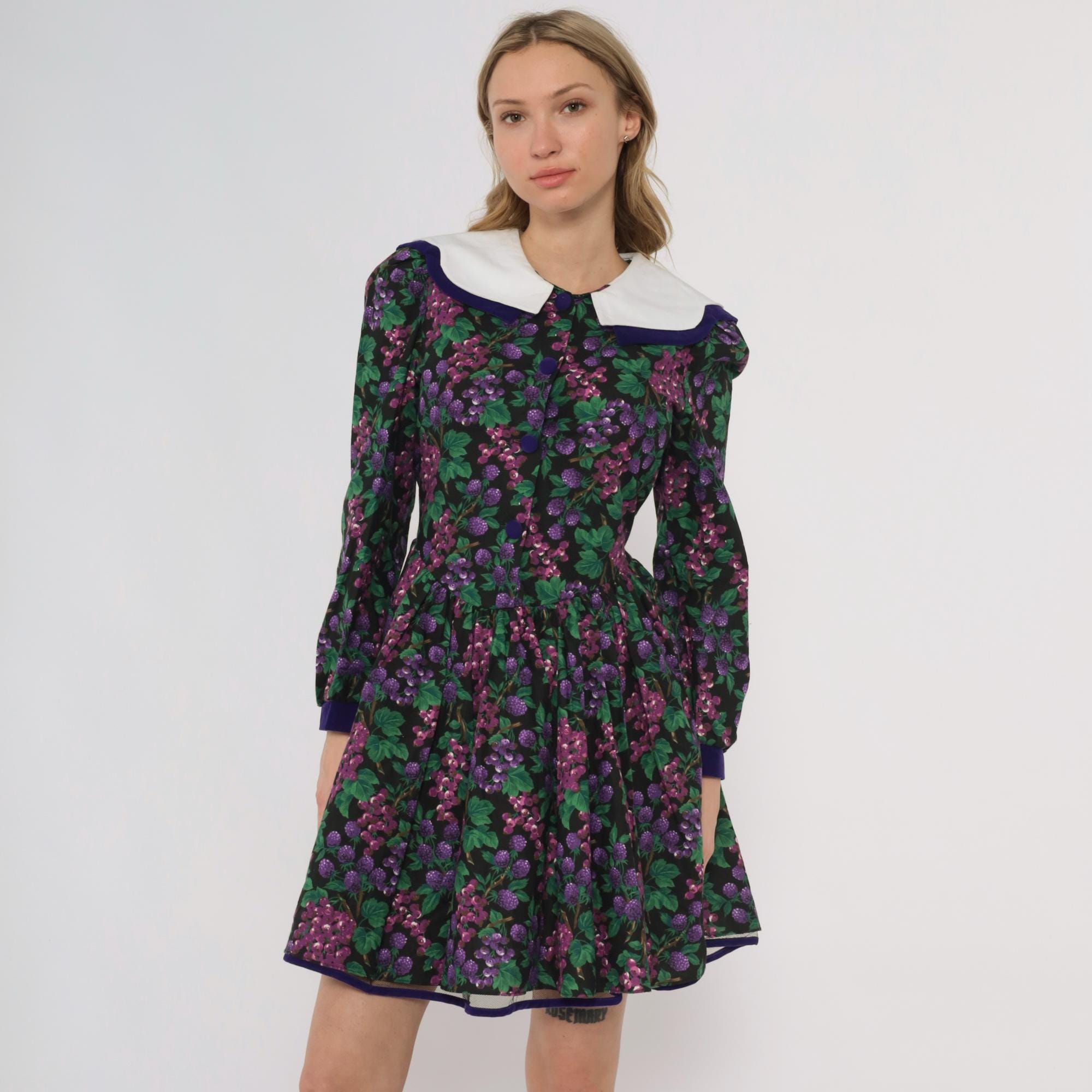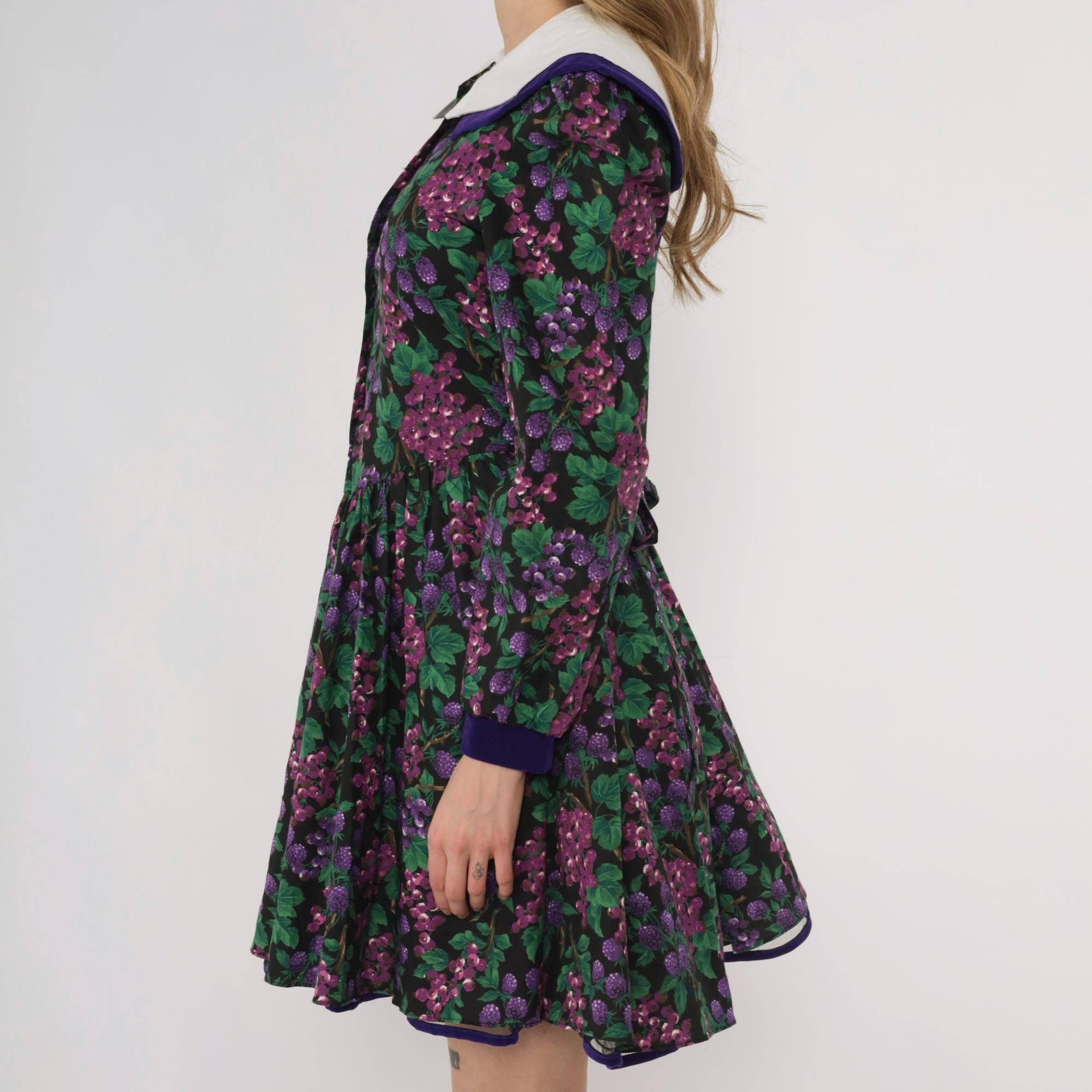 80s purple grape print dress by Bonnie Jean. Features clusters of purple grapes and green leaves on black background. White Peter Pan collar with purple trim. Button front with purple covered buttons. Long sleeves with purple cuffs. Fitted waist with full skirt and tie back.