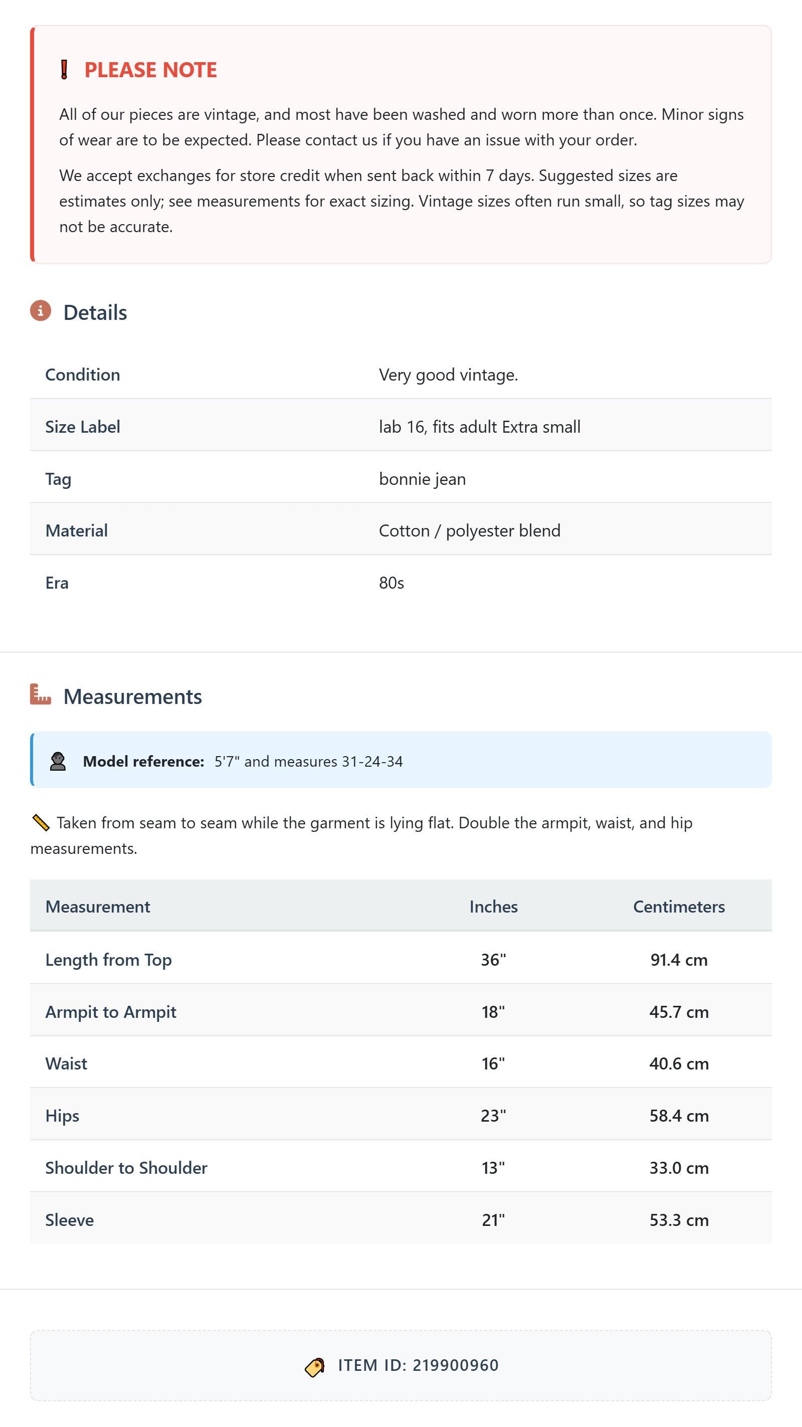 All of our pieces are vintage, and most have been washed and worn more than once. Minor signs of wear are to be expected. Please contact us if you have an issue with your order. We accept exchanges for store credit when sent back within 7 days.