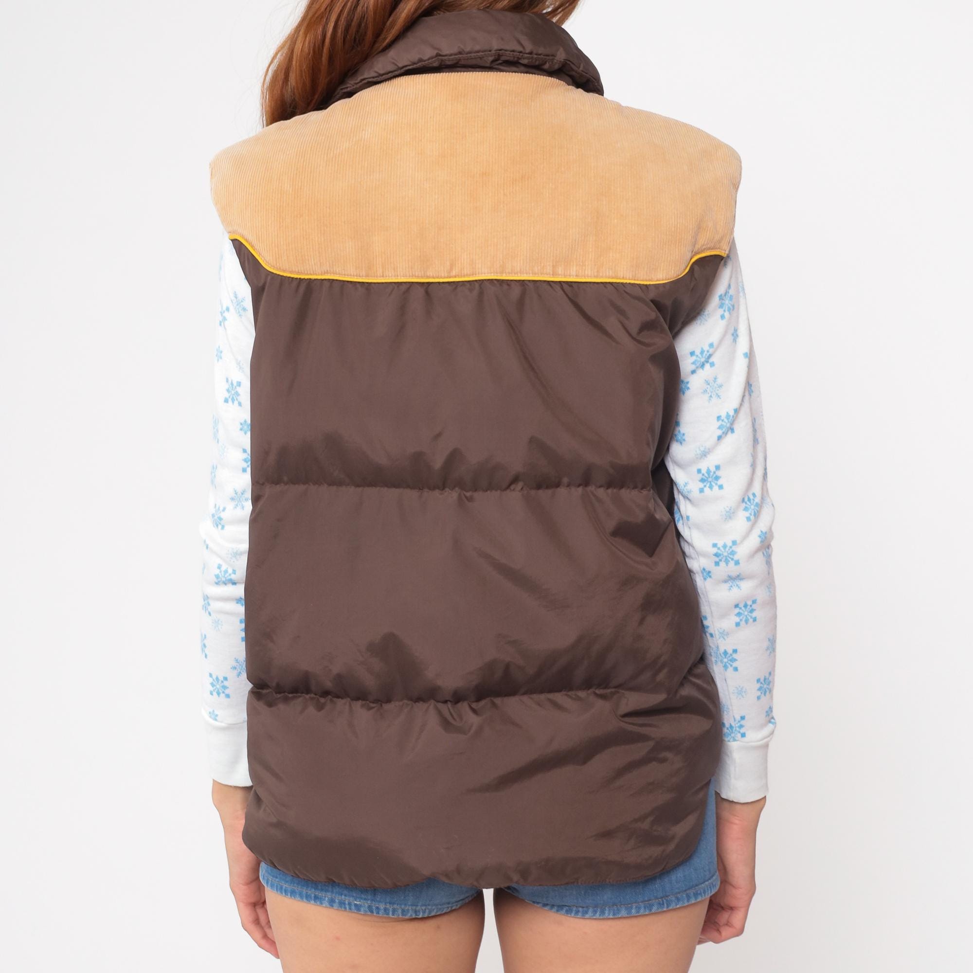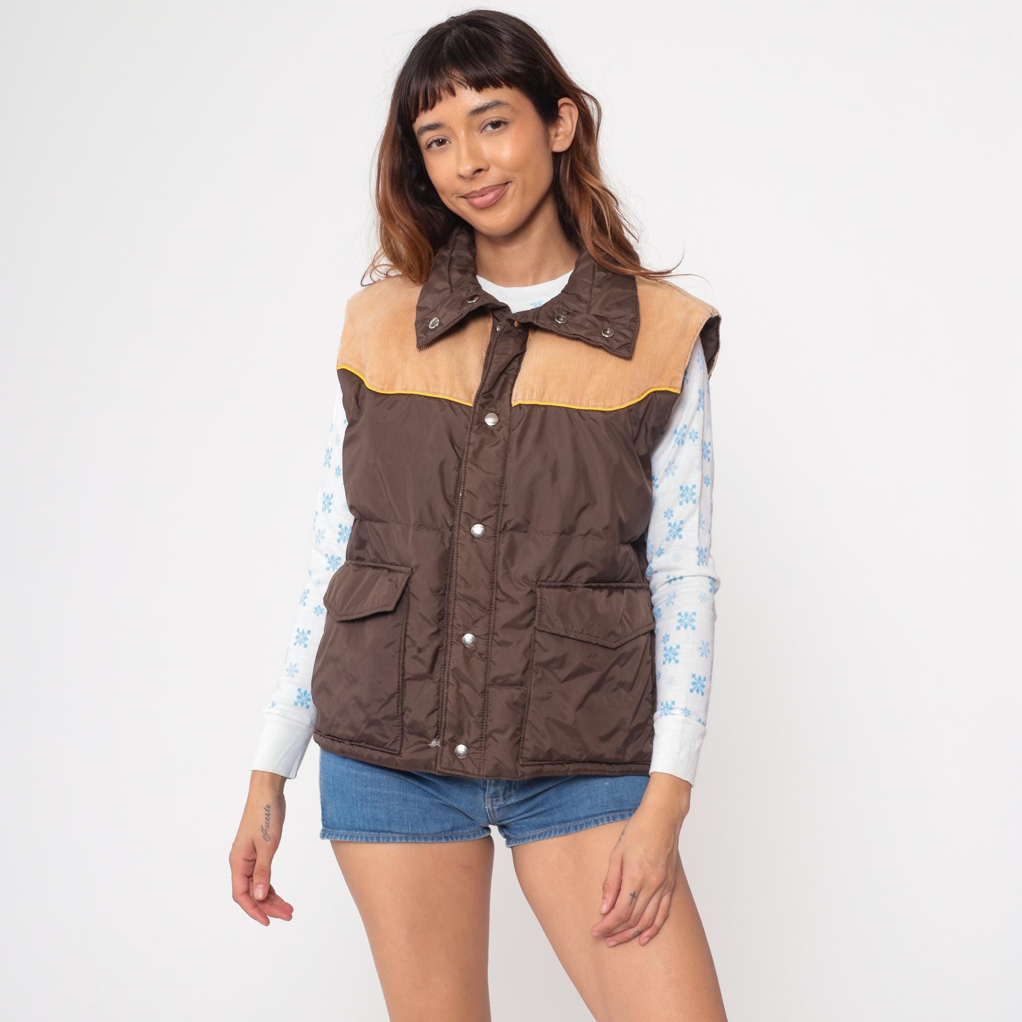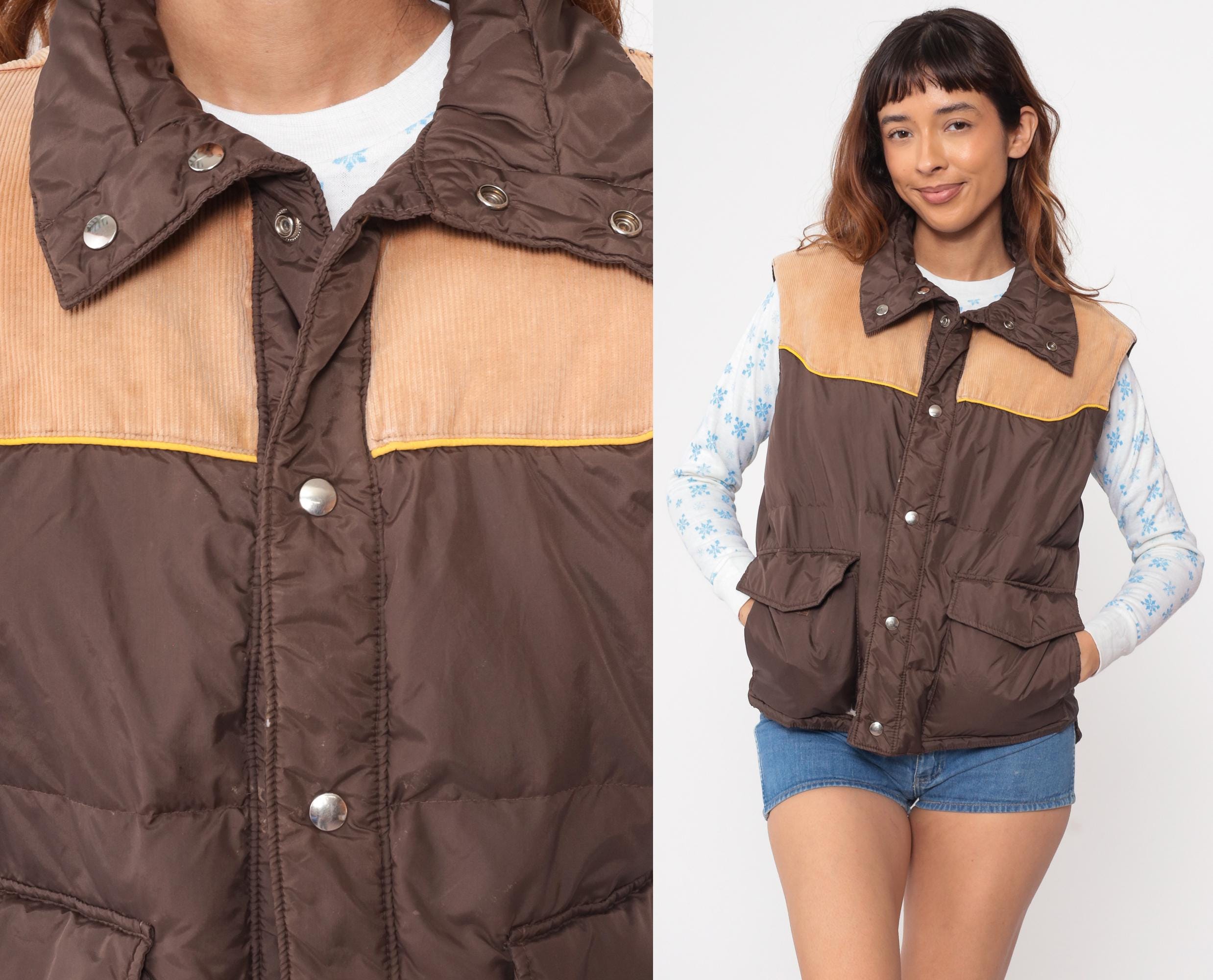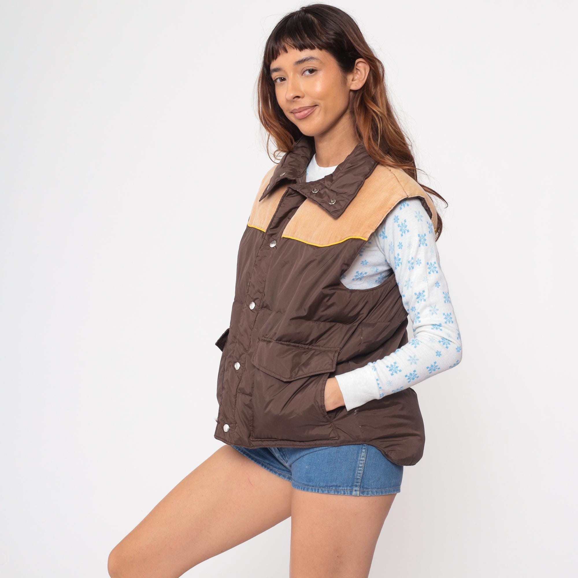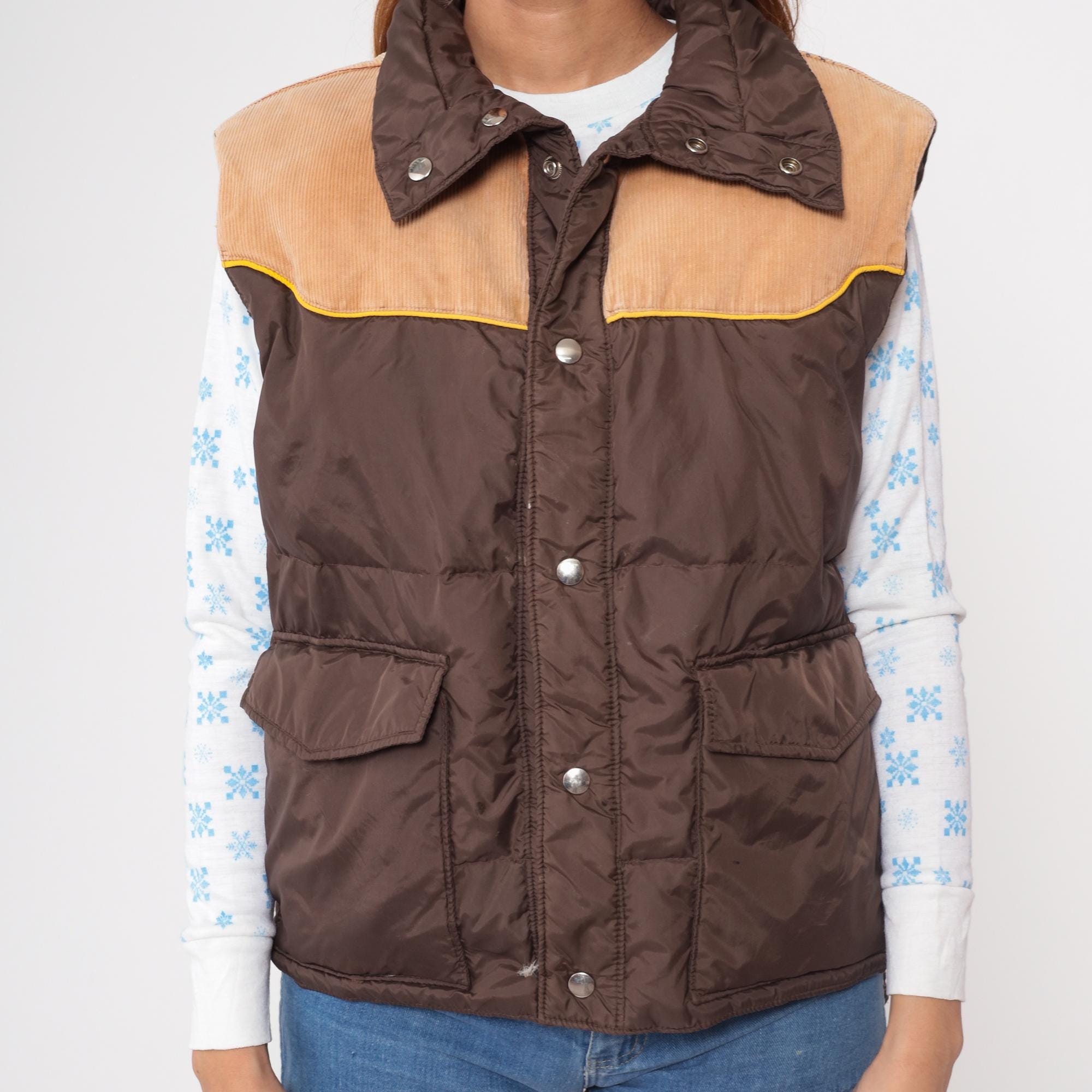 70s western-style puffer vest from Down Hill. Features brown nylon shell with tan corduroy yoke and yellow piping detail. Front snap closure with two functional flap pockets.