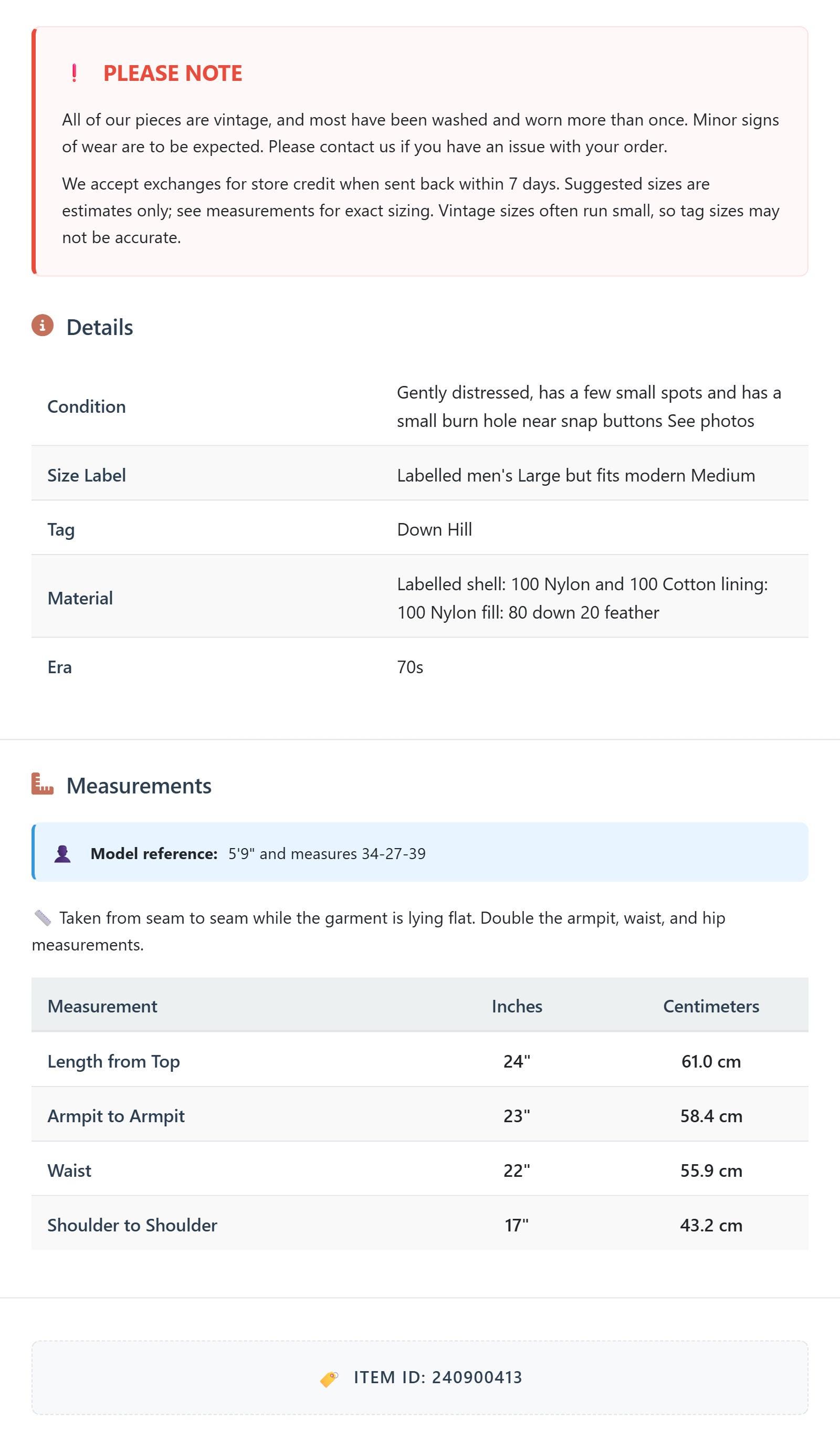All of our pieces are vintage, and most have been washed and worn more than once. Minor signs of wear are to be expected. Please contact us if you have an issue with your order. We accept exchanges for store credit when sent back within 7 days.