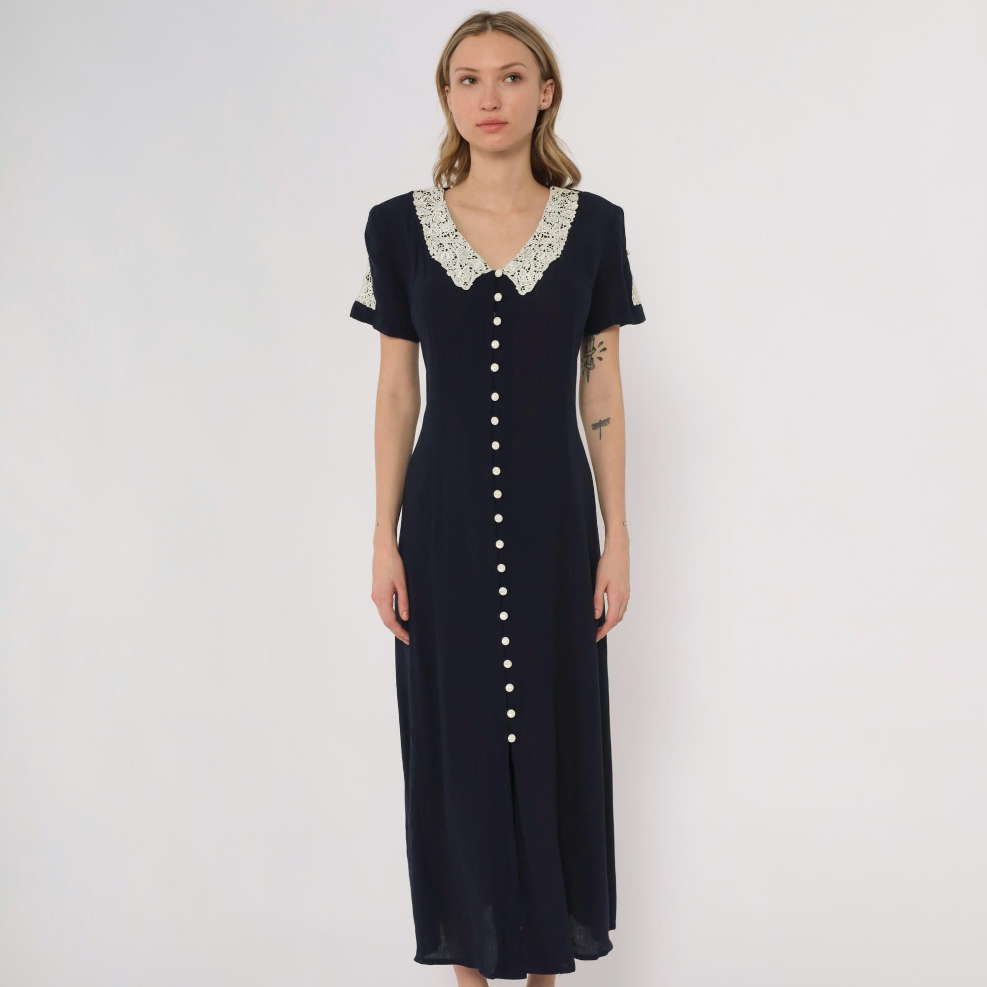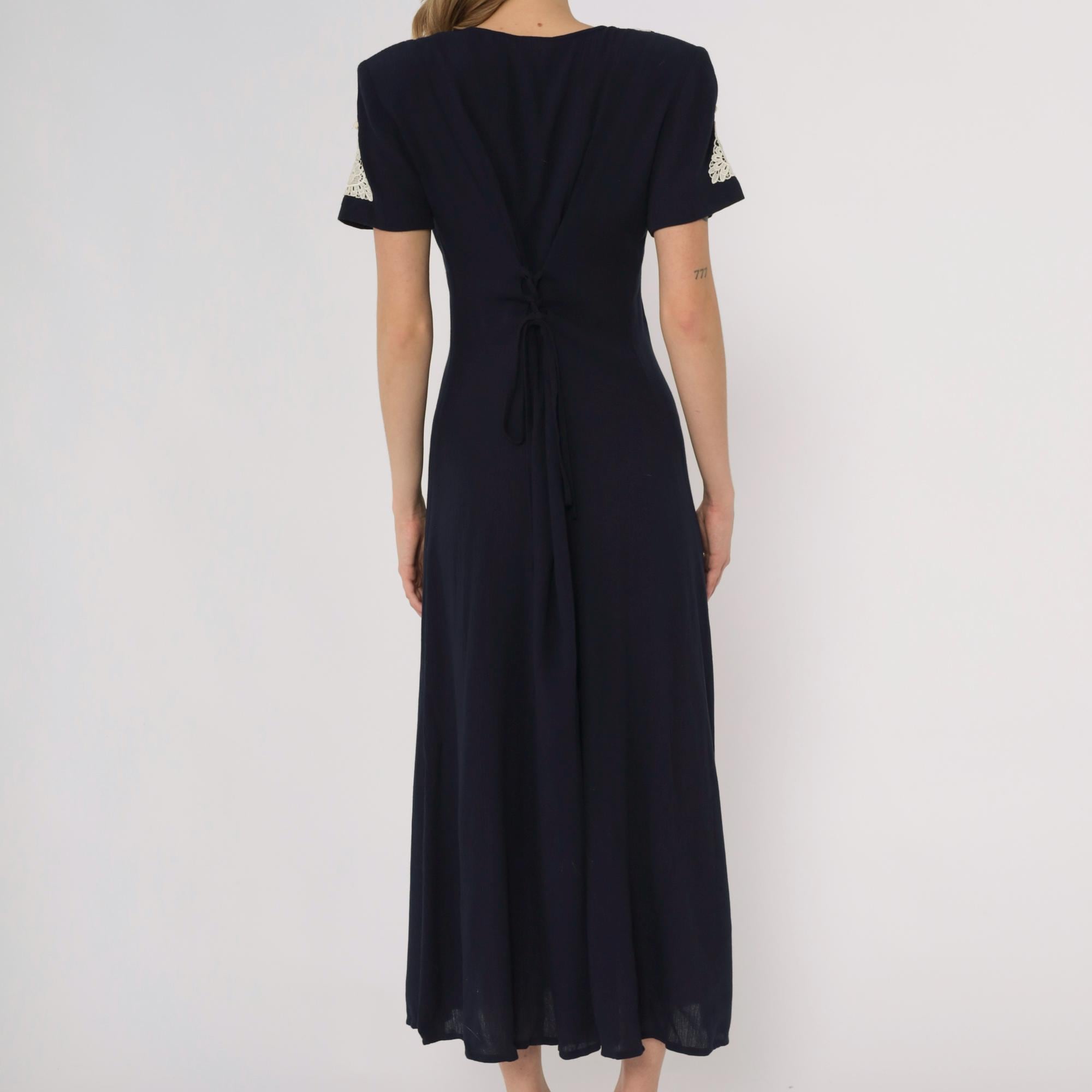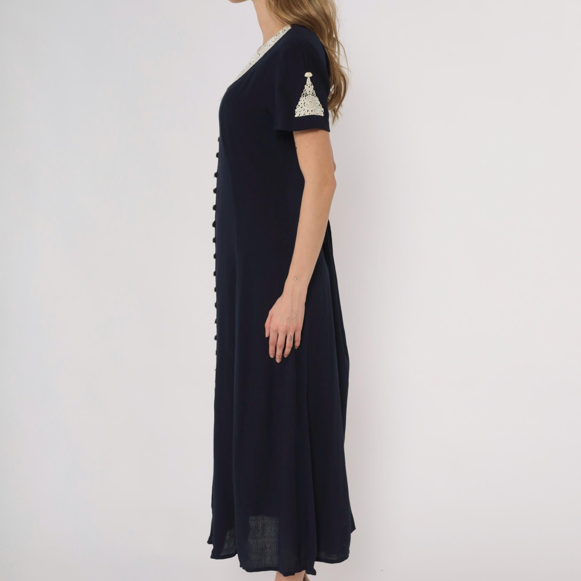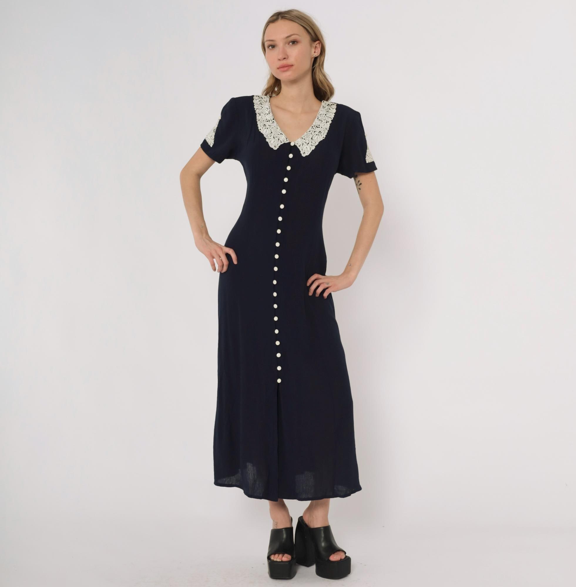 90s navy maxi dress by Fashion Bug. Features white lace collar with rose detail and matching sleeve trim. Full button front with small pearl-like buttons. Short sleeves. Tie back detail.