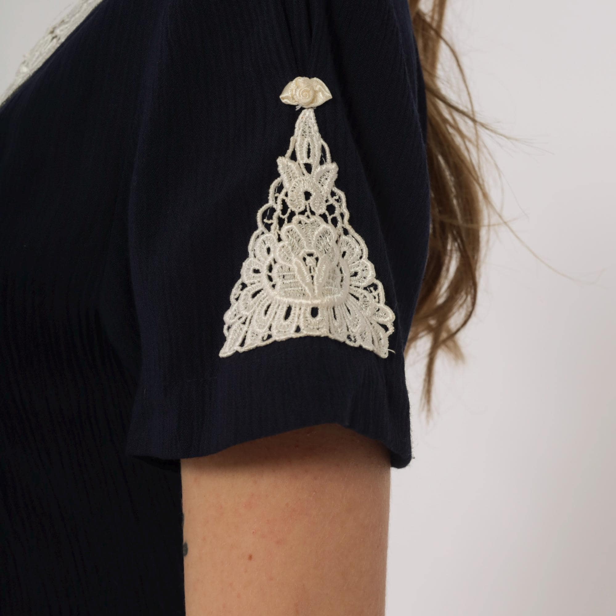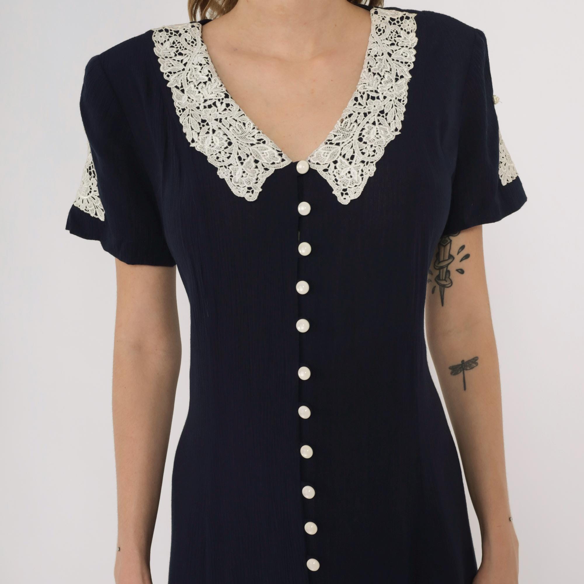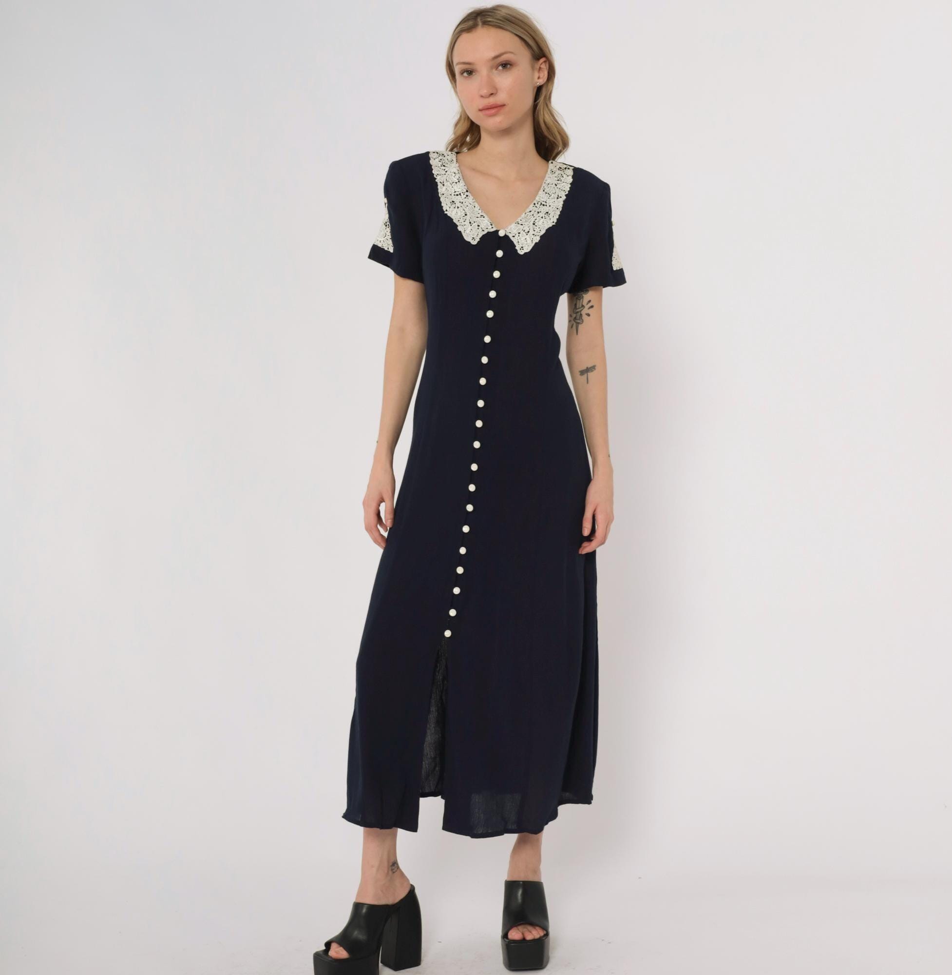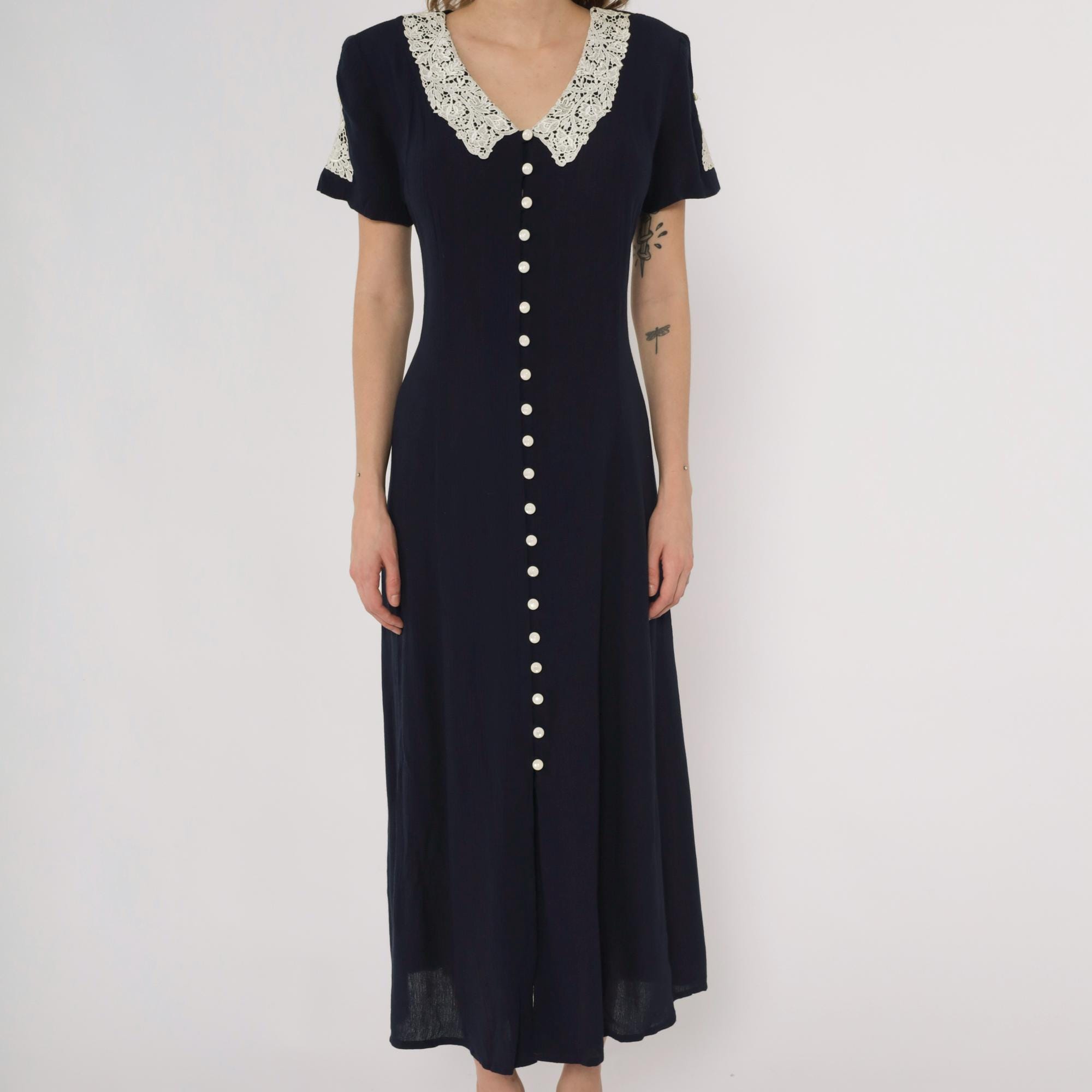 90s navy maxi dress by Fashion Bug. Features white lace collar with rose detail and matching sleeve trim. Full button front with small pearl-like buttons. Short sleeves. Tie back detail.