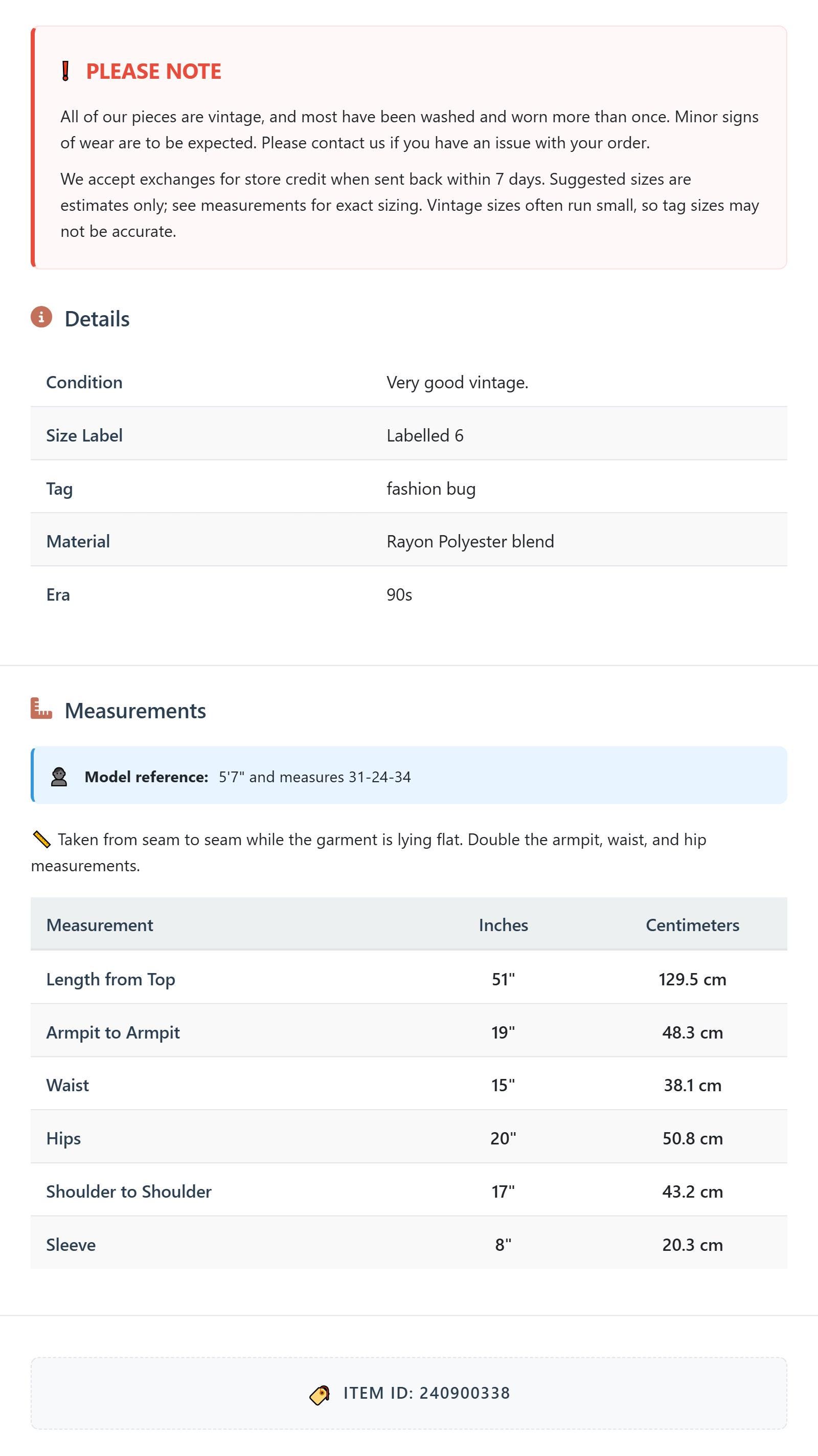 All of our pieces are vintage, and most have been washed and worn more than once. Minor signs of wear are to be expected. Please contact us if you have an issue with your order. We accept exchanges for store credit when sent back within 7 days.