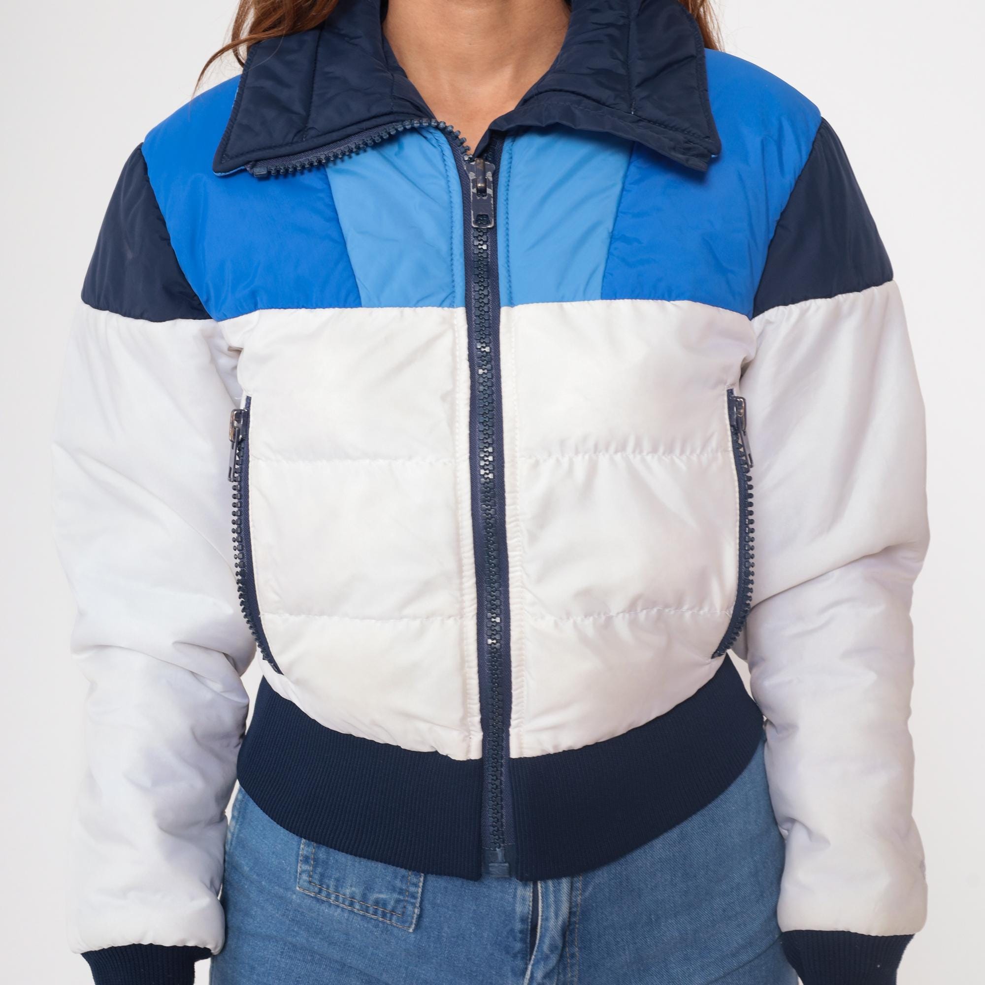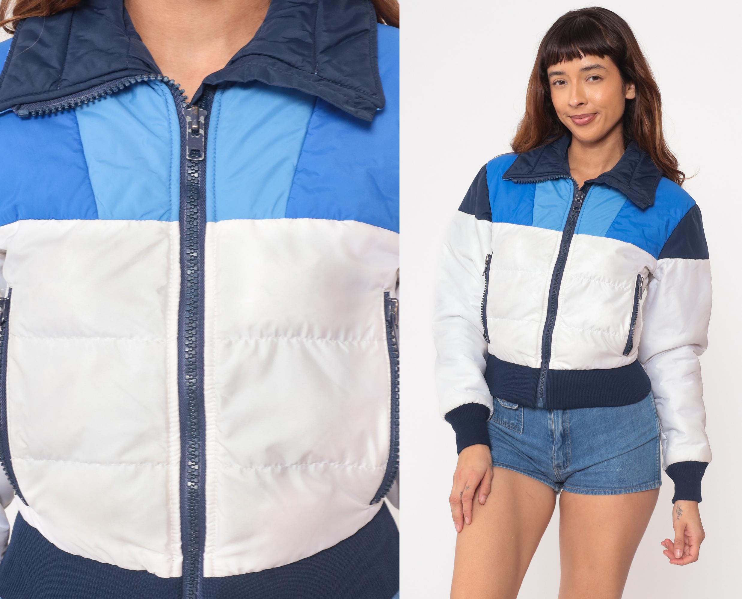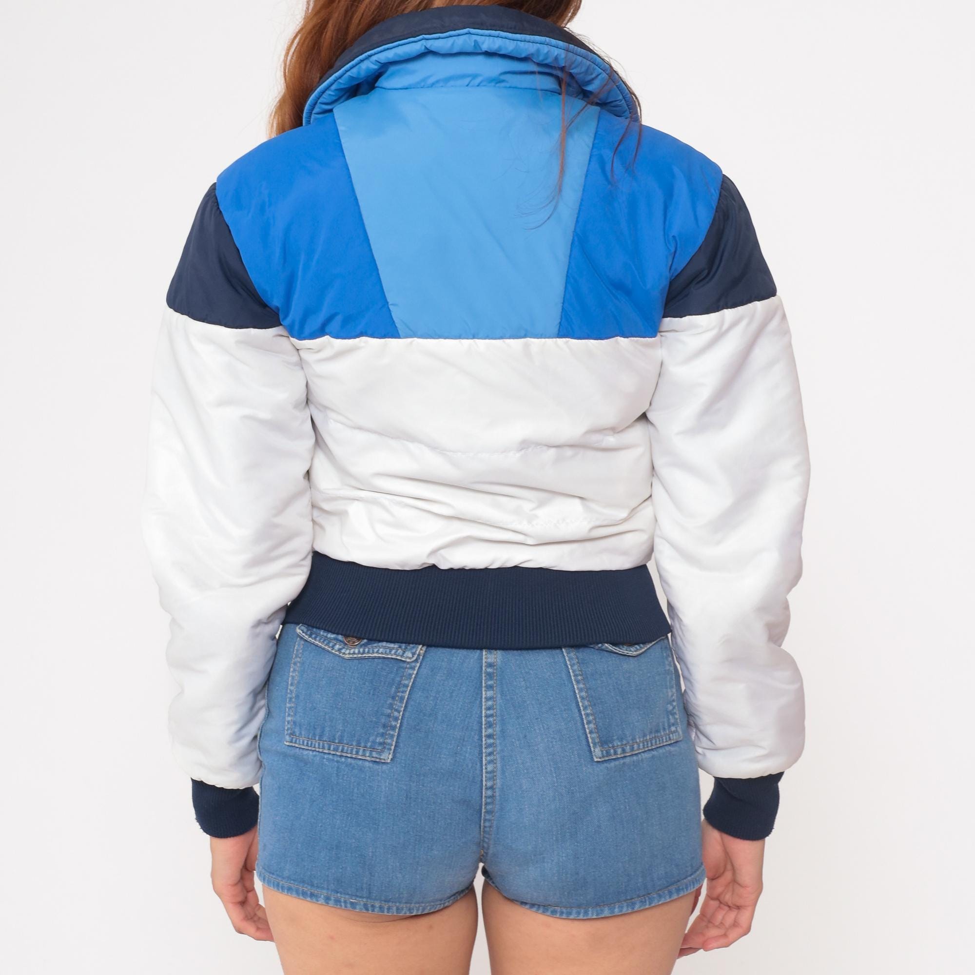70s ski jacket from Roffe Skiwear, made in USA. Features color block design in navy blue, light blue, and white. Cropped length with ribbed navy hem and cuffs. Front zip closure with two zippered side pockets. Quilted puffer construction with navy collar.