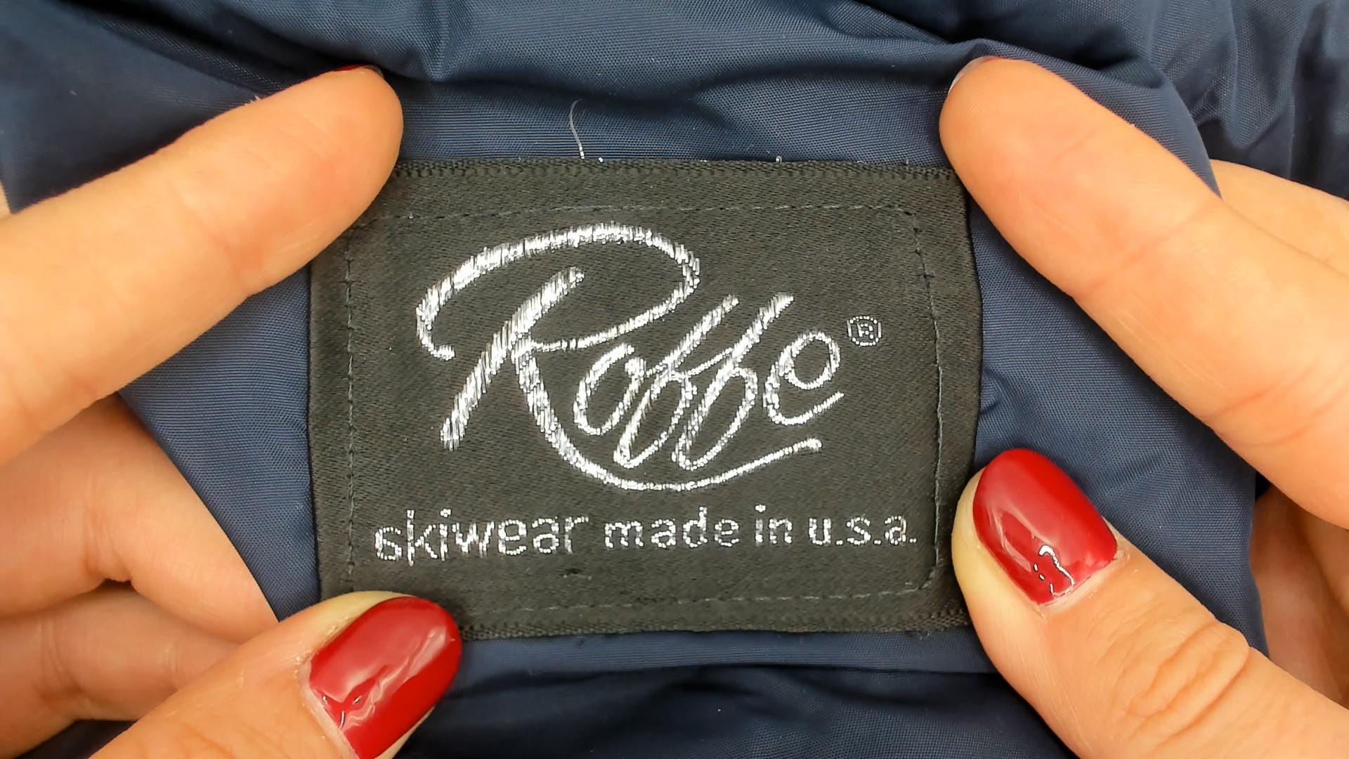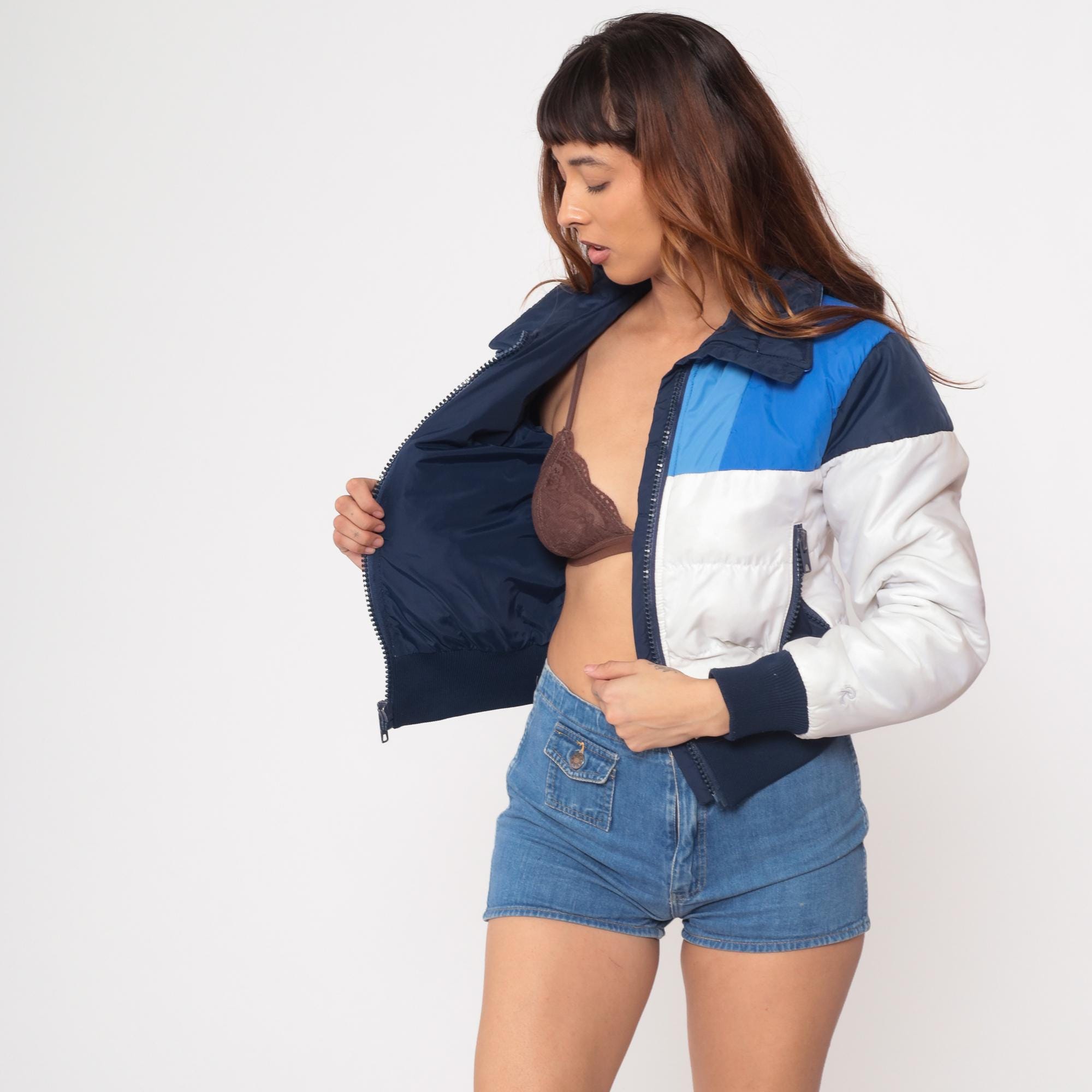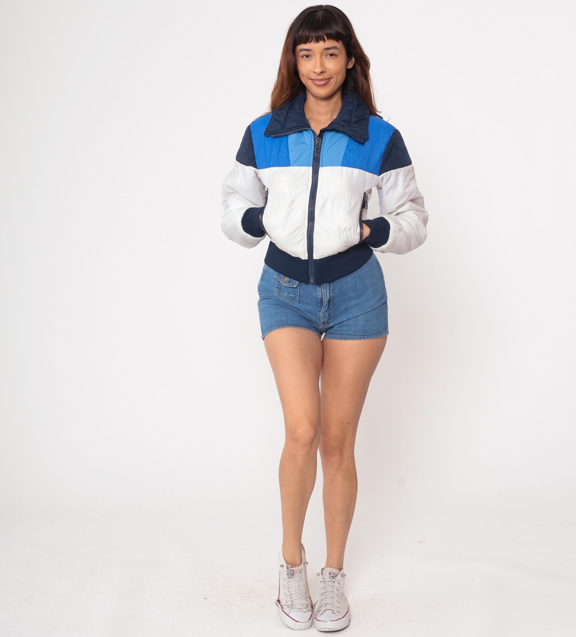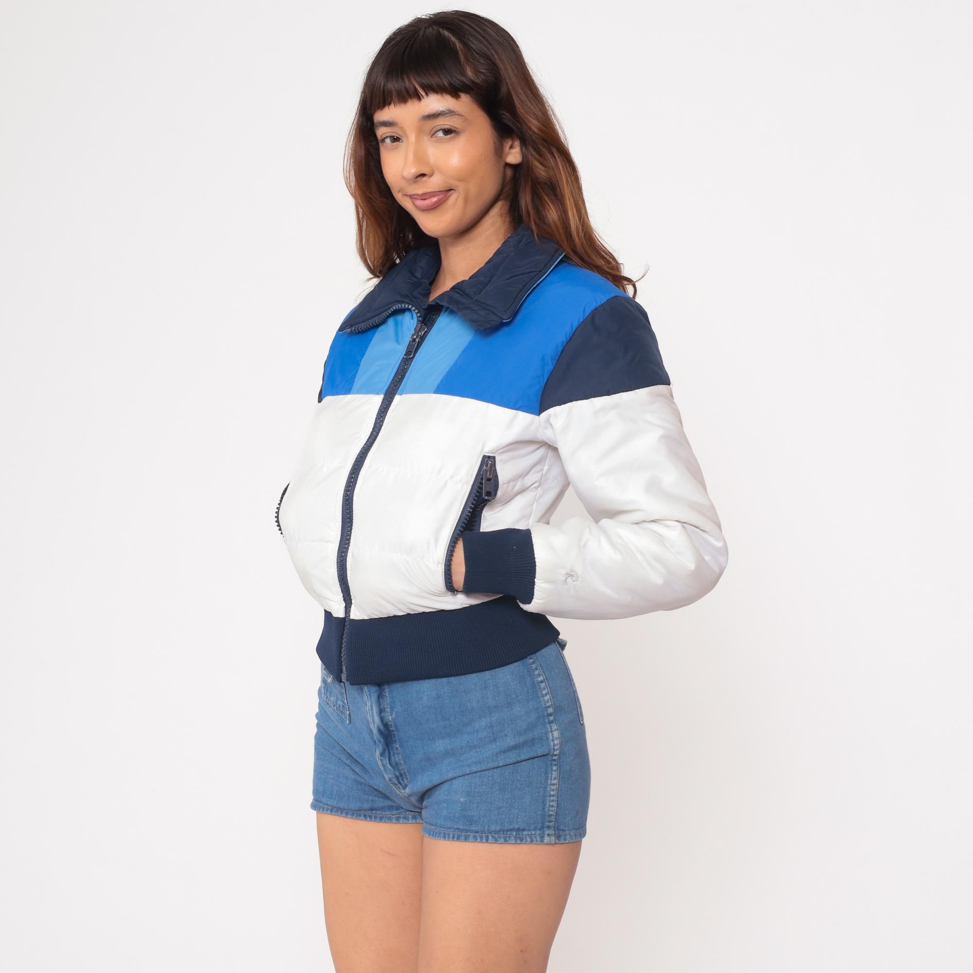 70s ski jacket from Roffe Skiwear, made in USA. Features color block design in navy blue, light blue, and white. Cropped length with ribbed navy hem and cuffs. Front zip closure with two zippered side pockets. Quilted puffer construction with navy collar.