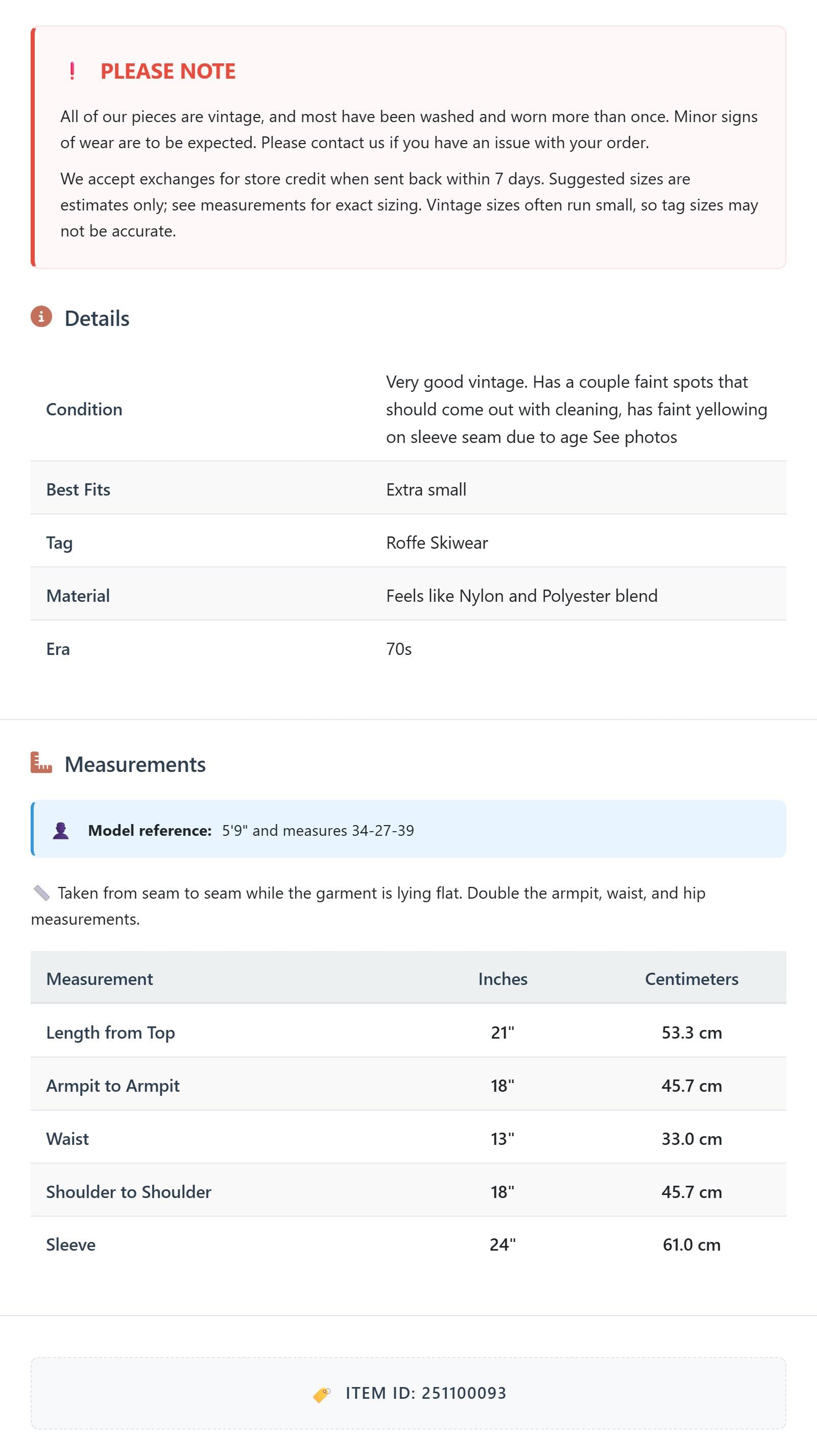 All of our pieces are vintage, and most have been washed and worn more than once. Minor signs of wear are to be expected. Please contact us if you have an issue with your order. We accept exchanges for store credit when sent back within 7 days.