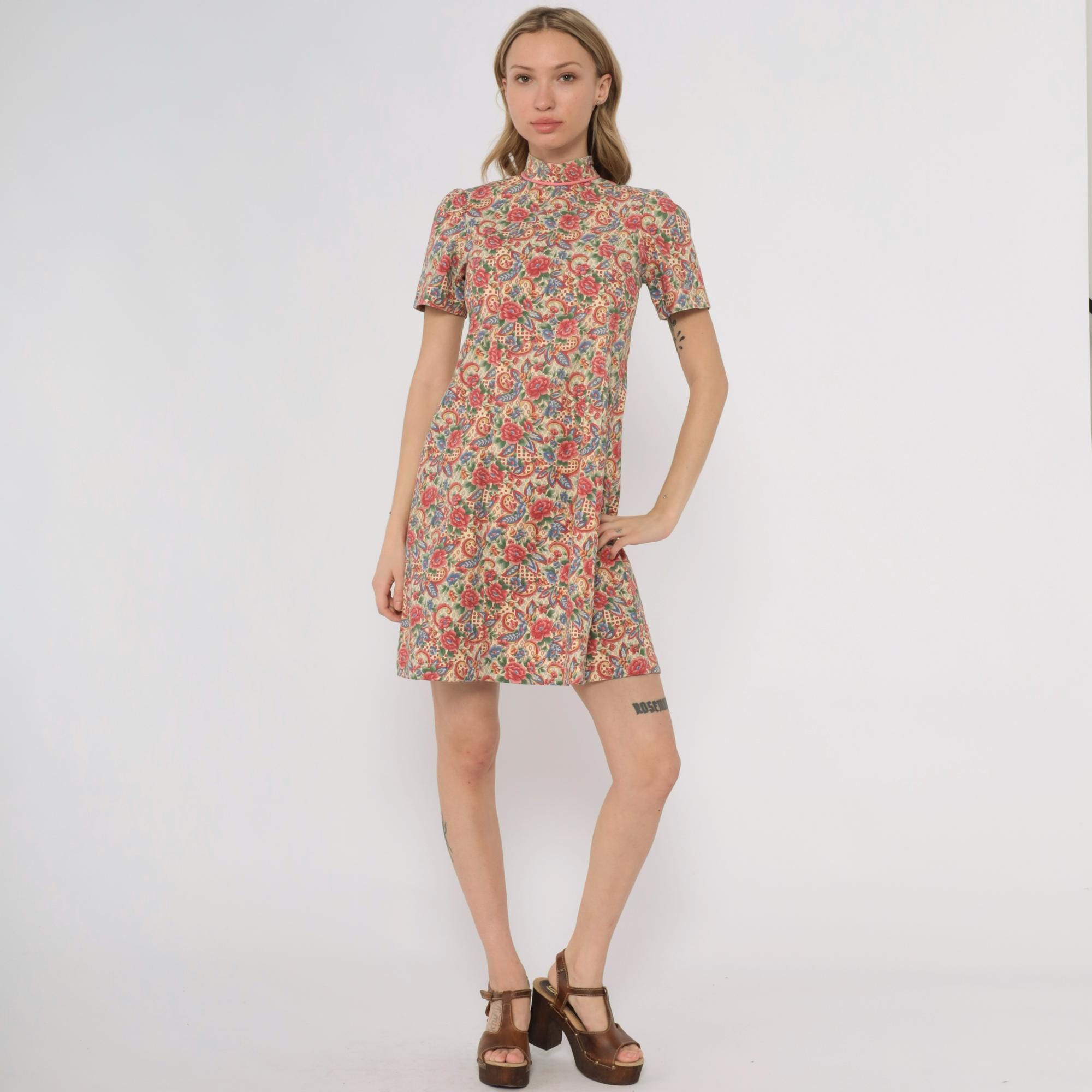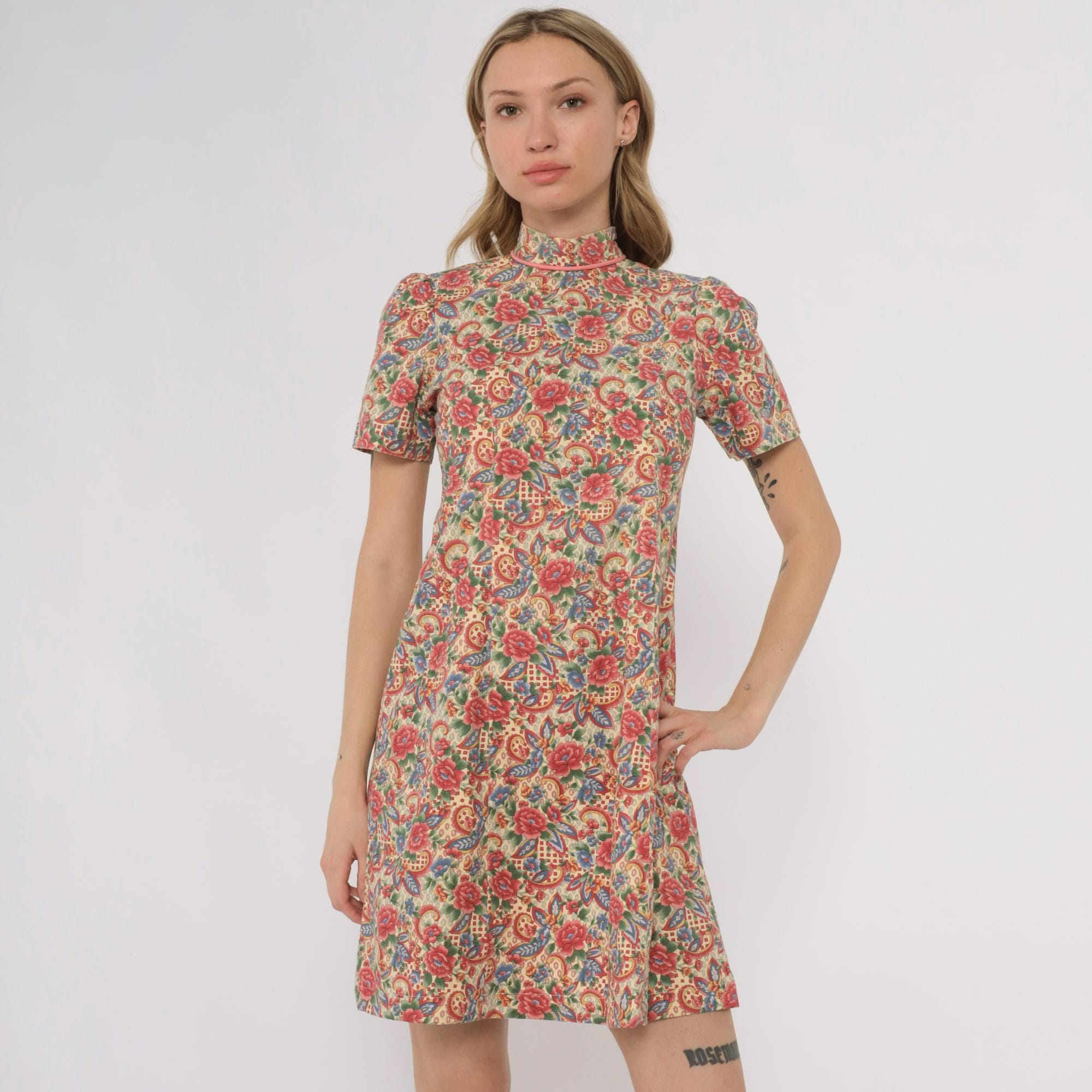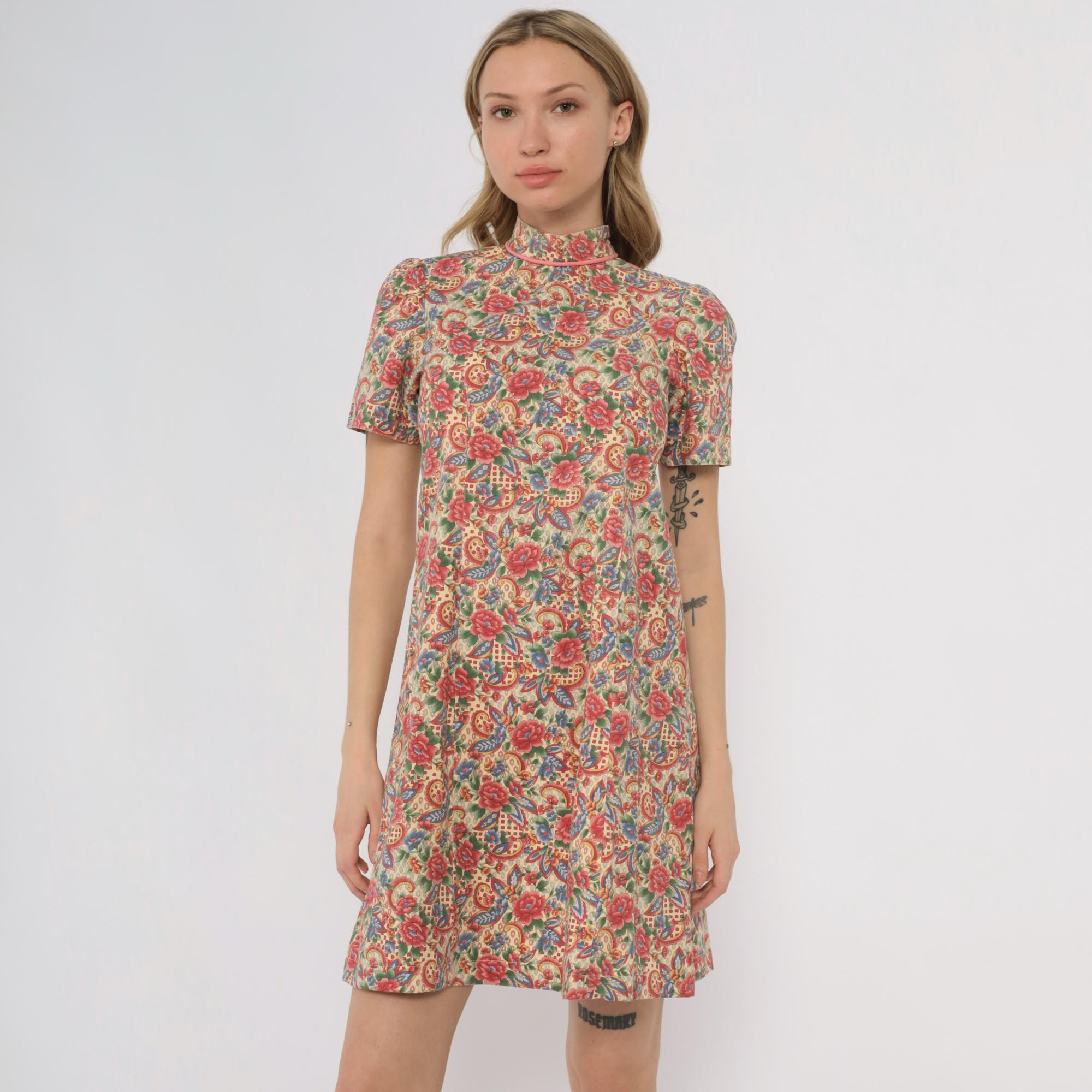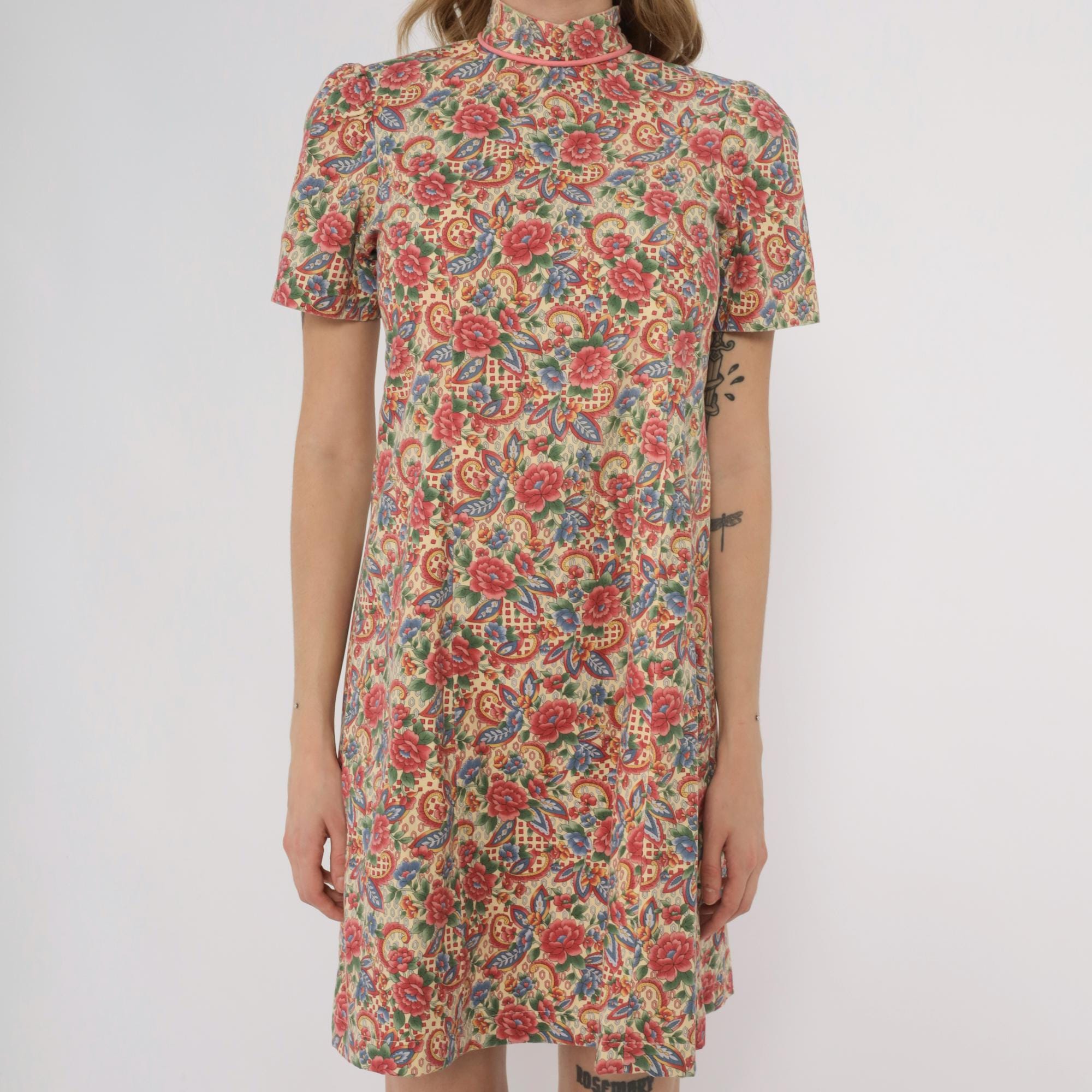 70s floral paisley print dress custom made by Meej. Features colorful red, blue, and green flower pattern on cream background. Mock neck with short sleeves. A-line silhouette with midi length.