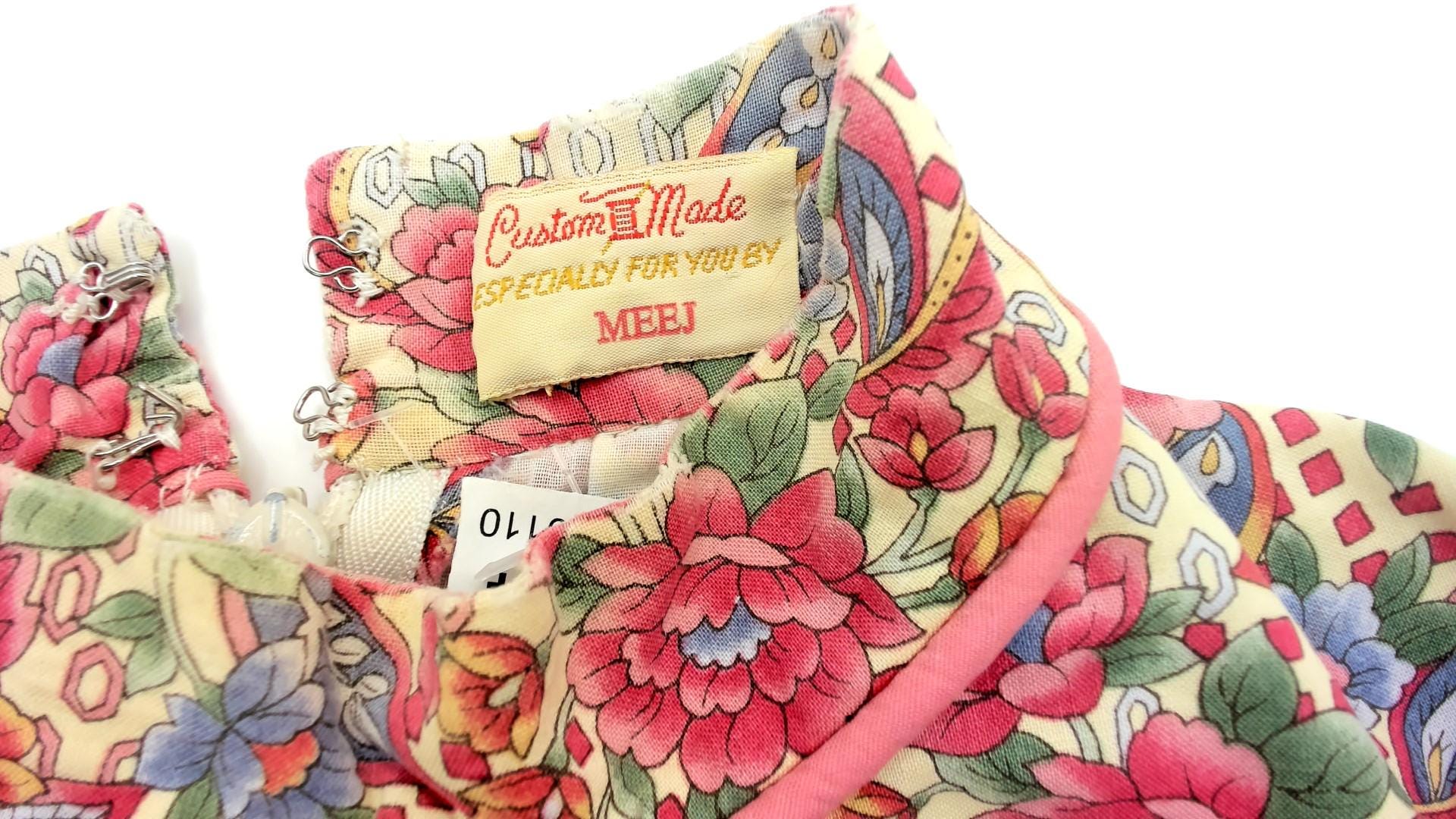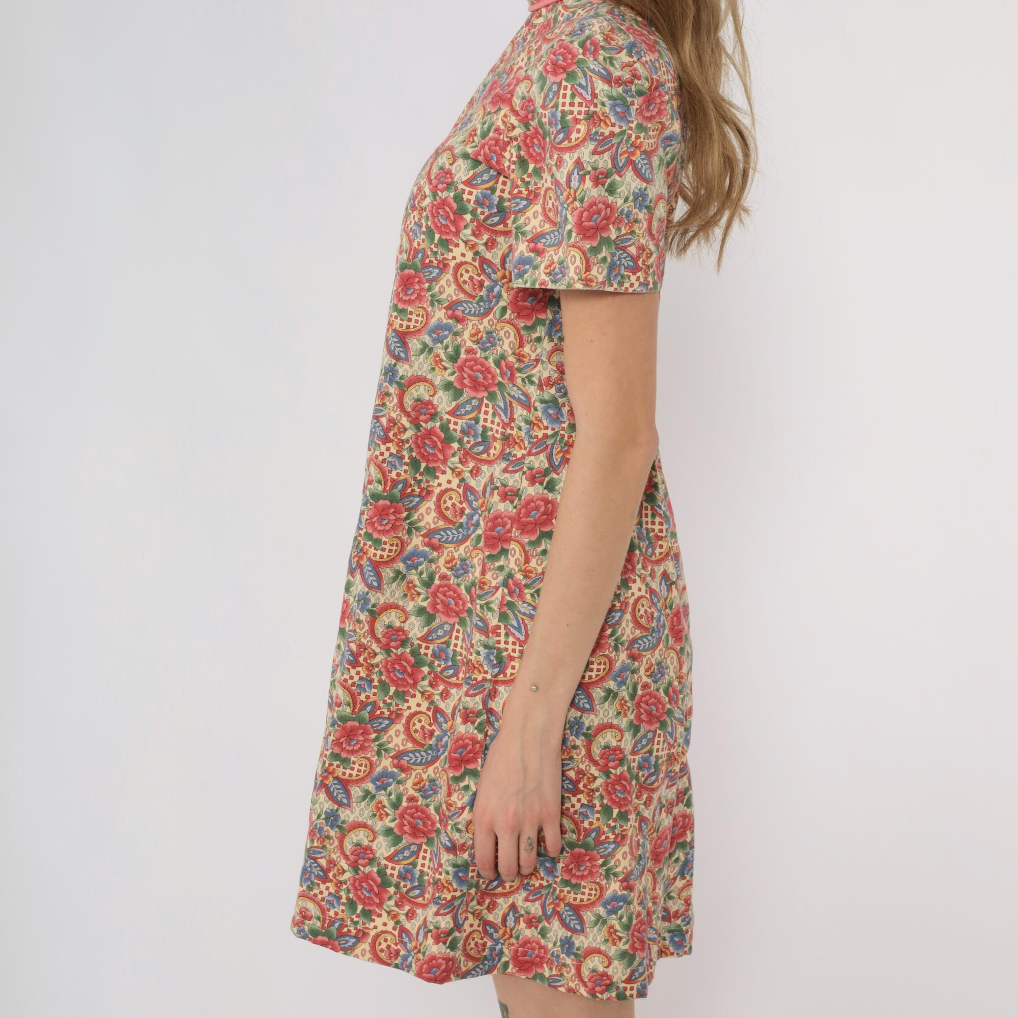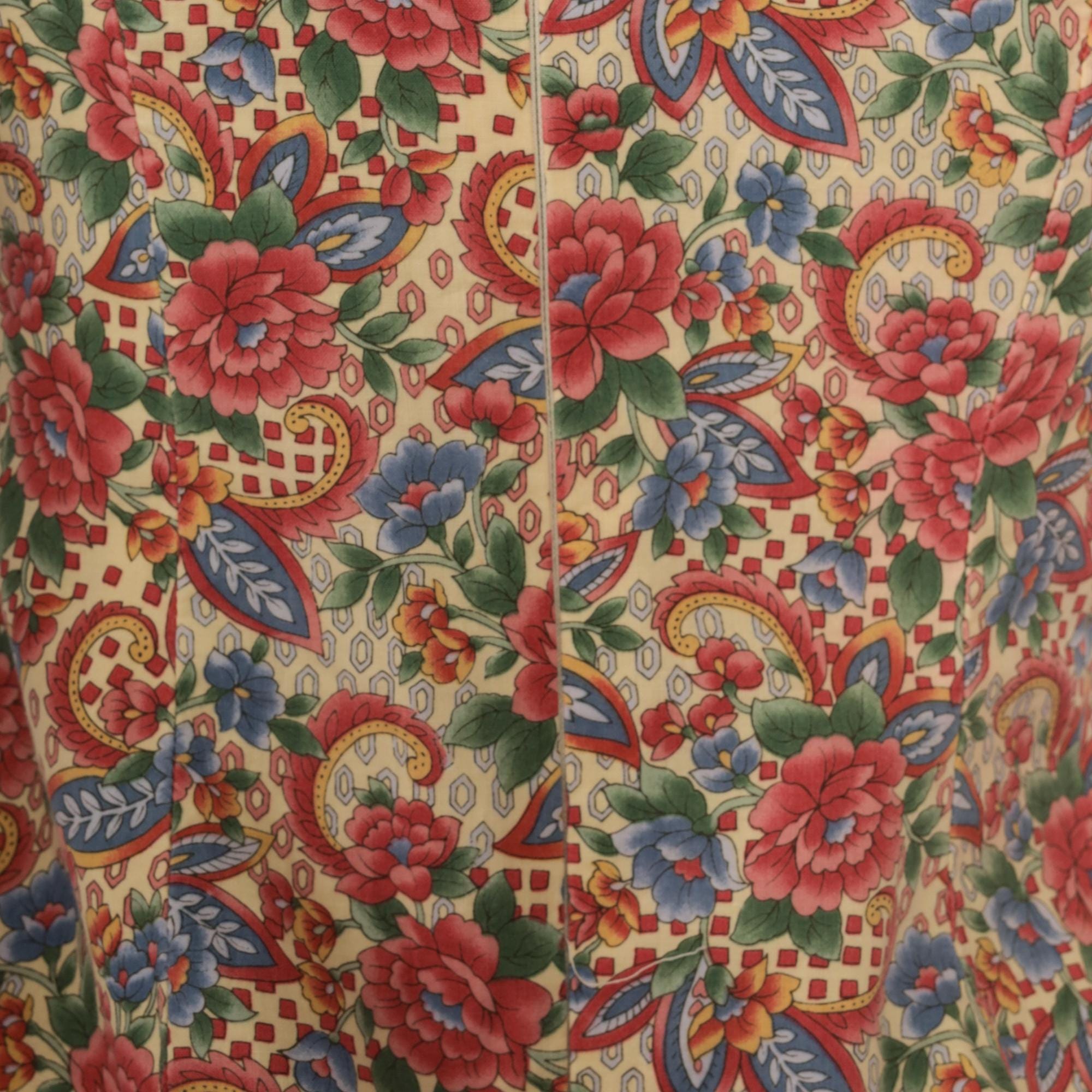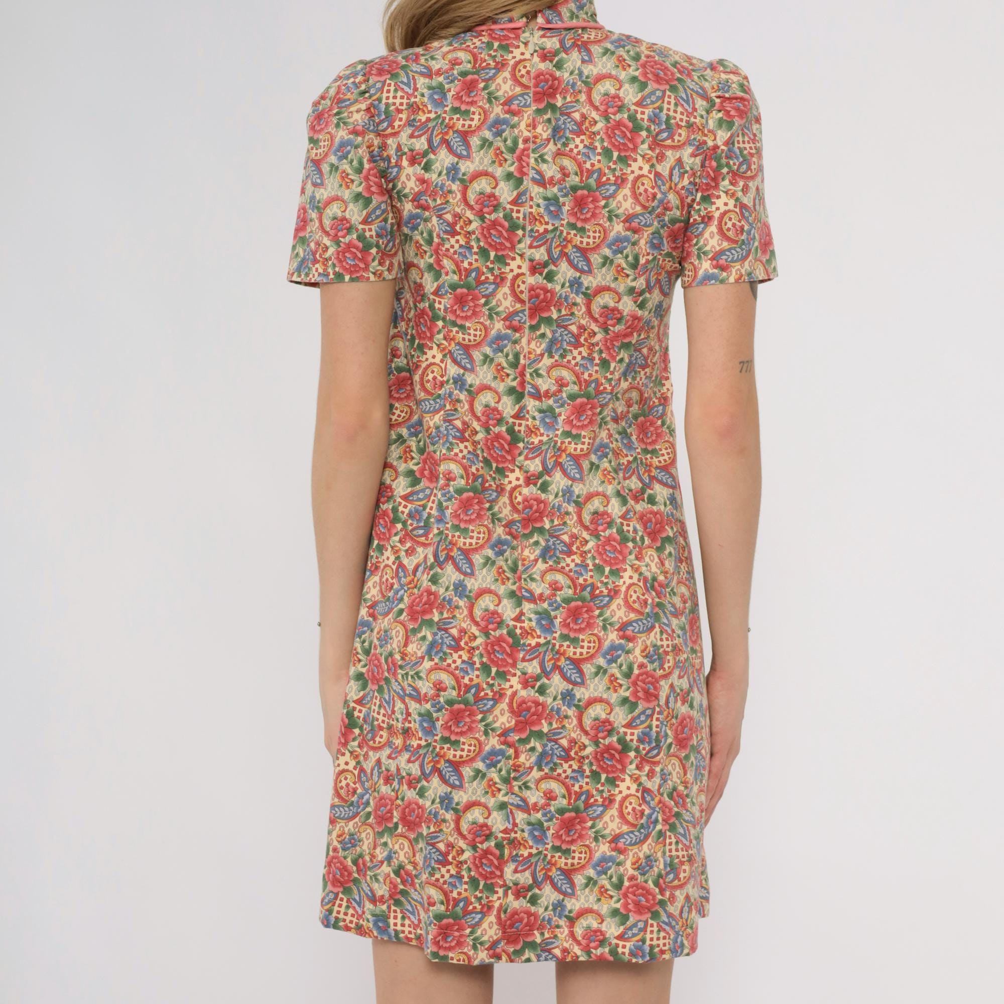 70s floral paisley print dress custom made by Meej. Features colorful red, blue, and green flower pattern on cream background. Mock neck with short sleeves. A-line silhouette with midi length.