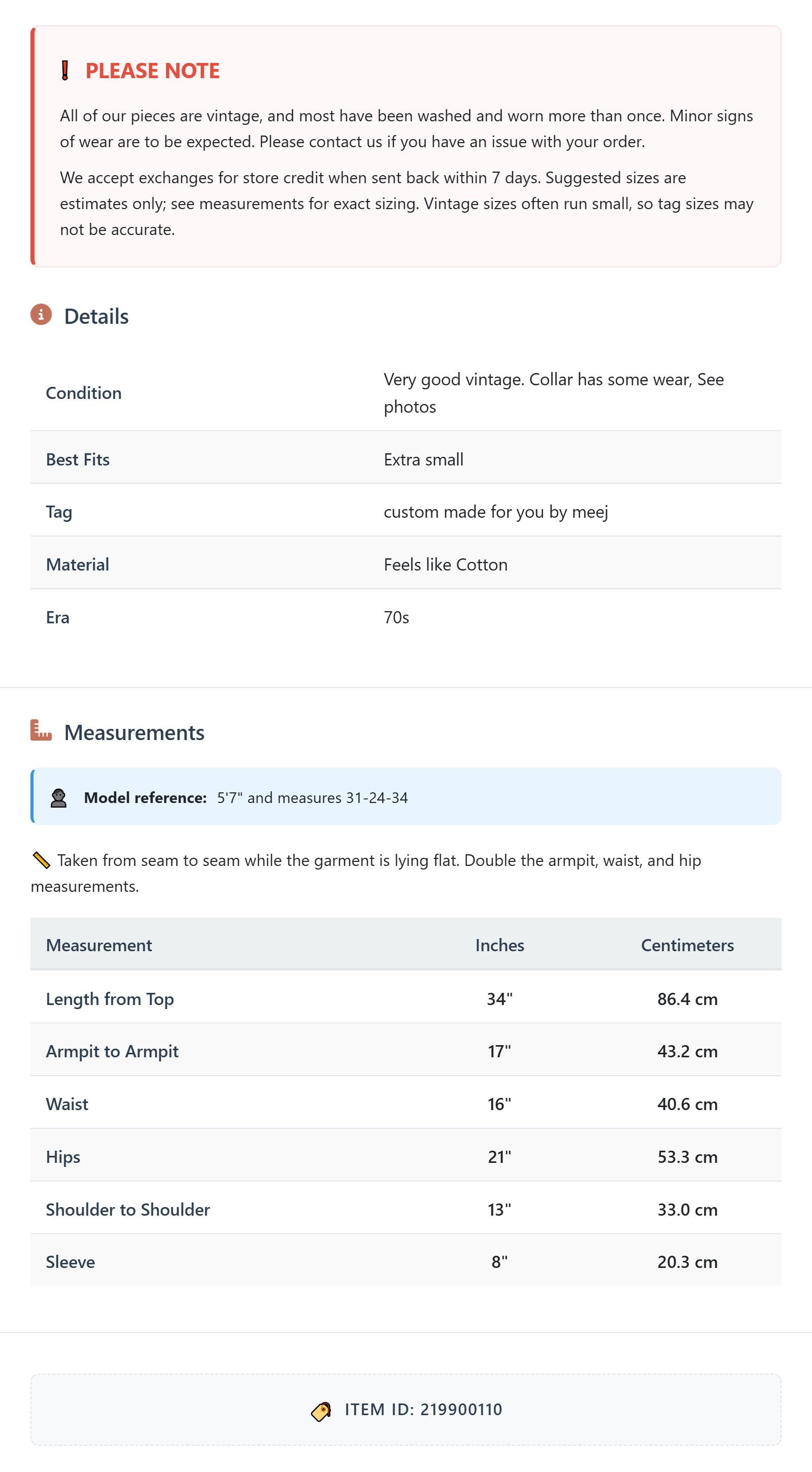 All of our pieces are vintage, and most have been washed and worn more than once. Minor signs of wear are to be expected. Please contact us if you have an issue with your order. We accept exchanges for store credit when sent back within 7 days.