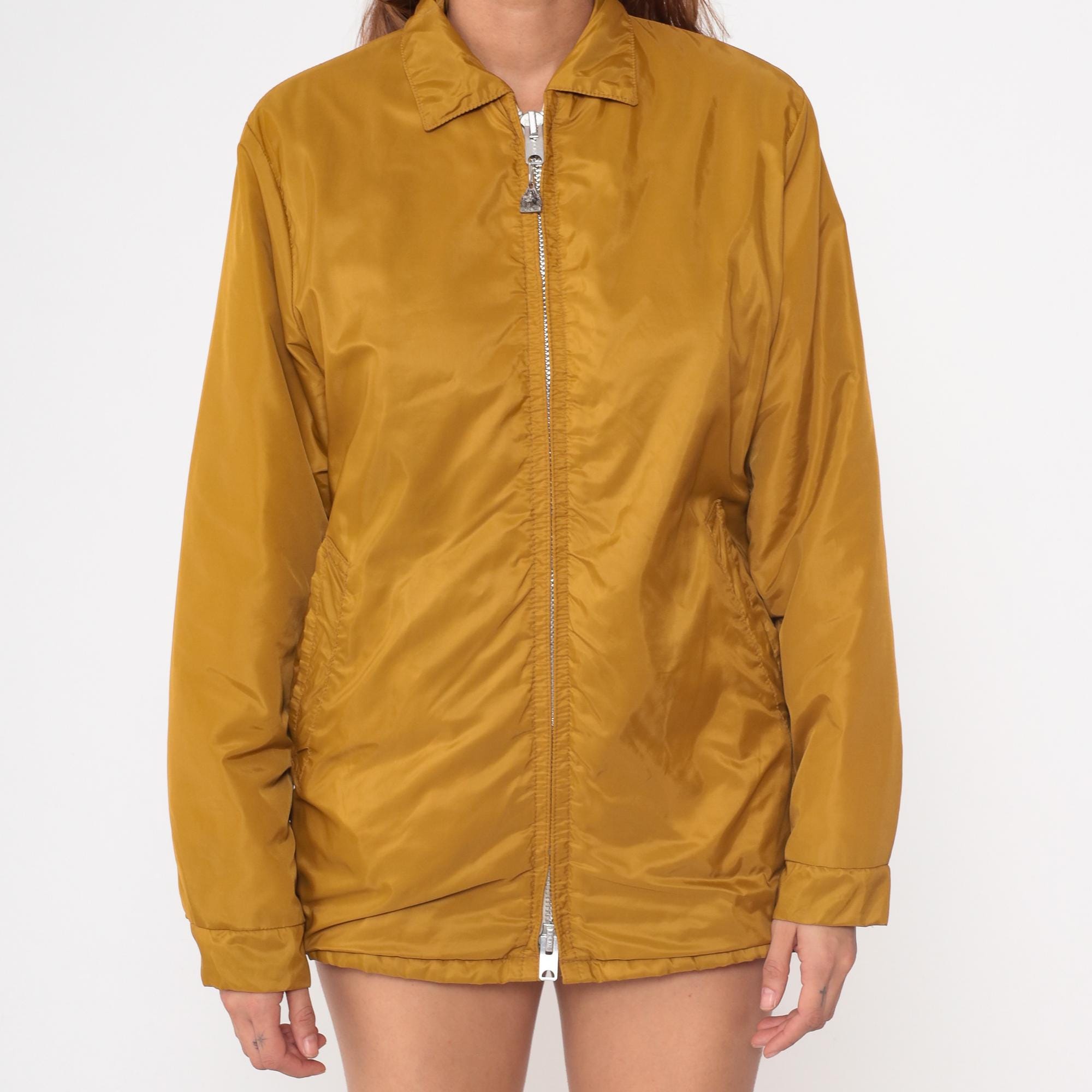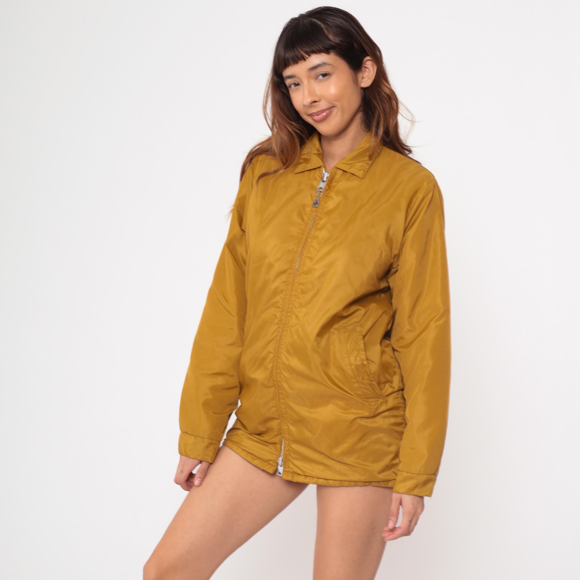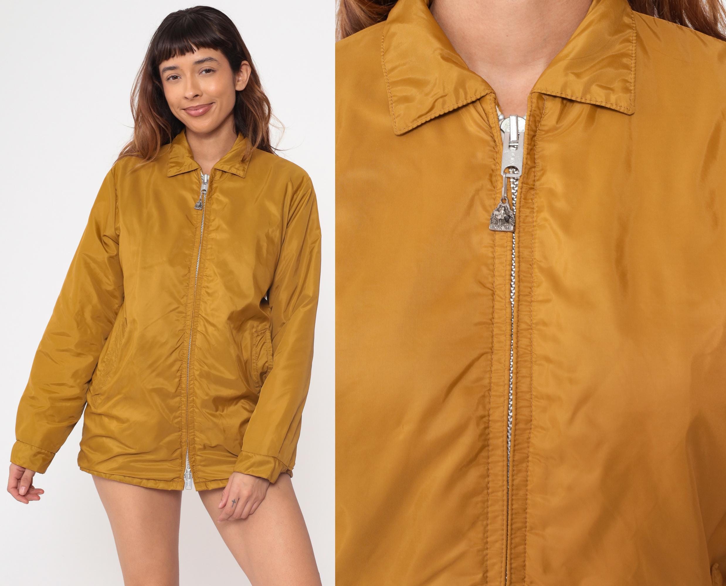 70s mustard yellow windbreaker jacket from Pacific Trail Sportswear. Features a classic zip front with metal zipper pull, pointed collar, and two side pockets.