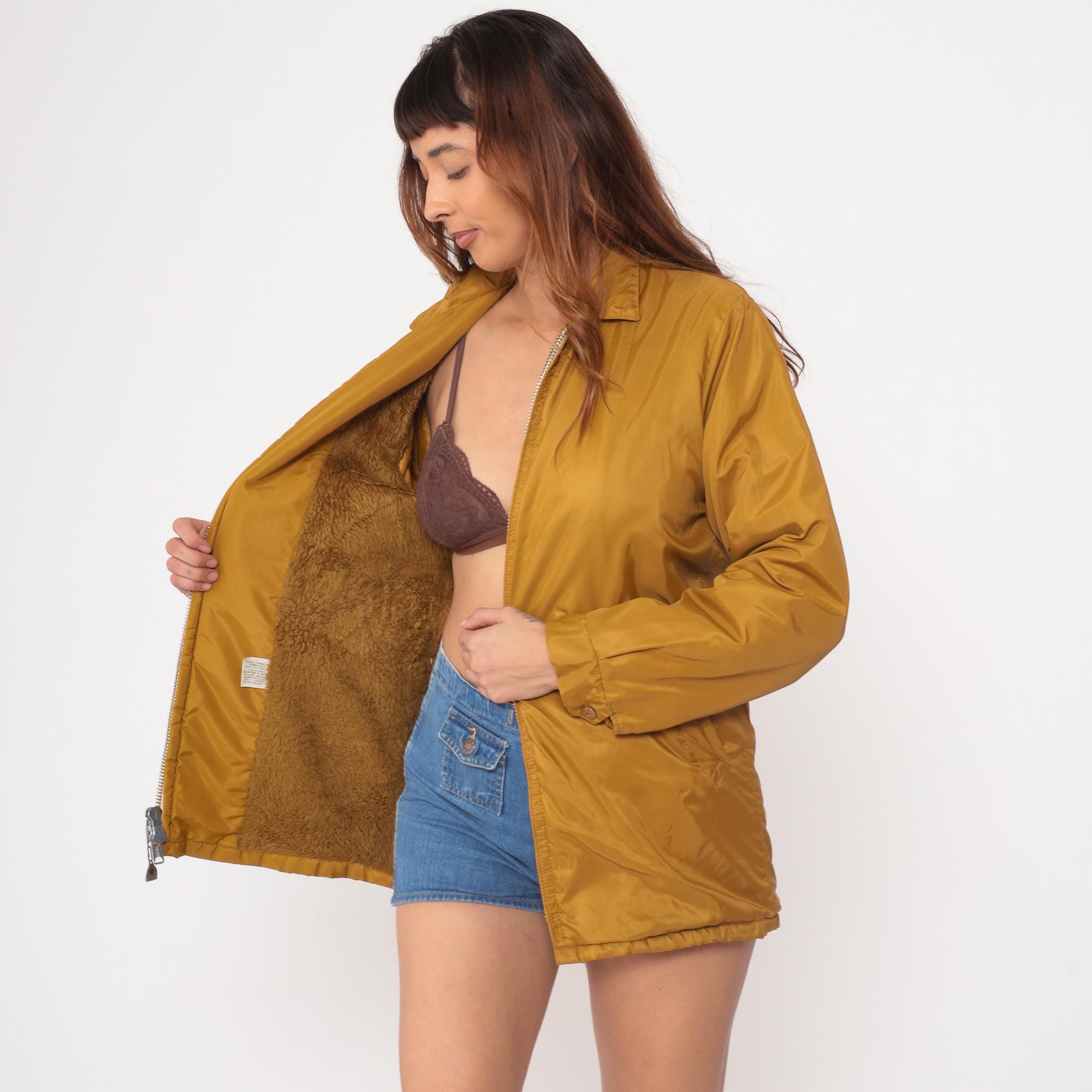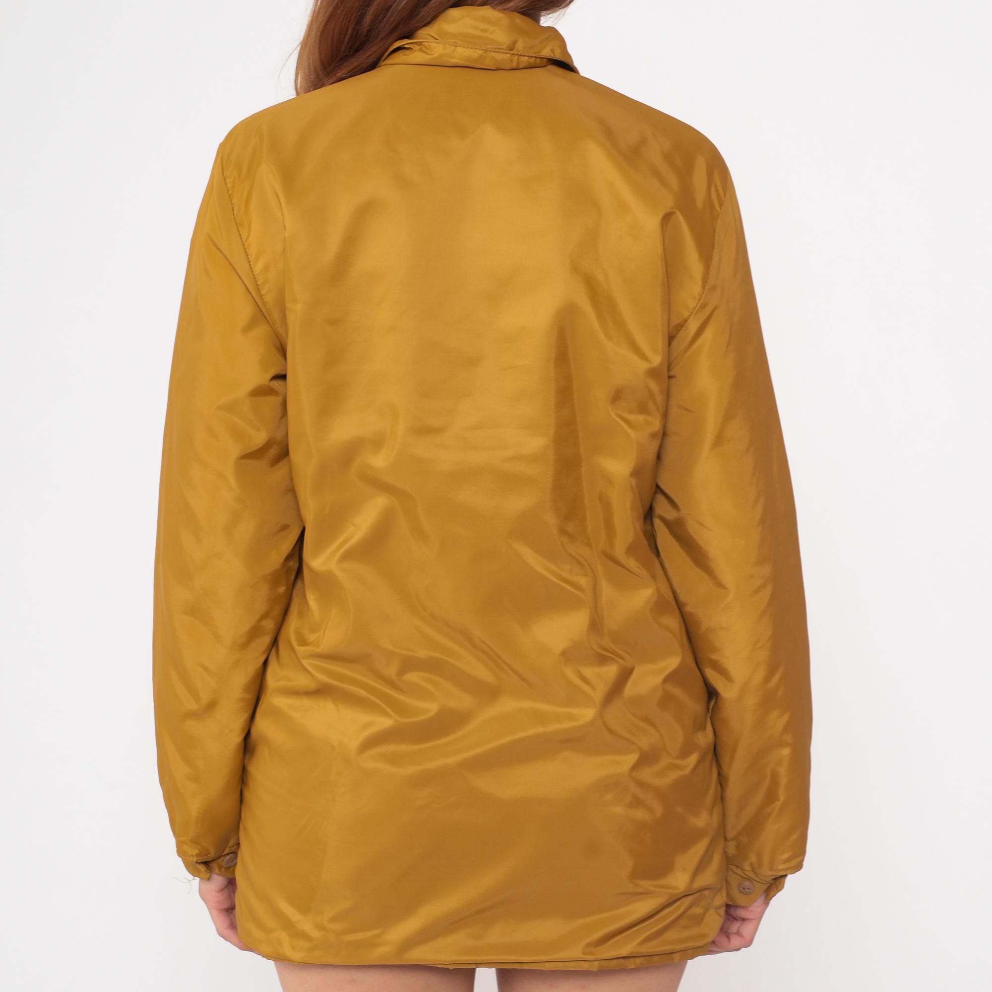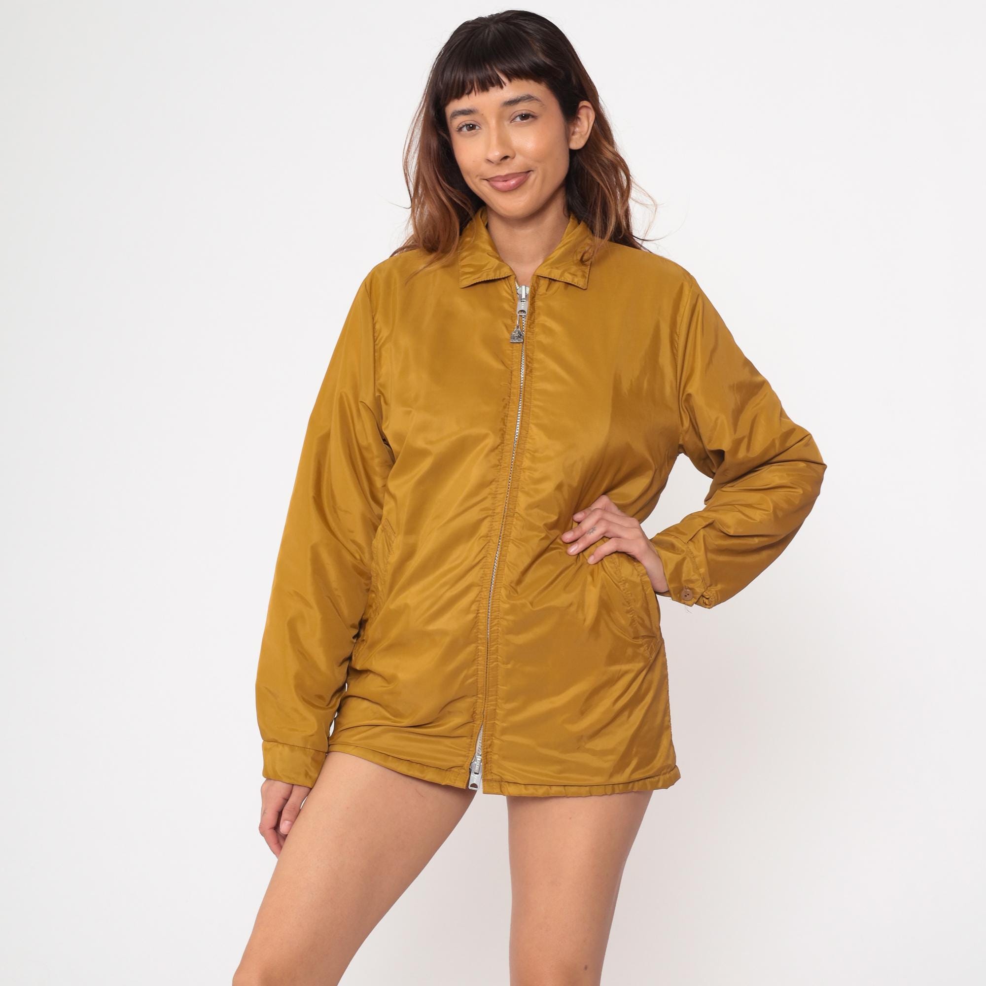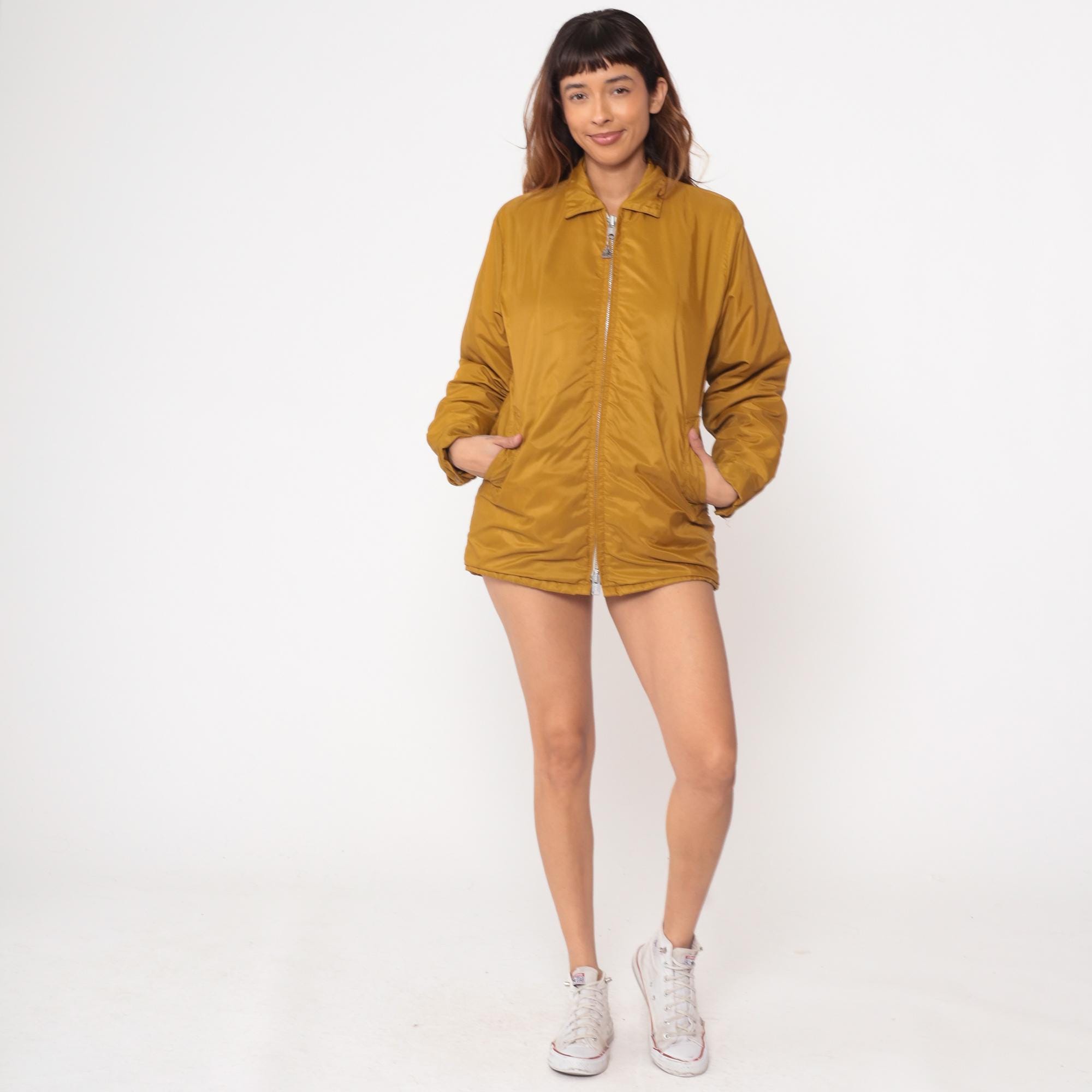 70s mustard yellow windbreaker jacket from Pacific Trail Sportswear. Features a classic zip front with metal zipper pull, pointed collar, and two side pockets.
