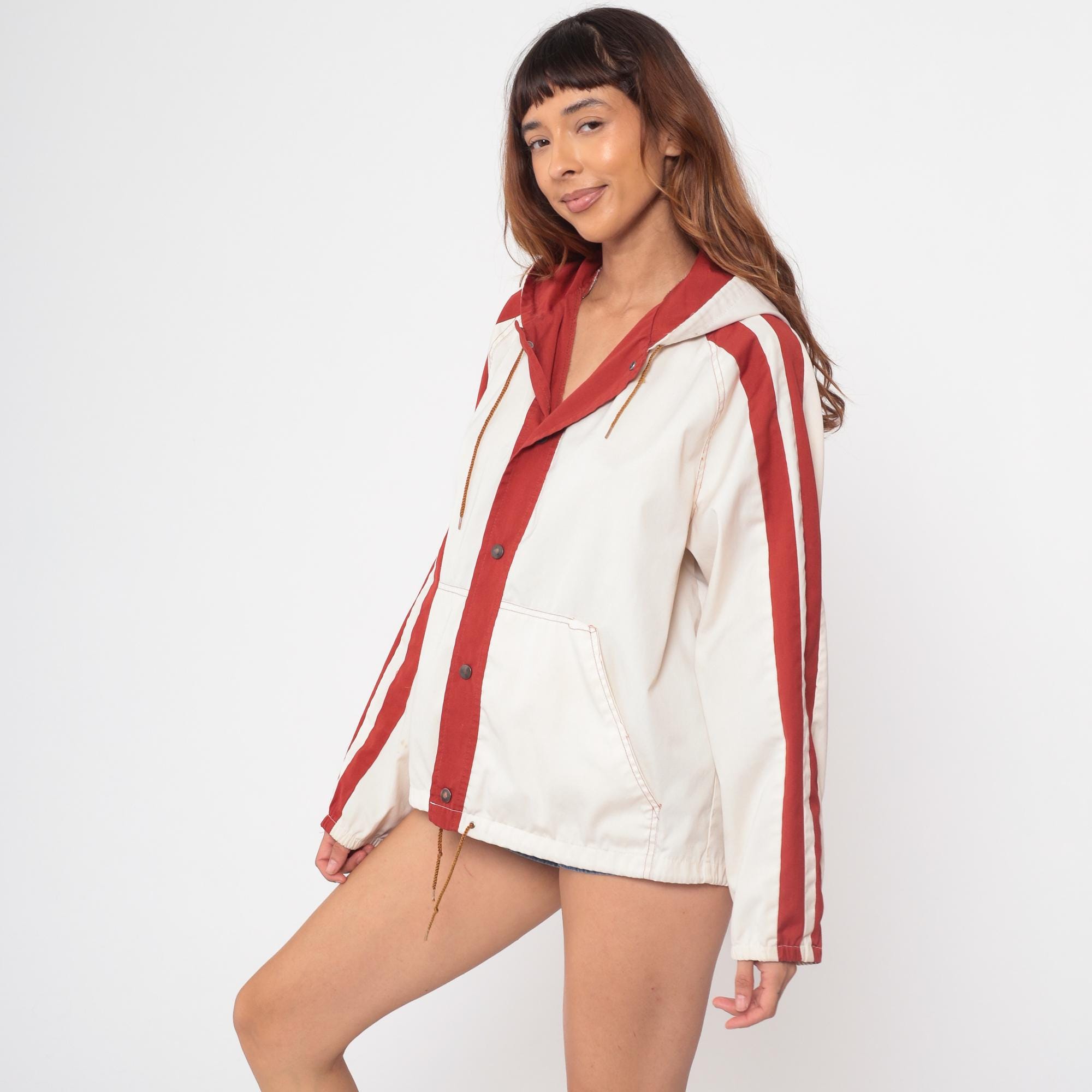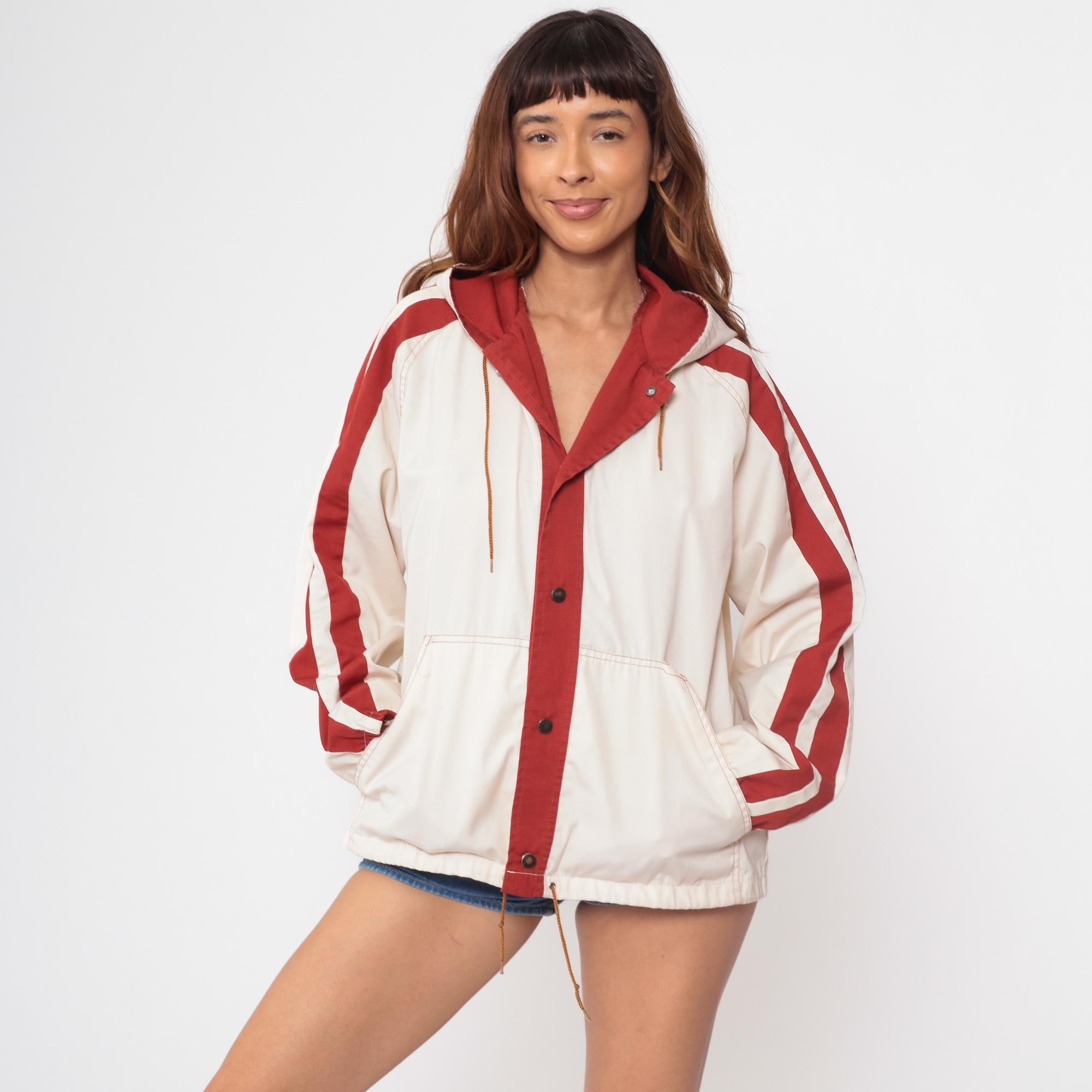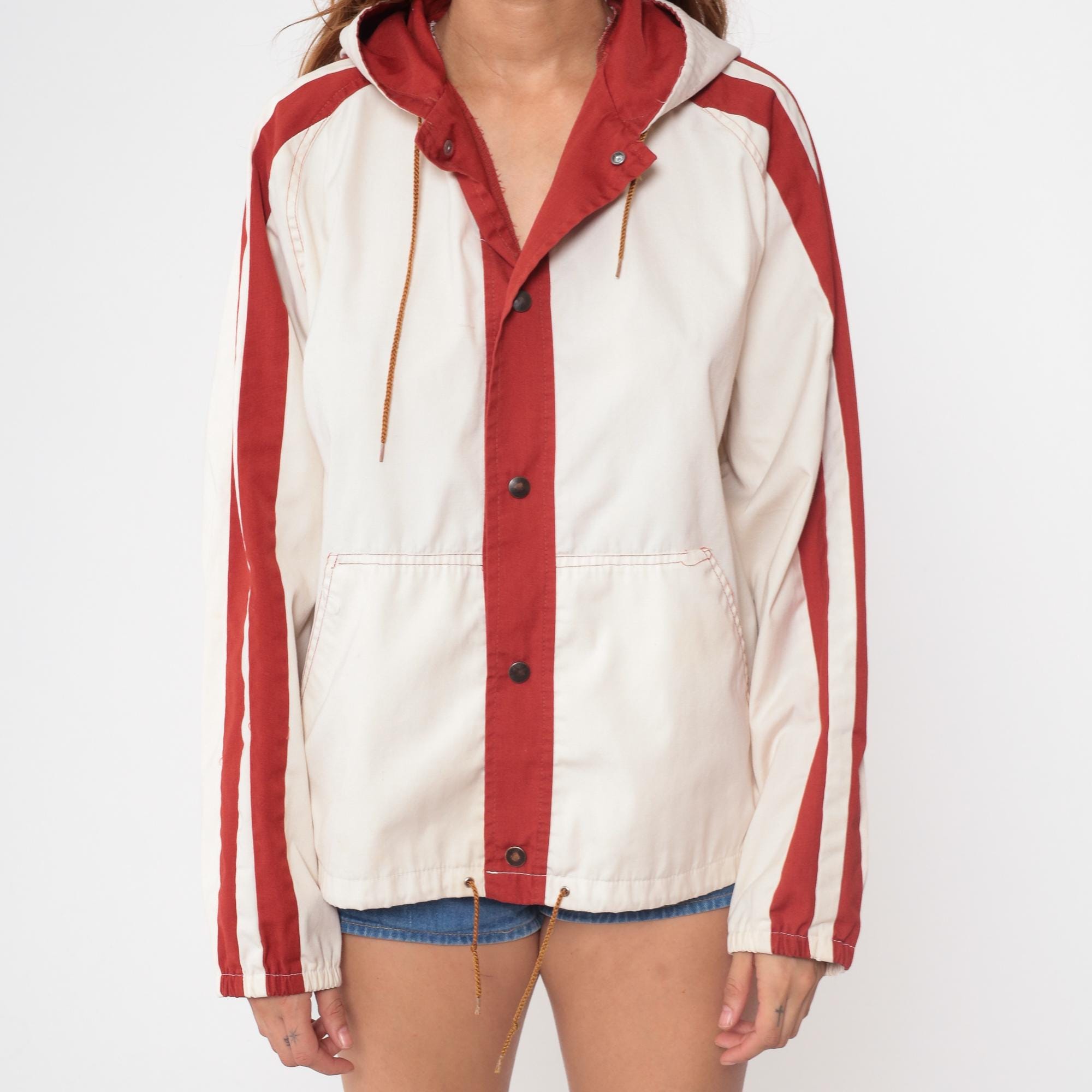 70s windbreaker from Montgomery Ward featuring eye-catching red and white color blocking with racing stripe detailing on sleeves. Hooded design with drawstring adjustment and snap front closure.