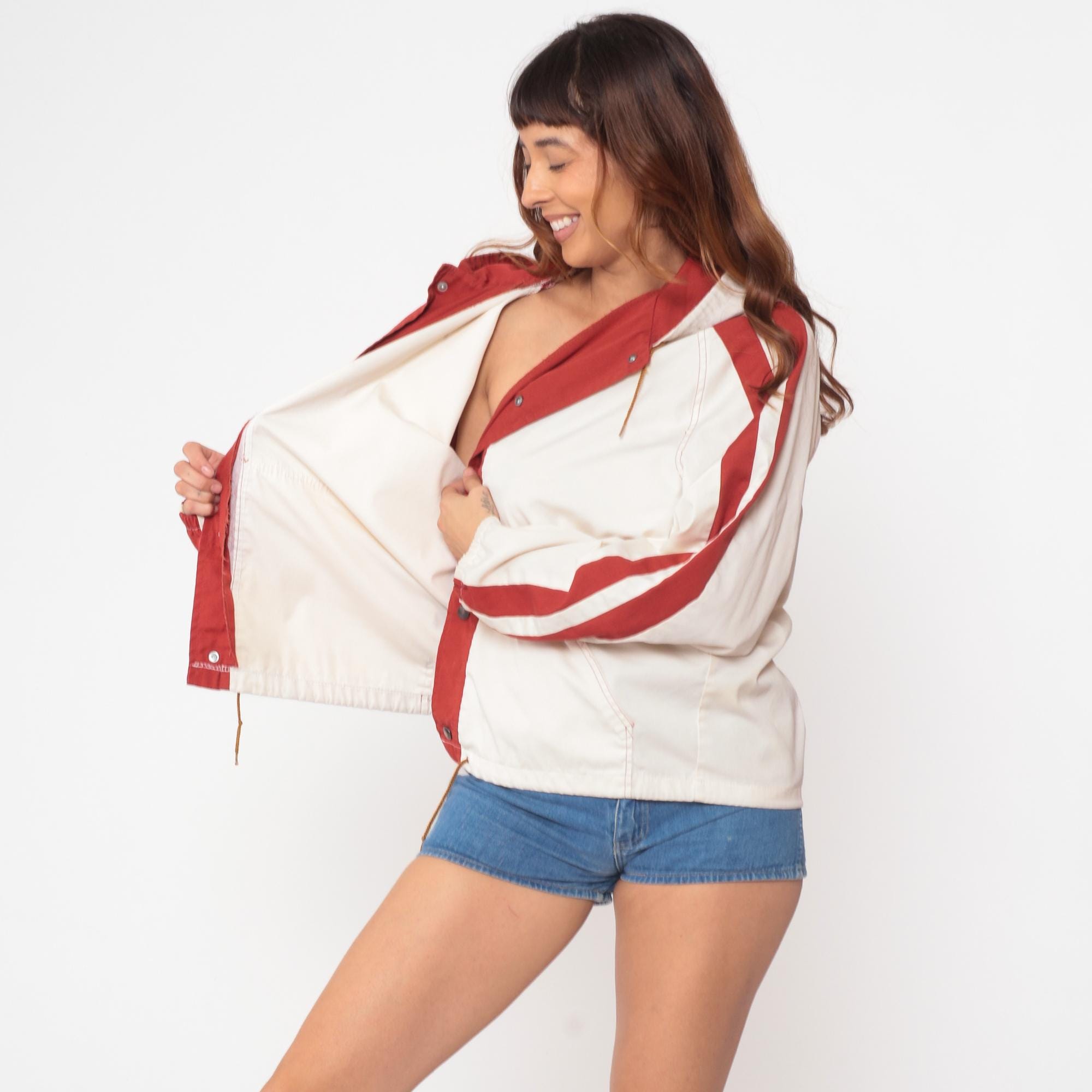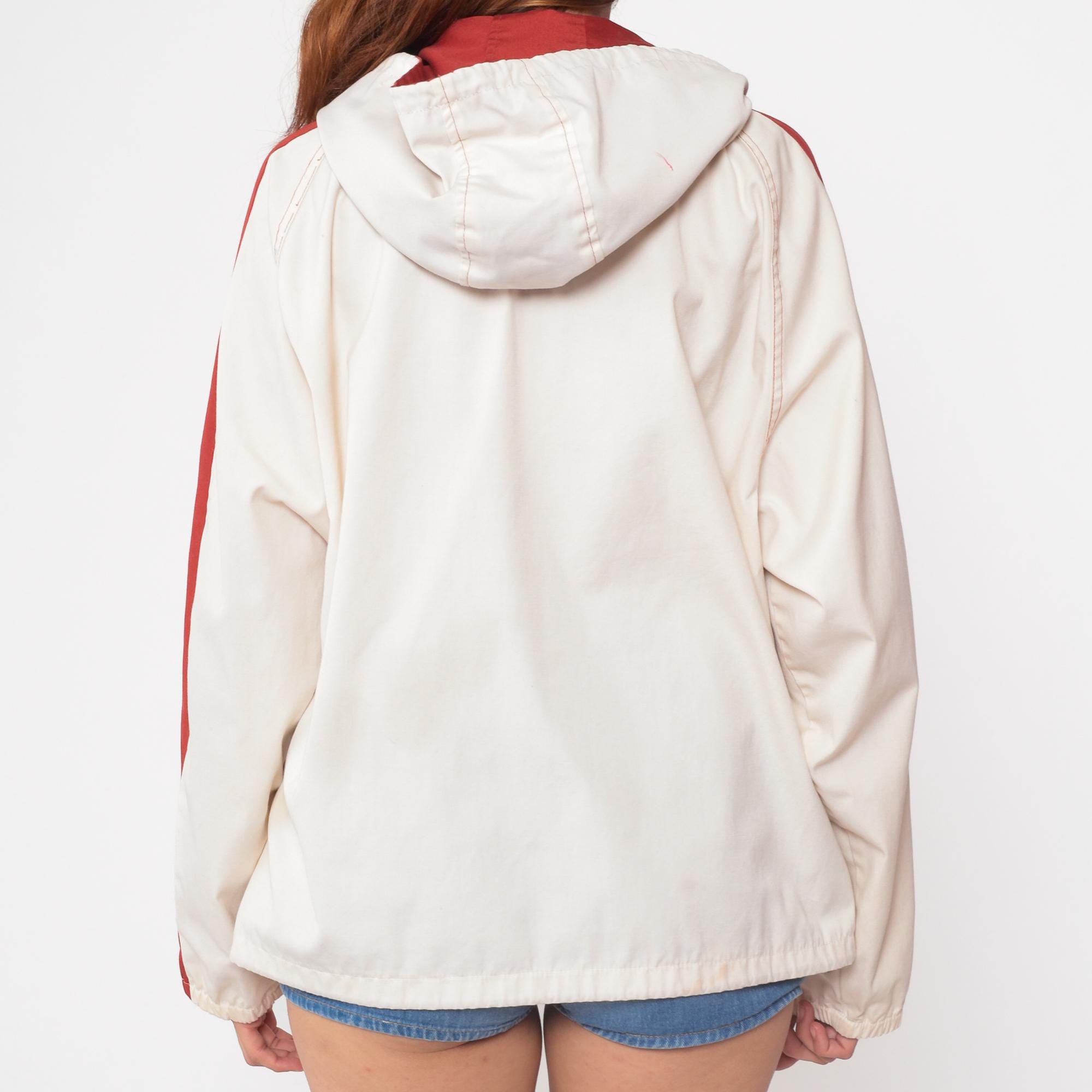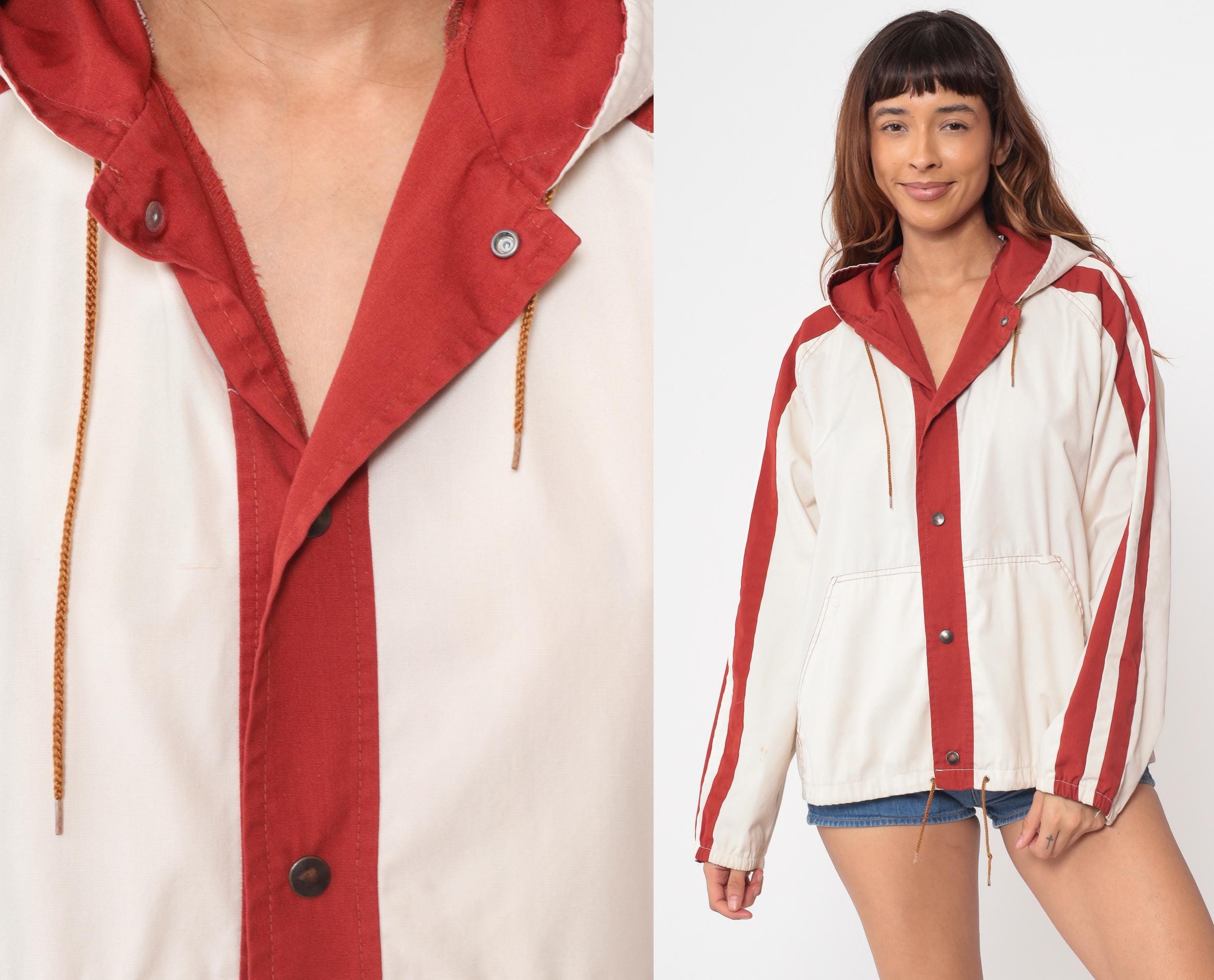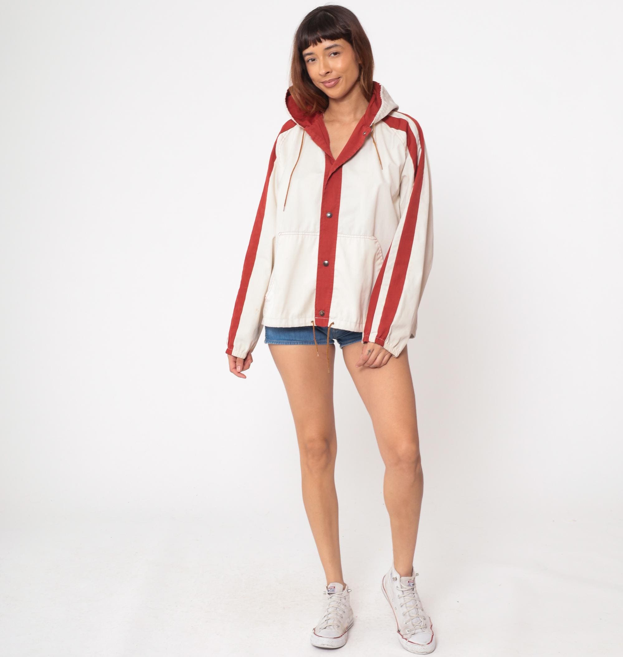 70s windbreaker from Montgomery Ward featuring eye-catching red and white color blocking with racing stripe detailing on sleeves. Hooded design with drawstring adjustment and snap front closure.
