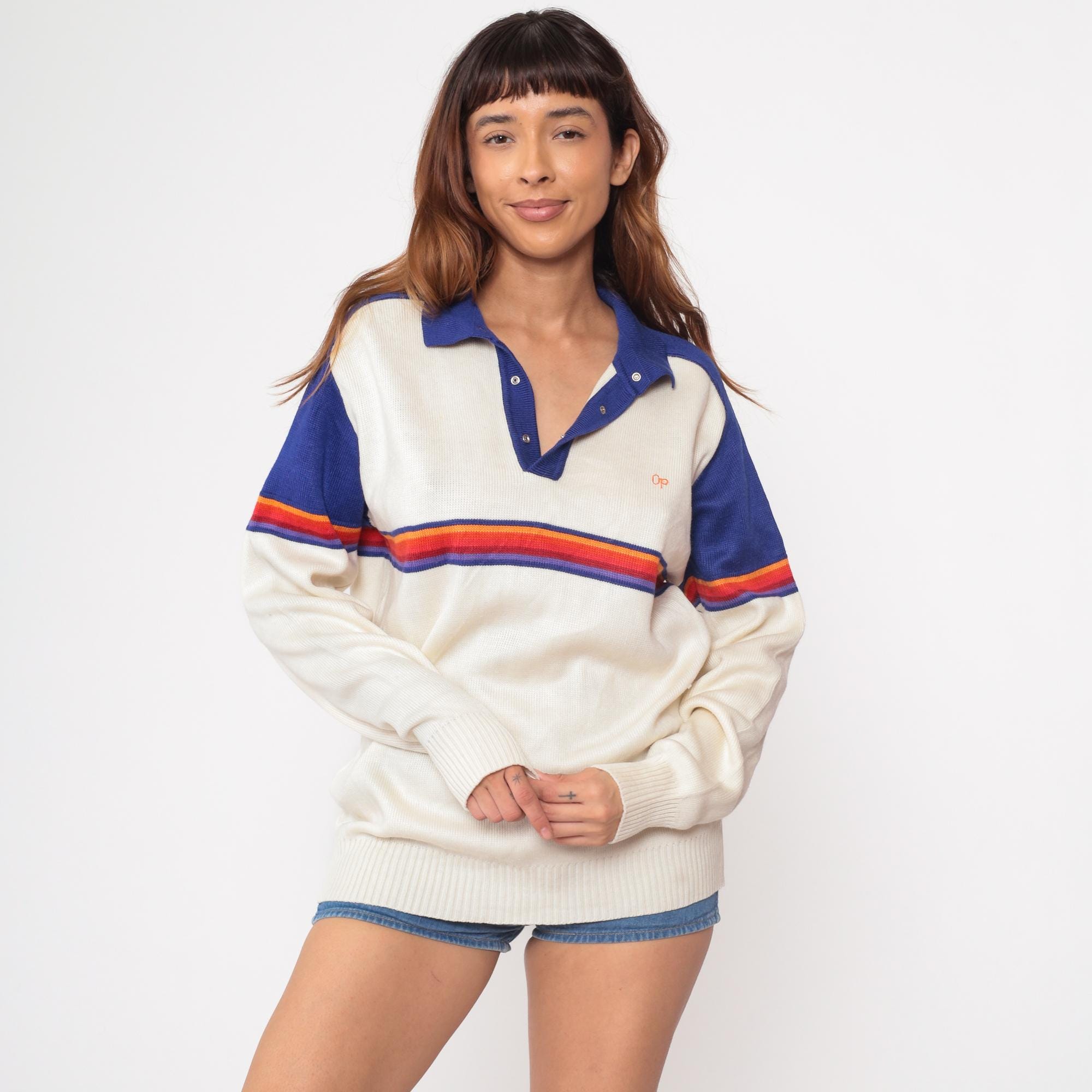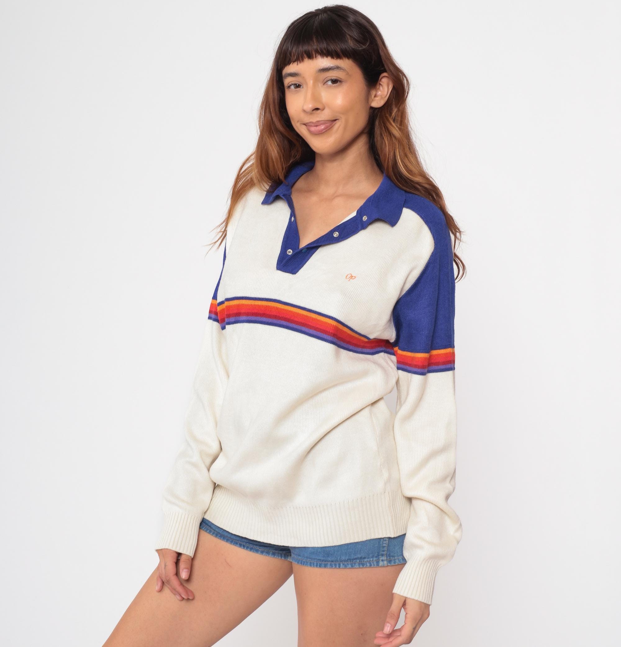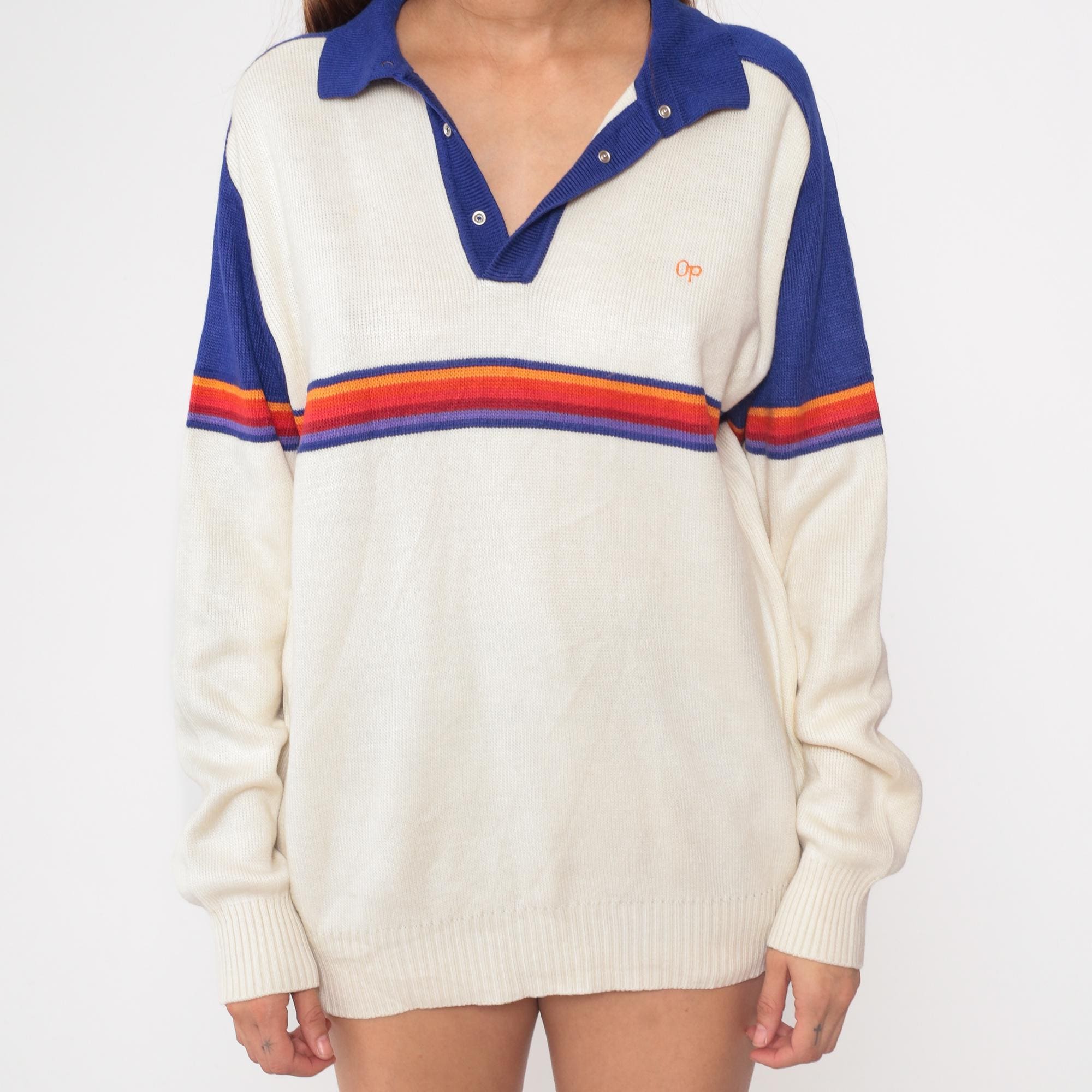 80s Ocean Pacific (OP) polo sweater featuring a classic surf-inspired design. Cream/white body with royal blue collar, sleeves, and signature rainbow stripe chest band in orange and red tones. Three-button polo collar and iconic orange OP logo embroidered on chest.