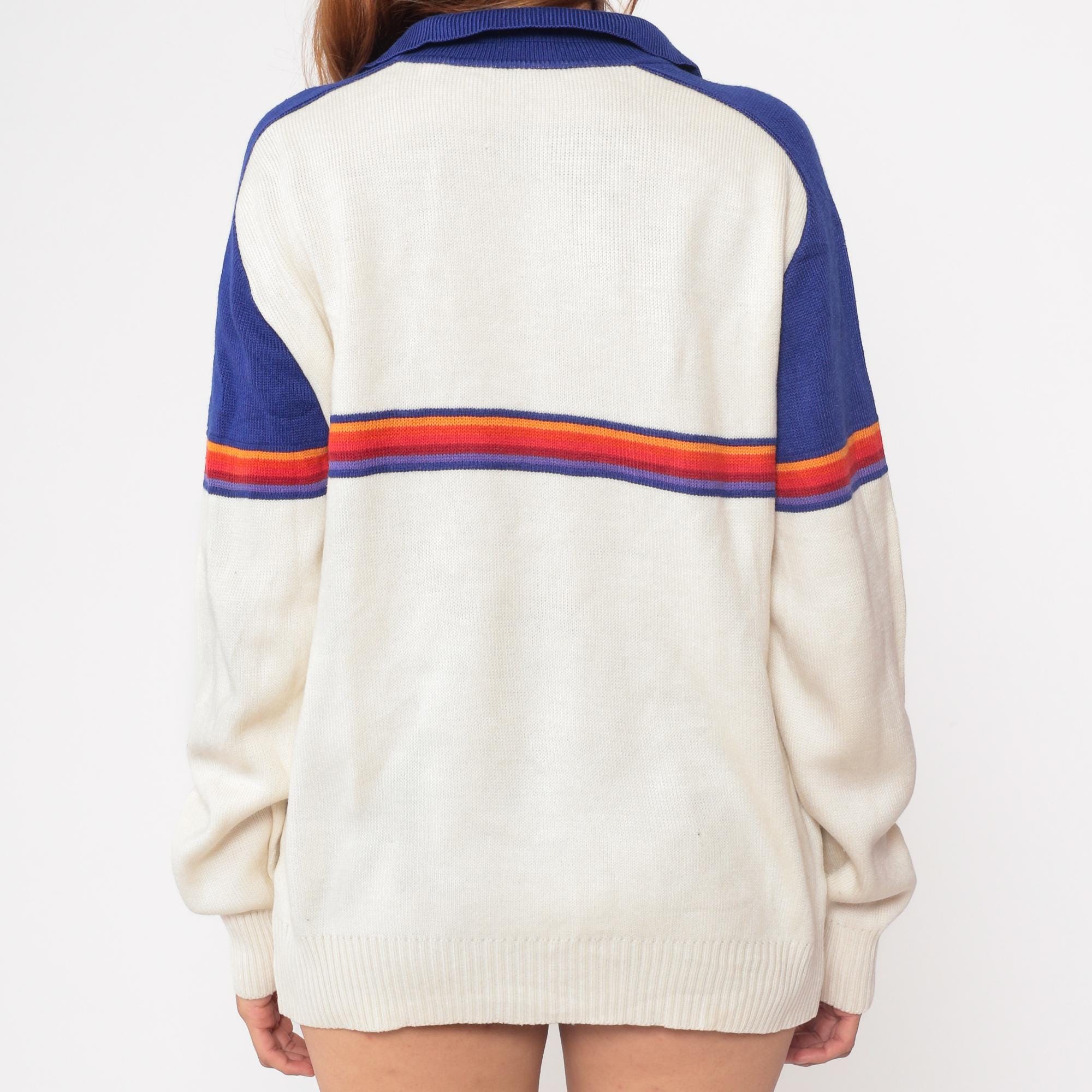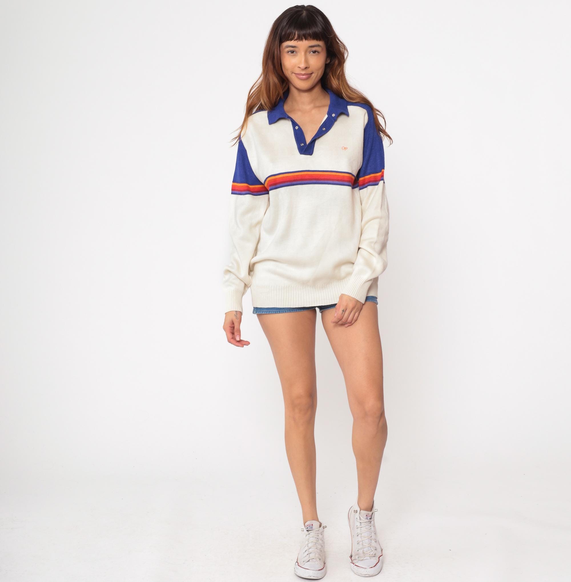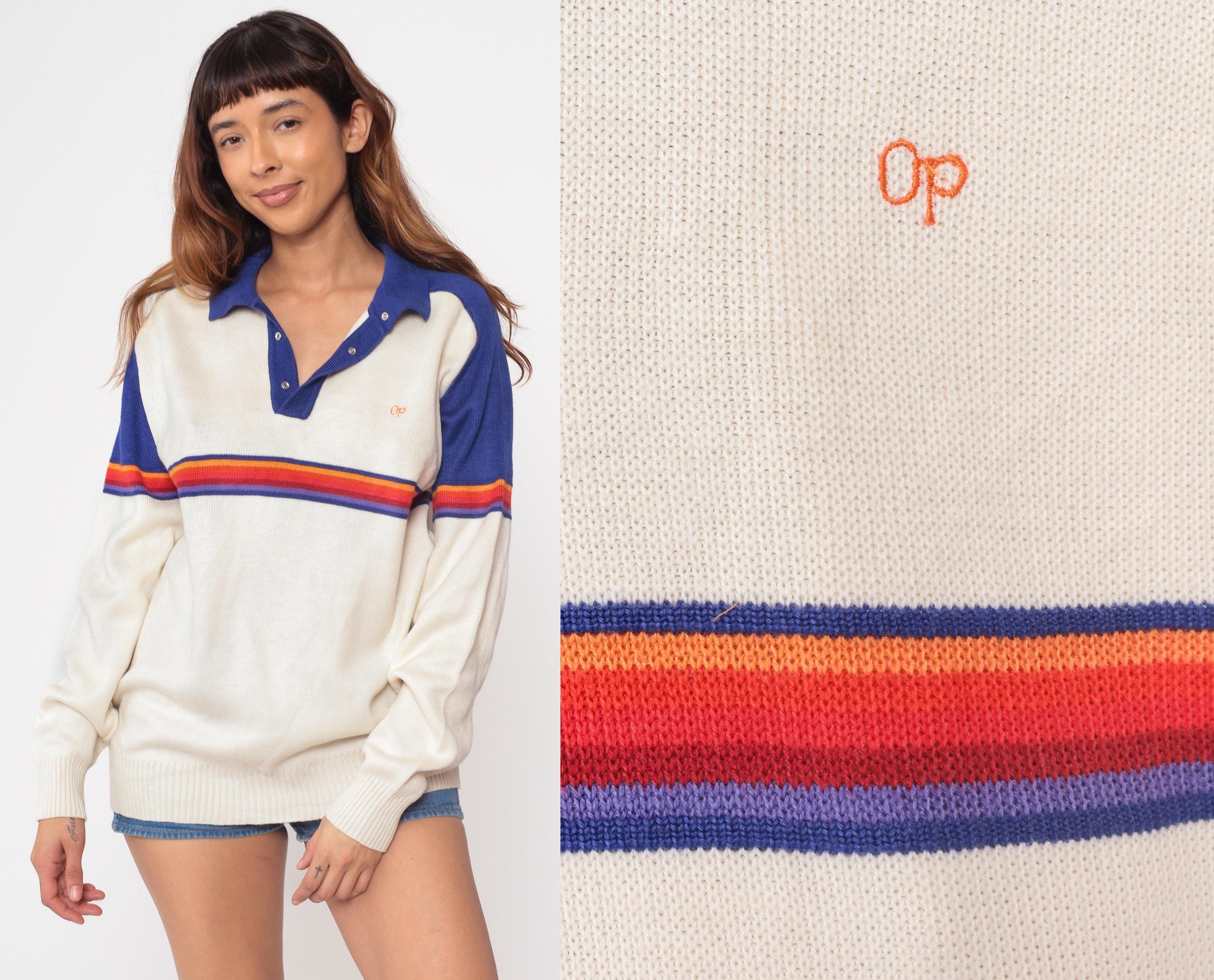 80s Ocean Pacific (OP) polo sweater featuring a classic surf-inspired design. Cream/white body with royal blue collar, sleeves, and signature rainbow stripe chest band in orange and red tones. Three-button polo collar and iconic orange OP logo embroidered on chest.